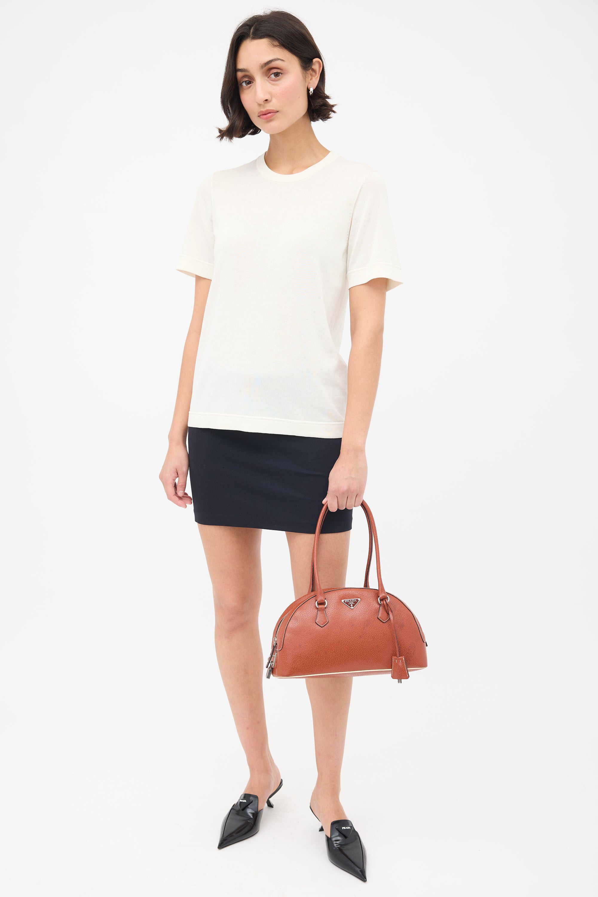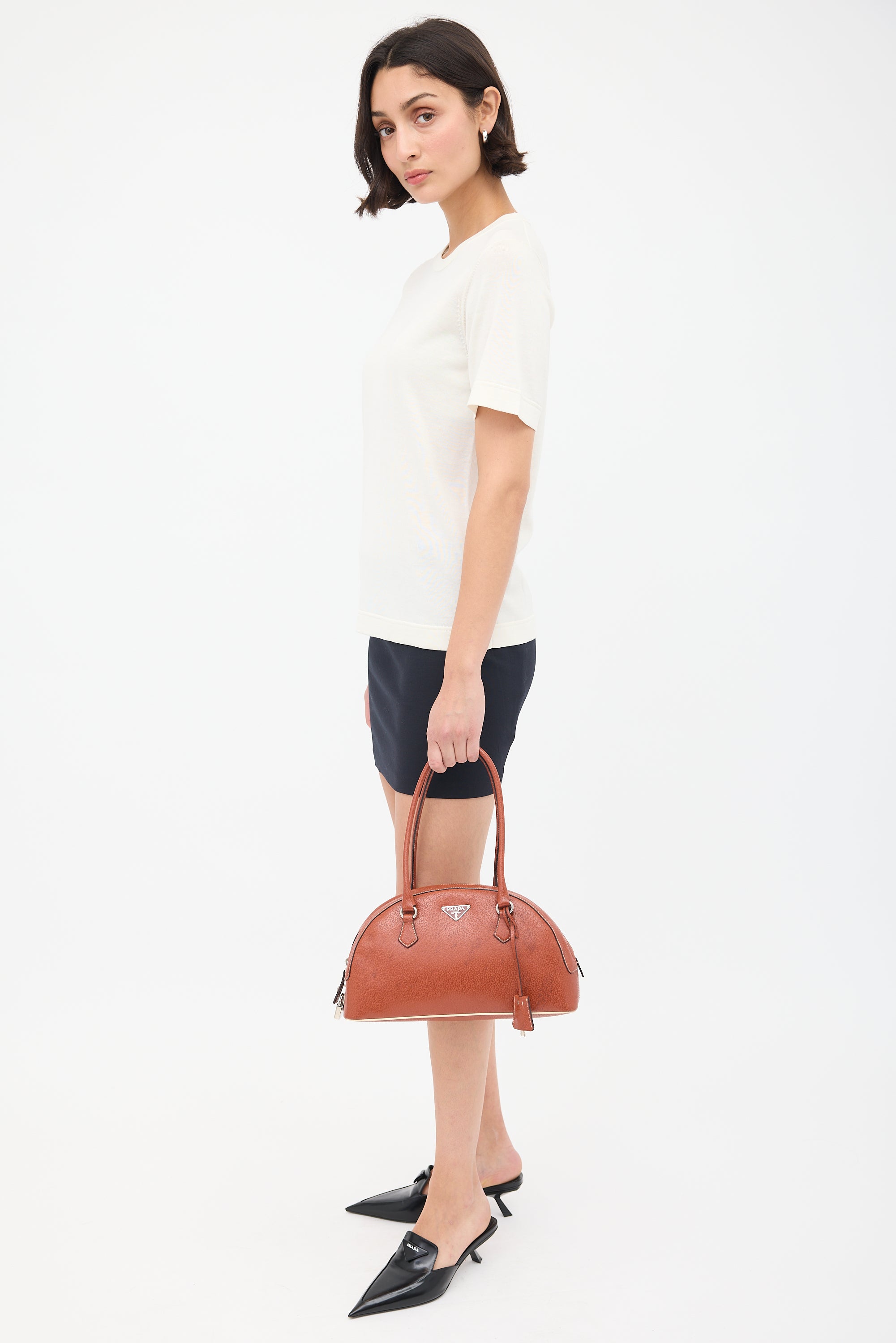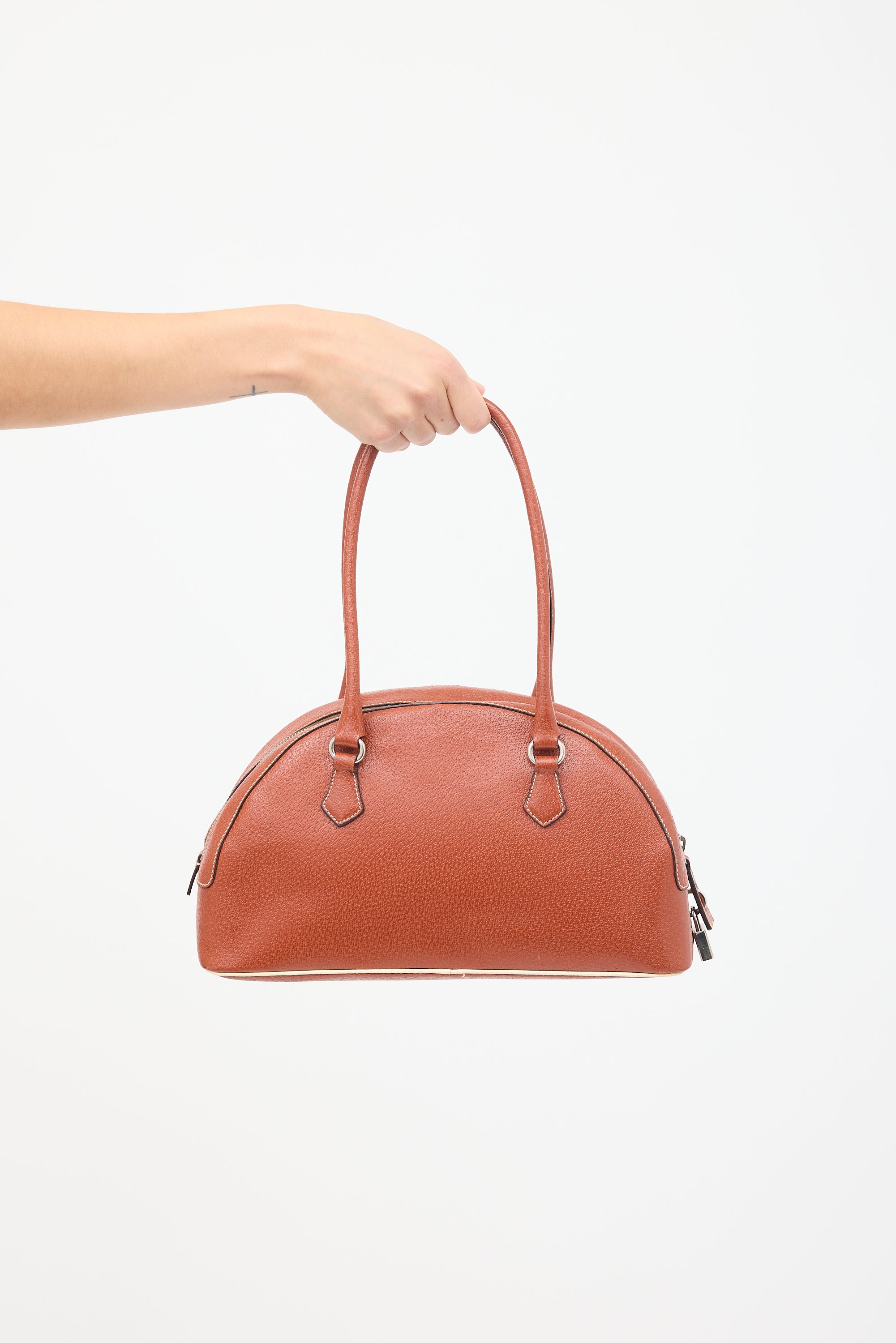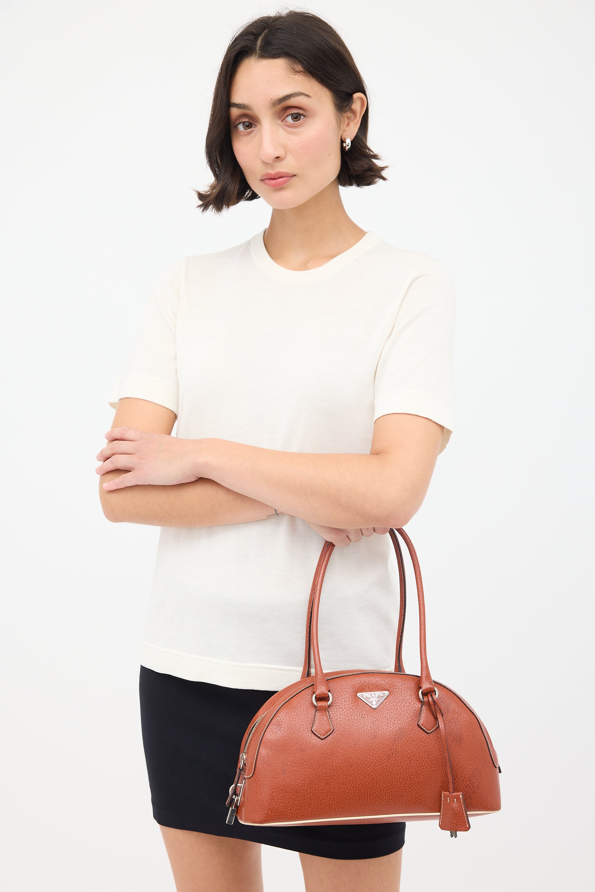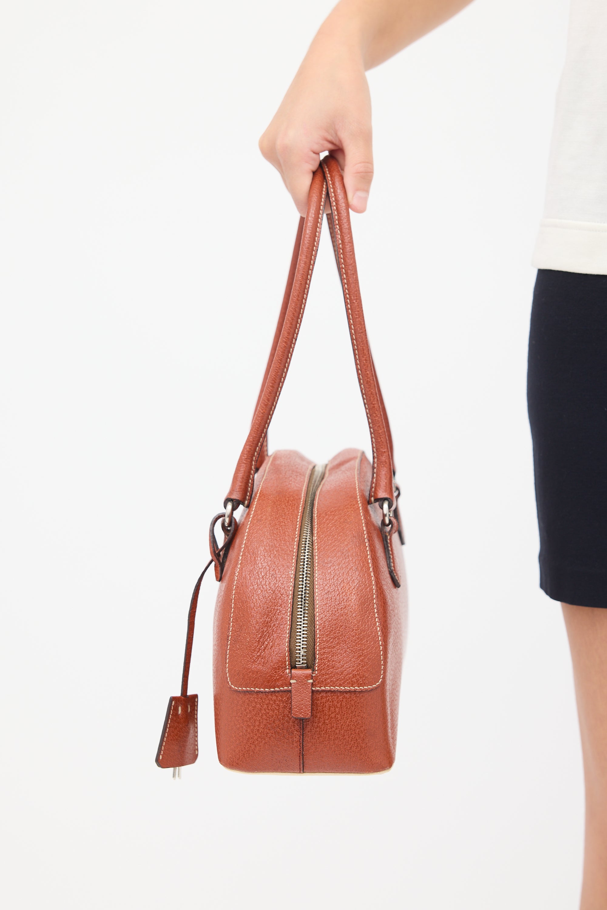 Pre-owned Prada vintage brown leather shoulder bag featuring dual rolled top handles, logo enamel hardware at front, detachable lock and key clochette, zip closure at top, lined main compartment, and one zip pocket inside. Comes with original dust bag.