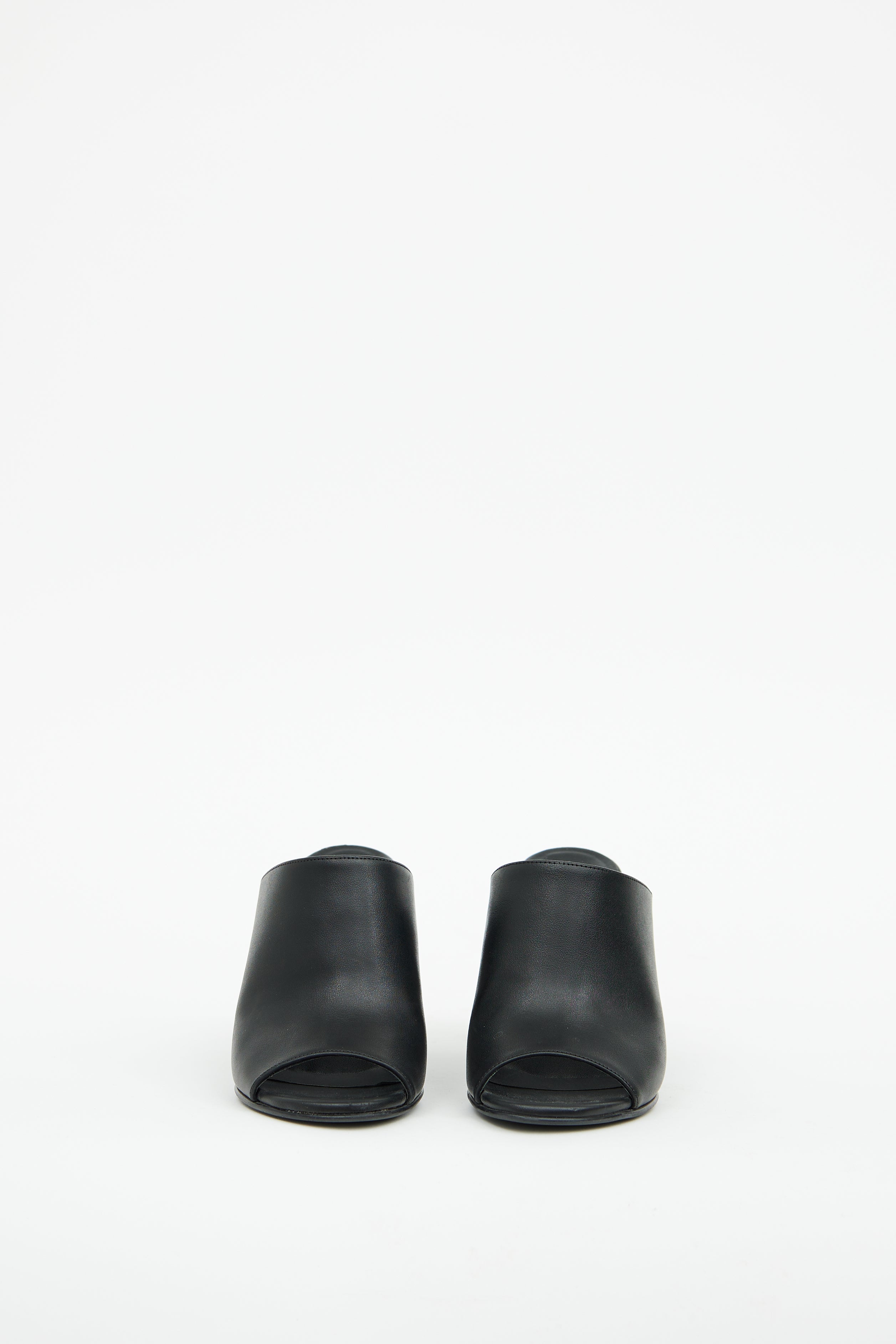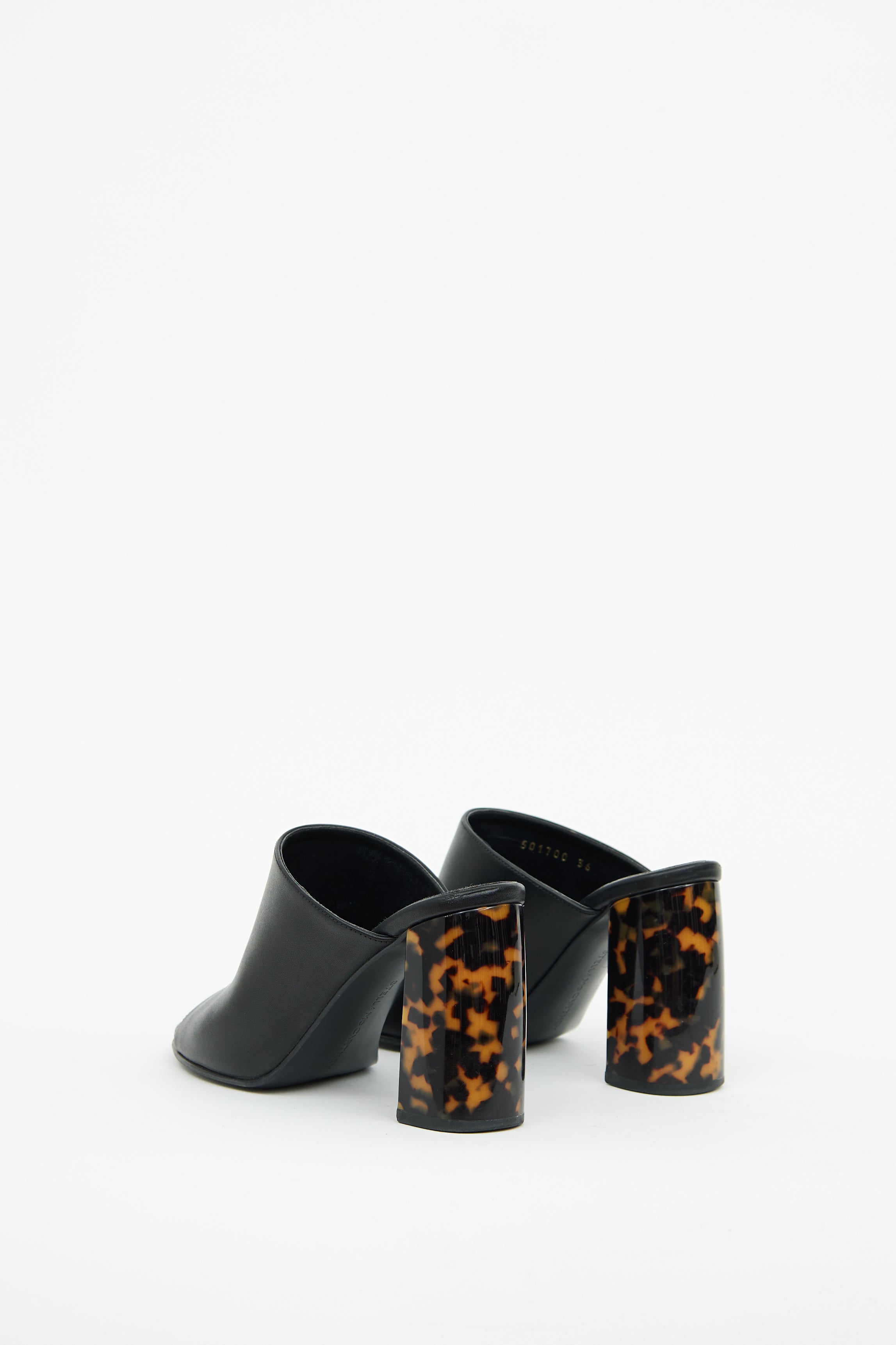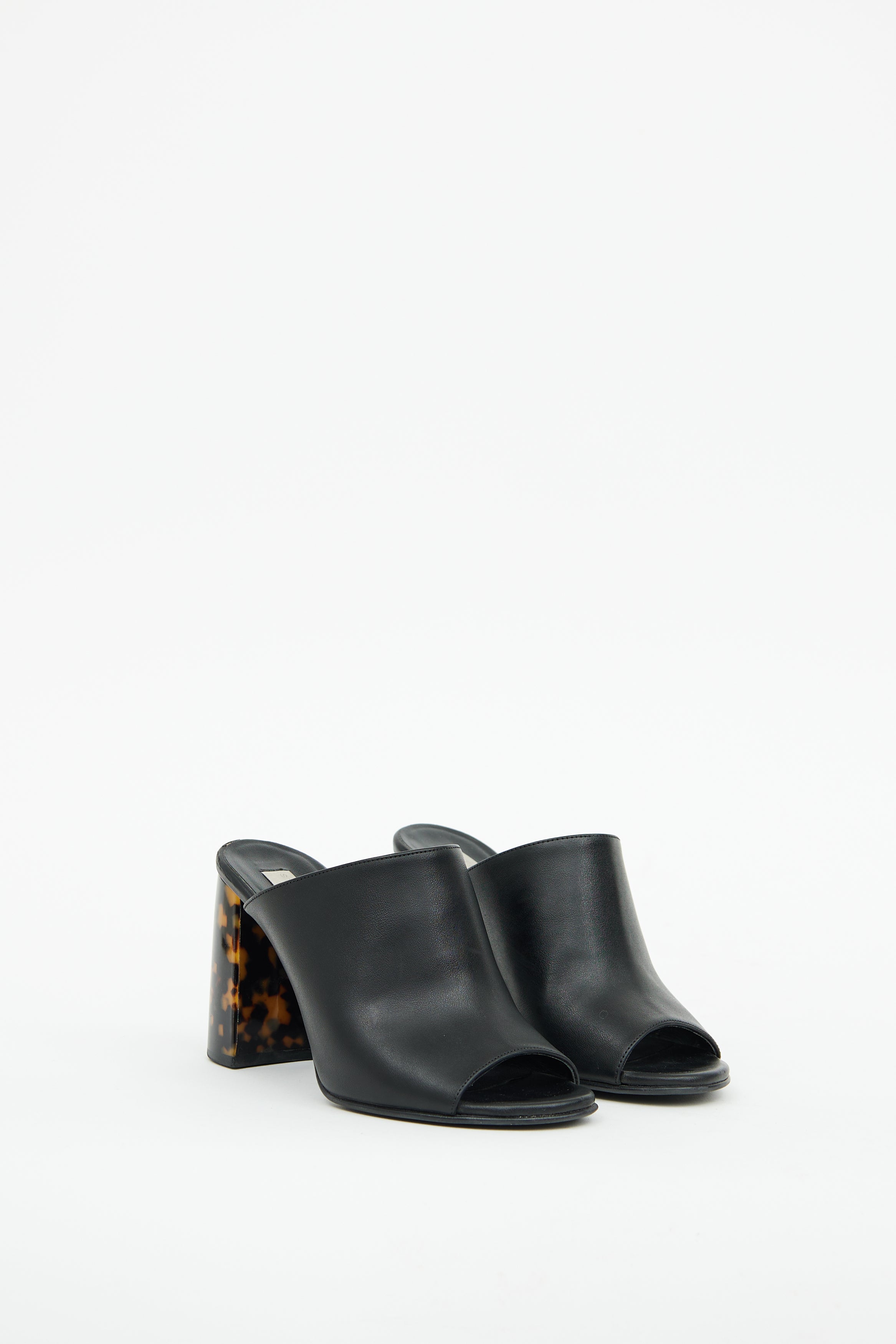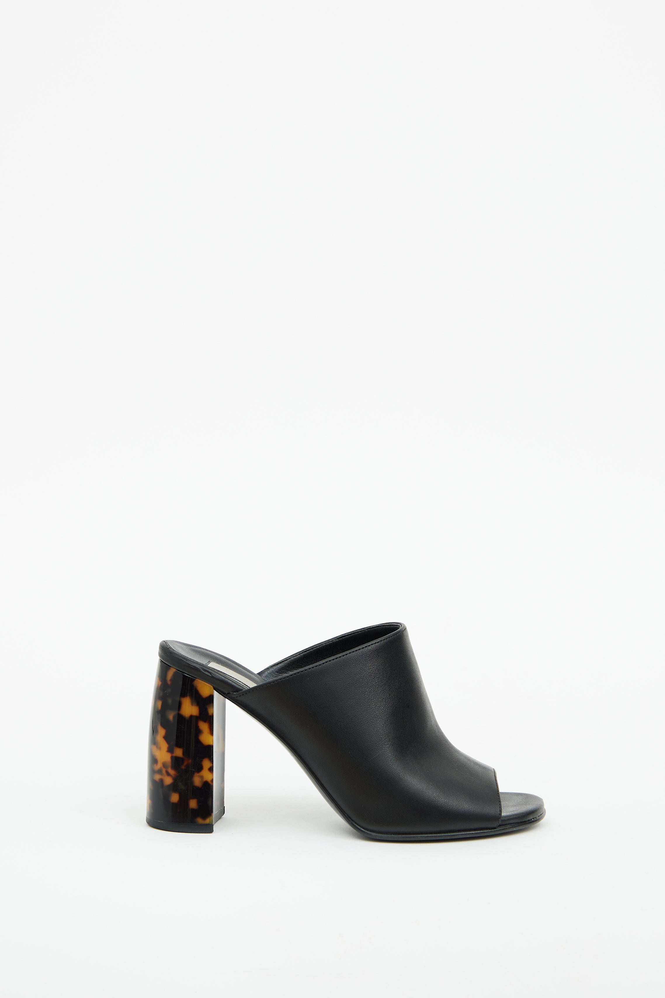 Pre-owned Stella McCartney black faux leather heeled mule featuring open square toe, slip on entry, wide black strap and tortoiseshell block heel.
