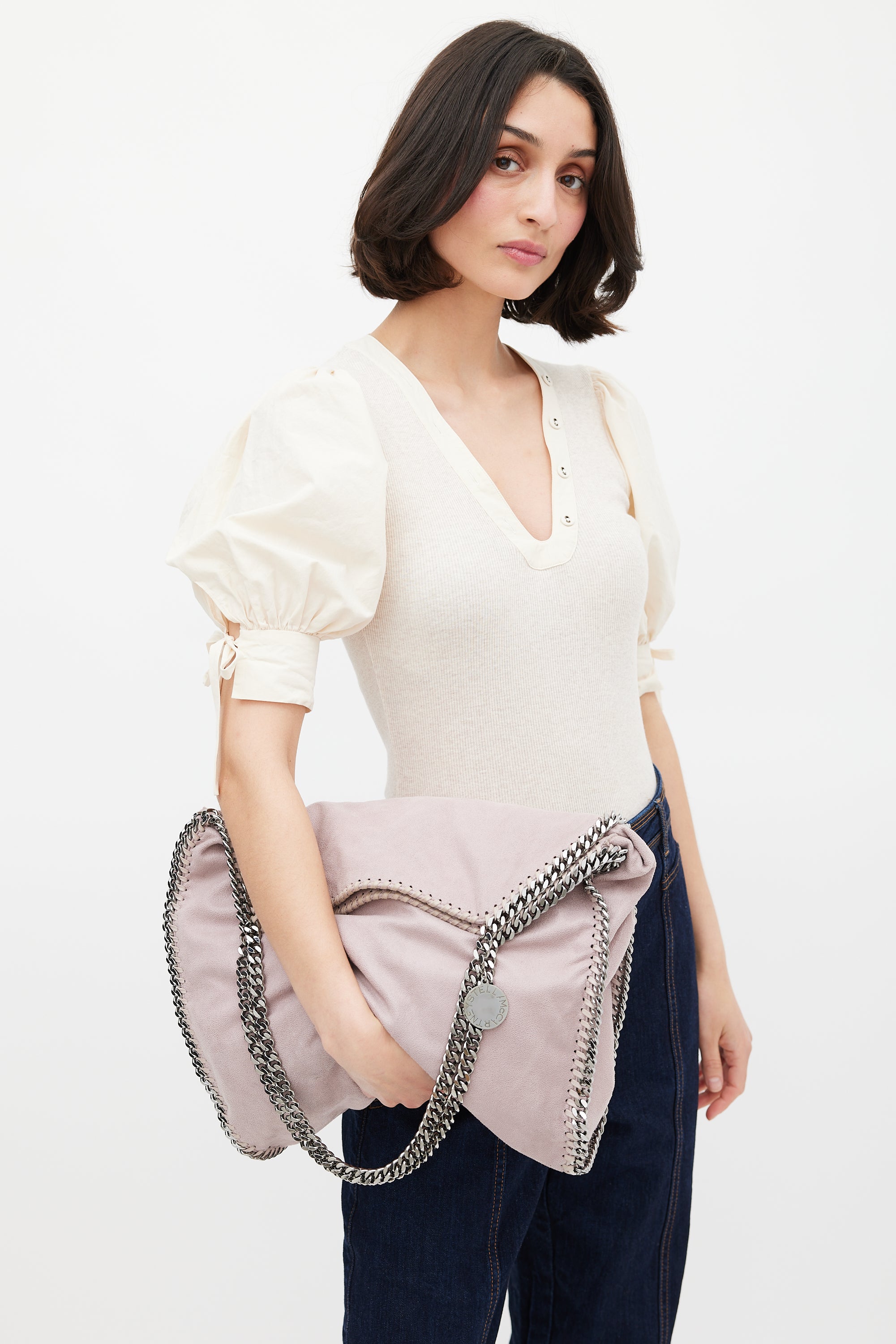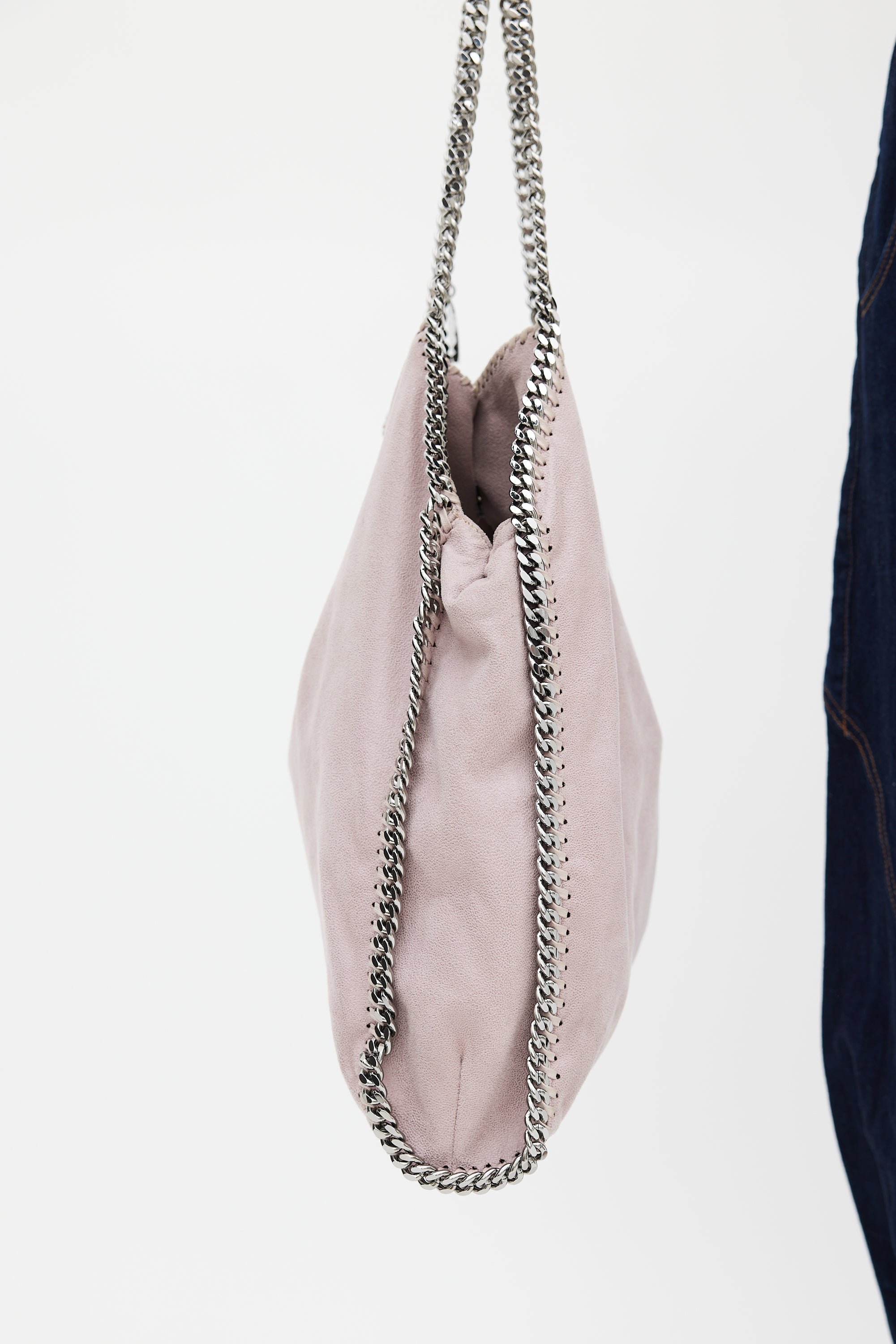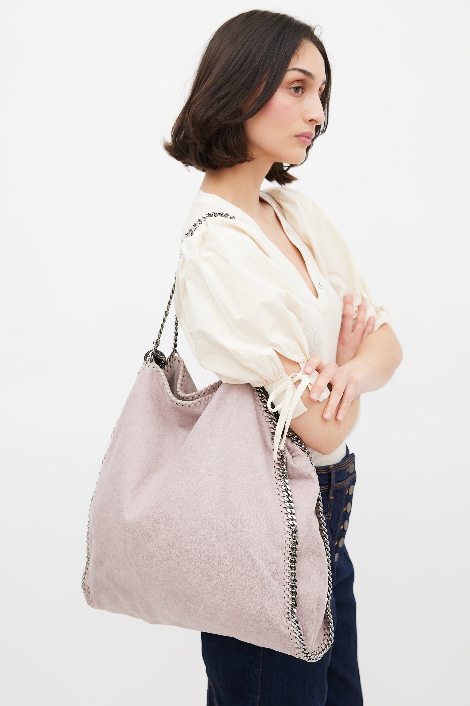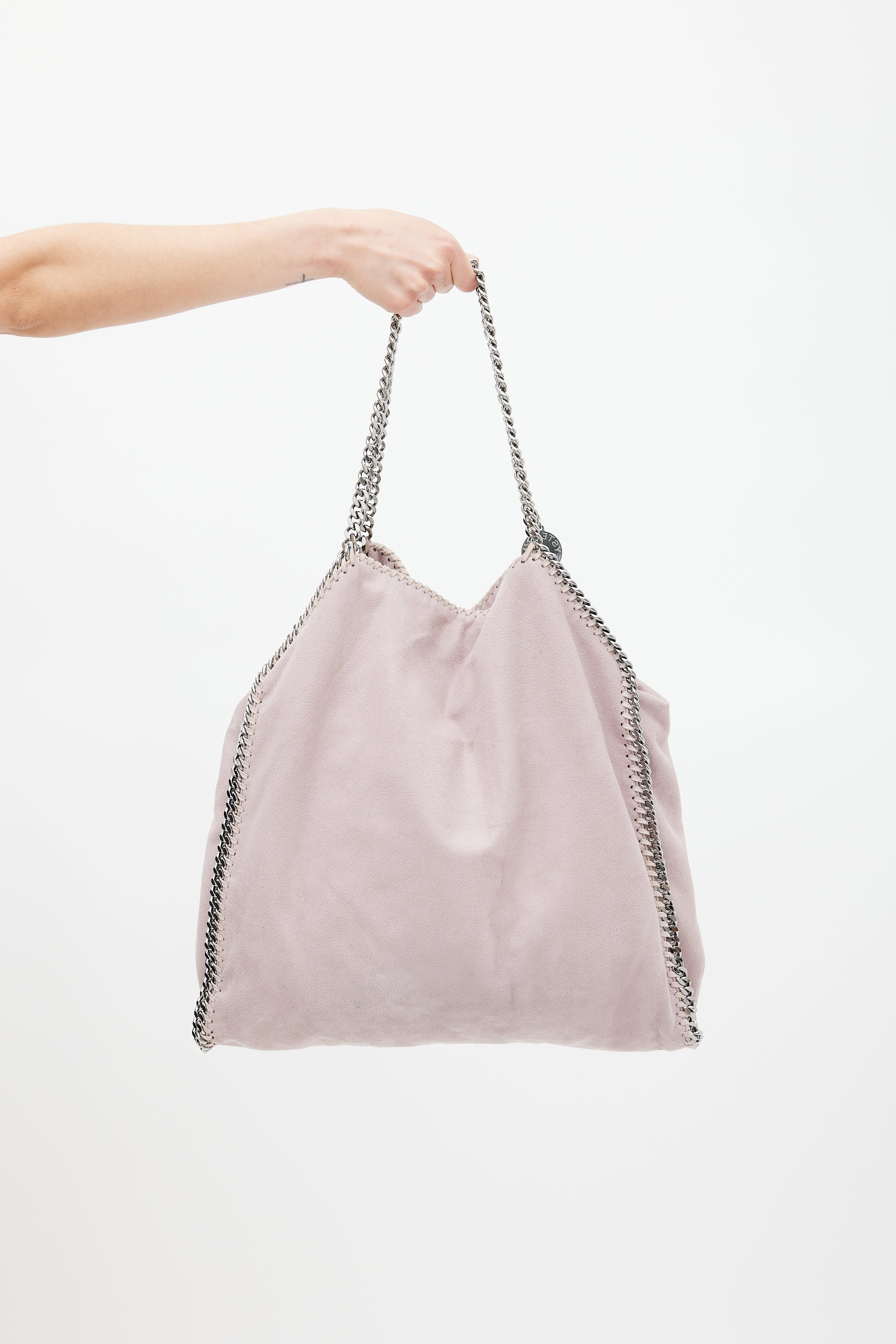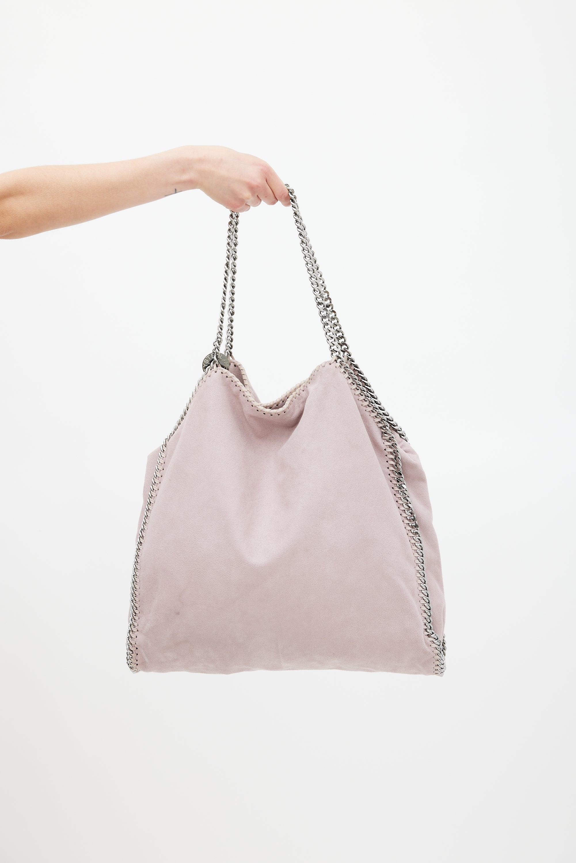 Pre-owned Stella McCartney dusty pink Falabella tote bag featuring vegan Shaggy Deer exterior, silver tone hardware, braided leather and chain link trim, two fixed chain shoulder strap with logo charm, snap button closure, lined main compartment, detachable zip pouch, and one zip and phone pocket inside.