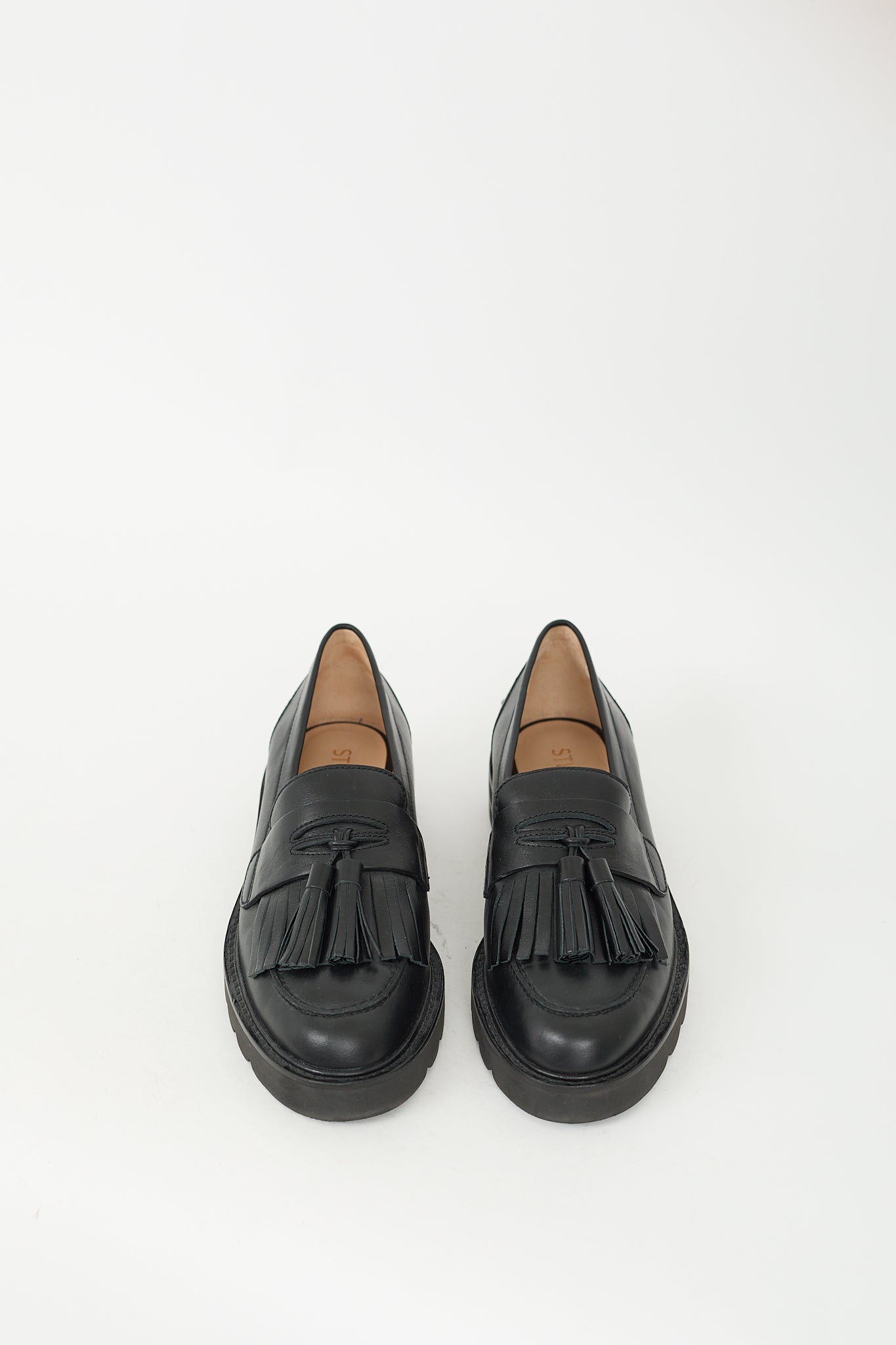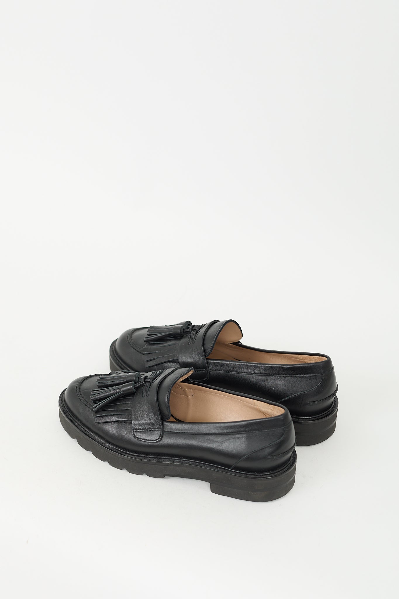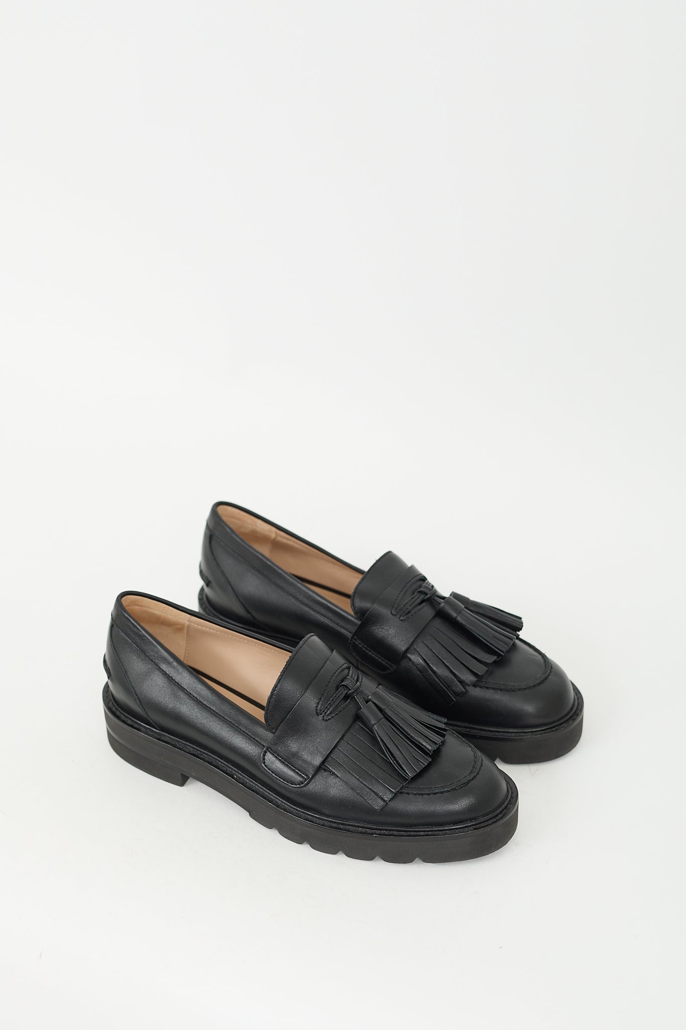 Pre-owned Stuart Weitzman black leather Mila loafers featuring a rounded toe, tonal stitching, notched topline, kiltie fringe with tassel detail at vamp, and treaded rubber sole.