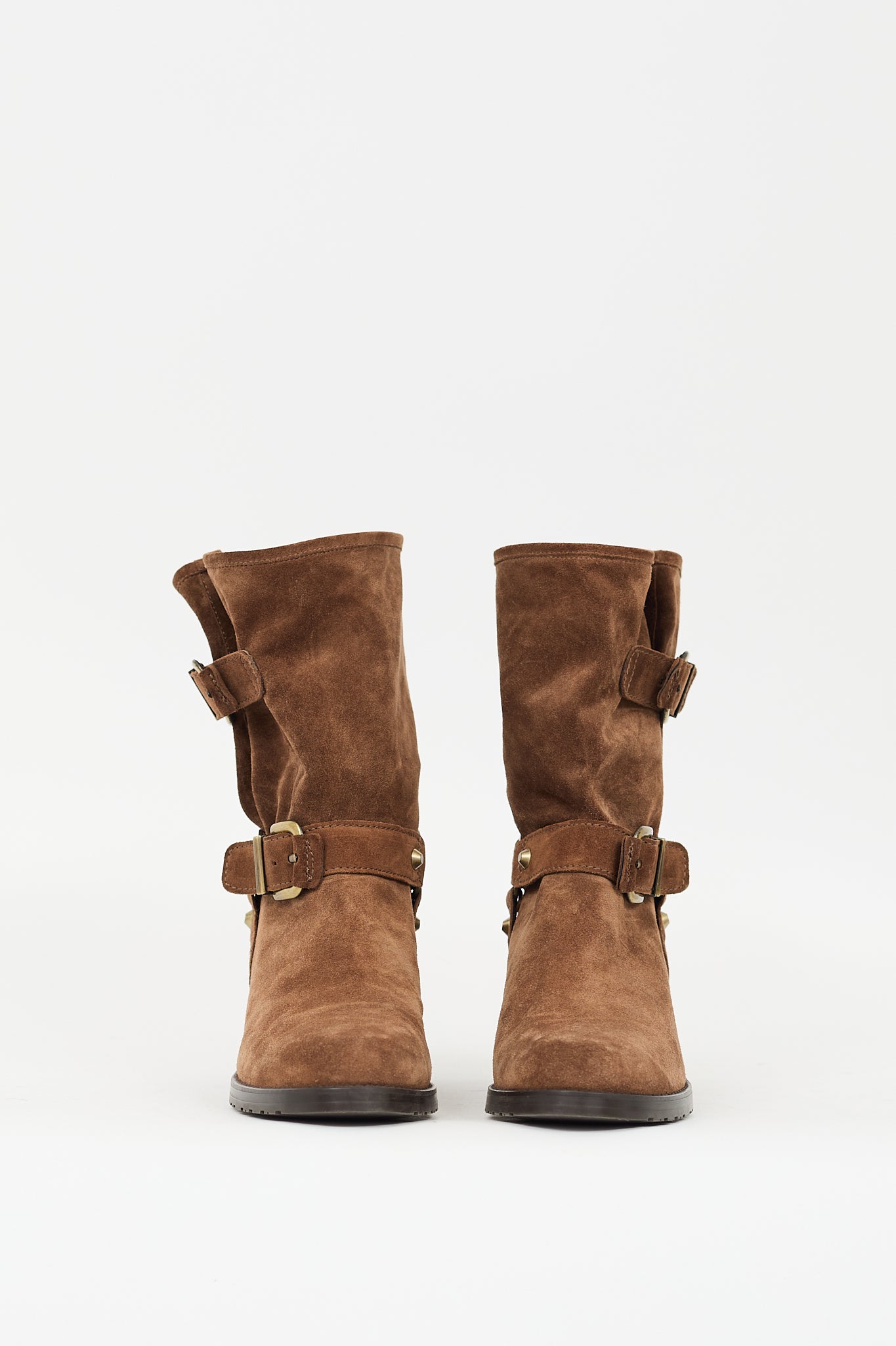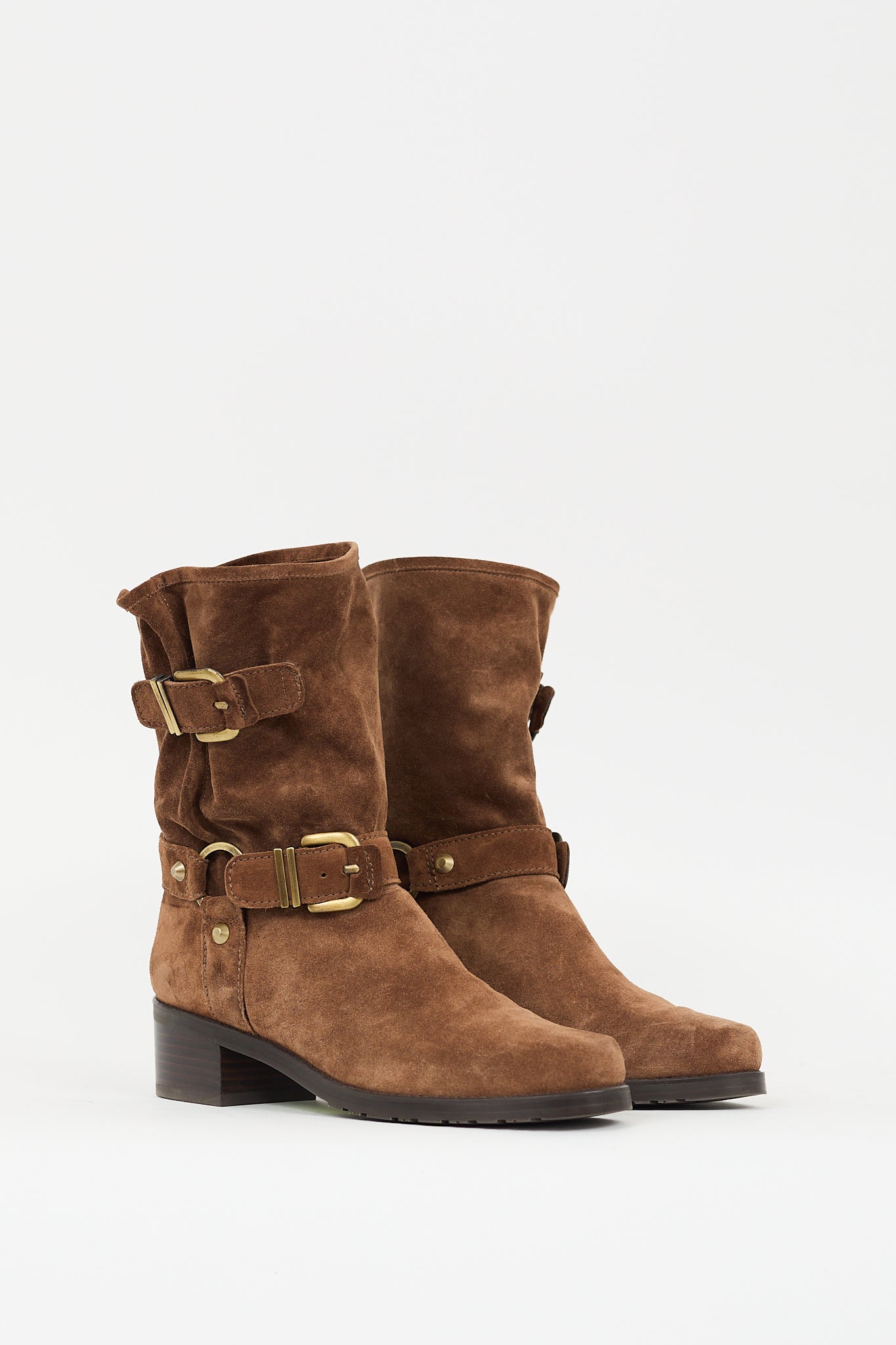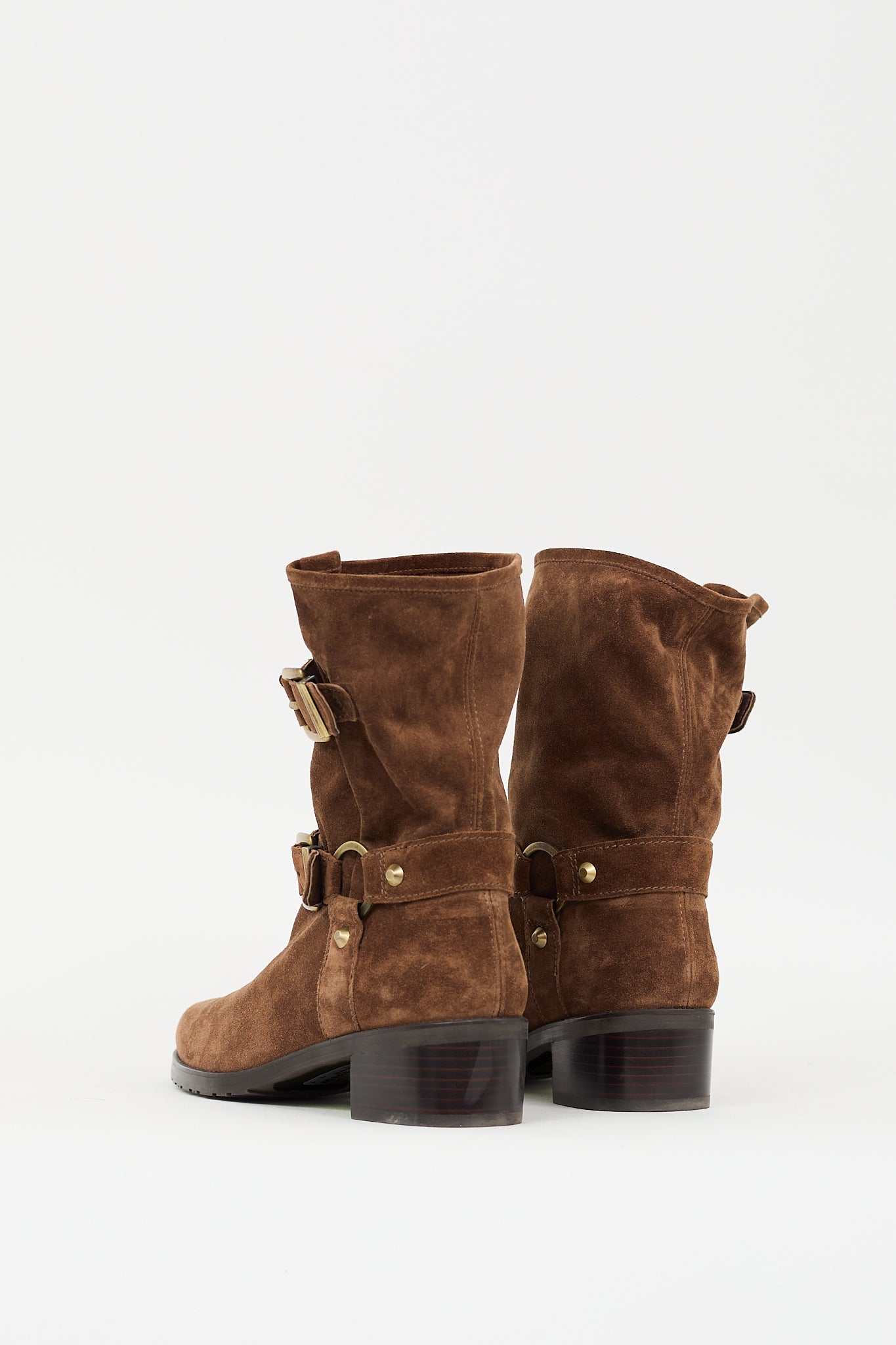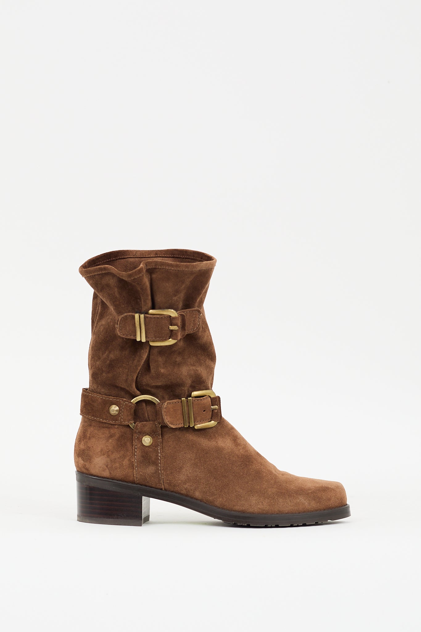 Pre-owned Stuart Weitzman brown suede ankle boots featuring rounded toe, gold tone double buckle harness at side, short stacked block heel, and pull on entry.