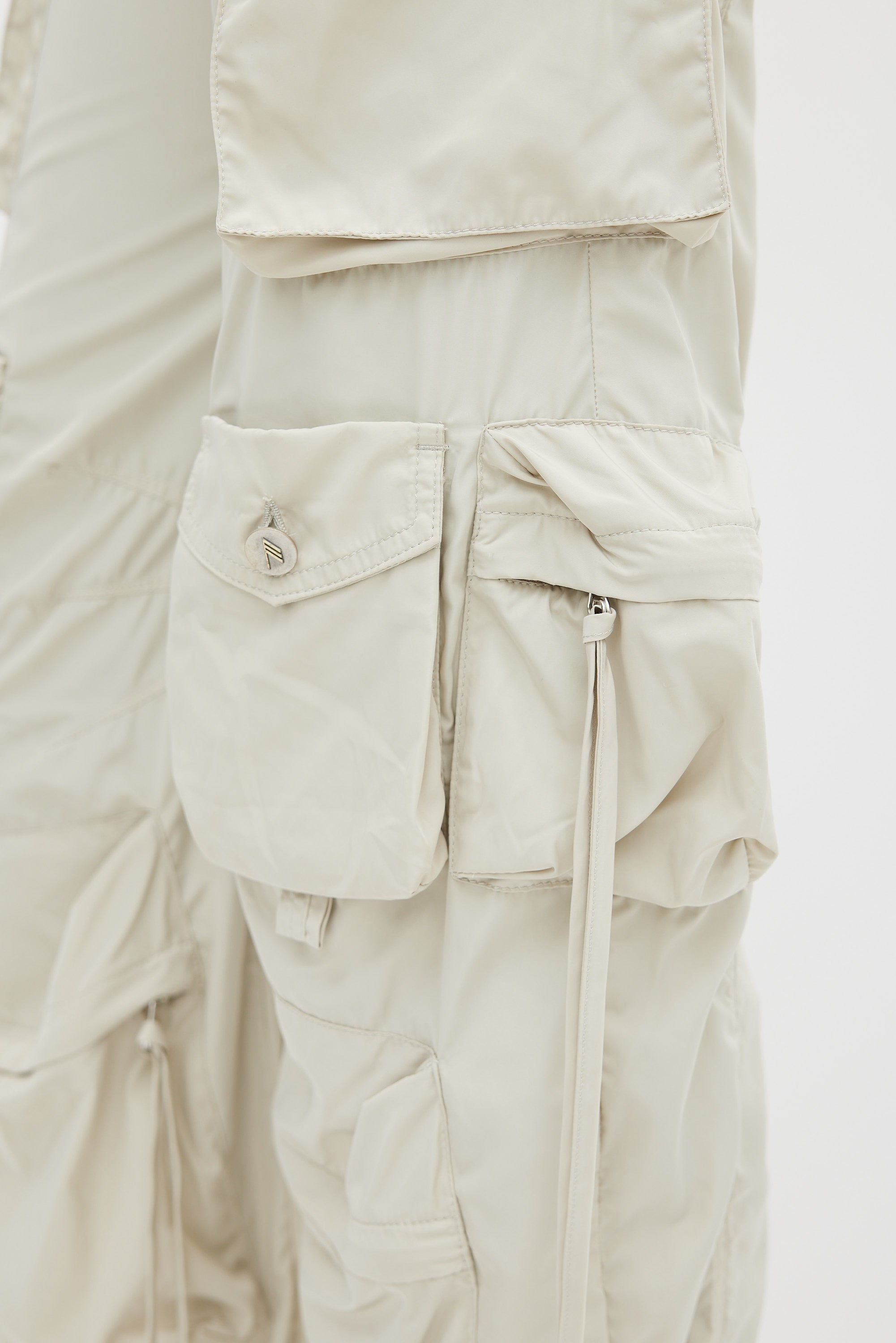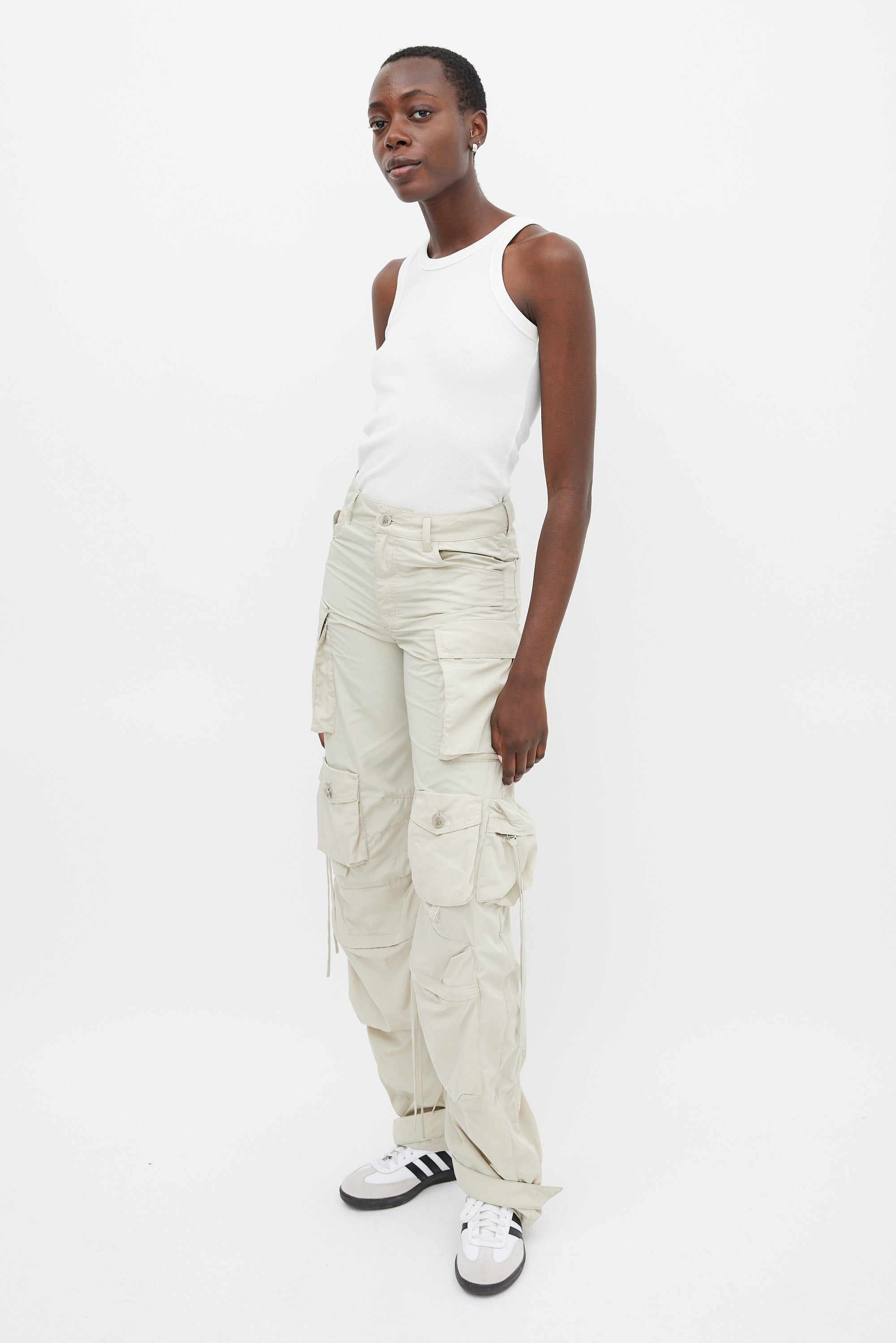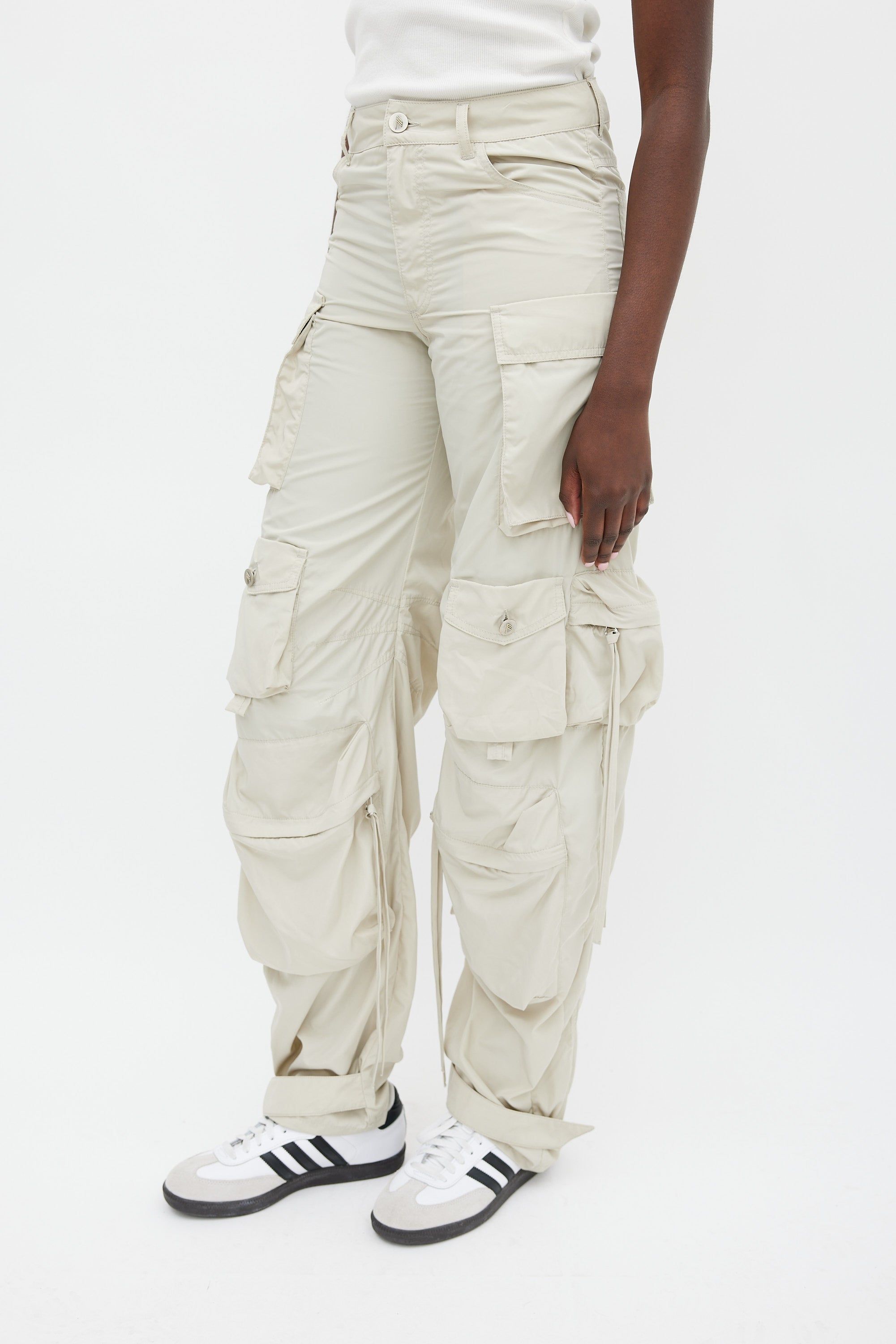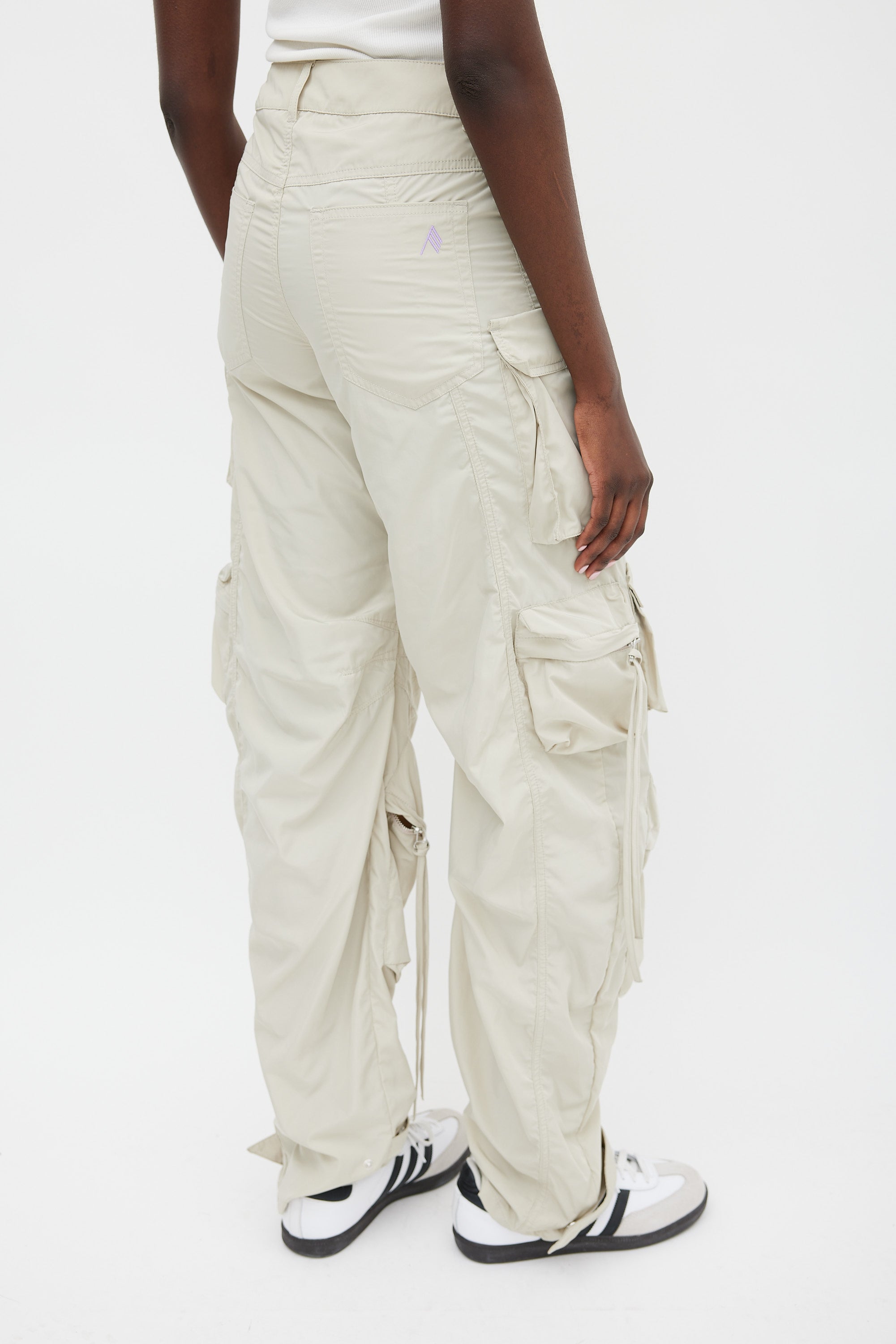 Pre-owned The Attico beige Fern cargo pants featuring five pocket styling, multiple cargo pockets throughout front and outseam, purple embroidered logo at back right pocket, adjustable cuffs, and zip fly.