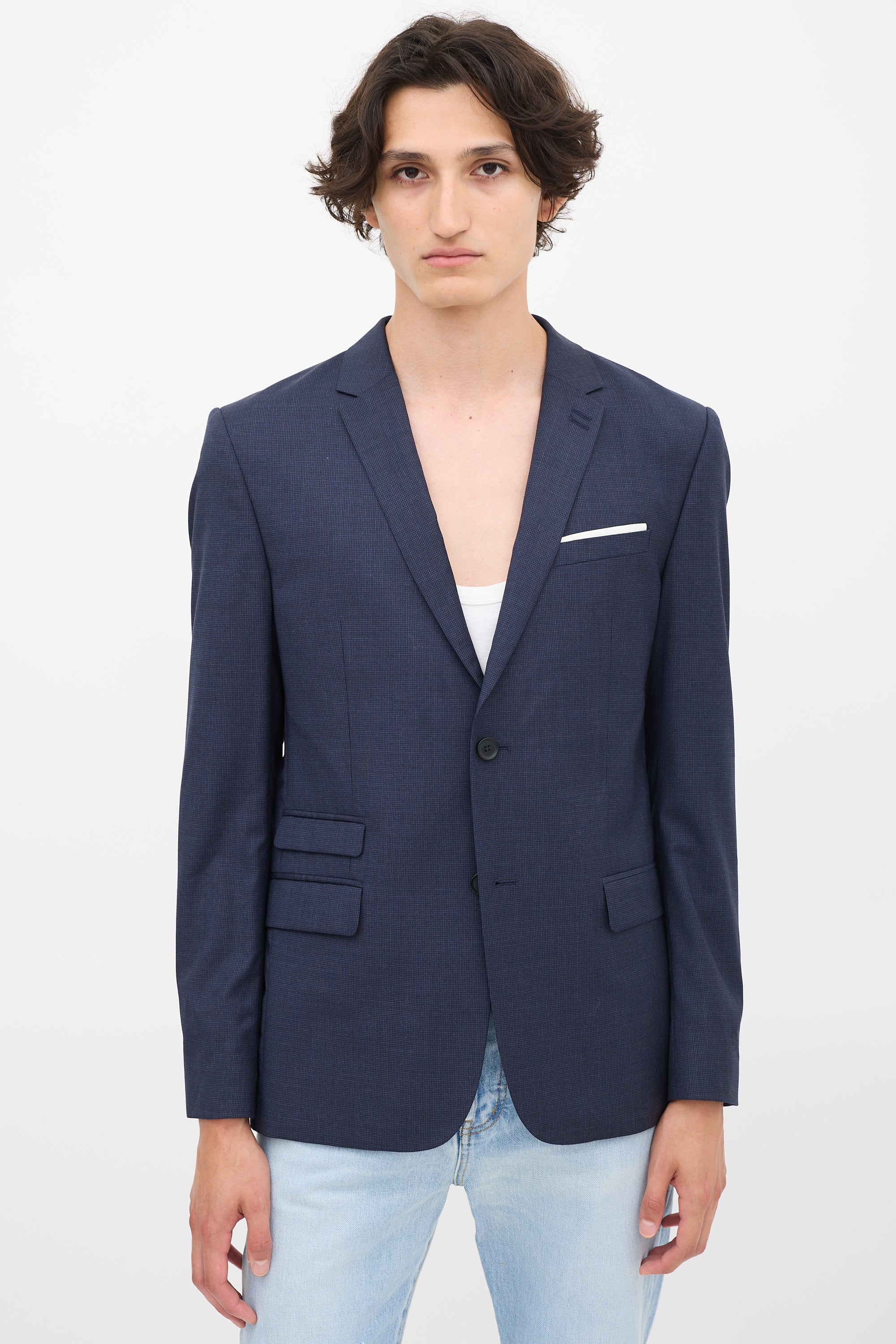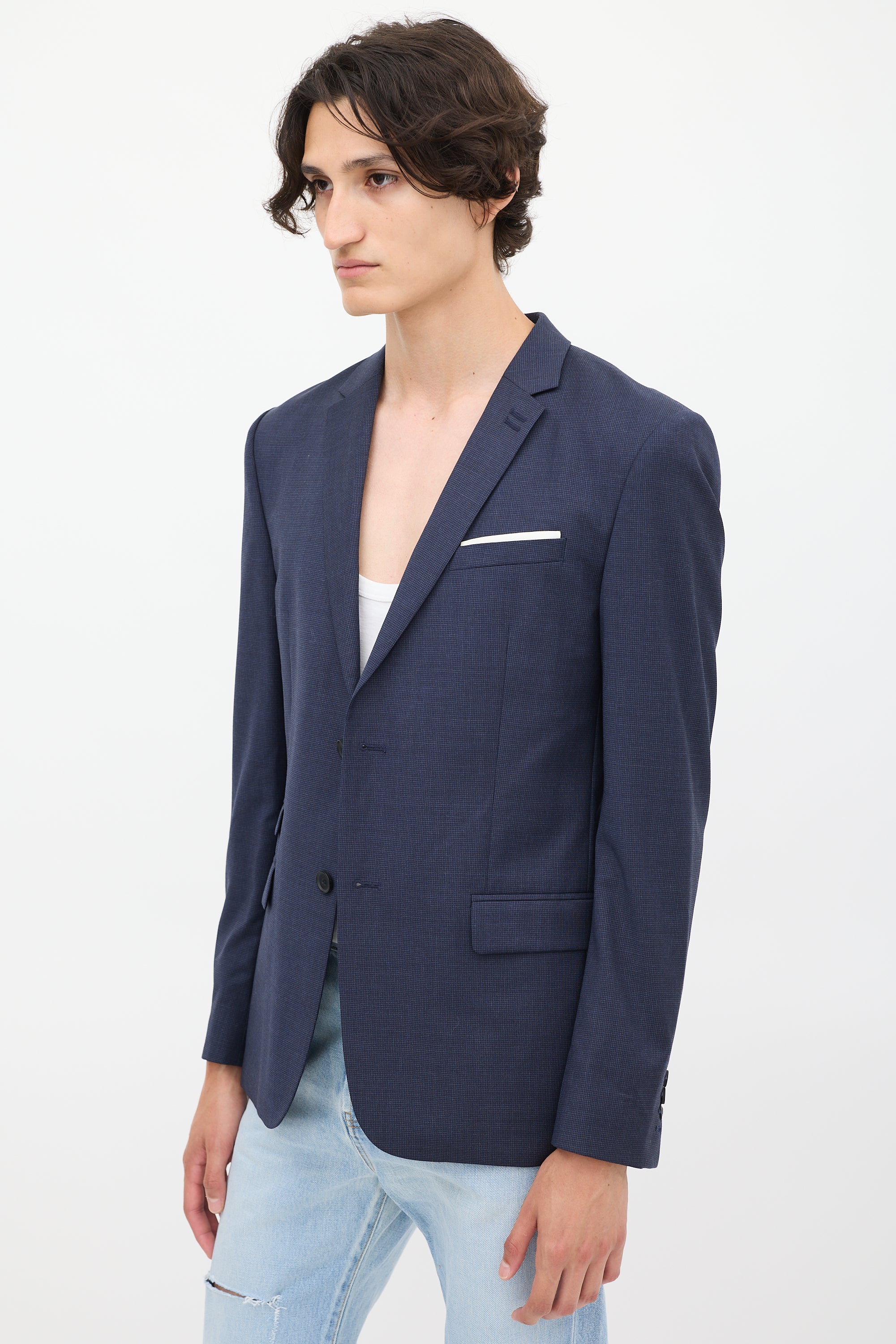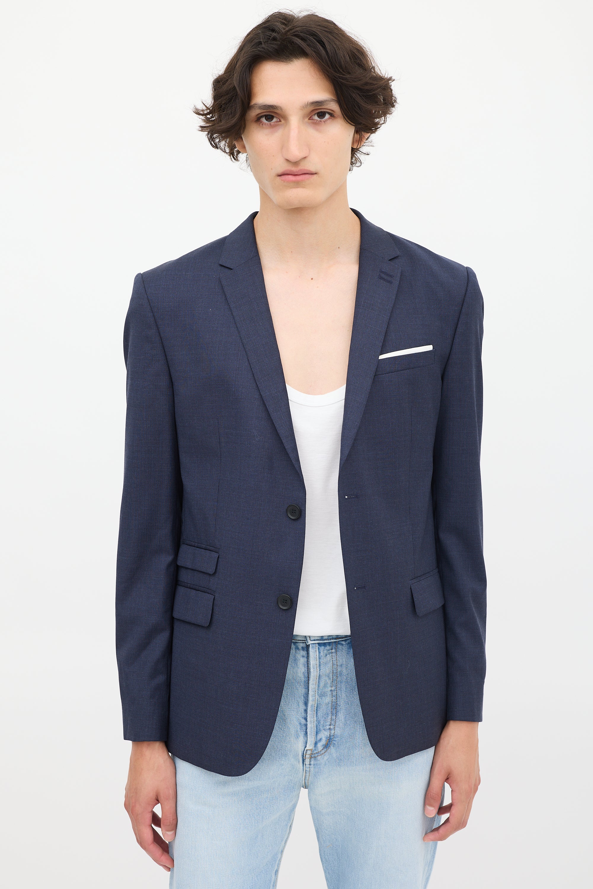Pre-owned The Kooples navy wool Classic blazer featuring a notched collar, single breast two button front, slip pocket at left chest with faux pocket square detail, three front flap pockets, back double vent, padded shoulders, and long sleeves with buttoned cuffs. Lined.
