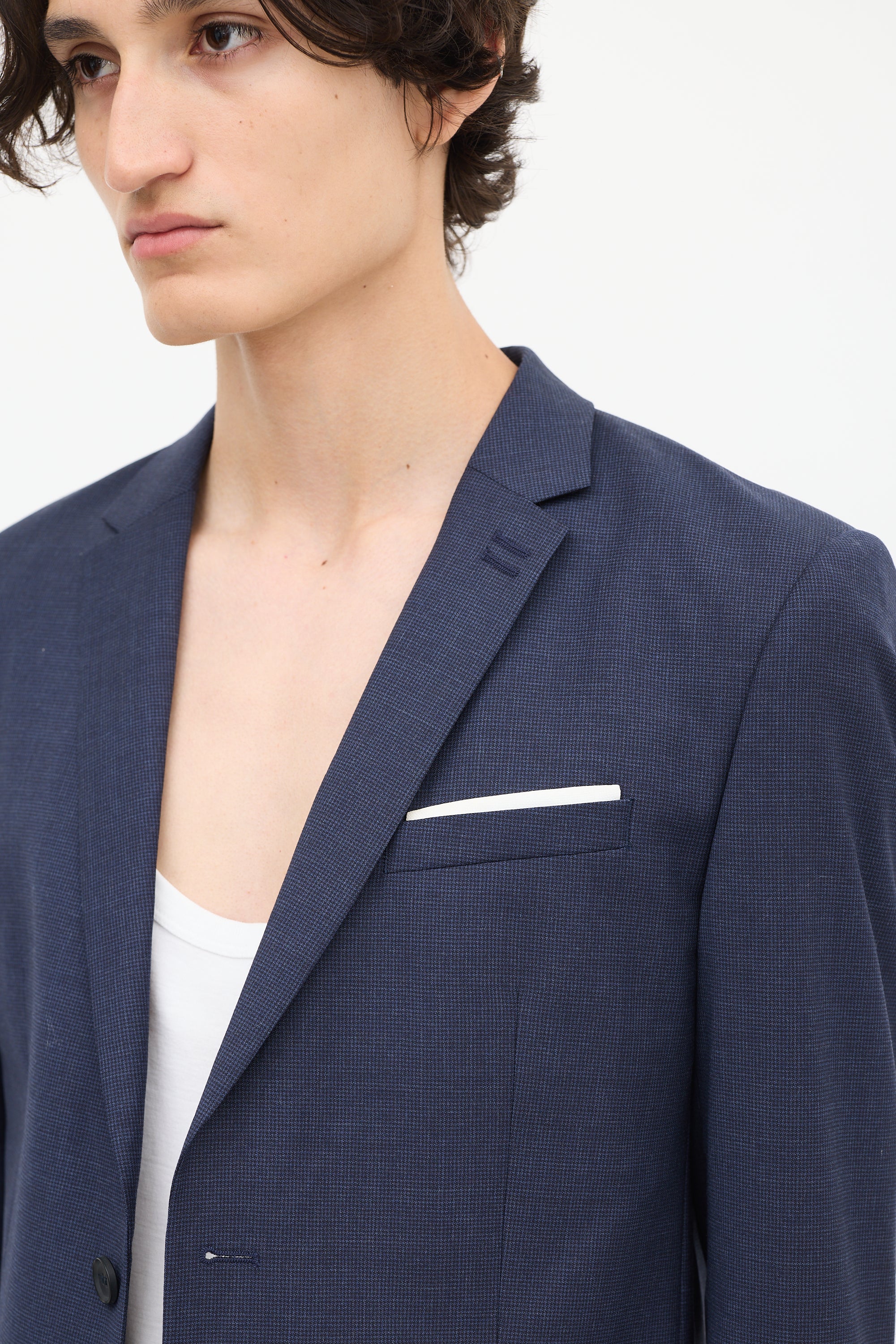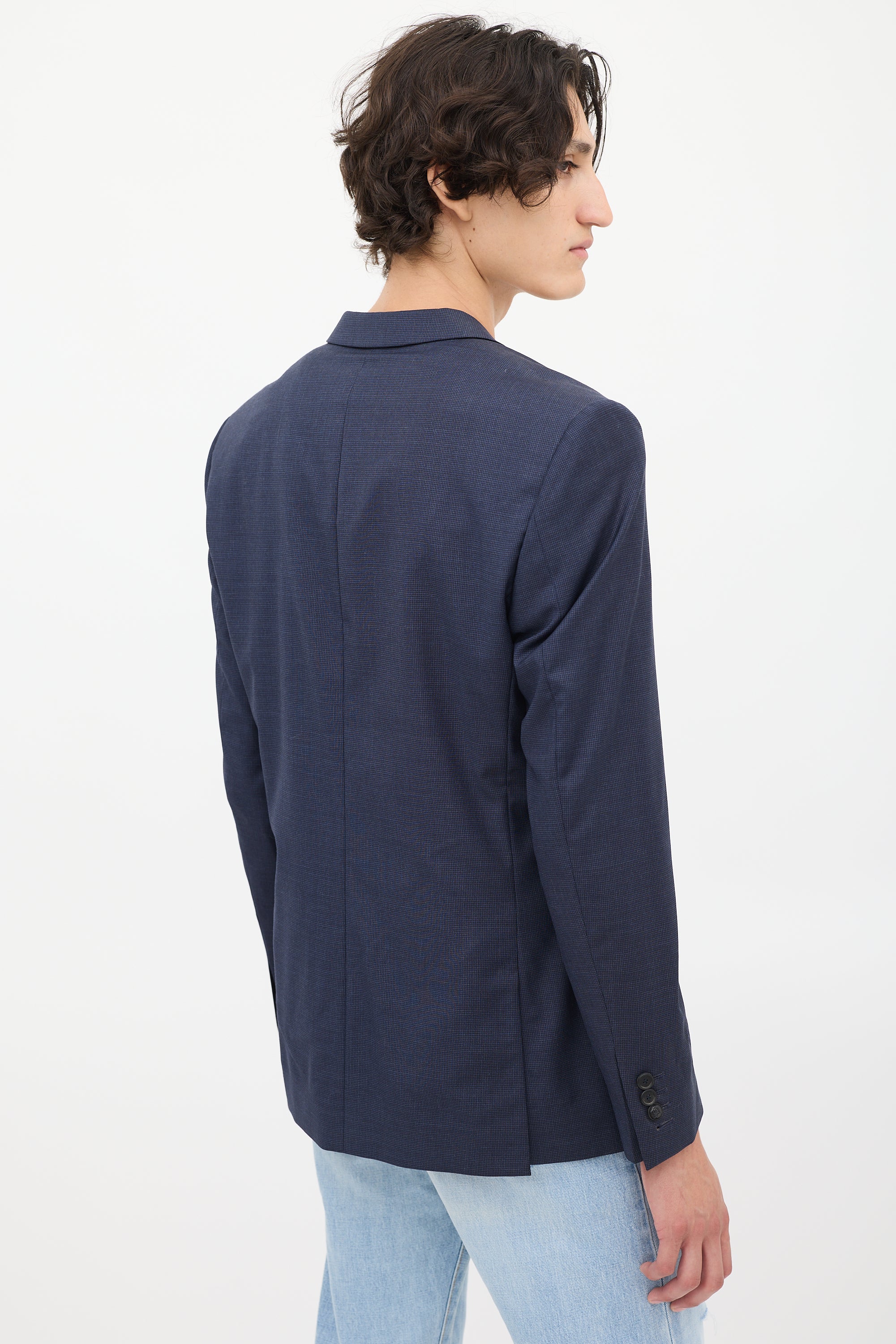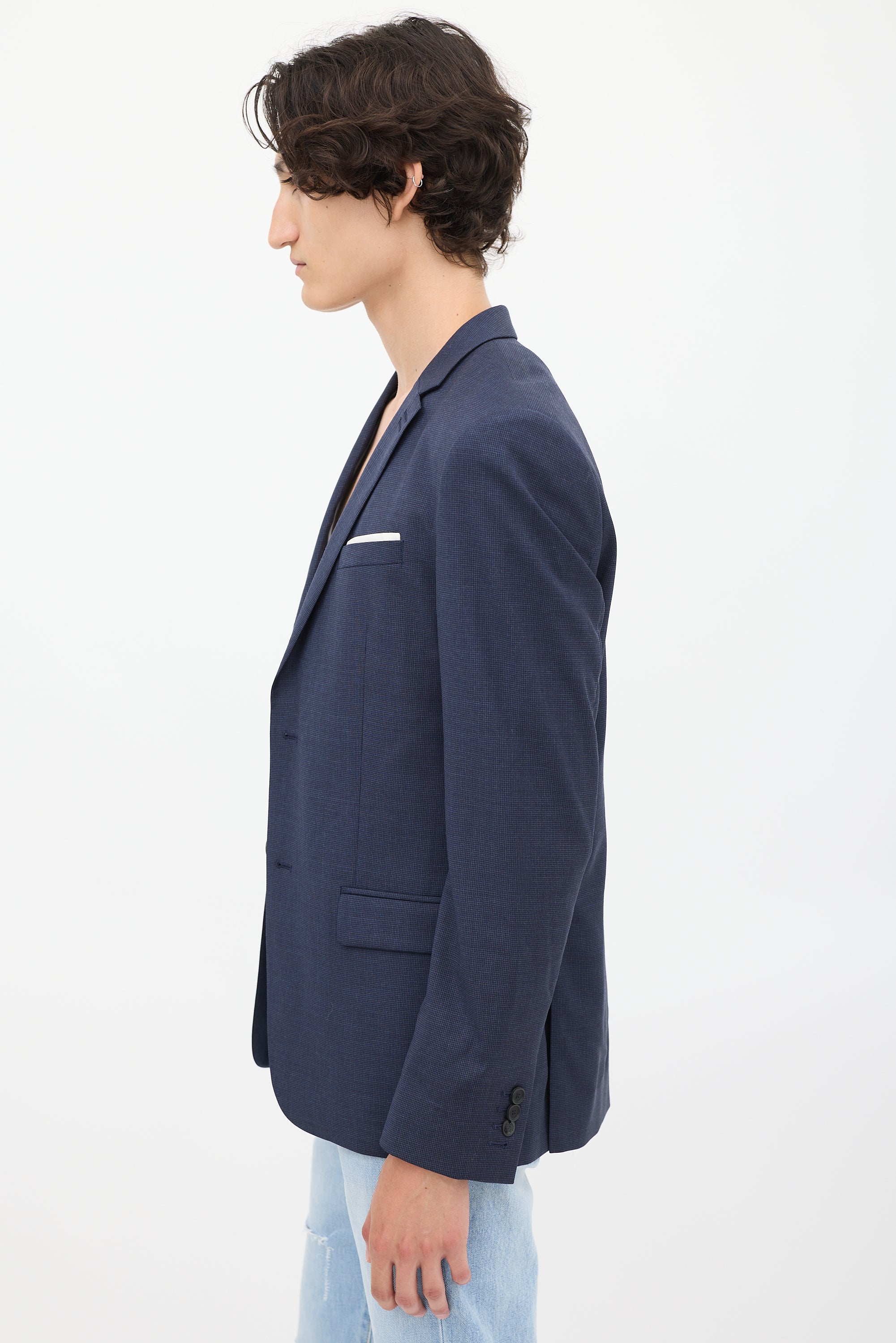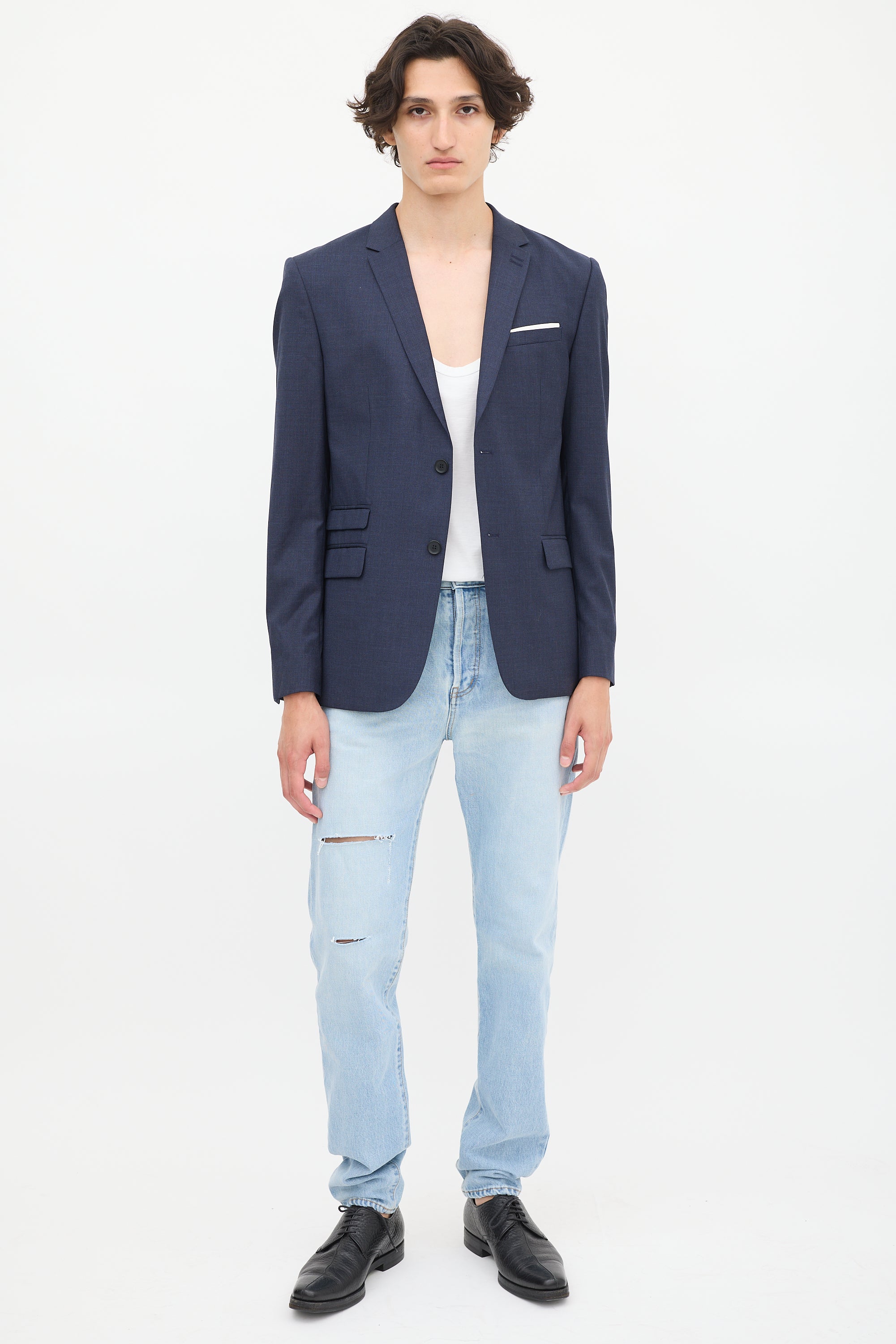 Pre-owned The Kooples navy wool Classic blazer featuring a notched collar, single breast two button front, slip pocket at left chest with faux pocket square detail, three front flap pockets, back double vent, padded shoulders, and long sleeves with buttoned cuffs. Lined.