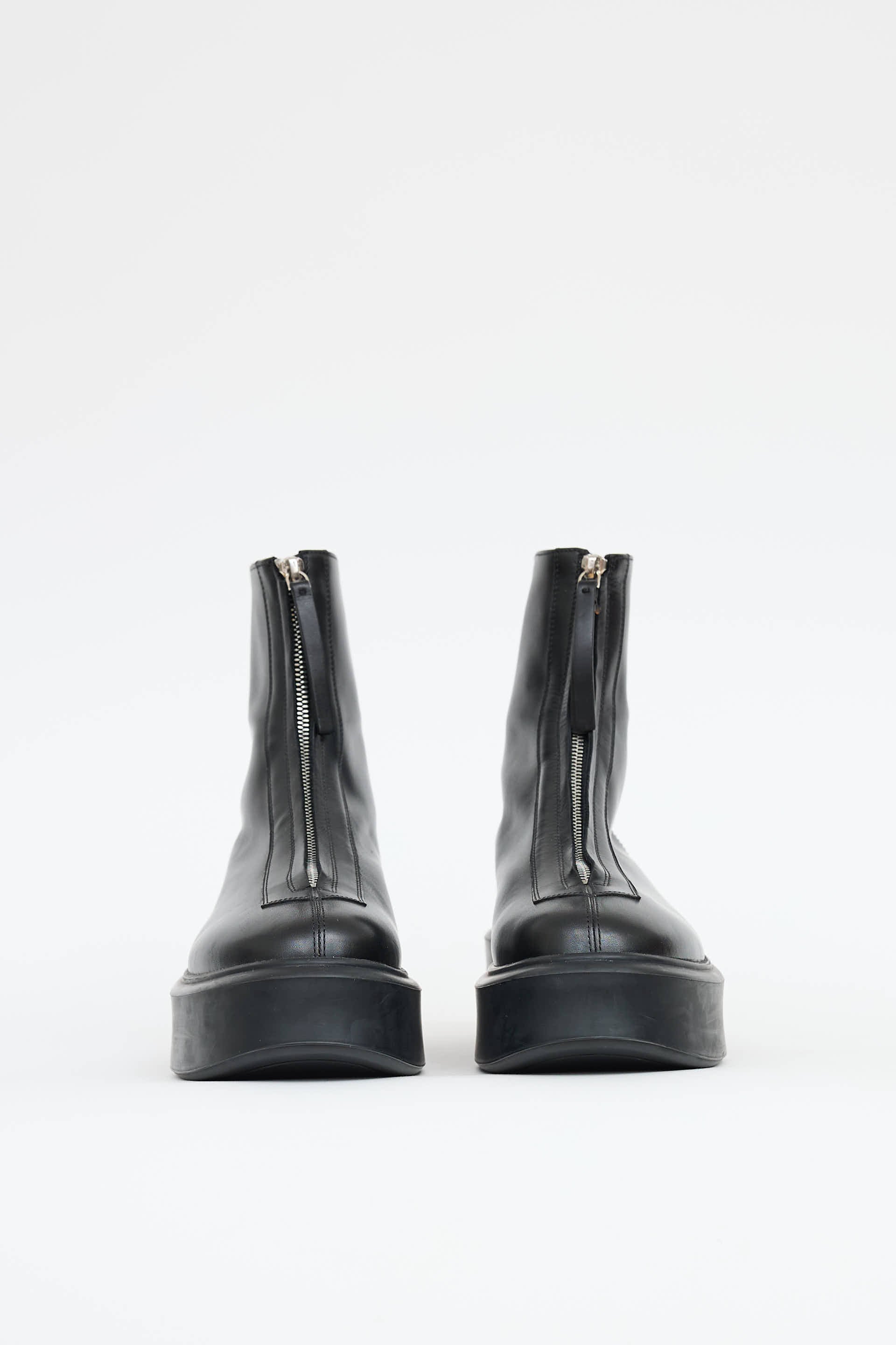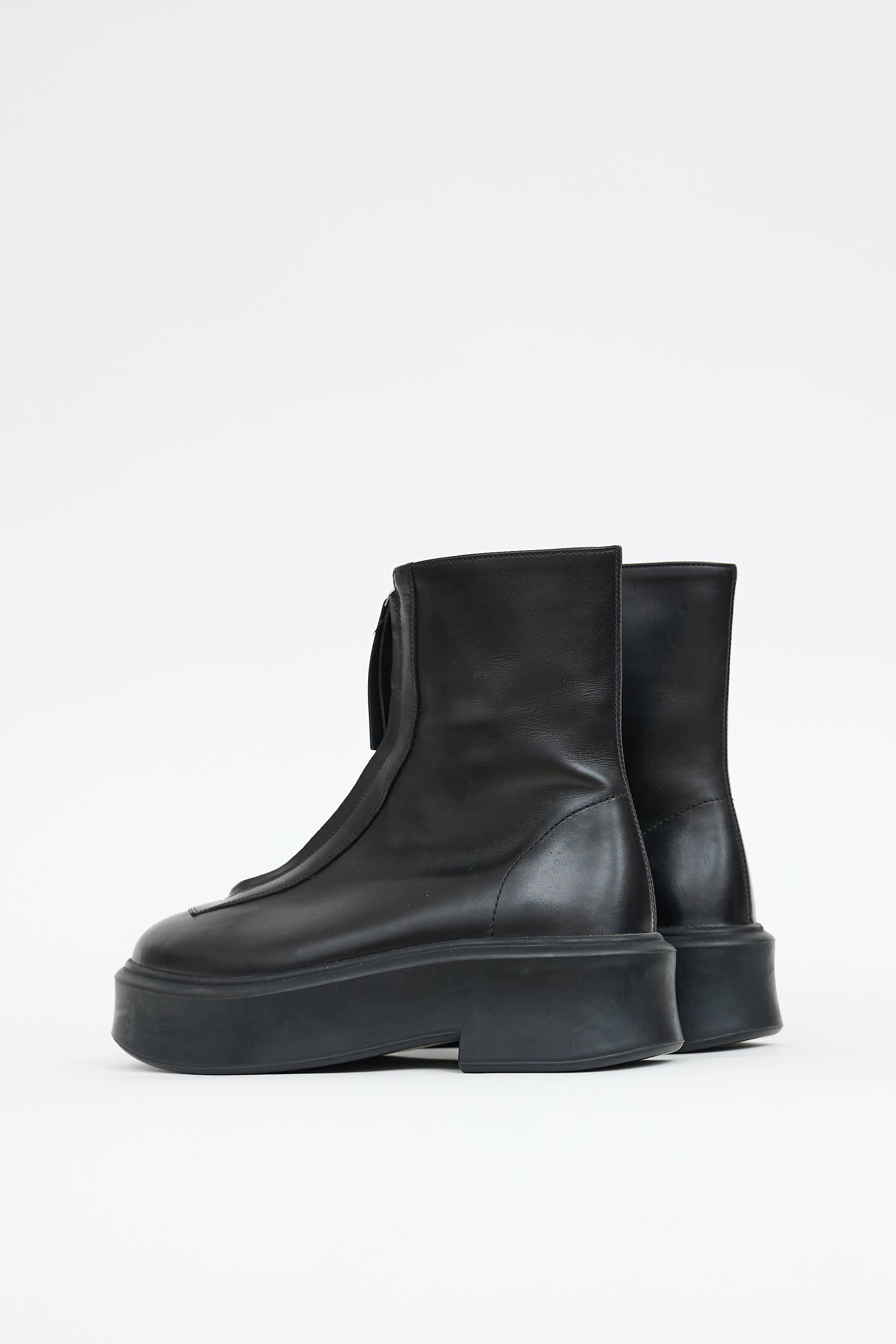 Pre-owned The Row black leather Zipped ankle boots featuring rounded toe, zip up front, and tonal rubber platform sole with block heel.