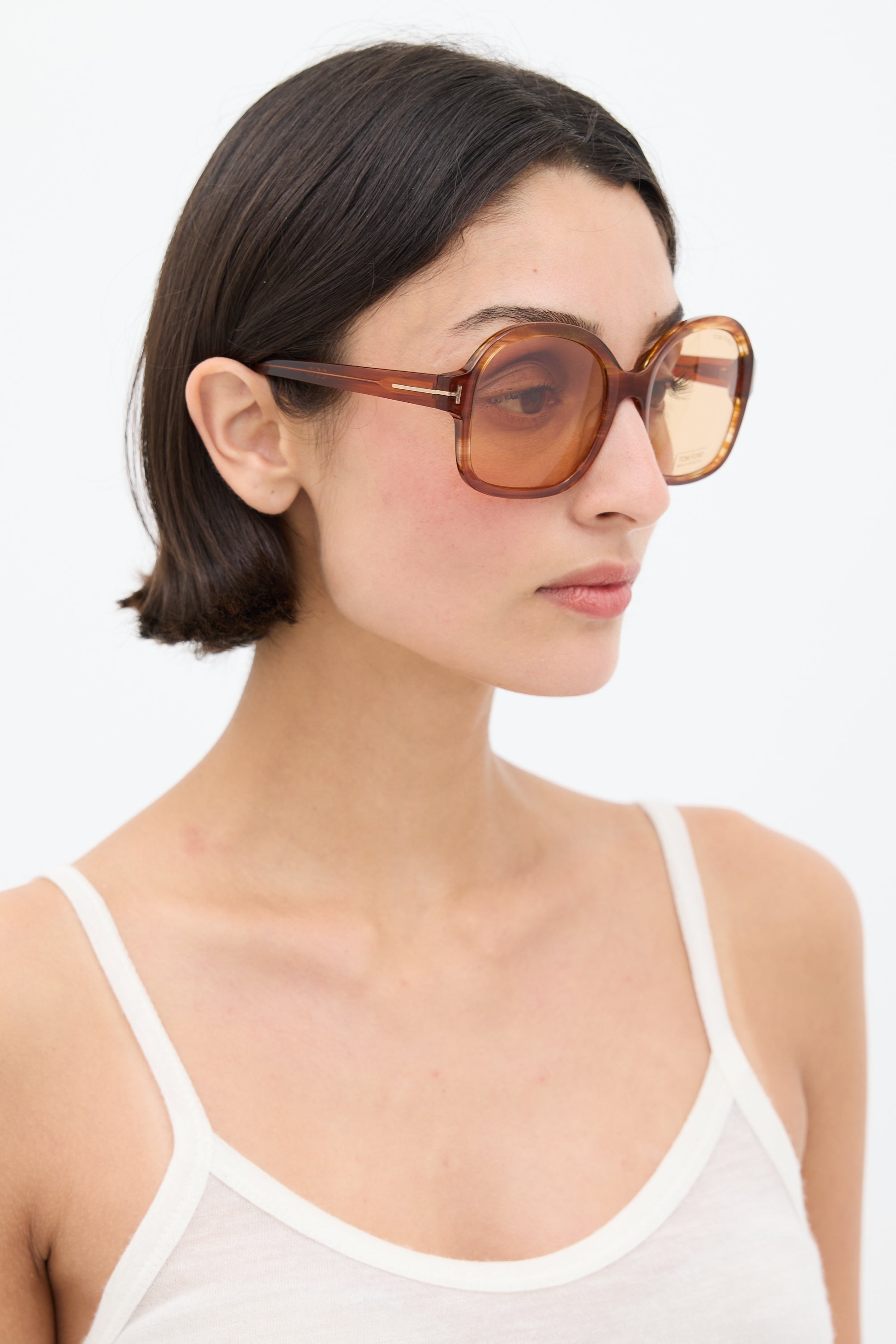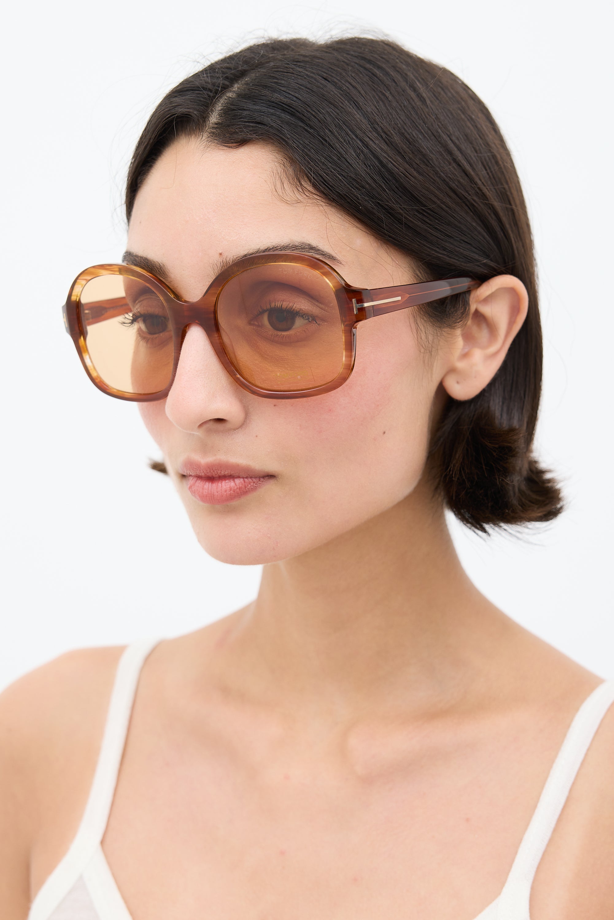 Pre-owned Tom Ford orange TF1034 sunglasses featuring a square frame, tinted lenses, nose pads, and logo hardware at arms. Comes with original box.