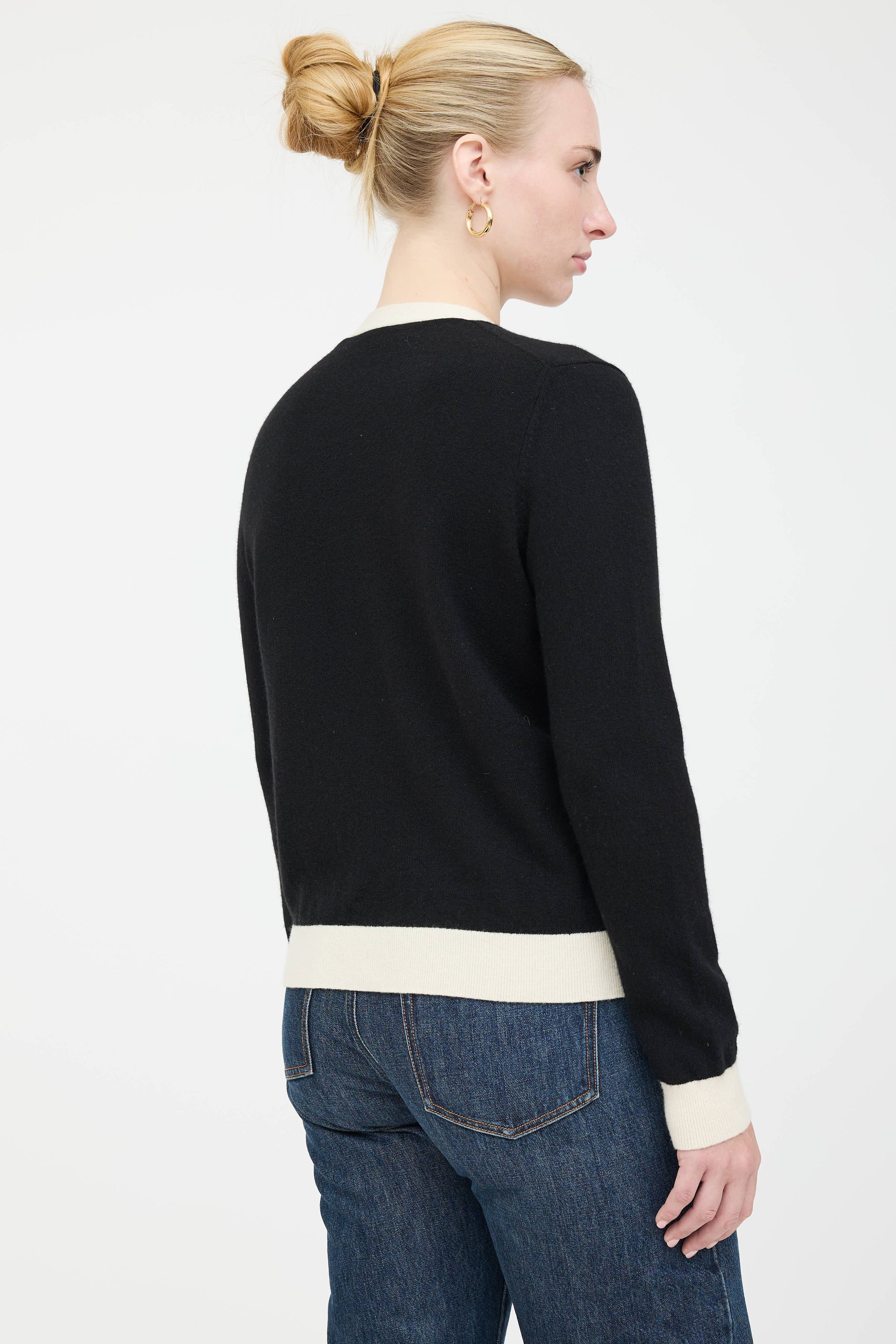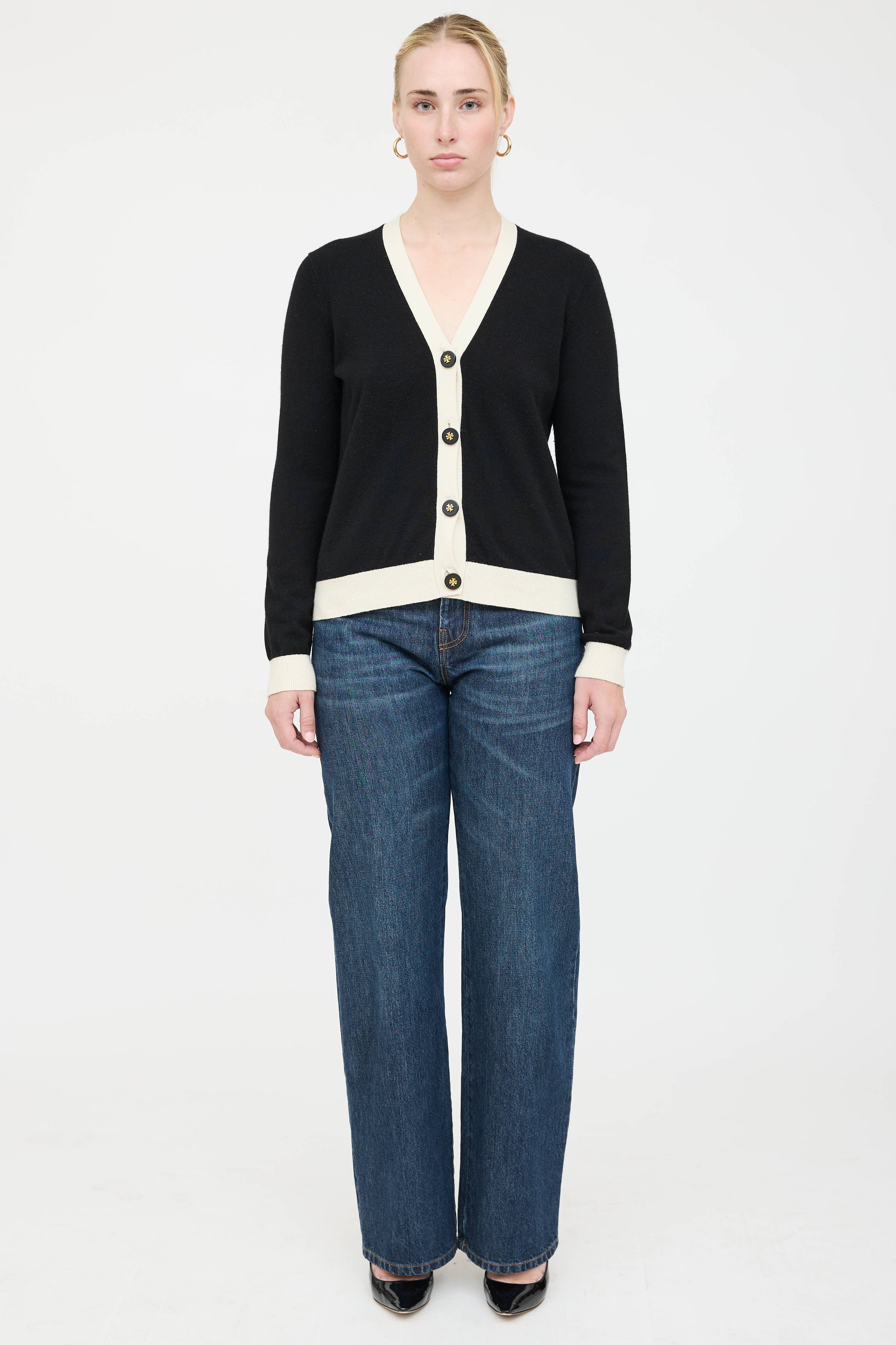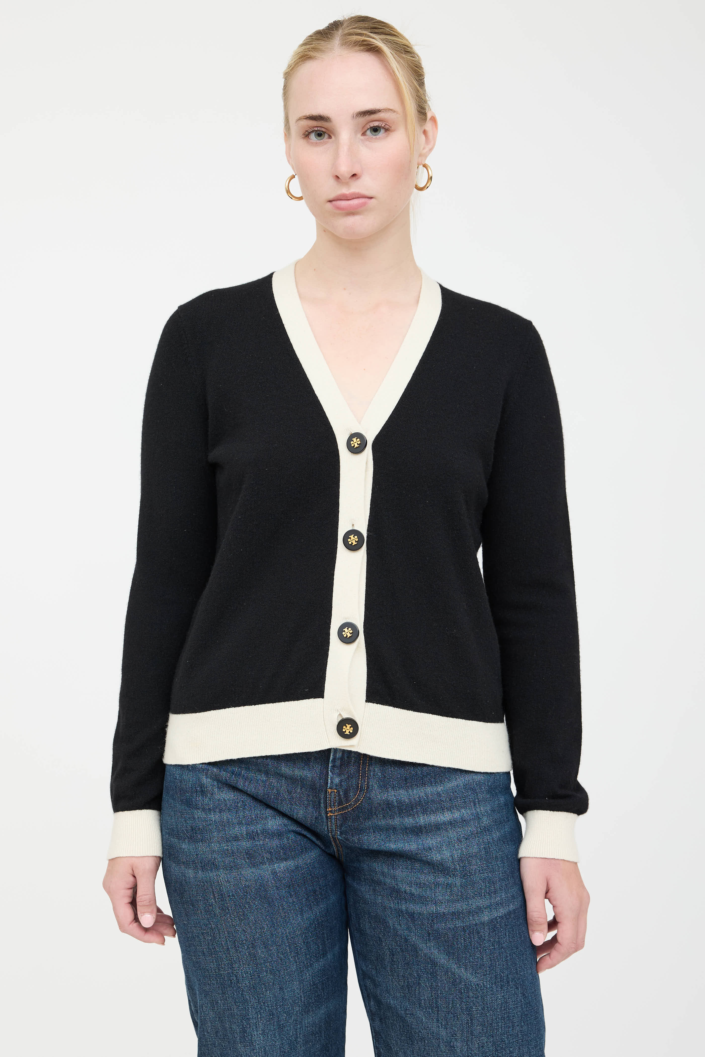 Pre-owned Tory Burch black and white long sleeve cardigan featuring v-neckline, logo embellished button front, and ribbed trims.