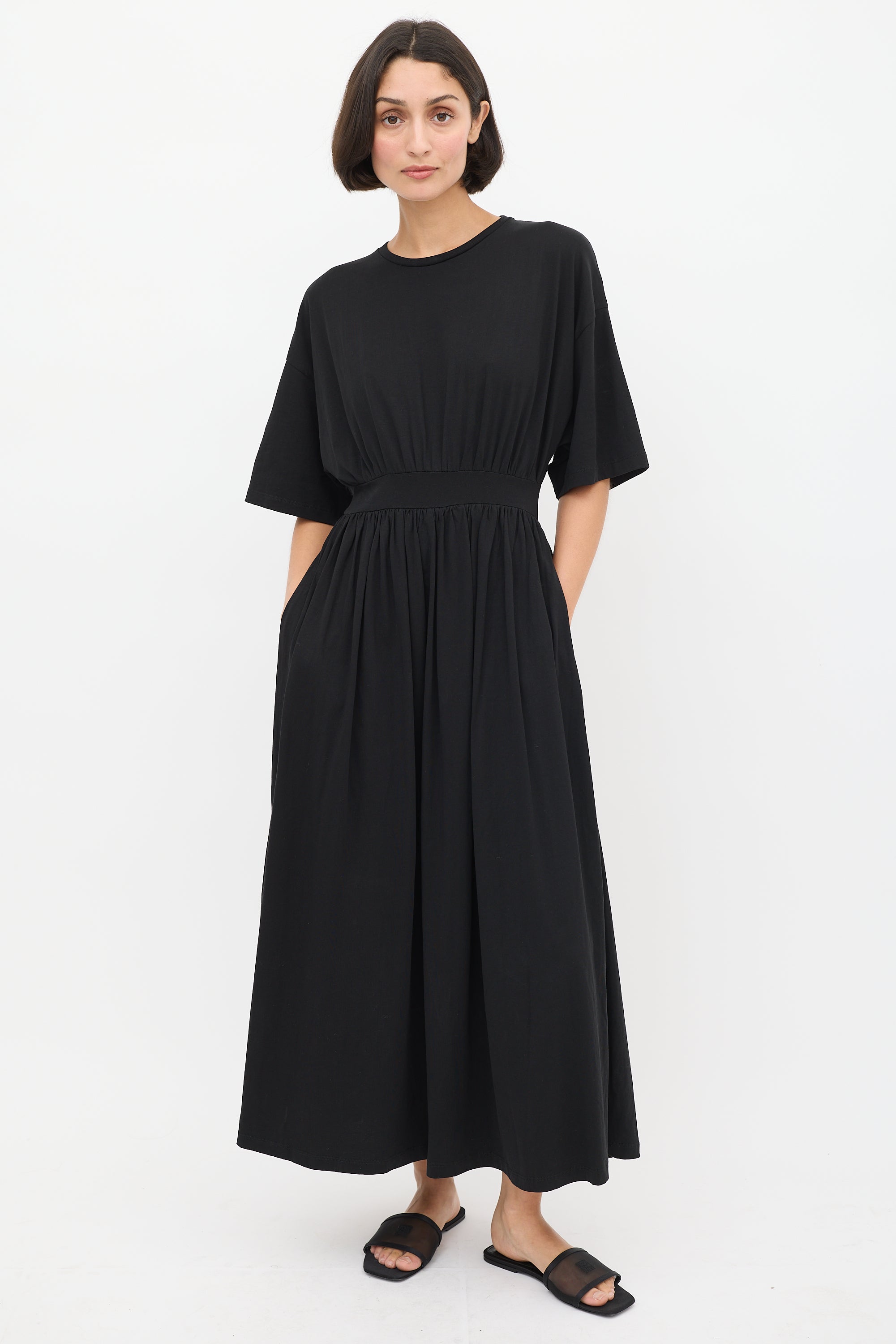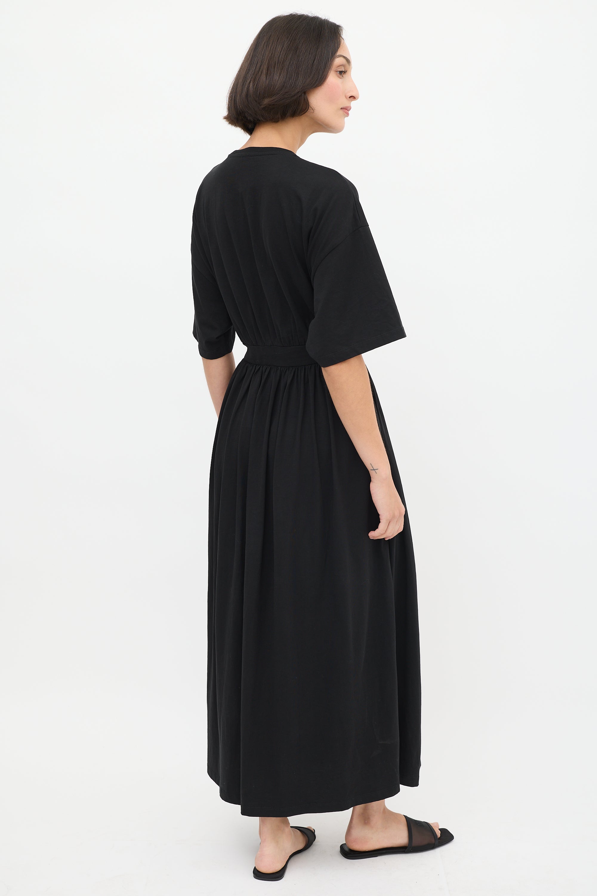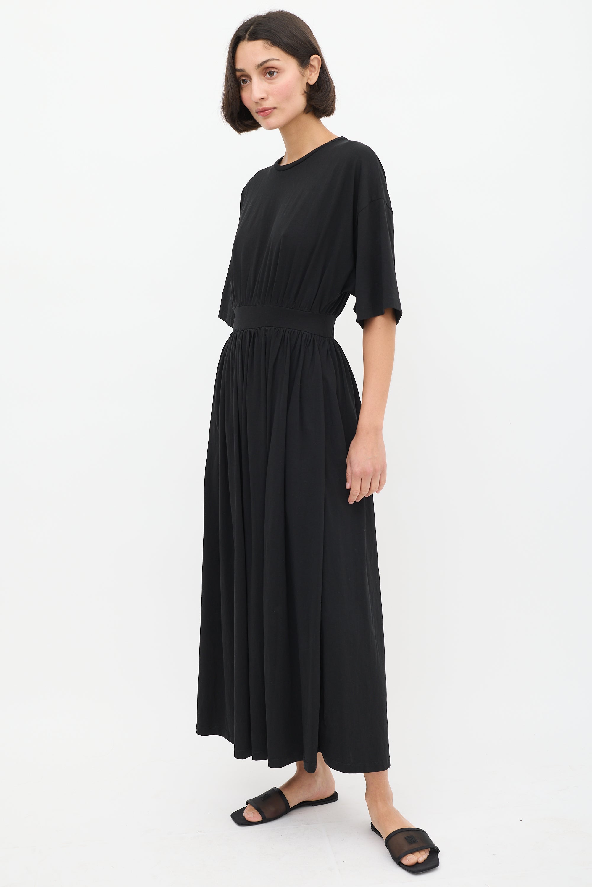 Pre-owned Toteme black Cotton Tee midi dress featuring a round neck, gathering and band at waist, in seam pockets, dropped shoulders, and short sleeves.