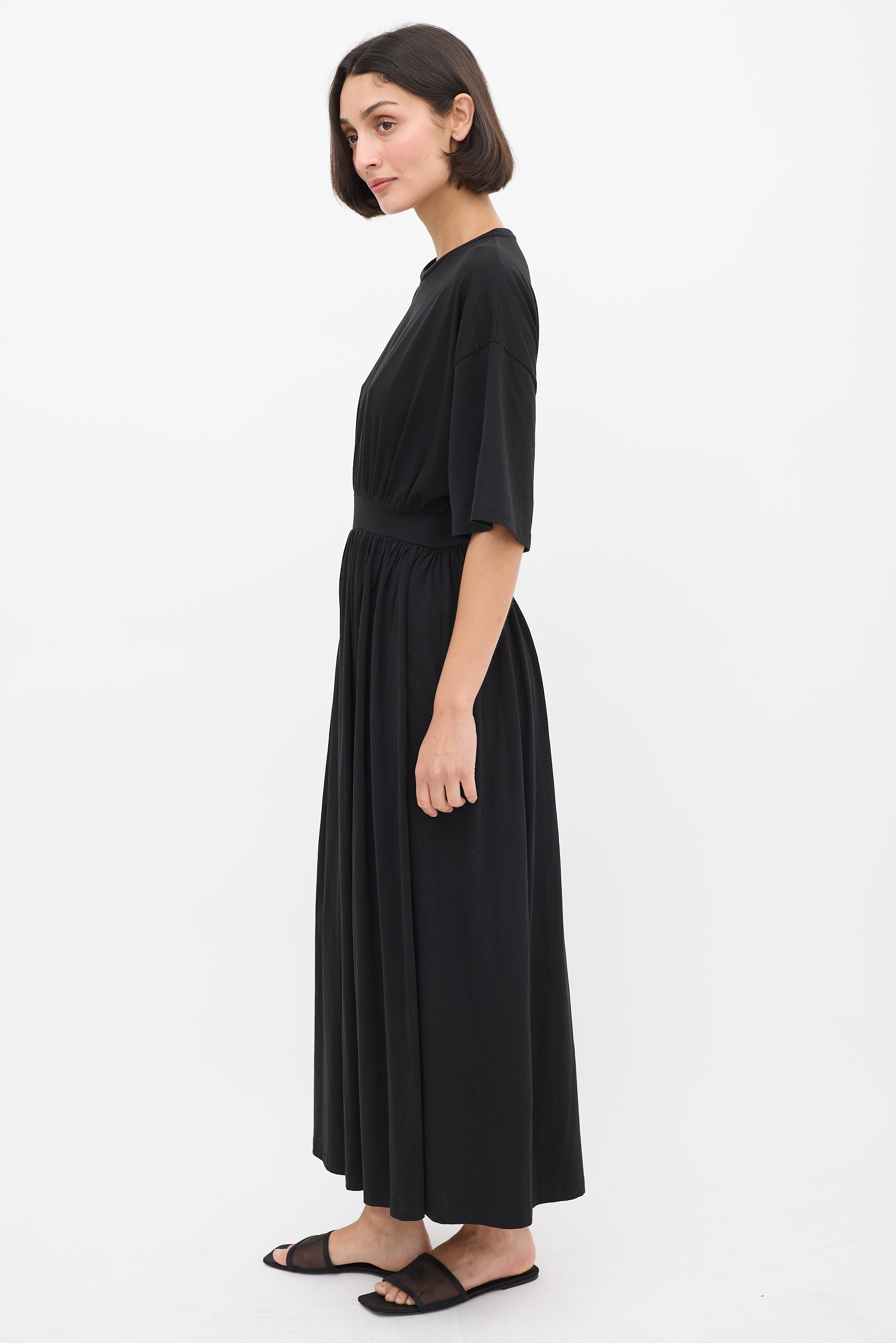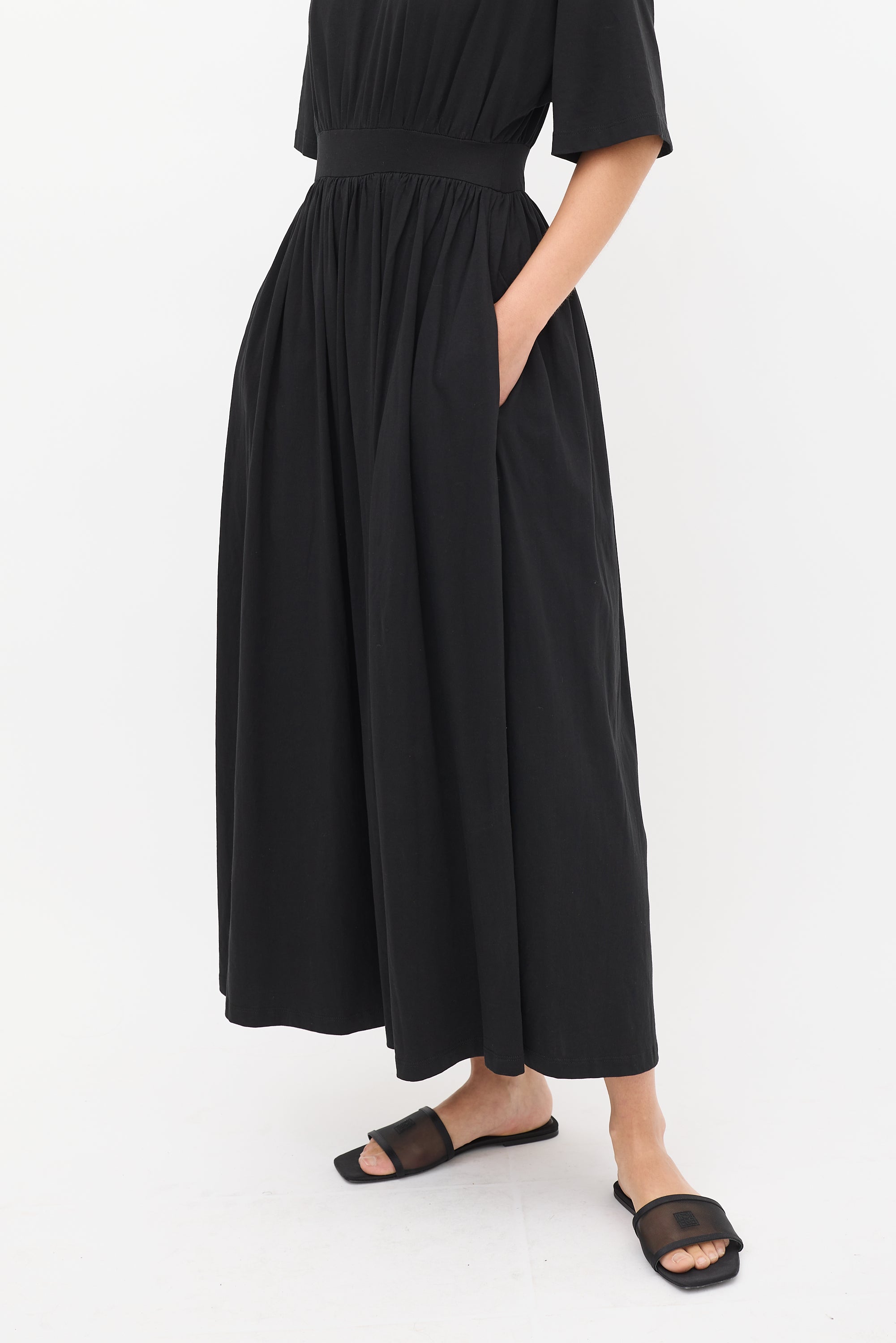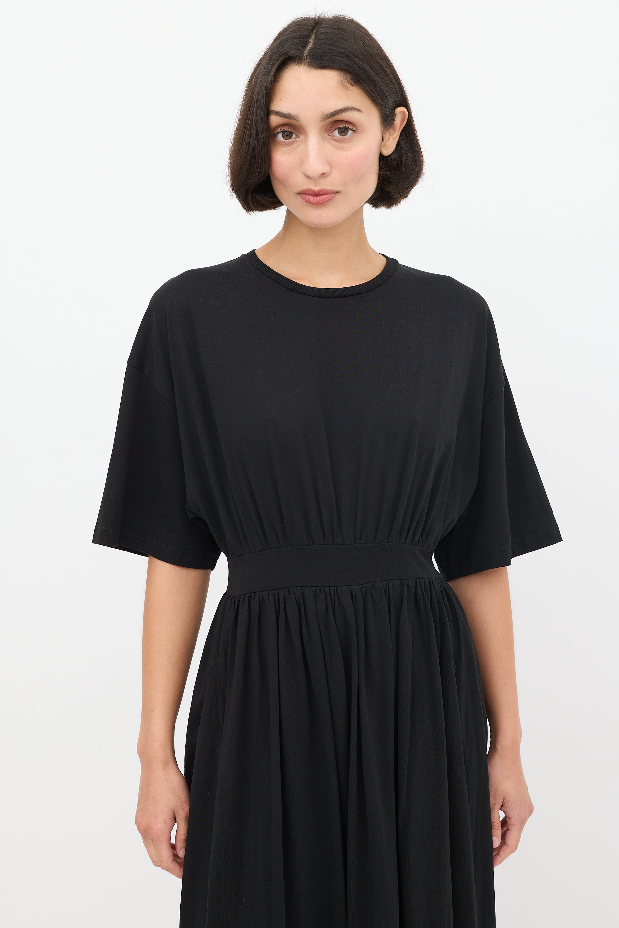 Pre-owned Toteme black Cotton Tee midi dress featuring a round neck, gathering and band at waist, in seam pockets, dropped shoulders, and short sleeves.
