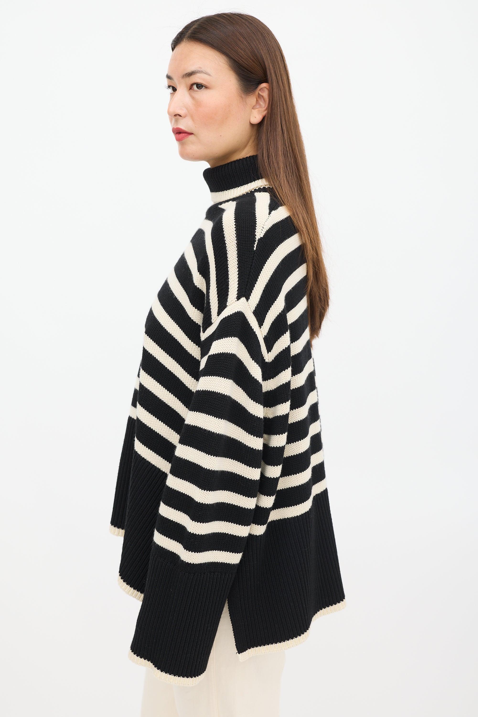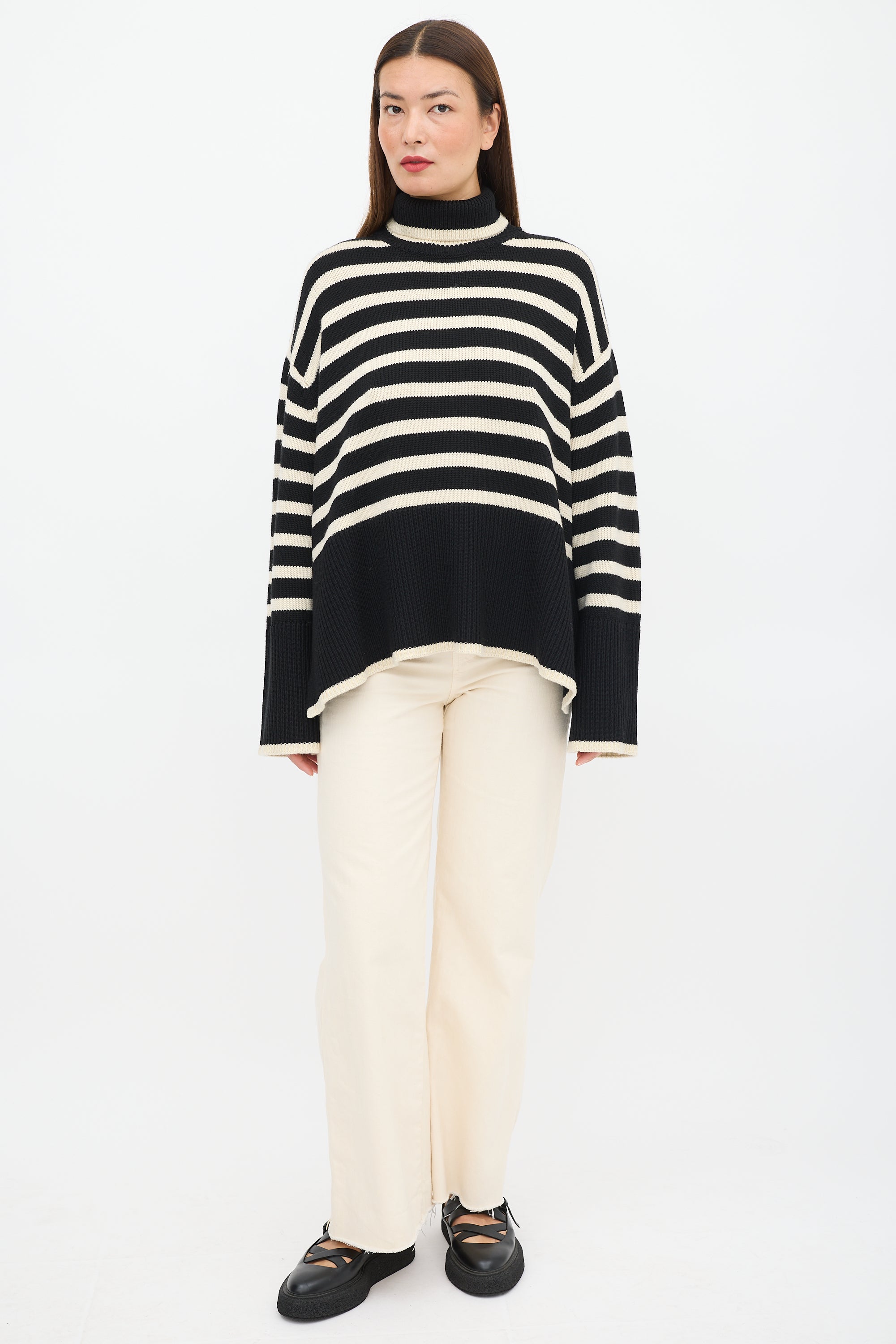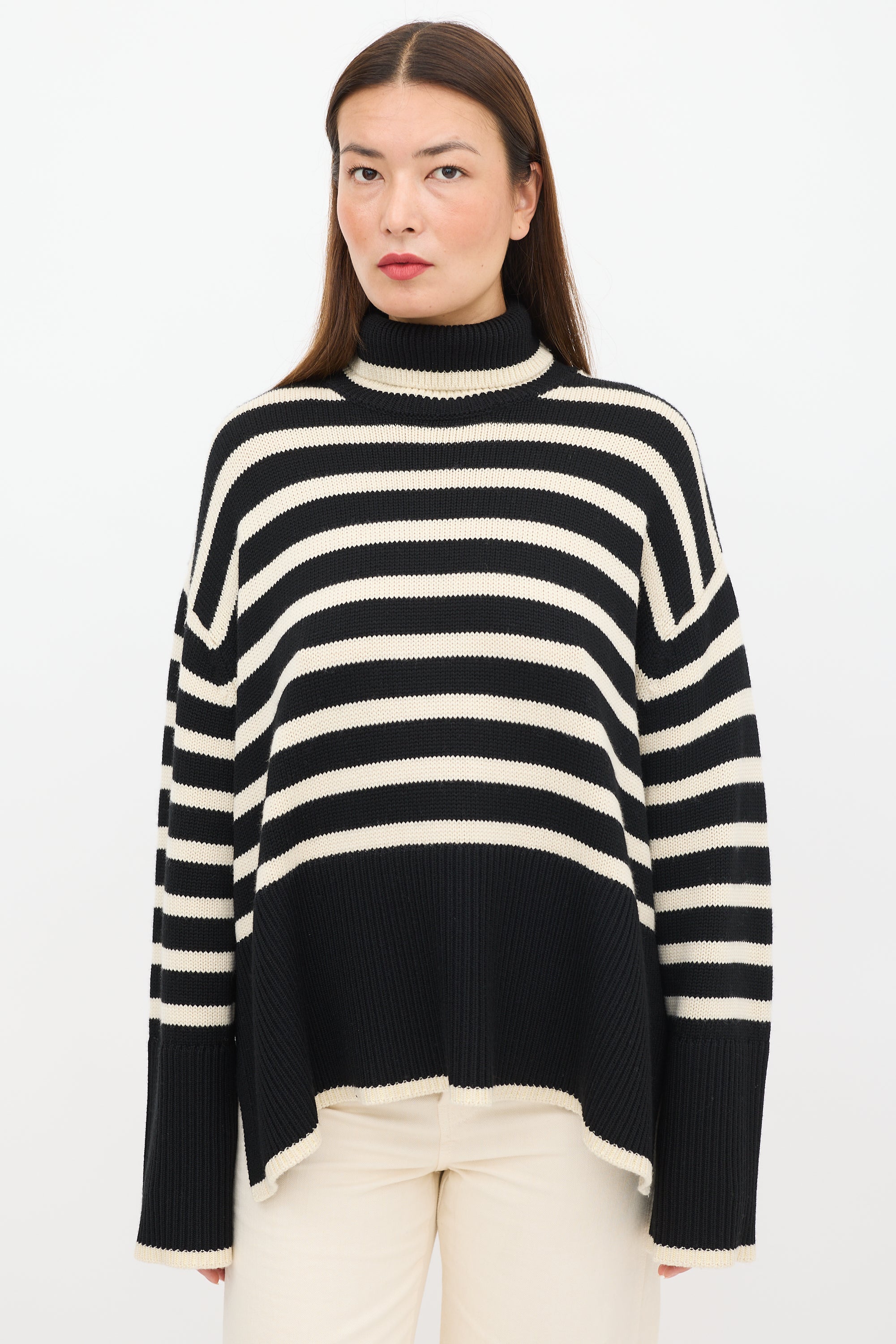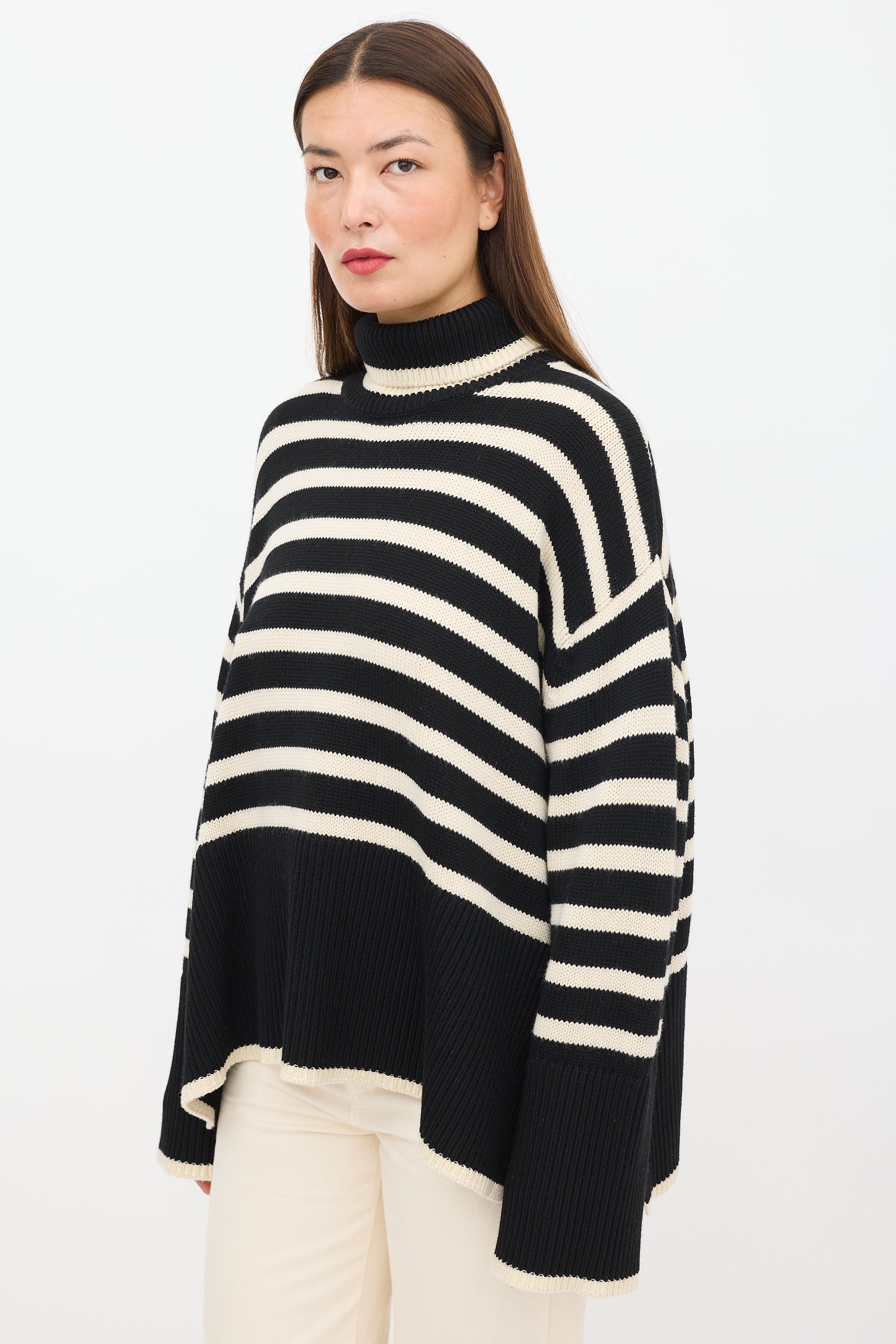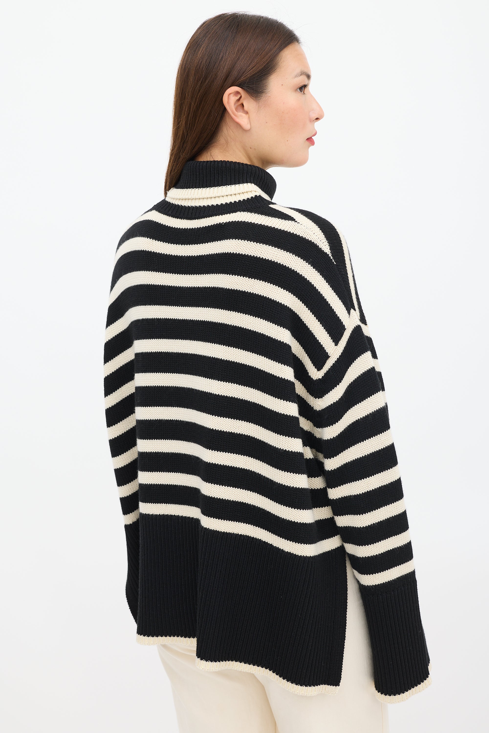 Pre-owned Toteme black wool knit sweater featuring a cream striped pattern throughout, turtleneck, long sleeves with ribbed cuffs, slits at side, and ribbed hem.