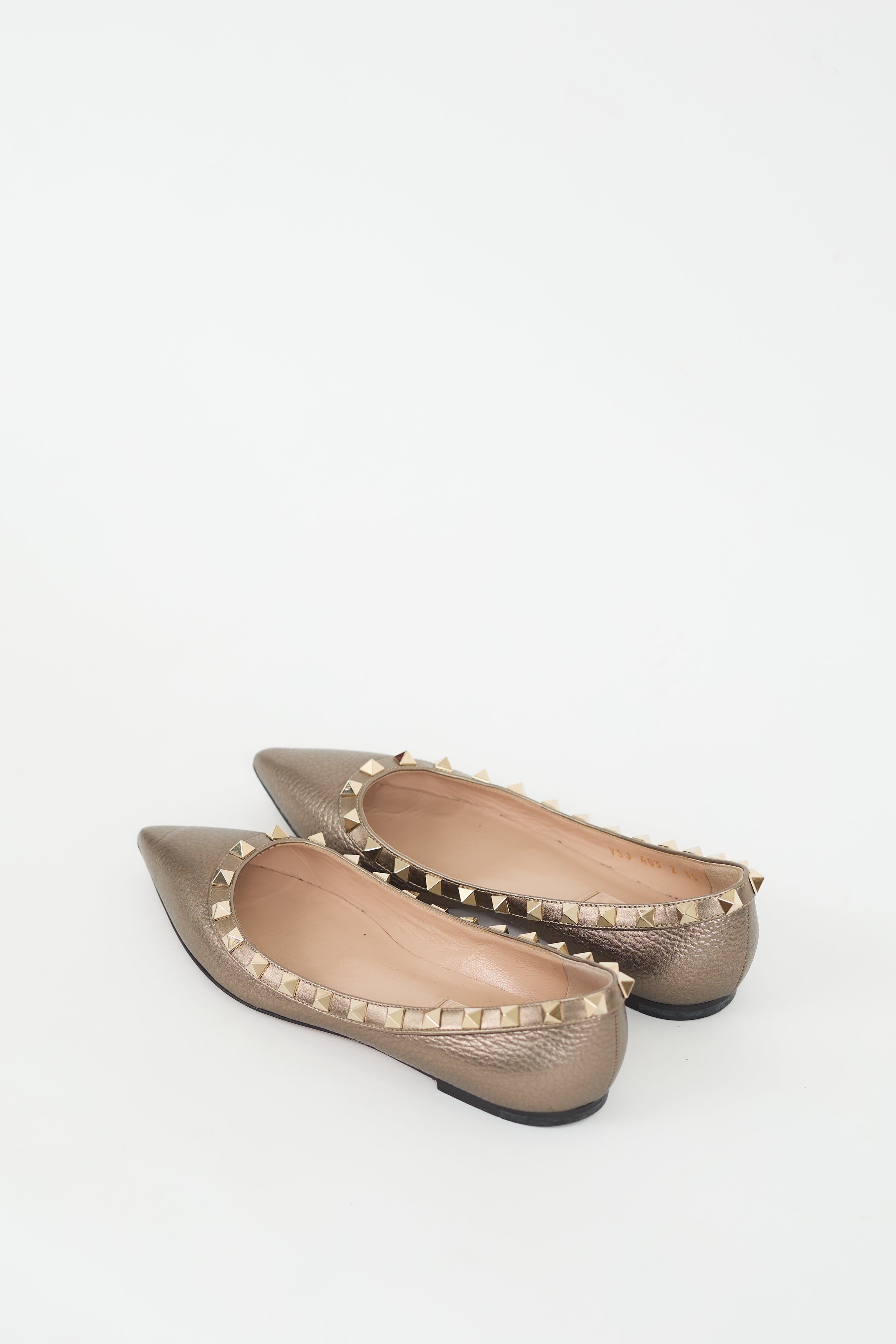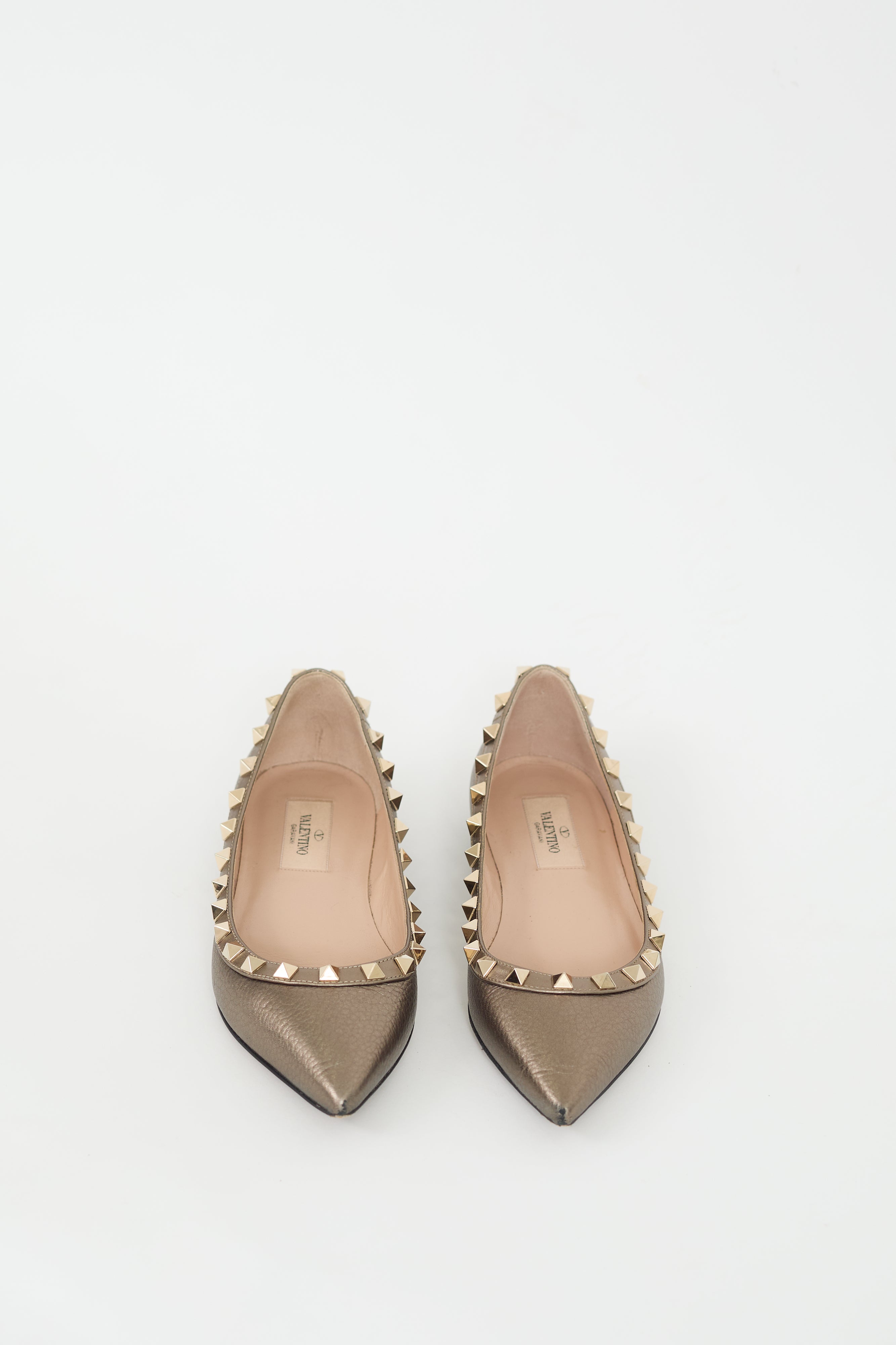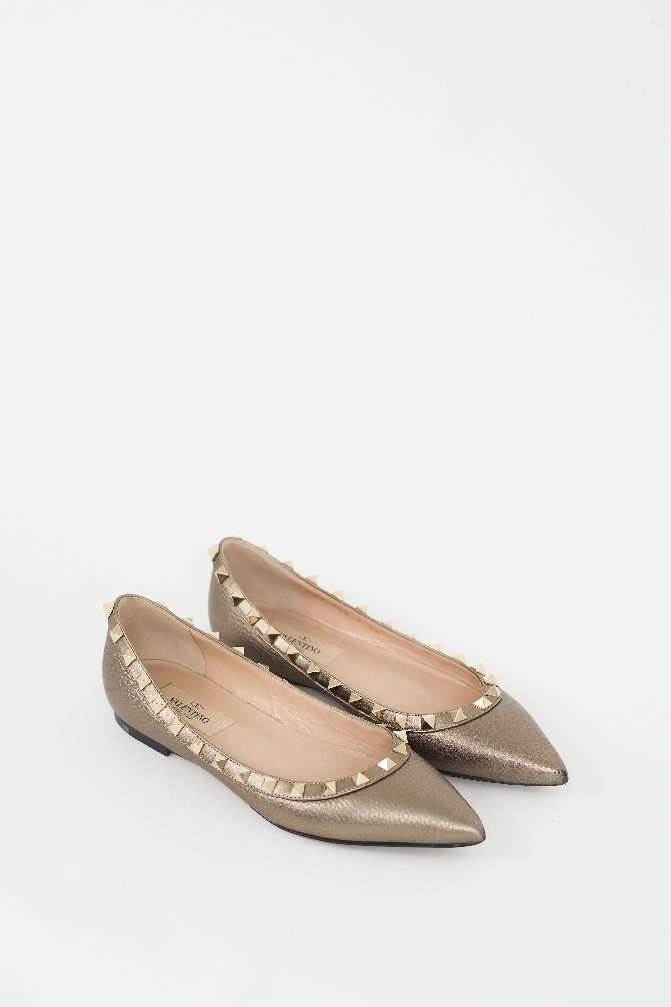 Pre-owned Valentino gold leather ballet flats featuring pointed toe, slip on entry, and gold tone Rockstud embellishment at collar.