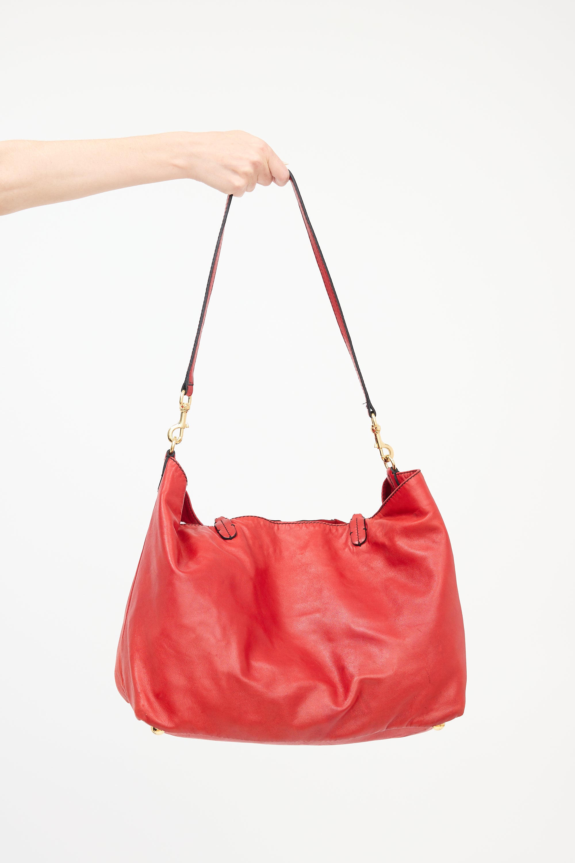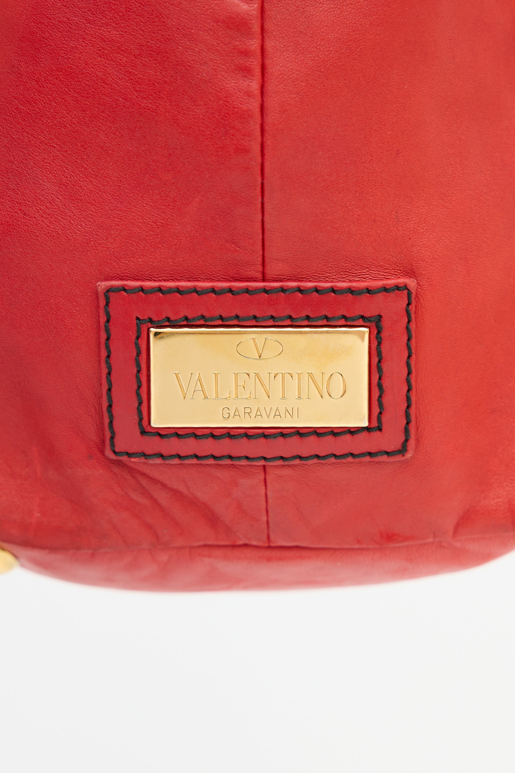 Pre-owned Valentino red leather Petale Rose tote bag featuring two flat top handles, black stitching throughout, detachable shoulder strap, gold tone hardware, large tonal floral applique at centre, metal logo plaque at side, five protective feet, magnetic snap button top closure, one satin lined main compartment, and one interior slip pocket. Entrupy certificate included.