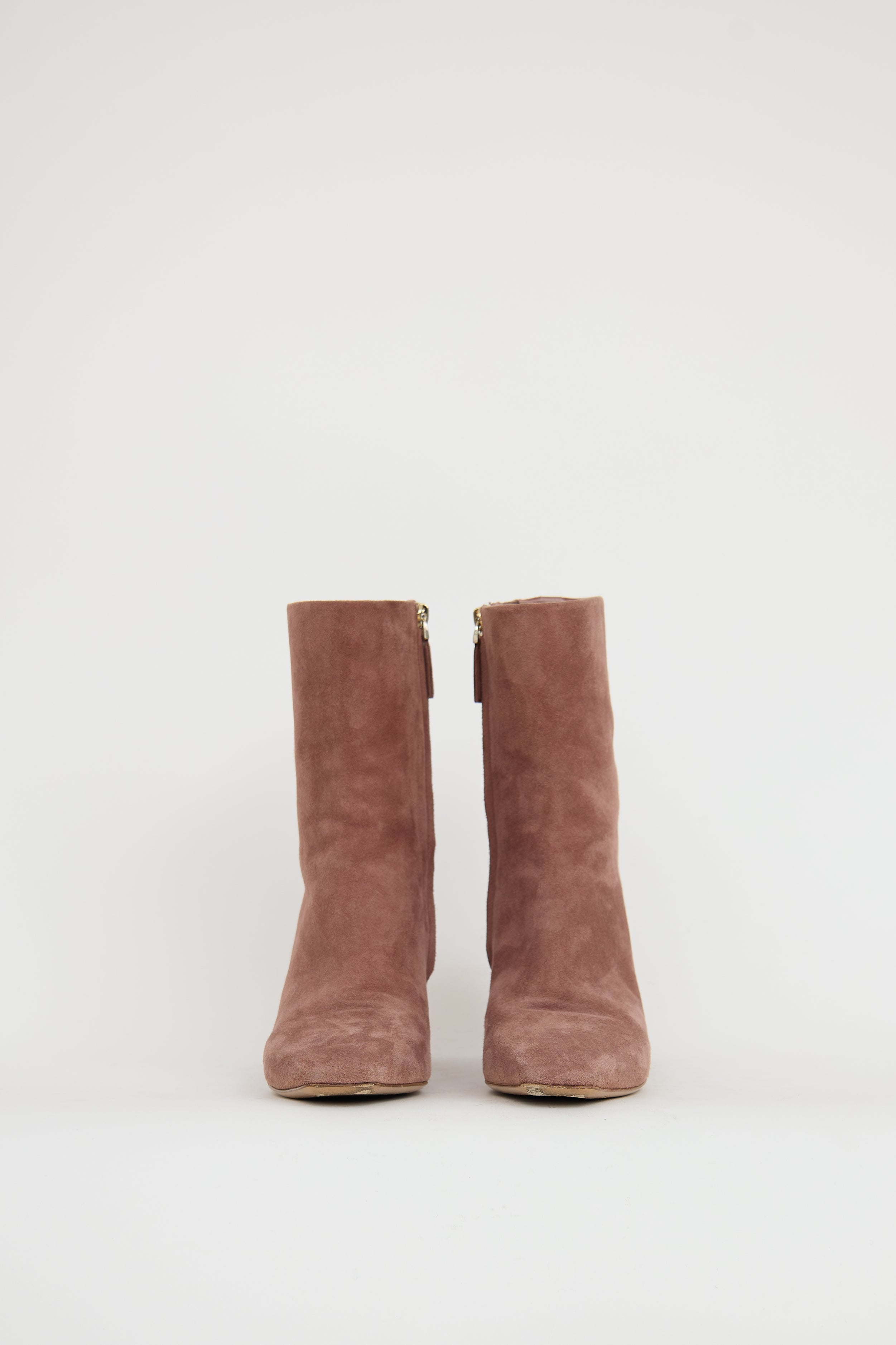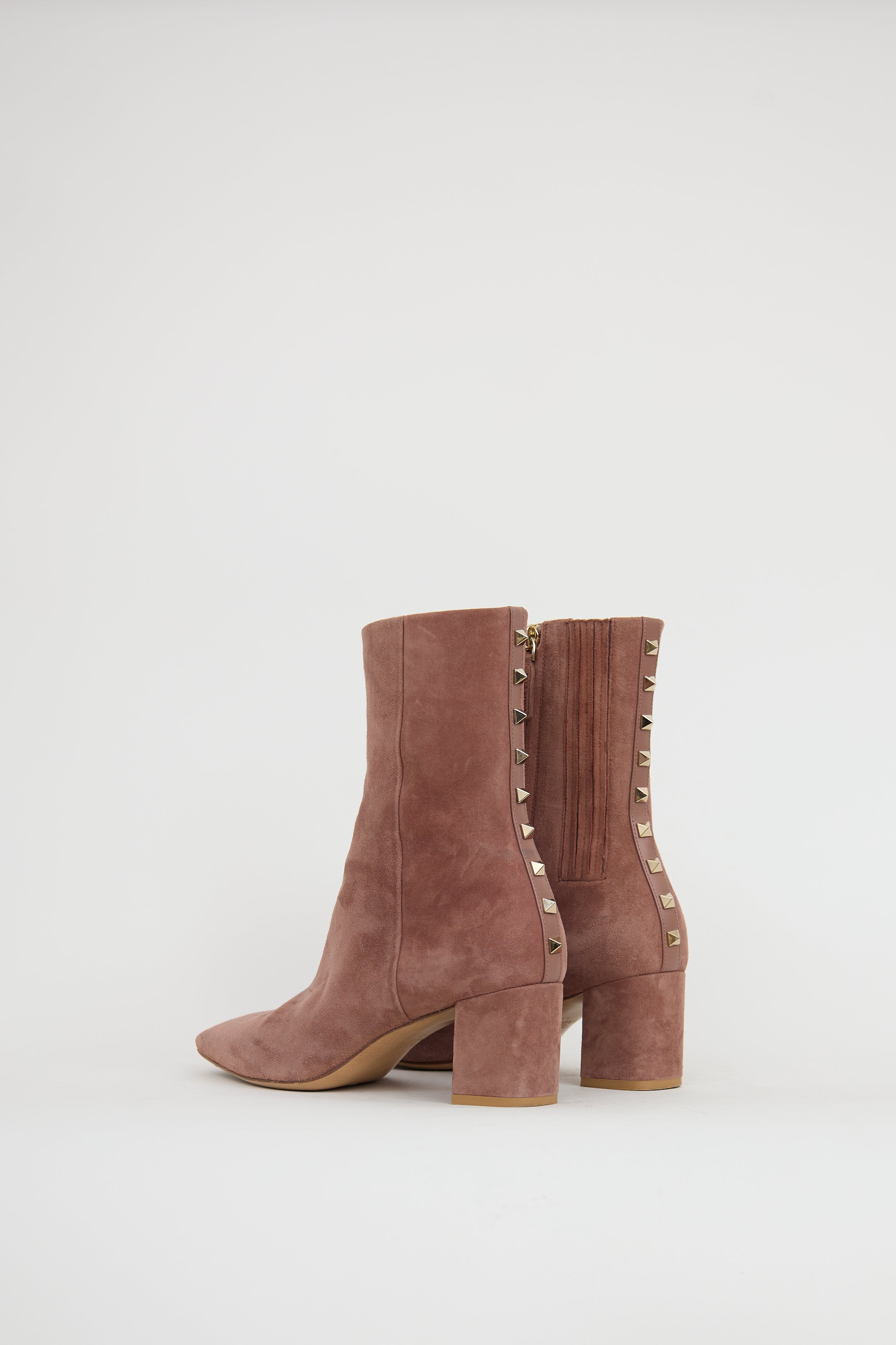 Pre-owned Valentino pink suede boots featuring a square toe, wrapped block heel, gold tone rockstud embellishment at back, and zip closure at side.