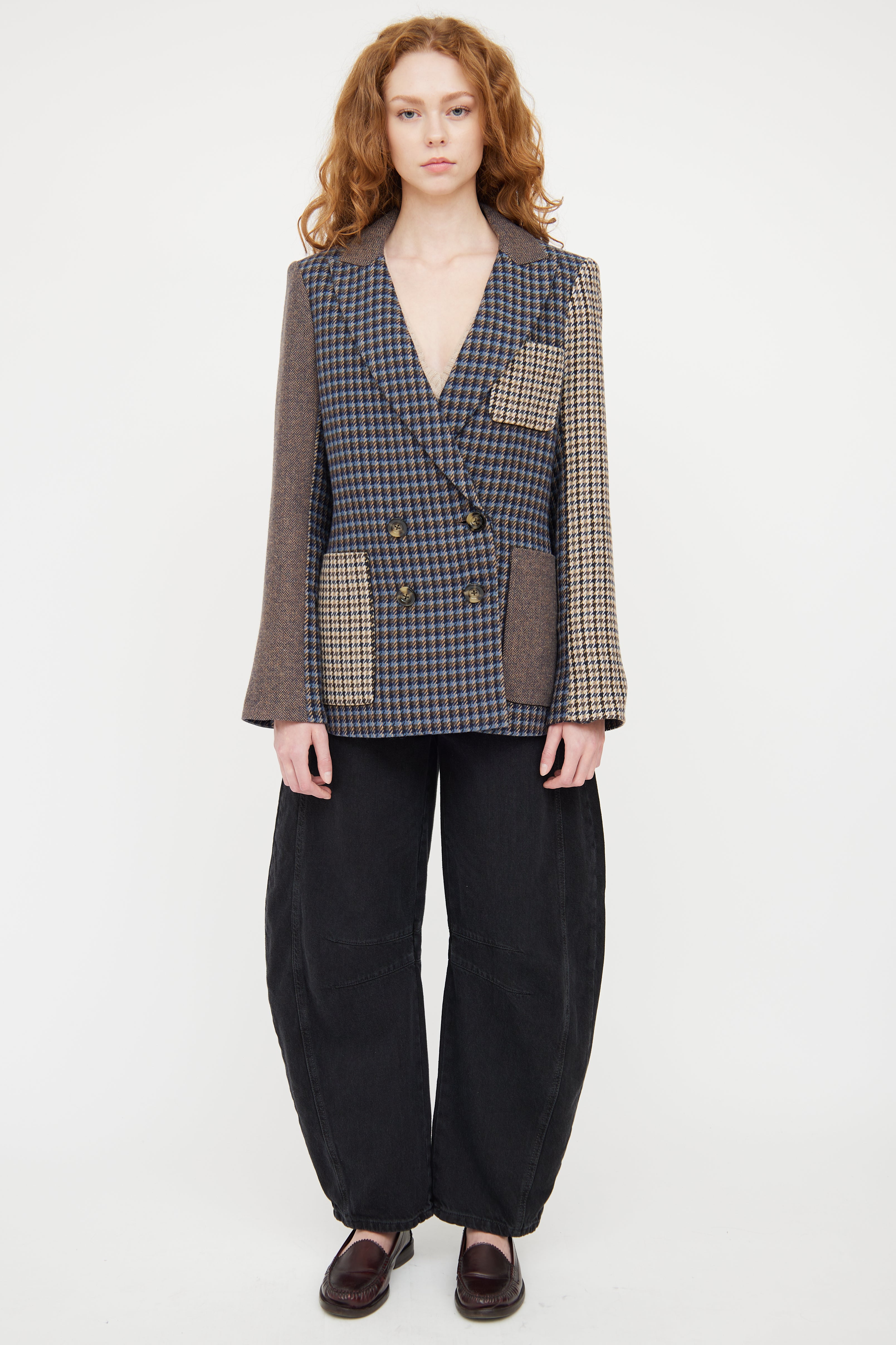 Pre-owned Veronica Beard blue blazer featuring a multicolour houndstooth pattern throughout, peak lapel, long sleeves with buttoned cuffs, one patch pocket at chest, two patch pockets at hip, and double breasted button closure. Lined.