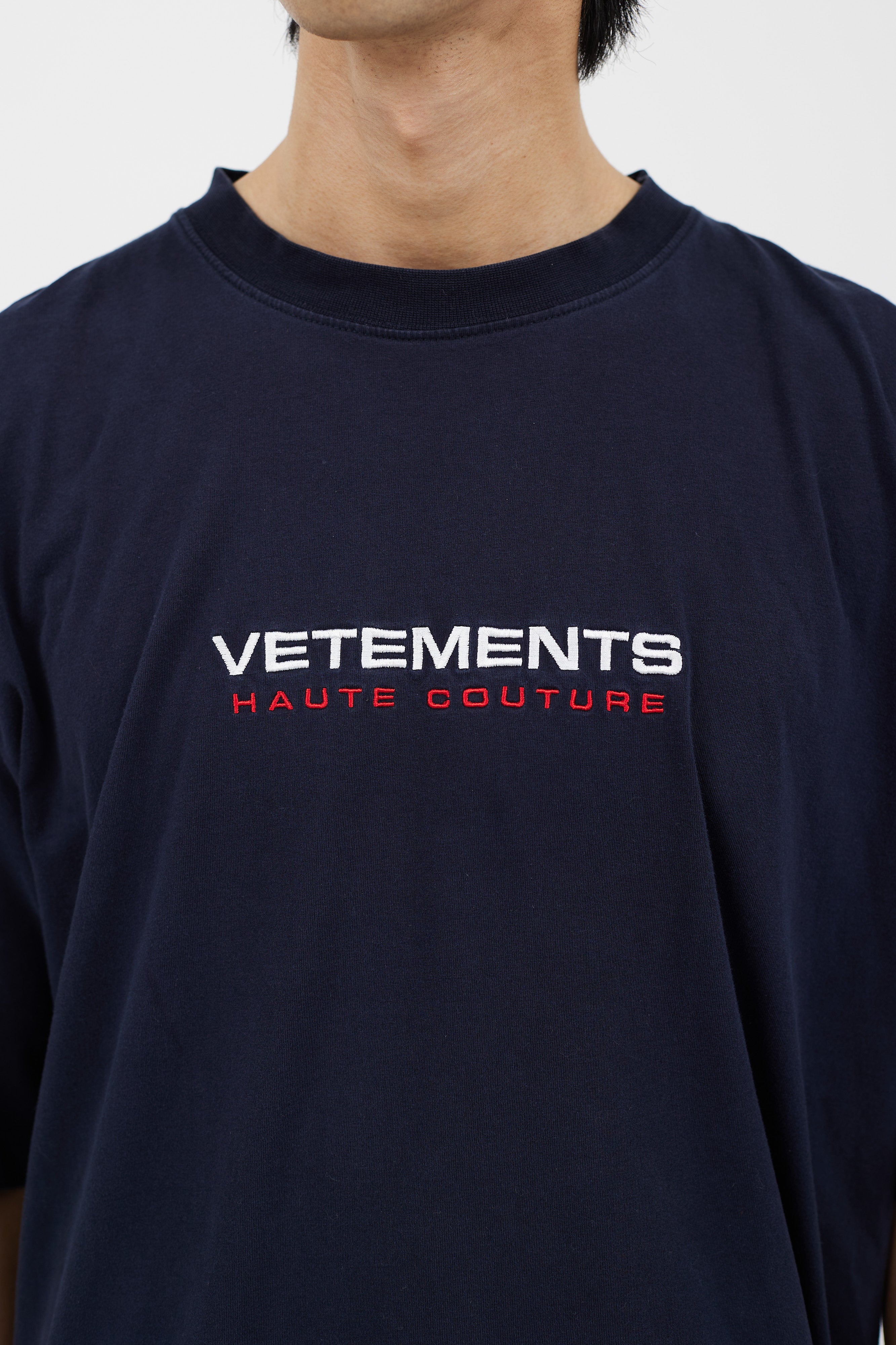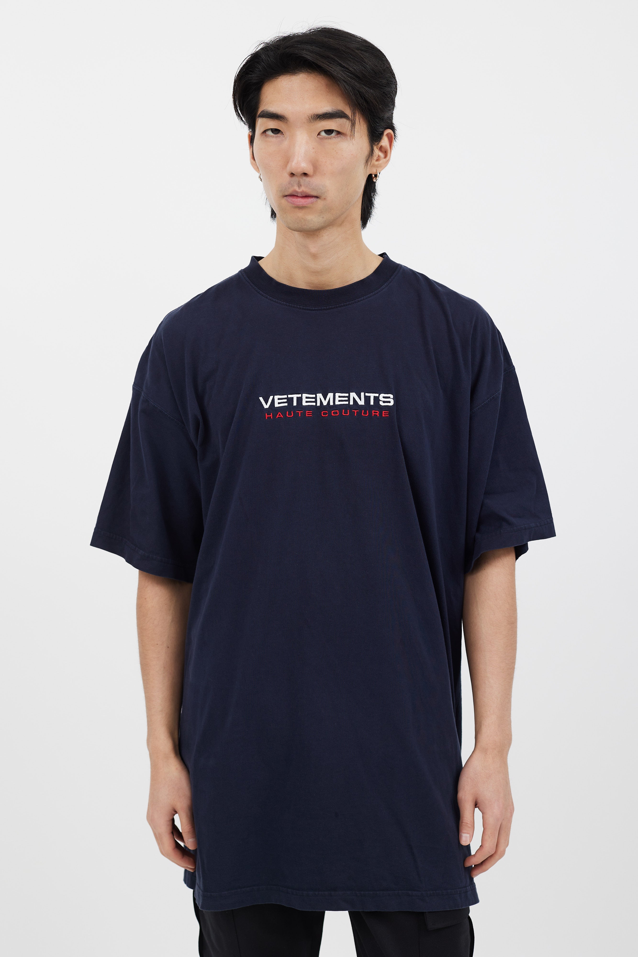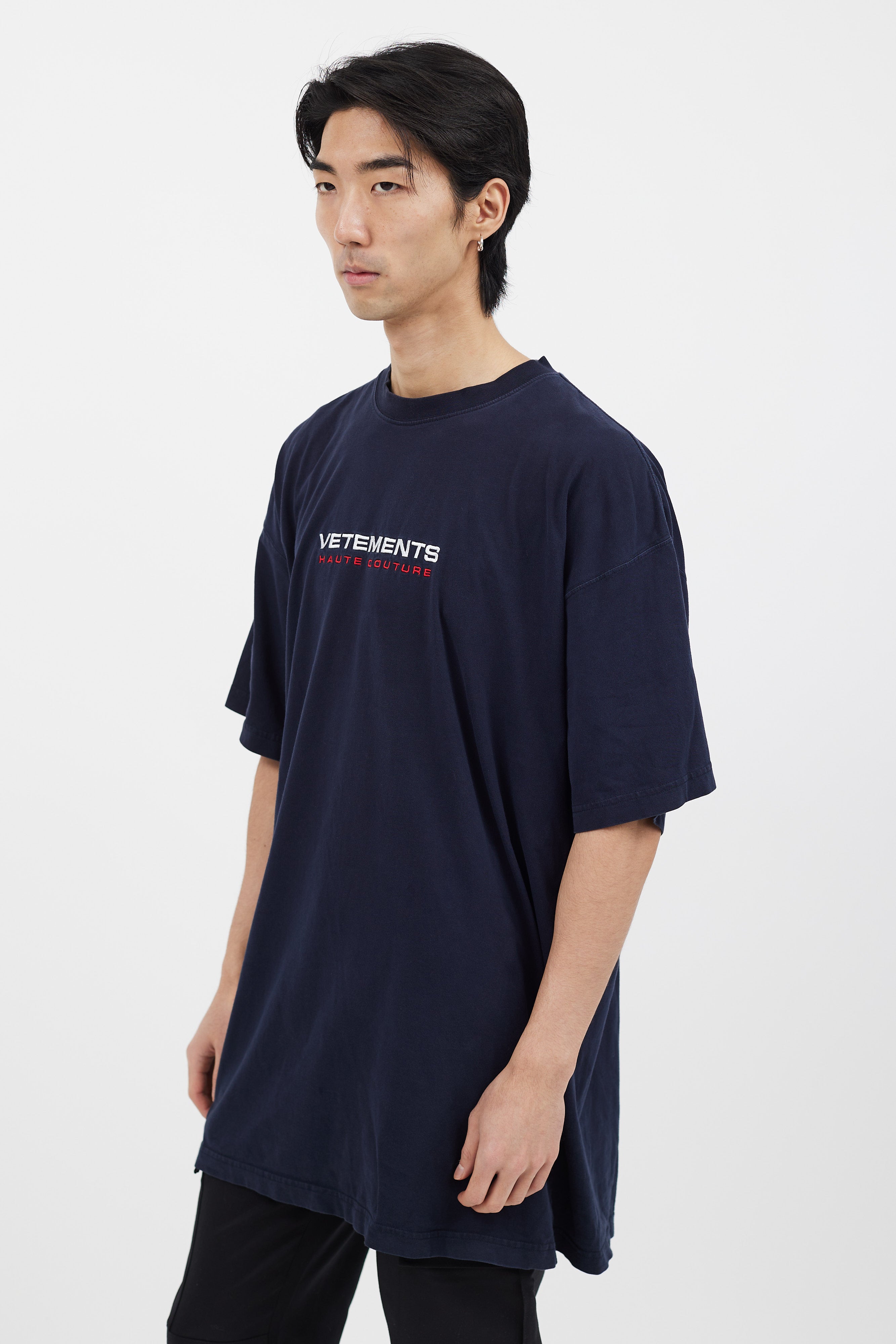 Pre-owned Vetements navy t-shirt featuring white and red embroidered logo at front, crew neckline, and short sleeves.