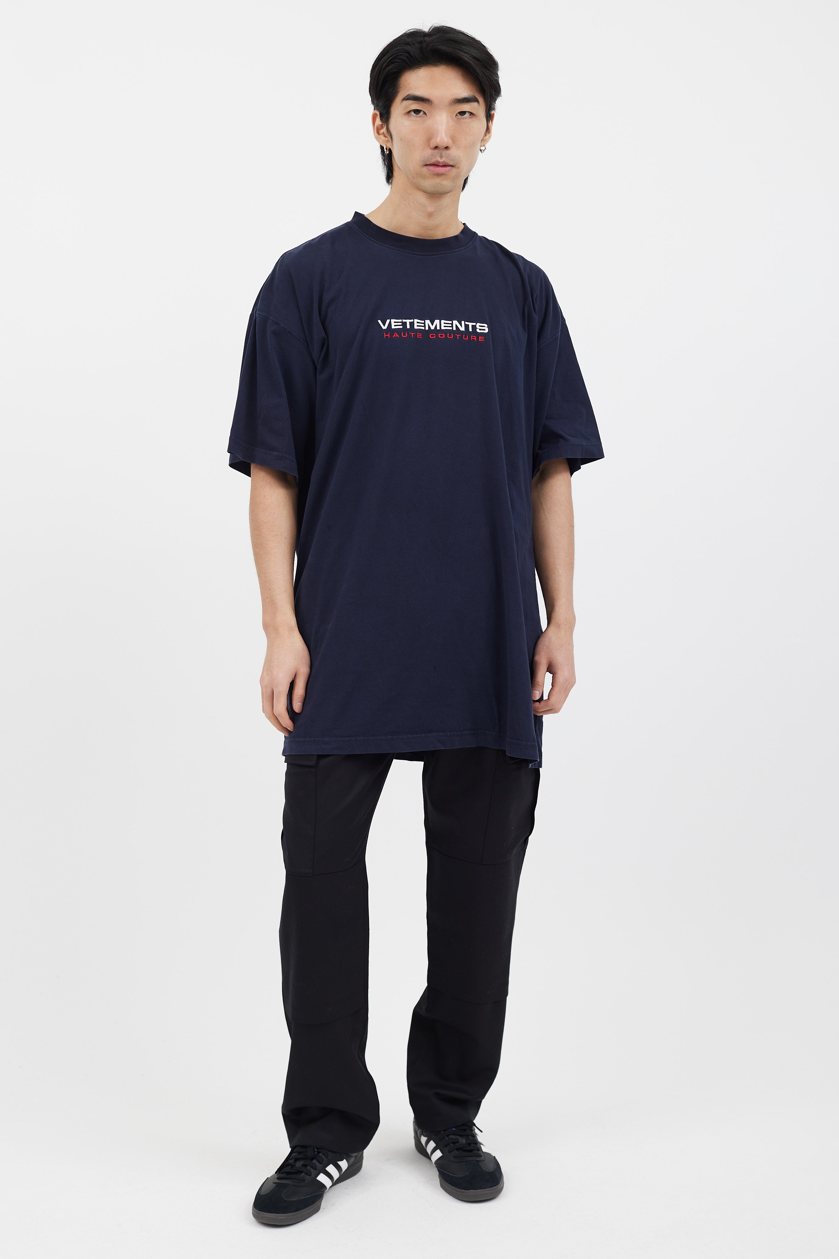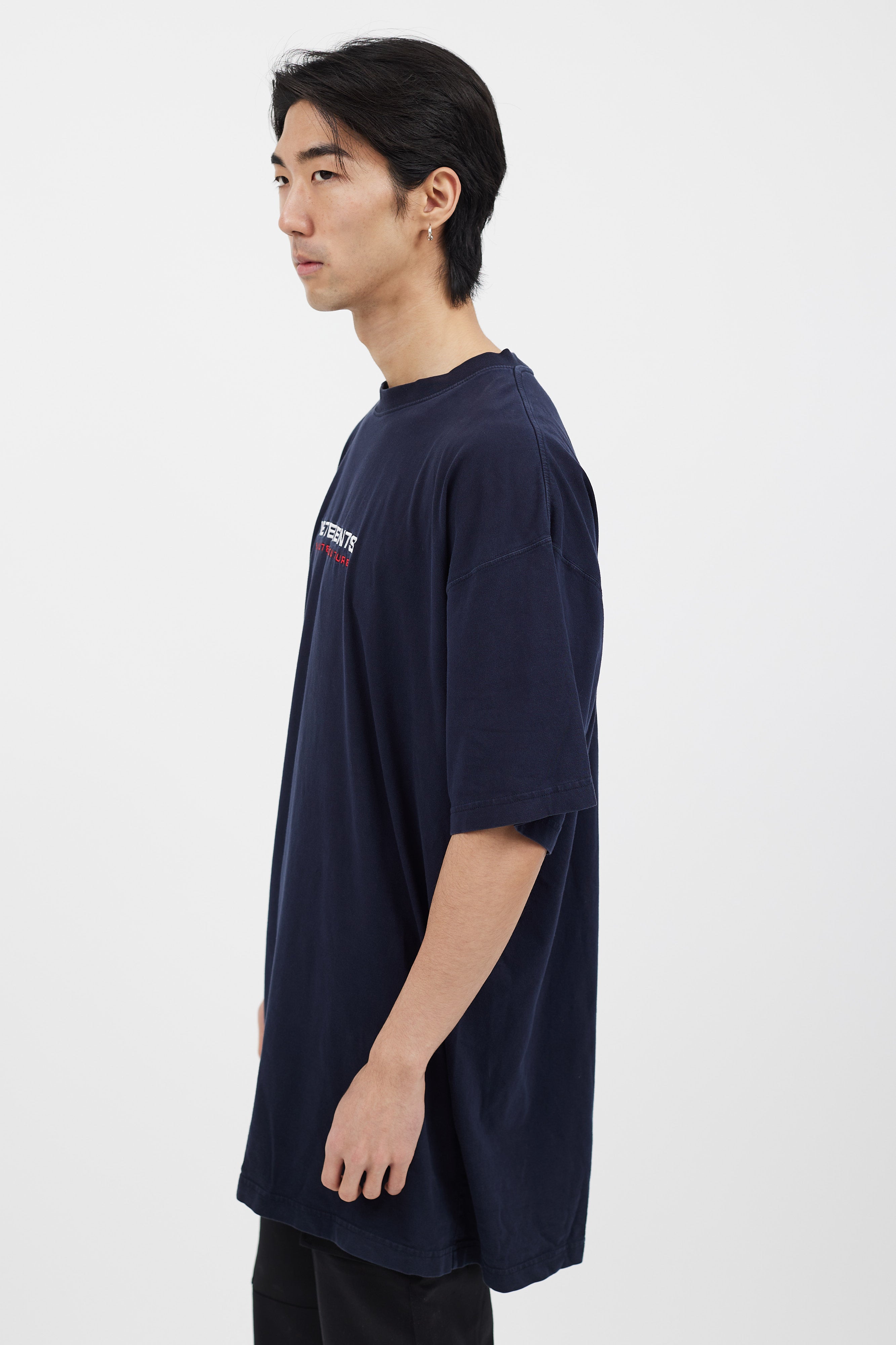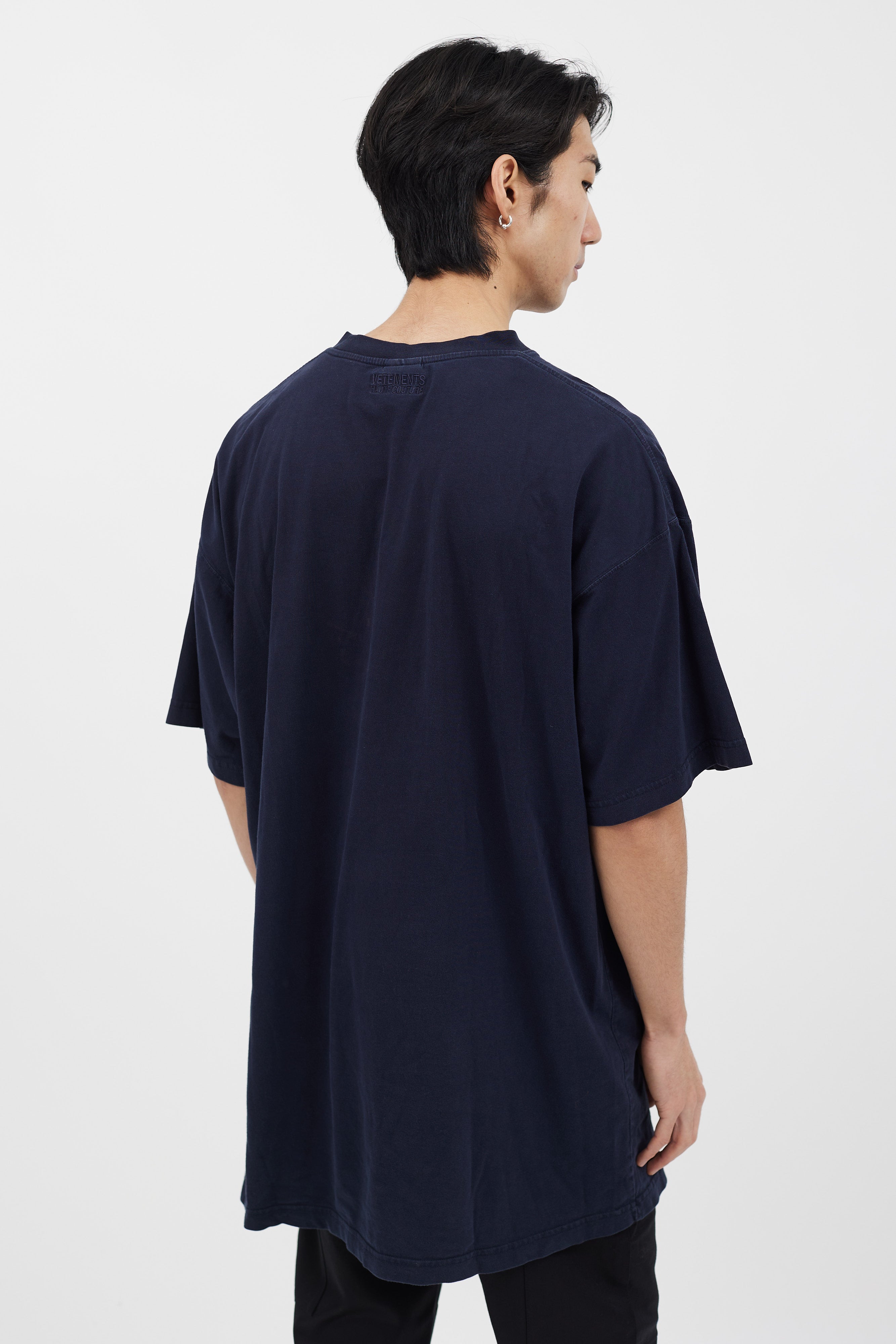 Pre-owned Vetements navy t-shirt featuring white and red embroidered logo at front, crew neckline, and short sleeves.