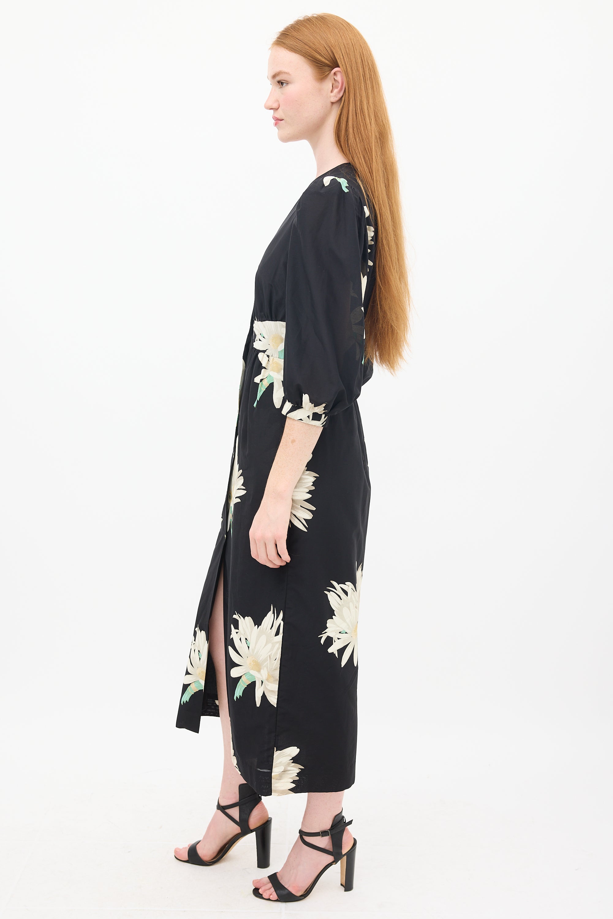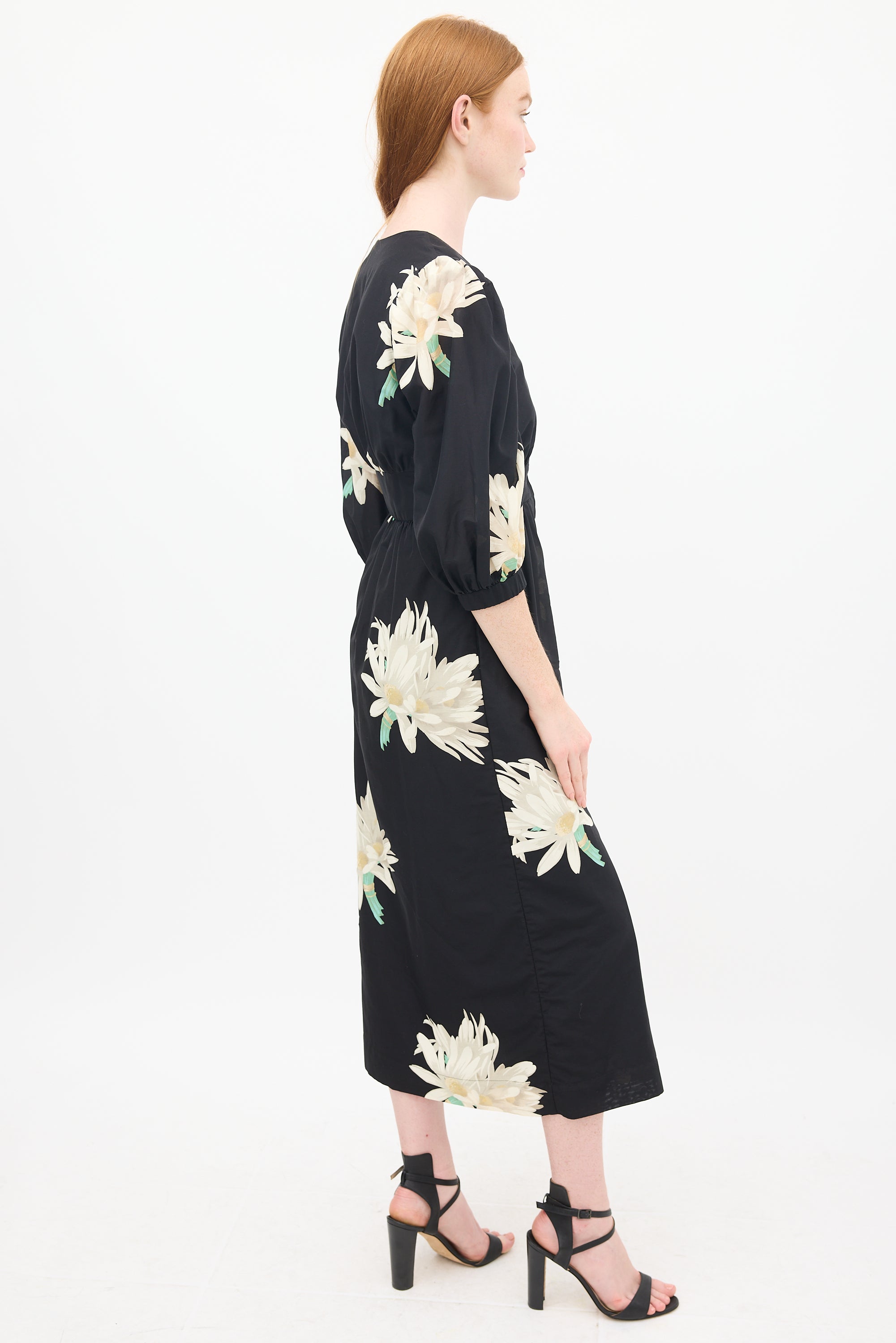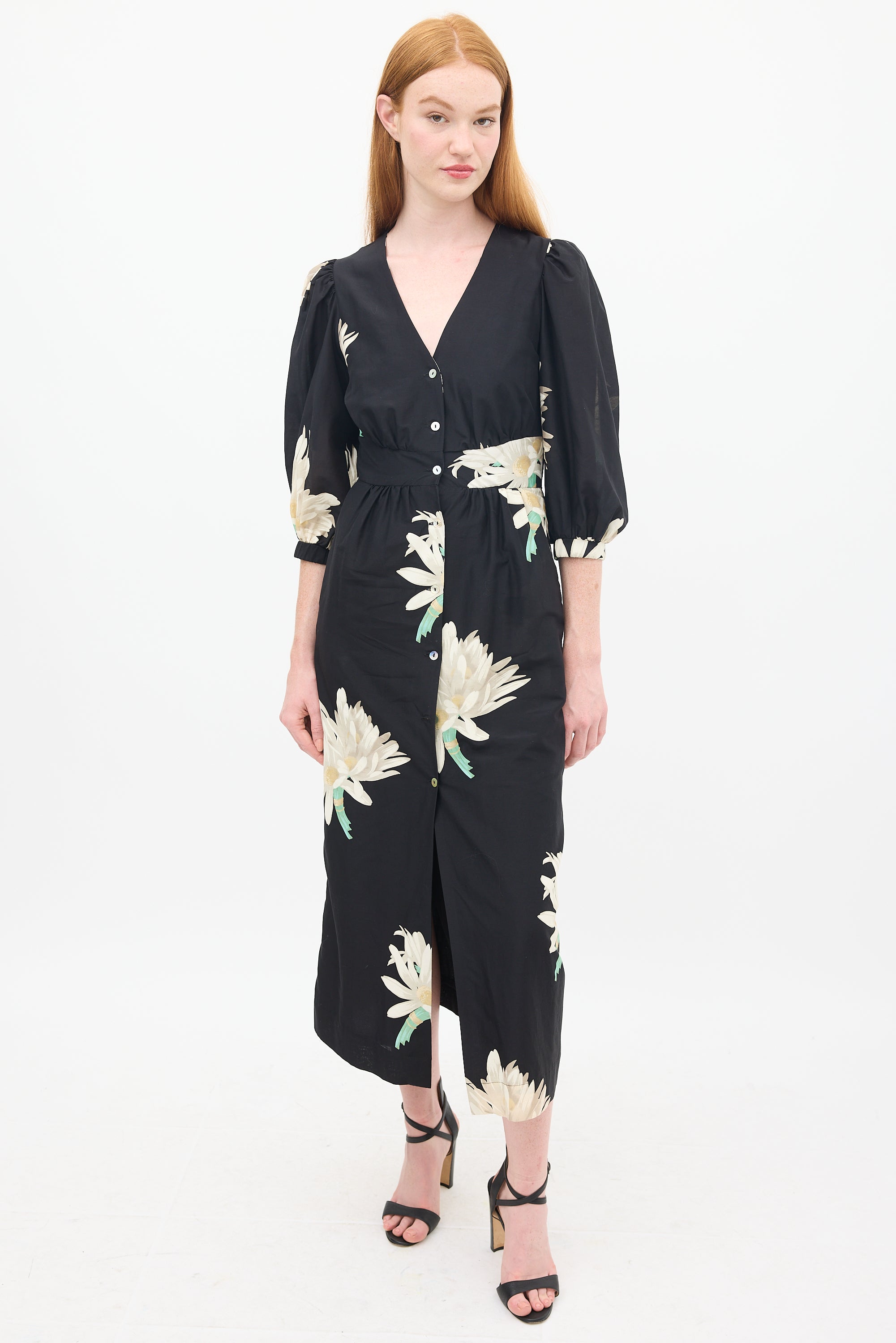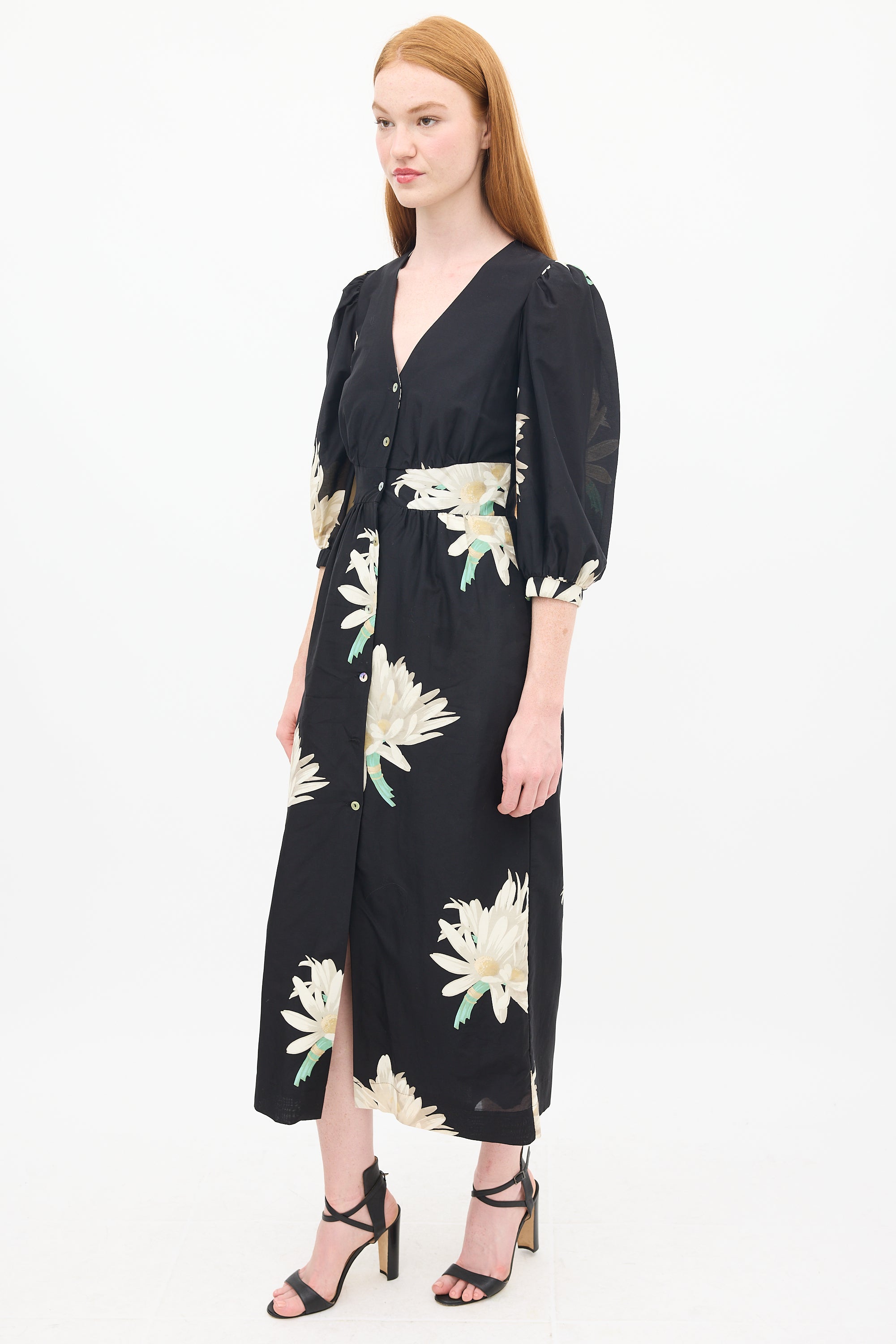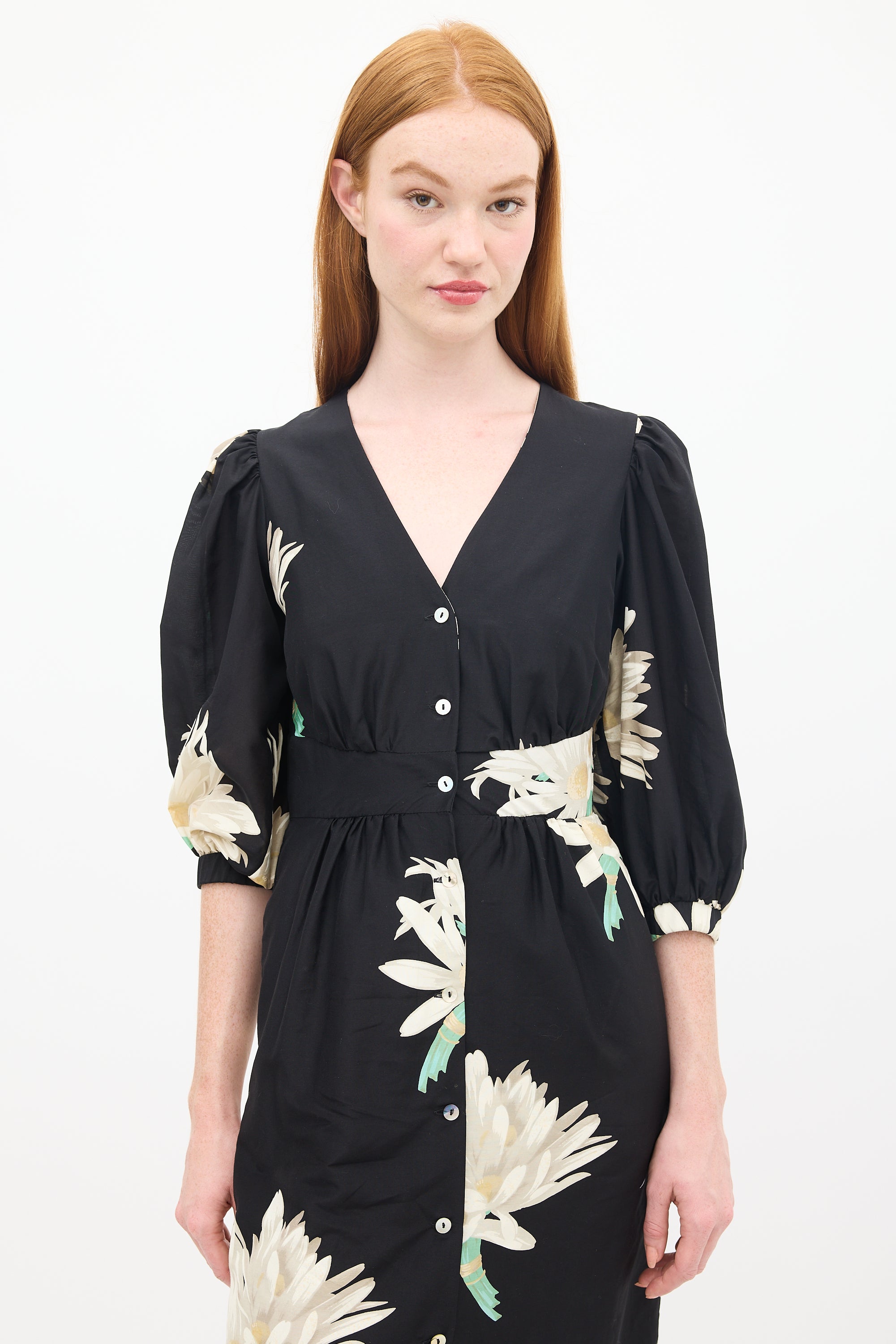 Pre-owned Horses Atelier black silk and cotton blend Paz midi dress featuring a V-neckline, button up front, gathering at waist, in seam pockets, half length puff sleeves with buttoned cuffs, and multicolour floral print throughout. Lined.
