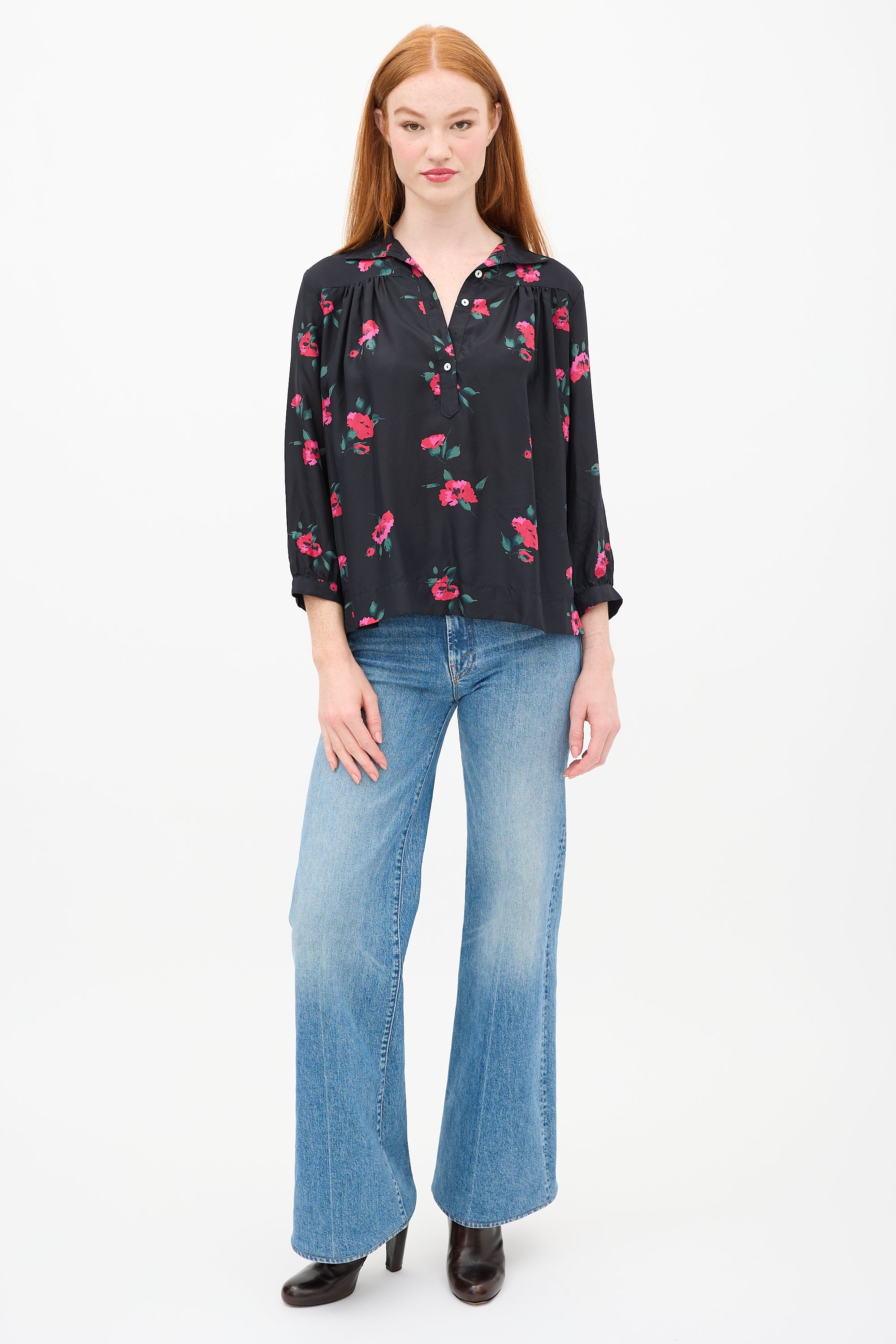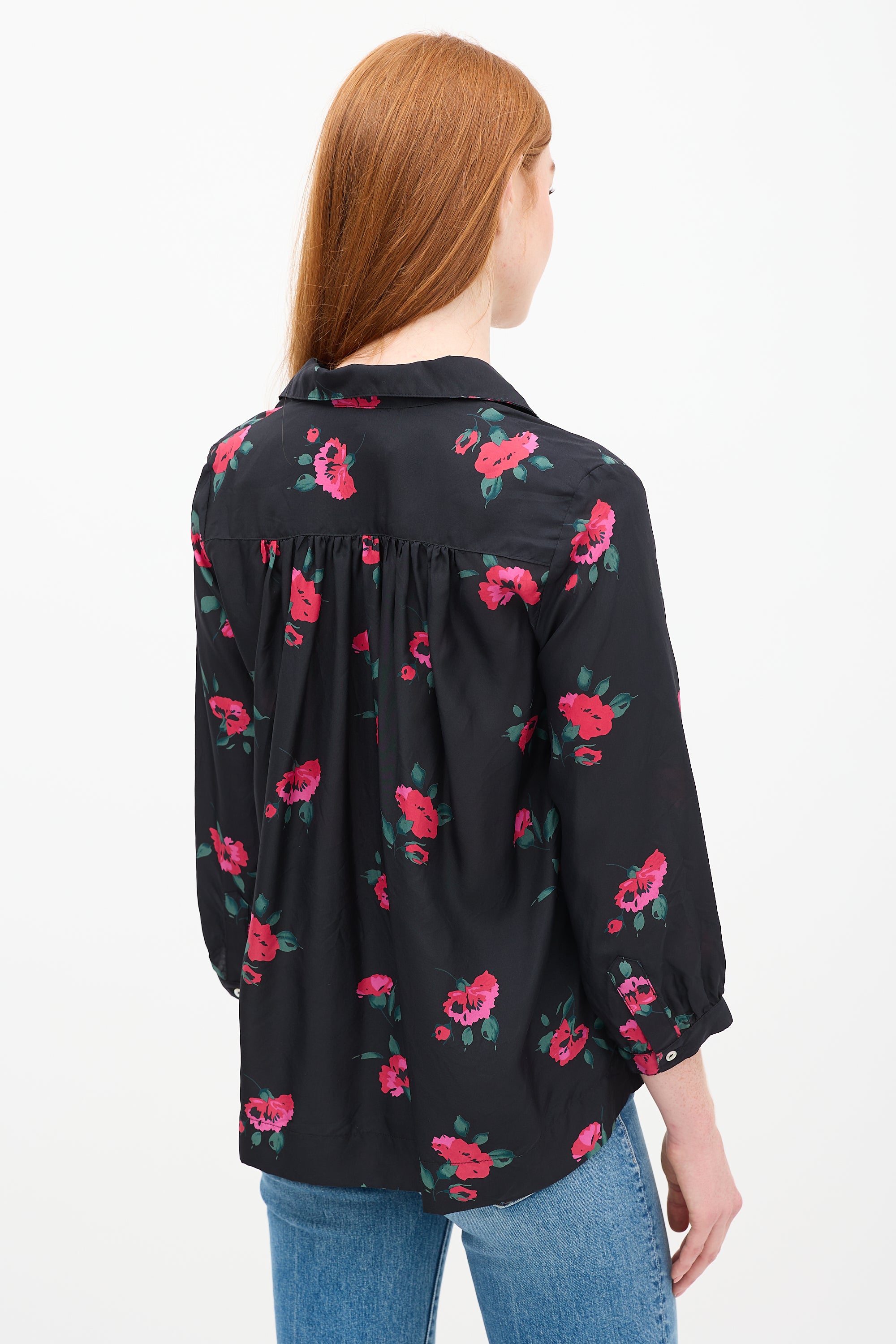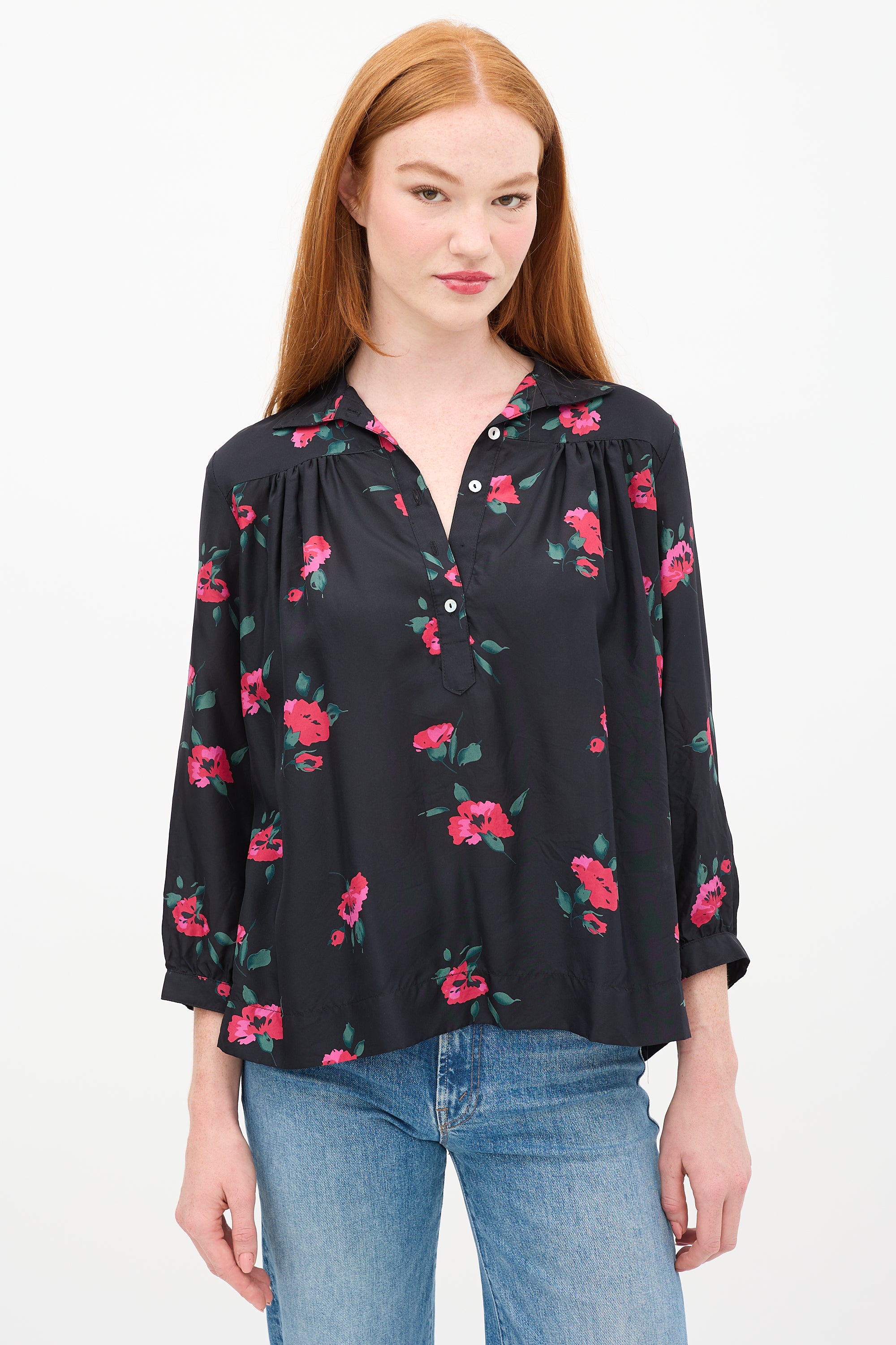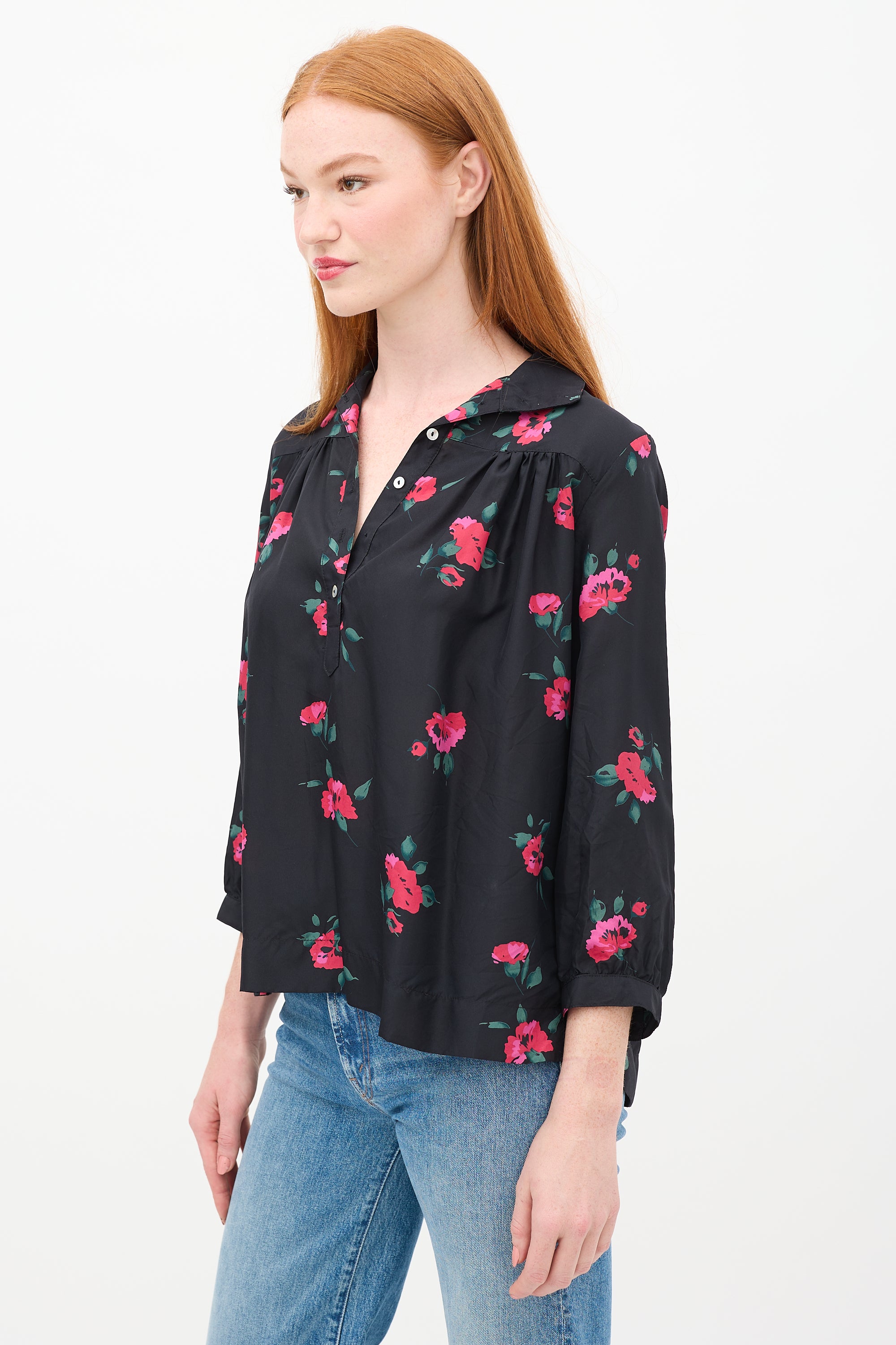 Pre-owned Horses Atelier black silk shirt featuring red floral print, mock neck collar, quarter button up front, and long sleeves with buttoned cuffs.