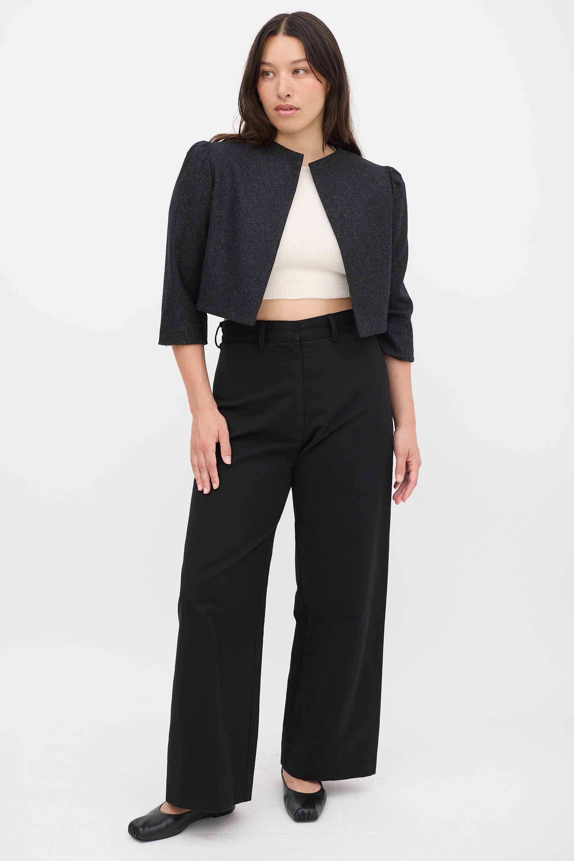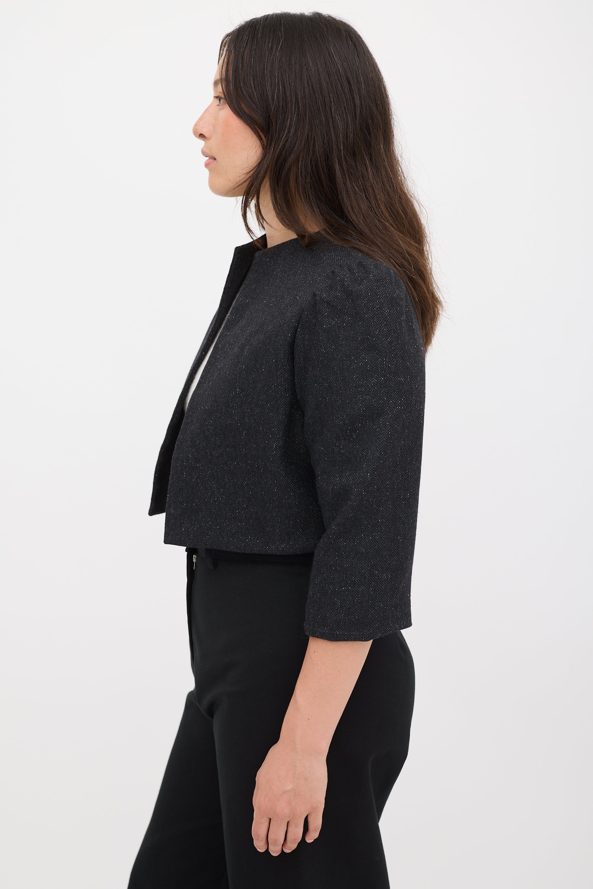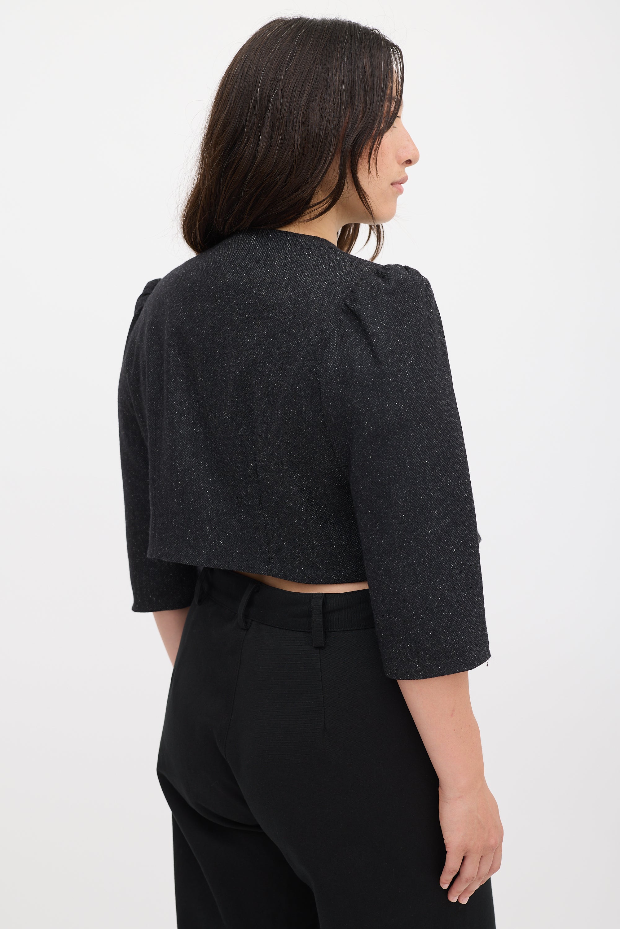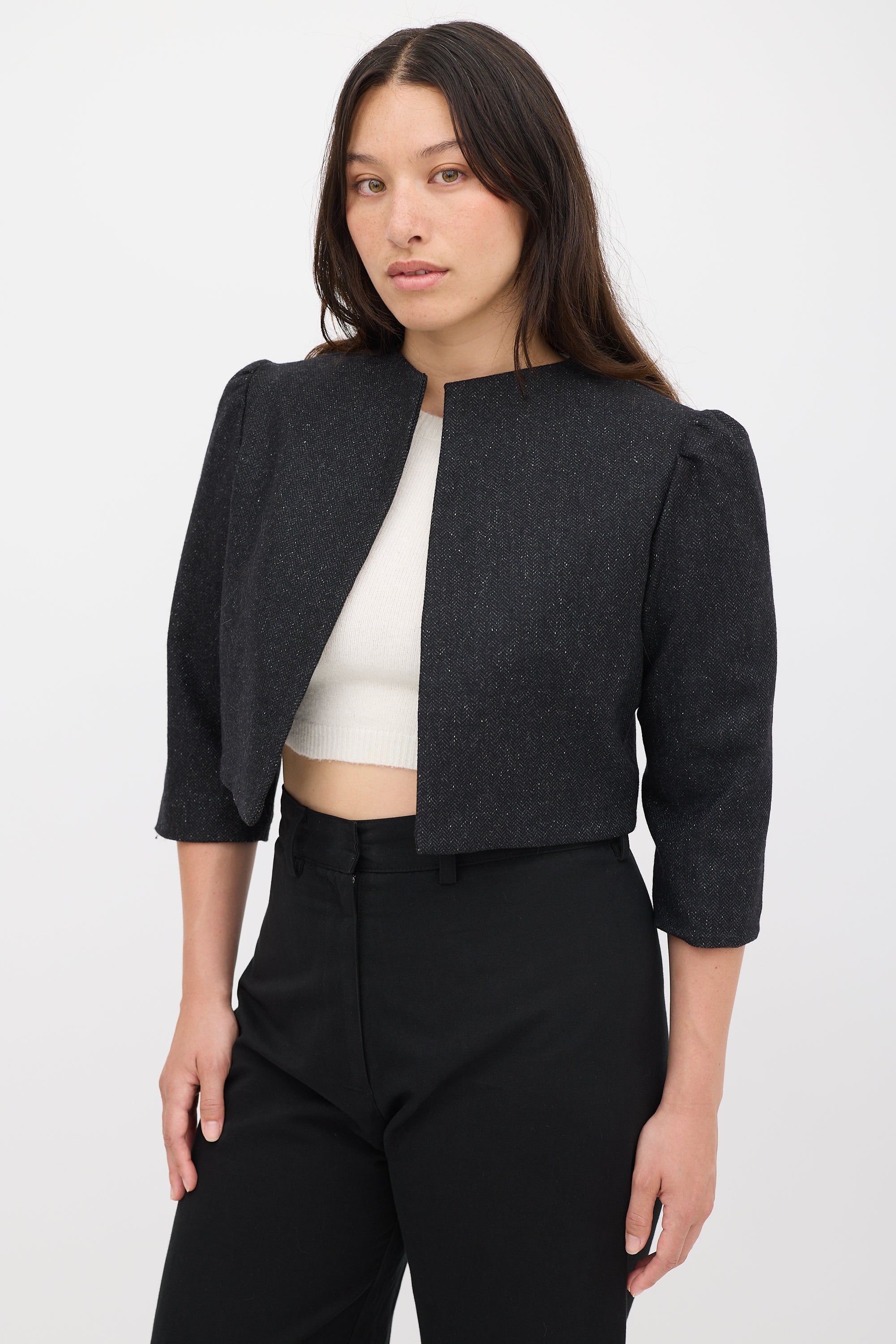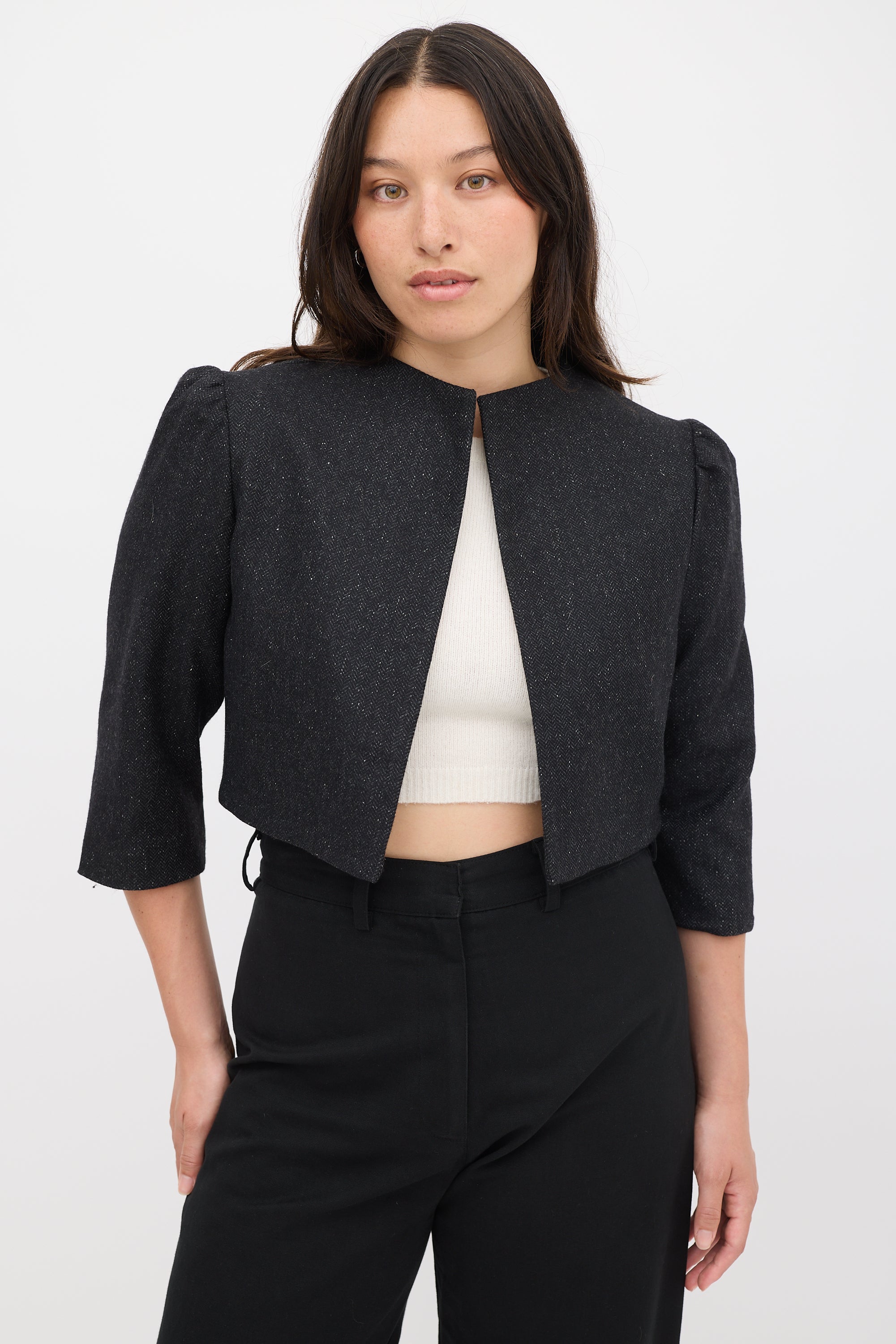 Pre-owned Horses Atelier black herringbone wool blend Romy jacket featuring a round neck, open front, and puffed three quarter length sleeves. Lined.