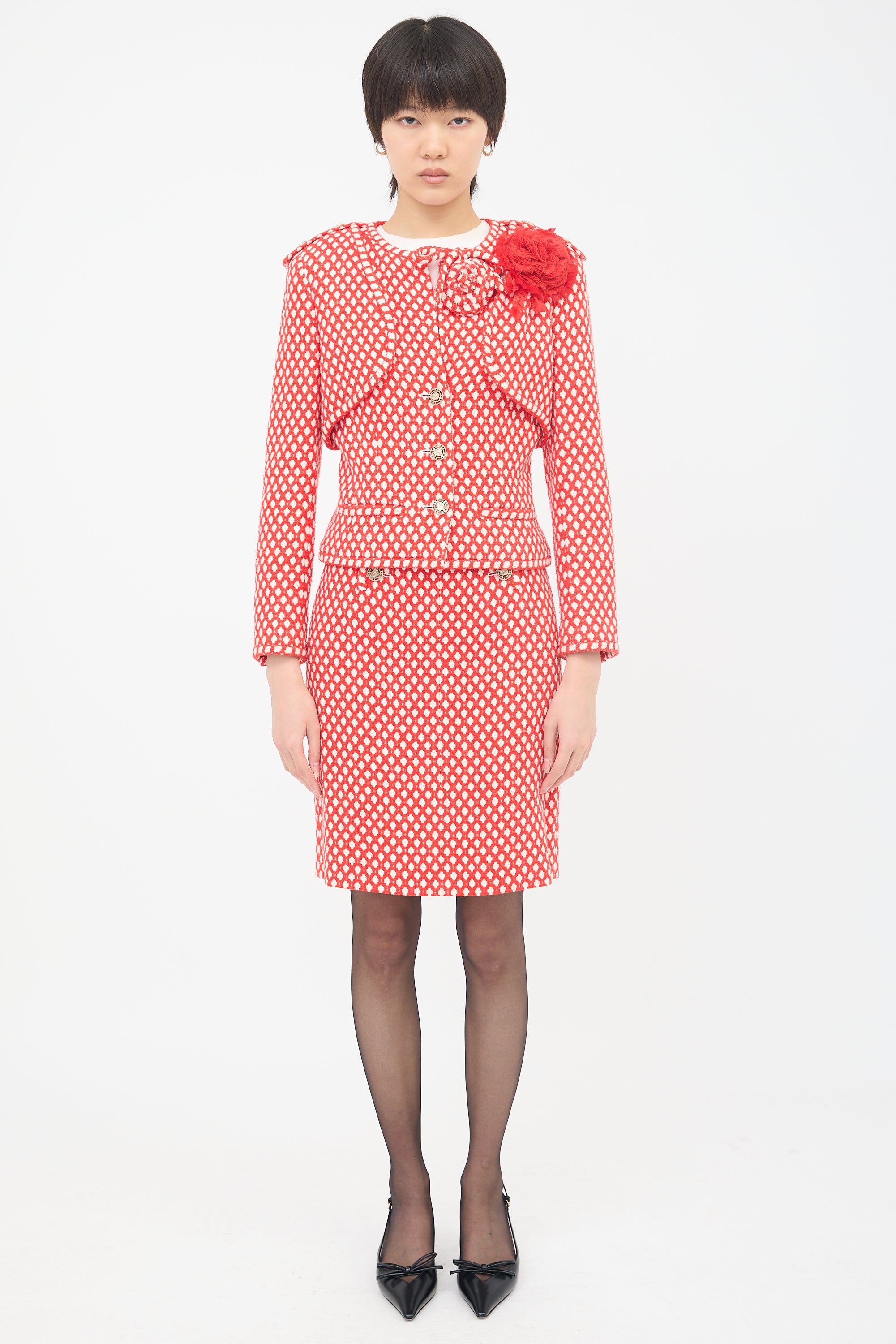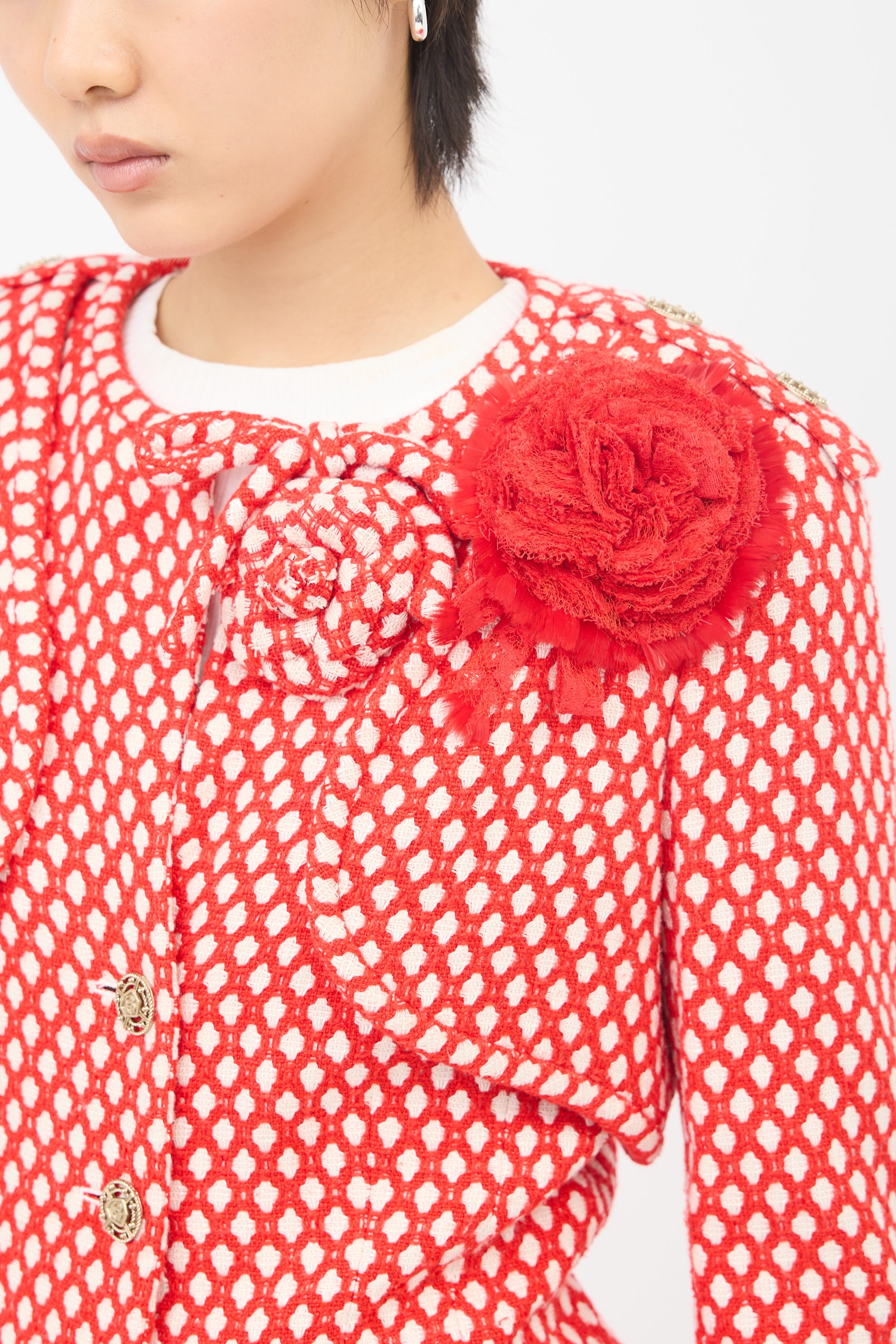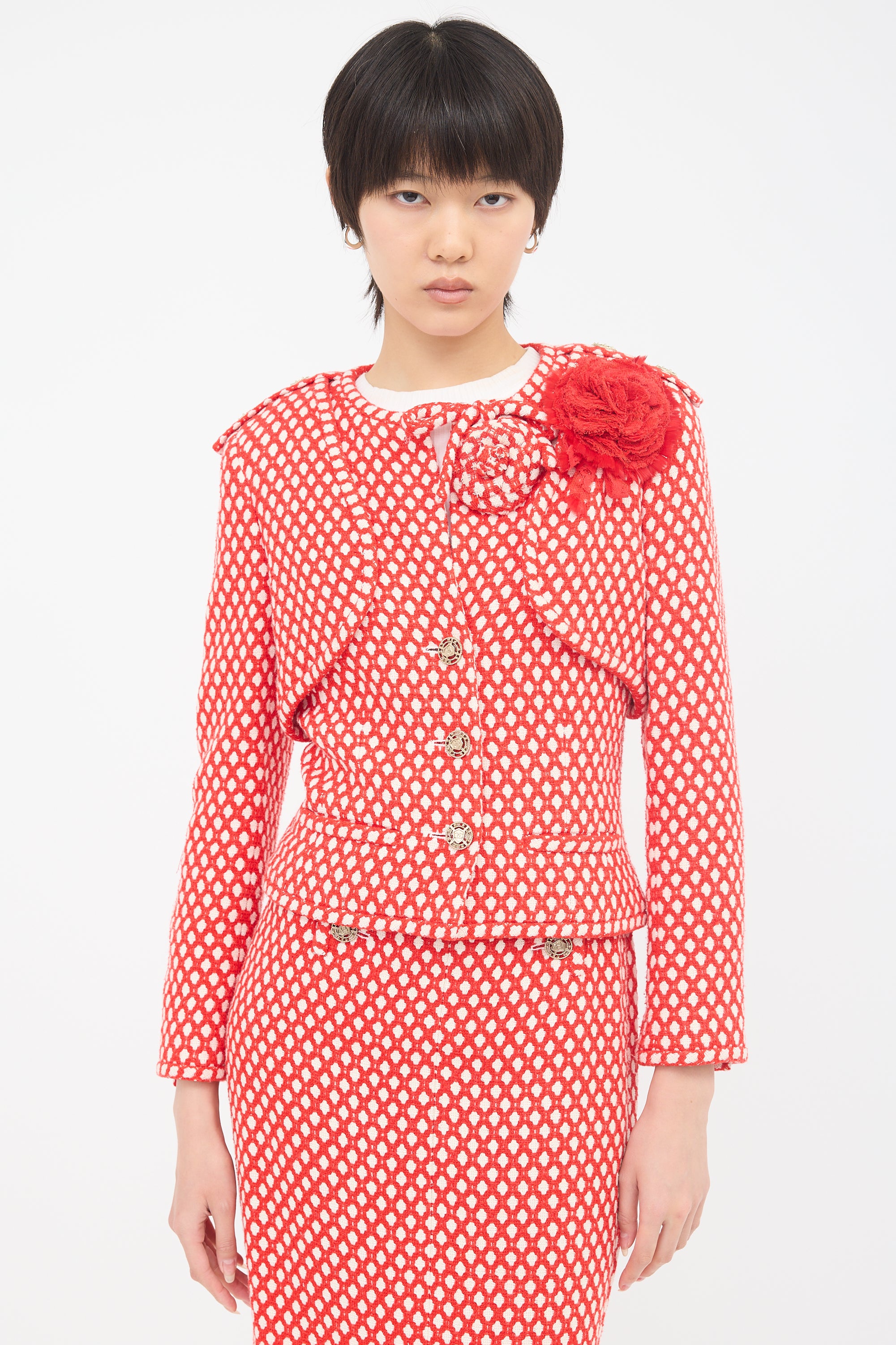 Pre-owned Chanel Spring 2008 tweed jacket featuring a red and white geometric pattern, round neckline with detachable bow detail, epaulettes, two detachable flower pins, shoulder panel details, CC logo button front, and decorative welt pockets. Lined.