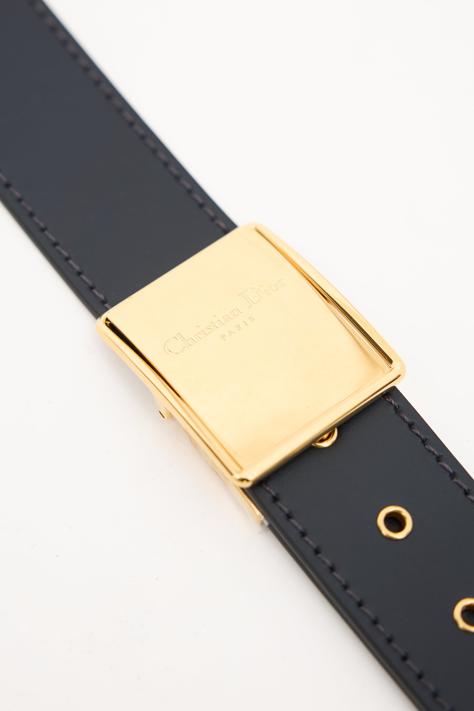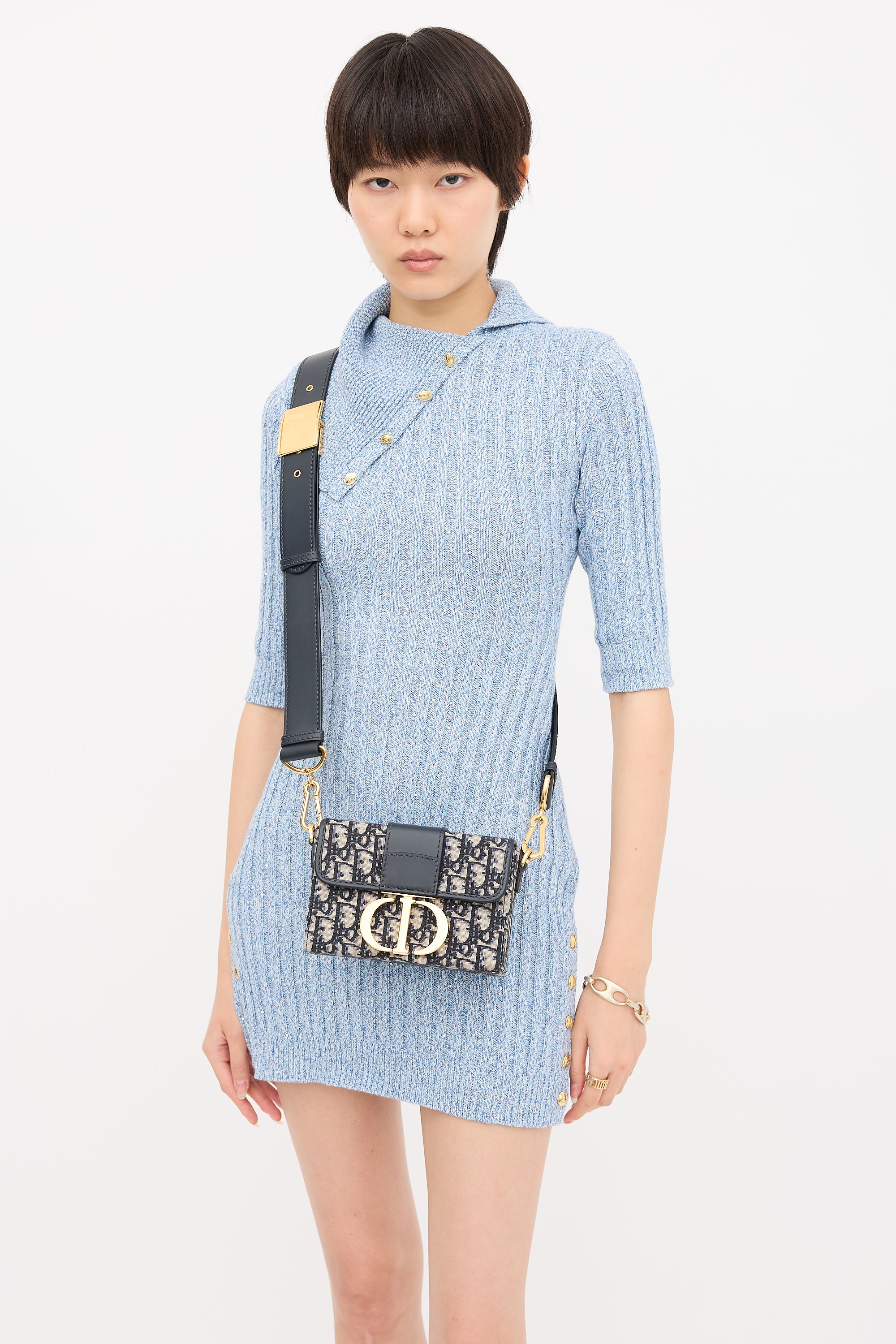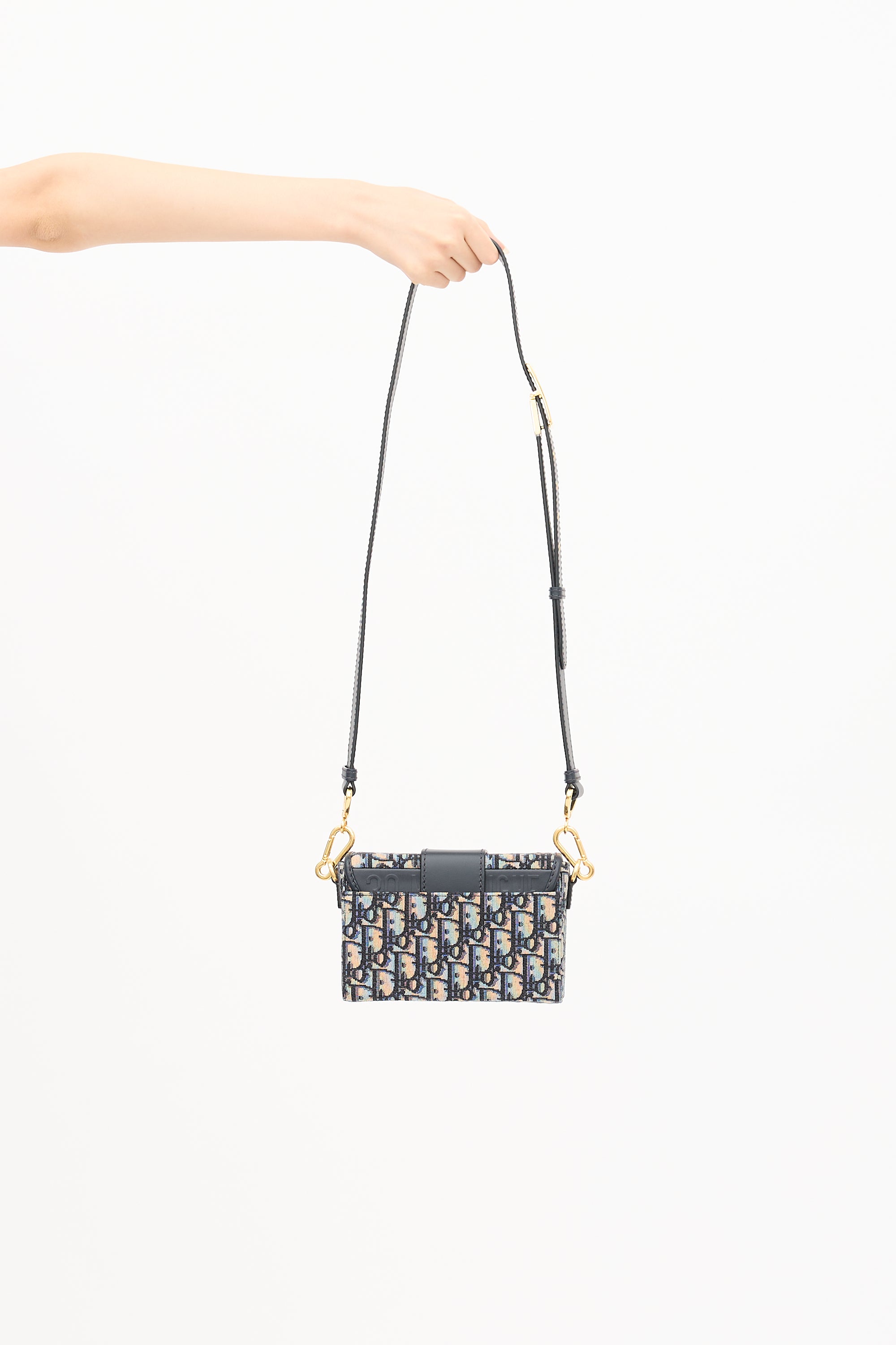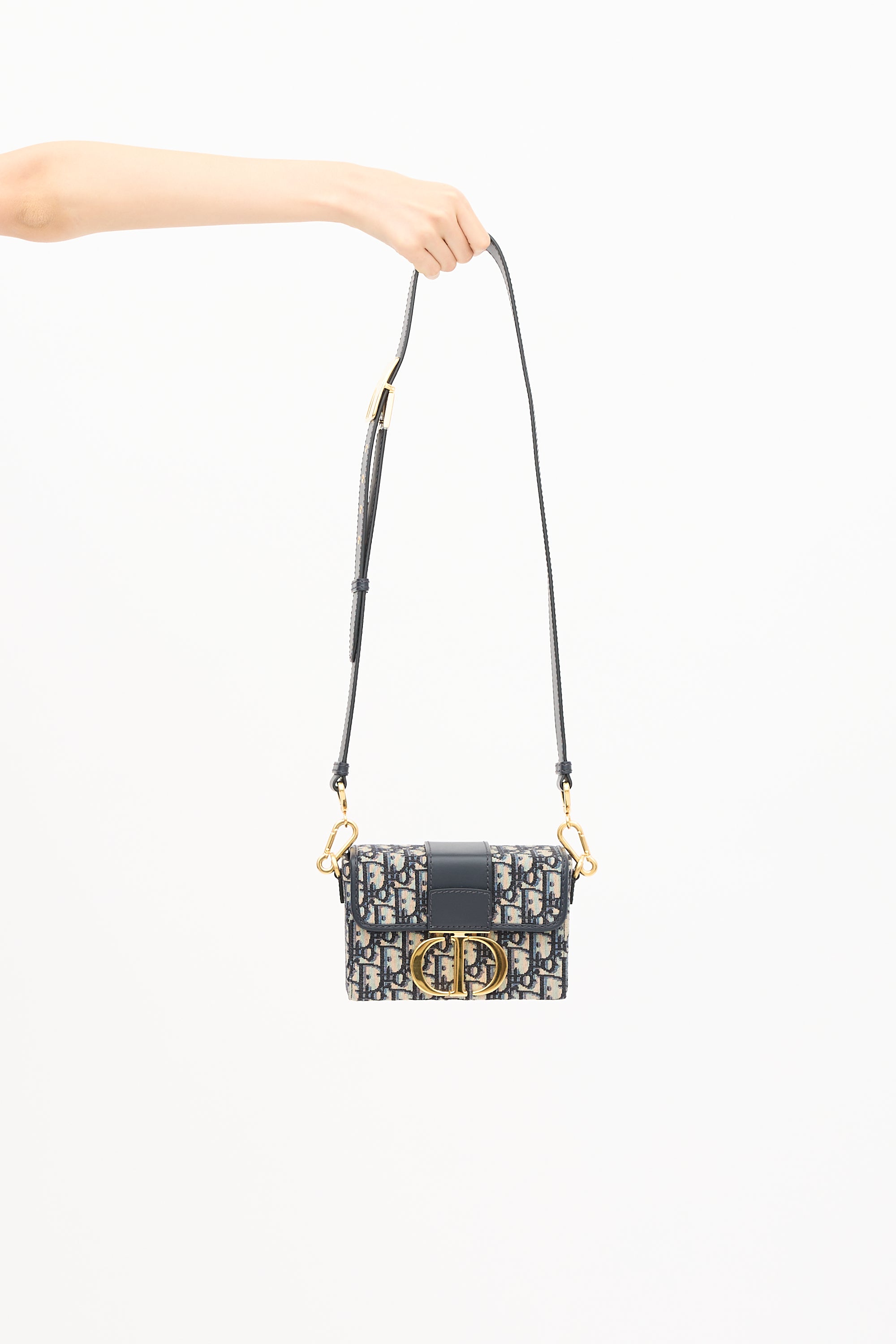 Pre-owned Christian Dior 2021 30 Montaigne crossbody bag featuring a signature navy and beige Oblique jacquard, tonal leather trim, gold tone hardware, detachable and adjustable shoulder strap with debossed logo buckle, back slip pocket, front flap with CD push lock closure, and one lined main compartment with one slip pocket. Comes with original dust bag.