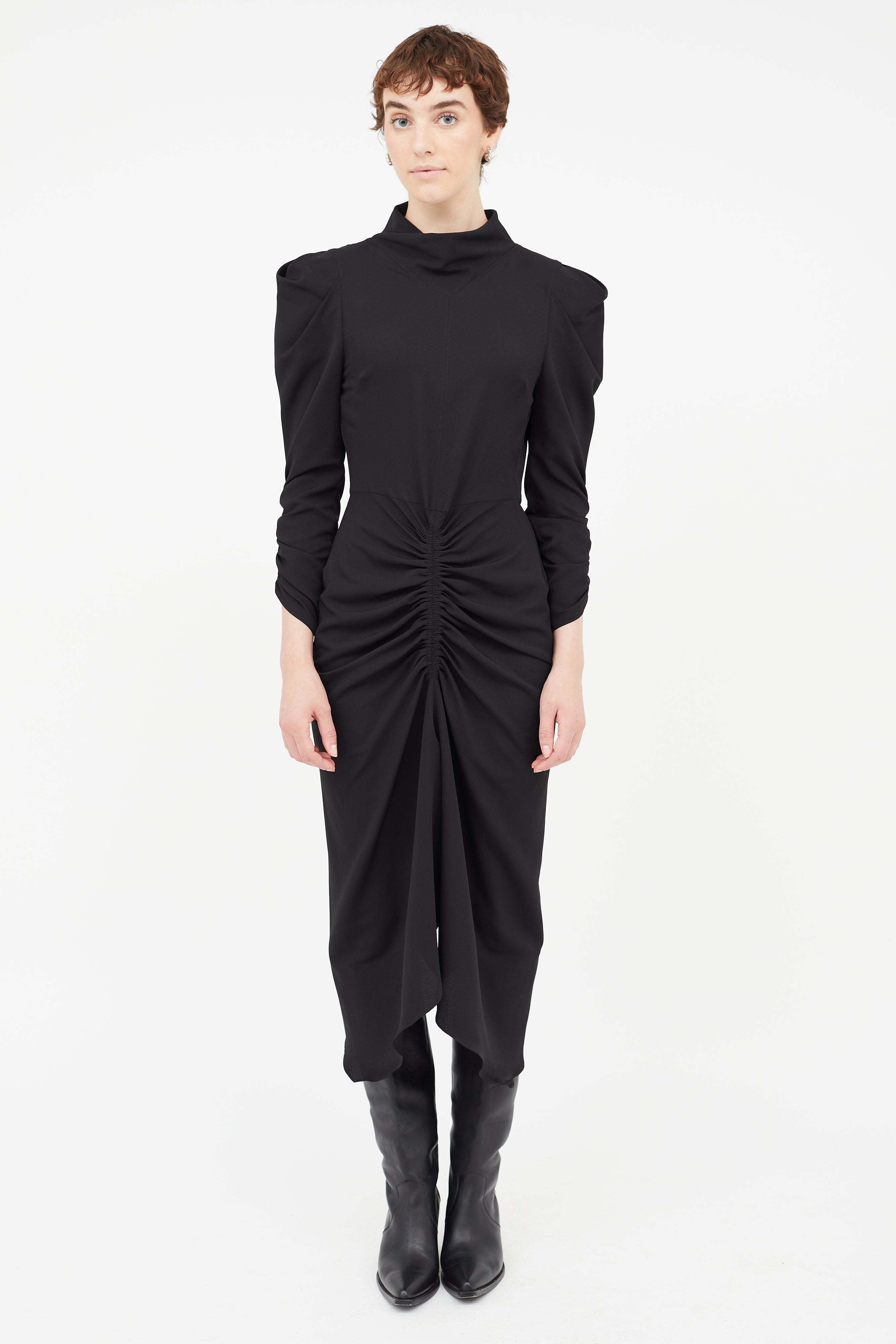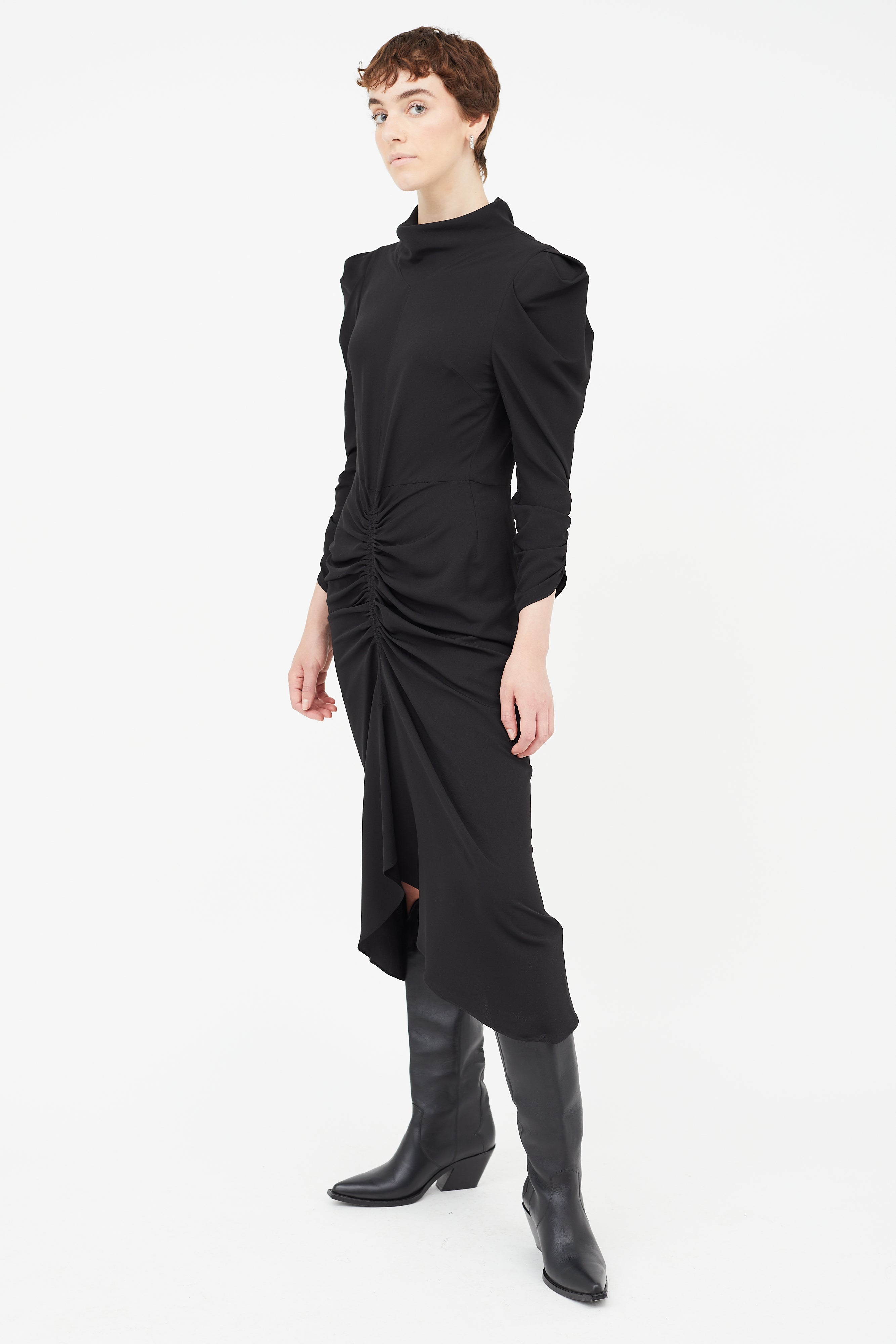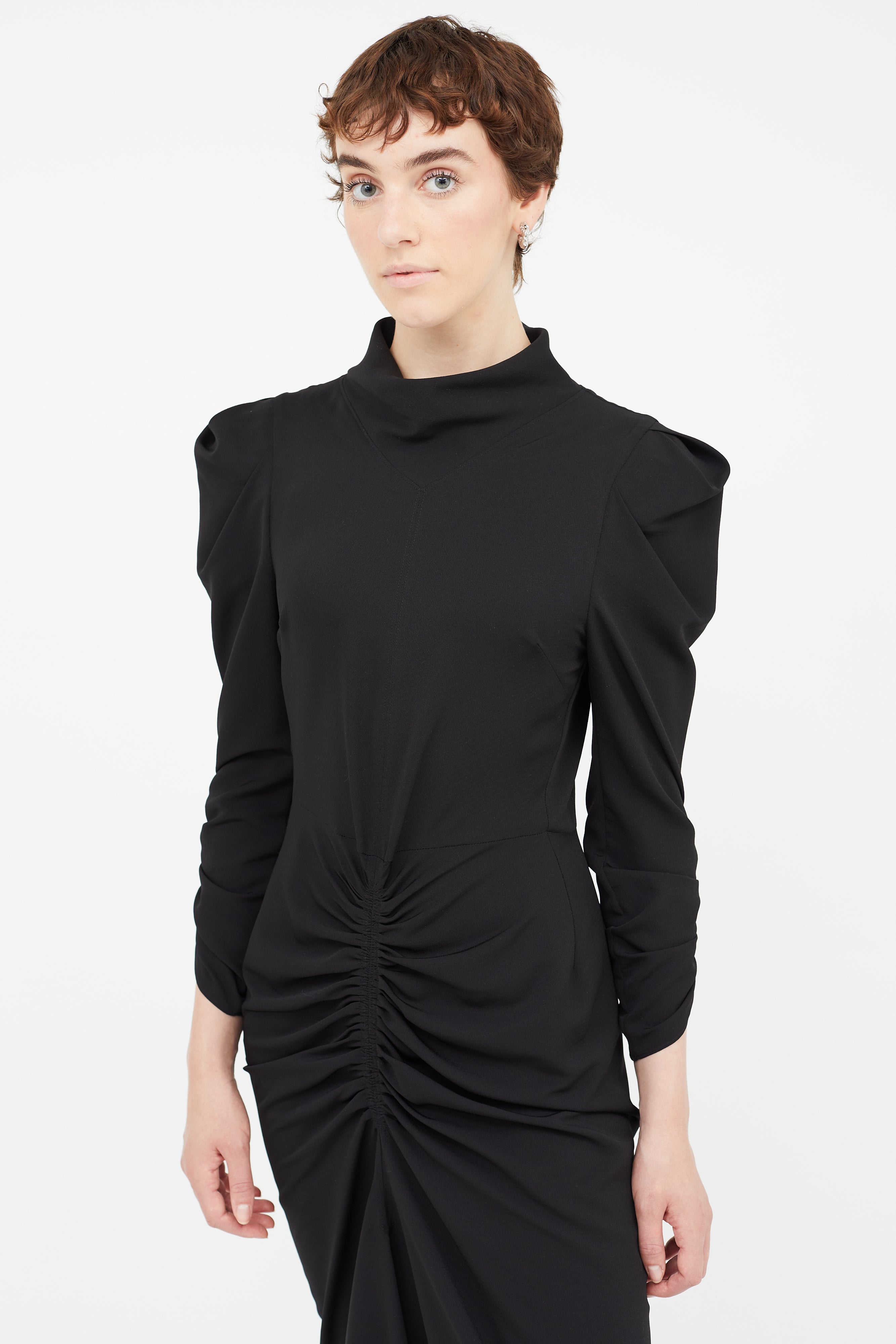Pre-owned Isabel Marant black dress featuring mock collar, ruched at waist centre, concealed zip closure at back, flounced hem, and ruched sleeves.