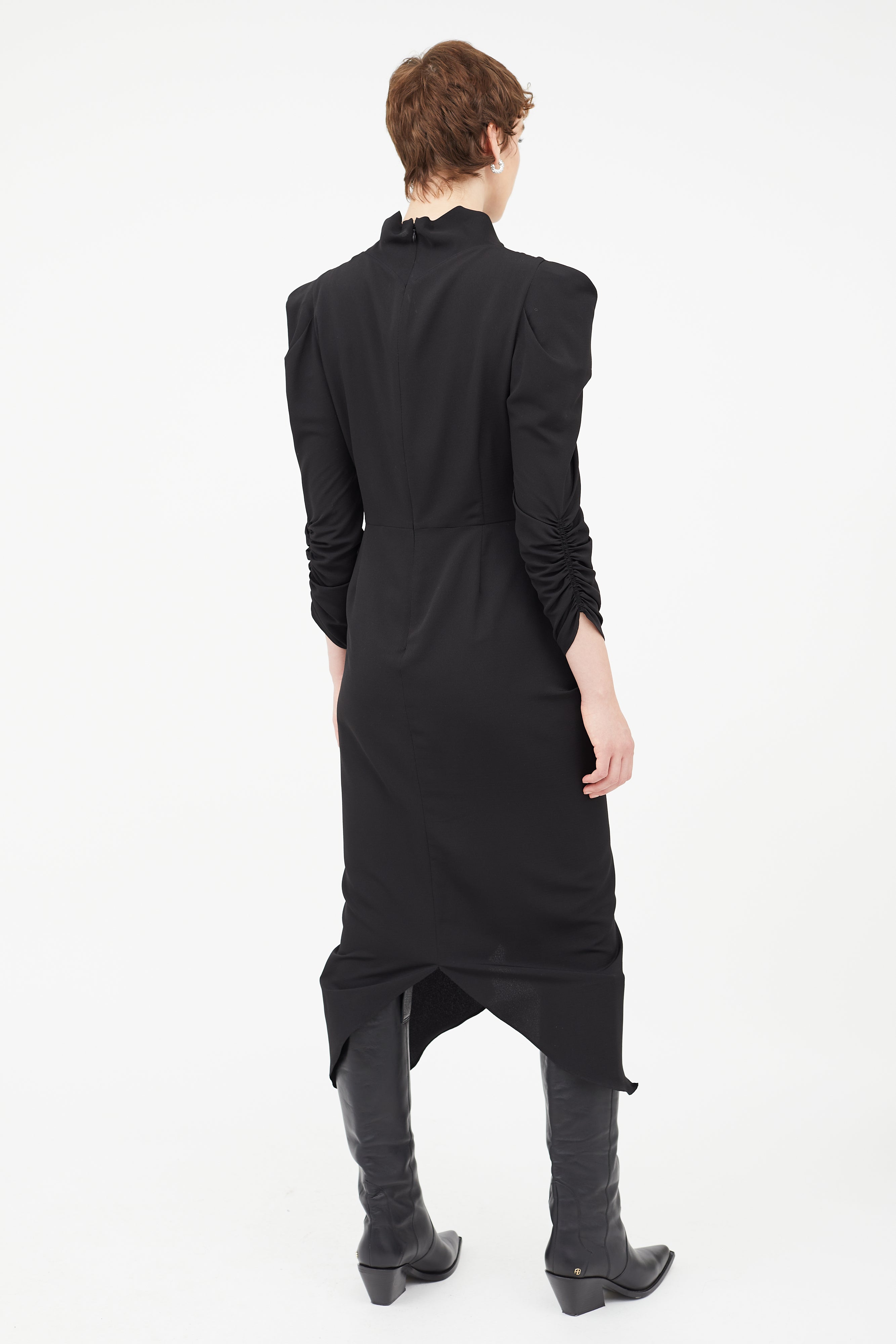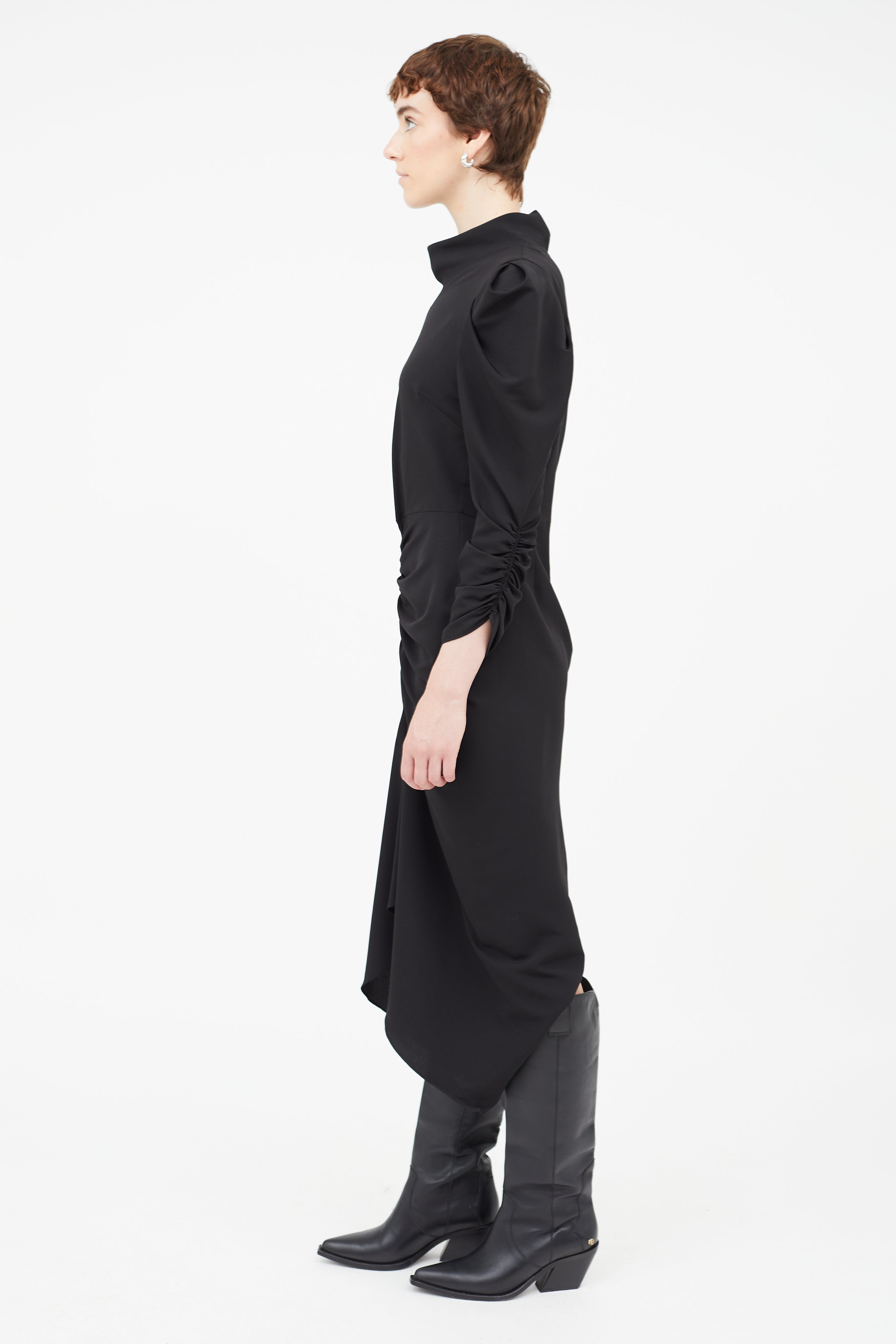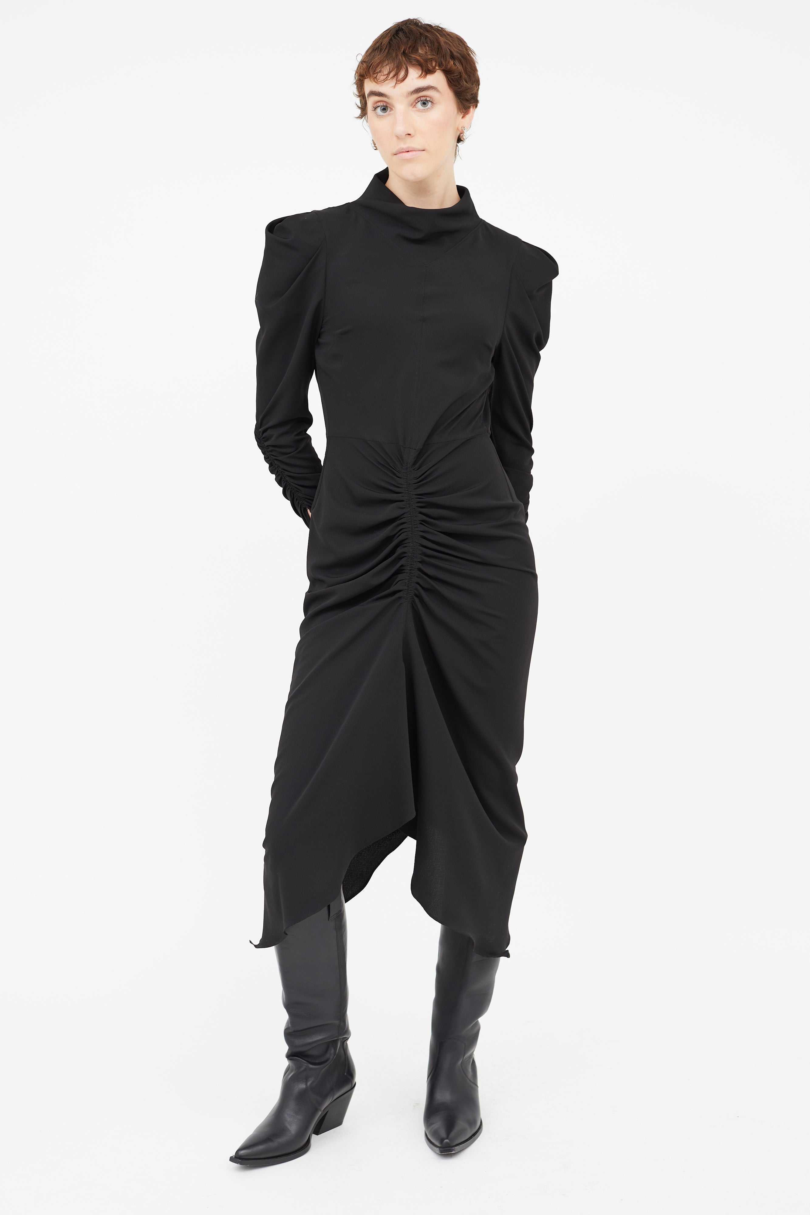 Pre-owned Isabel Marant black dress featuring mock collar, ruched at waist centre, concealed zip closure at back, flounced hem, and ruched sleeves.