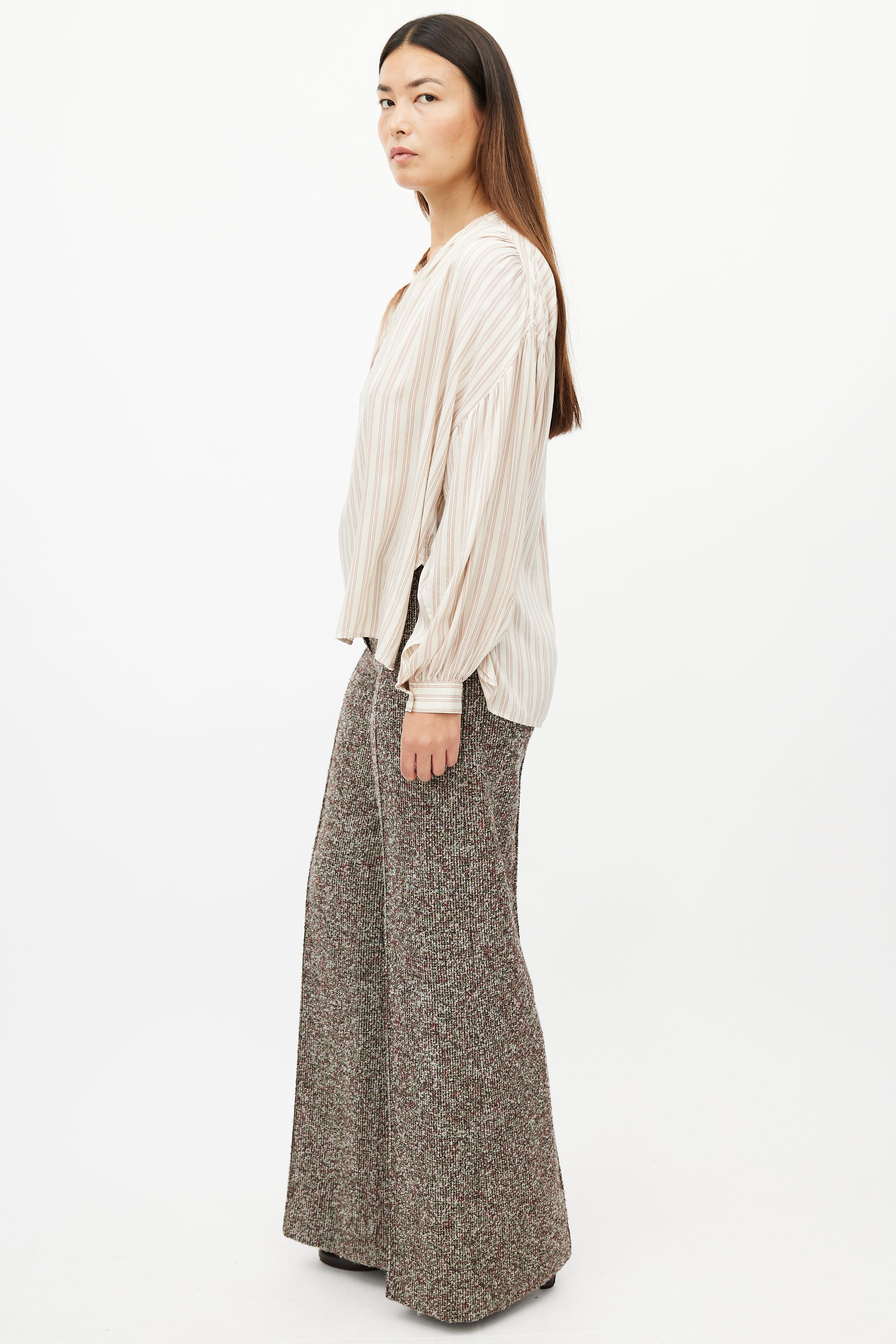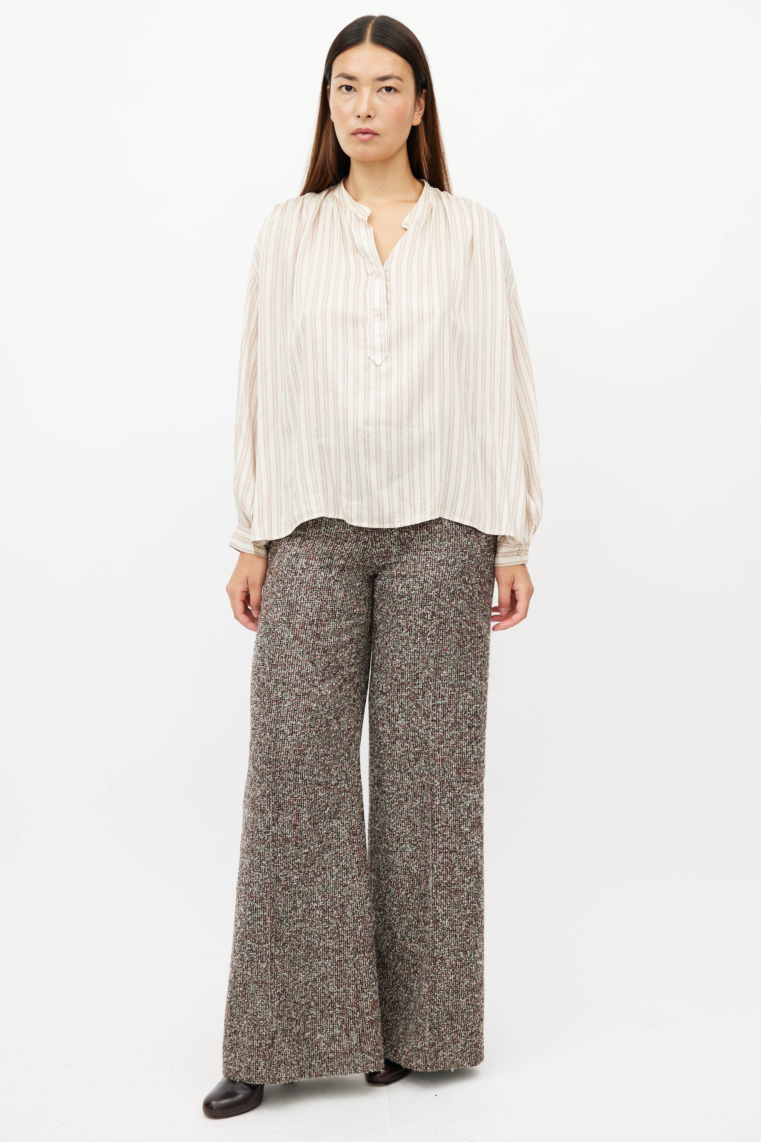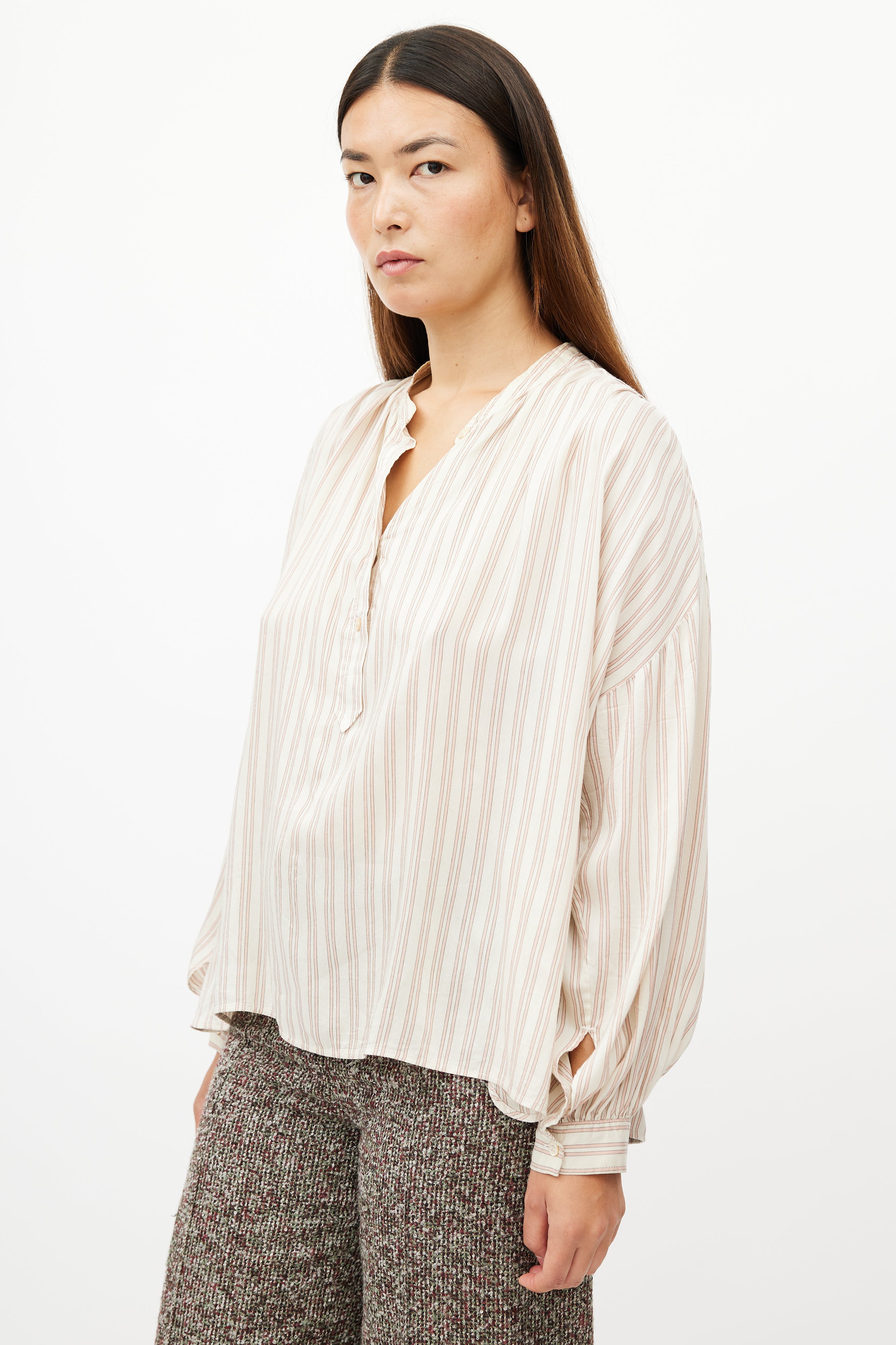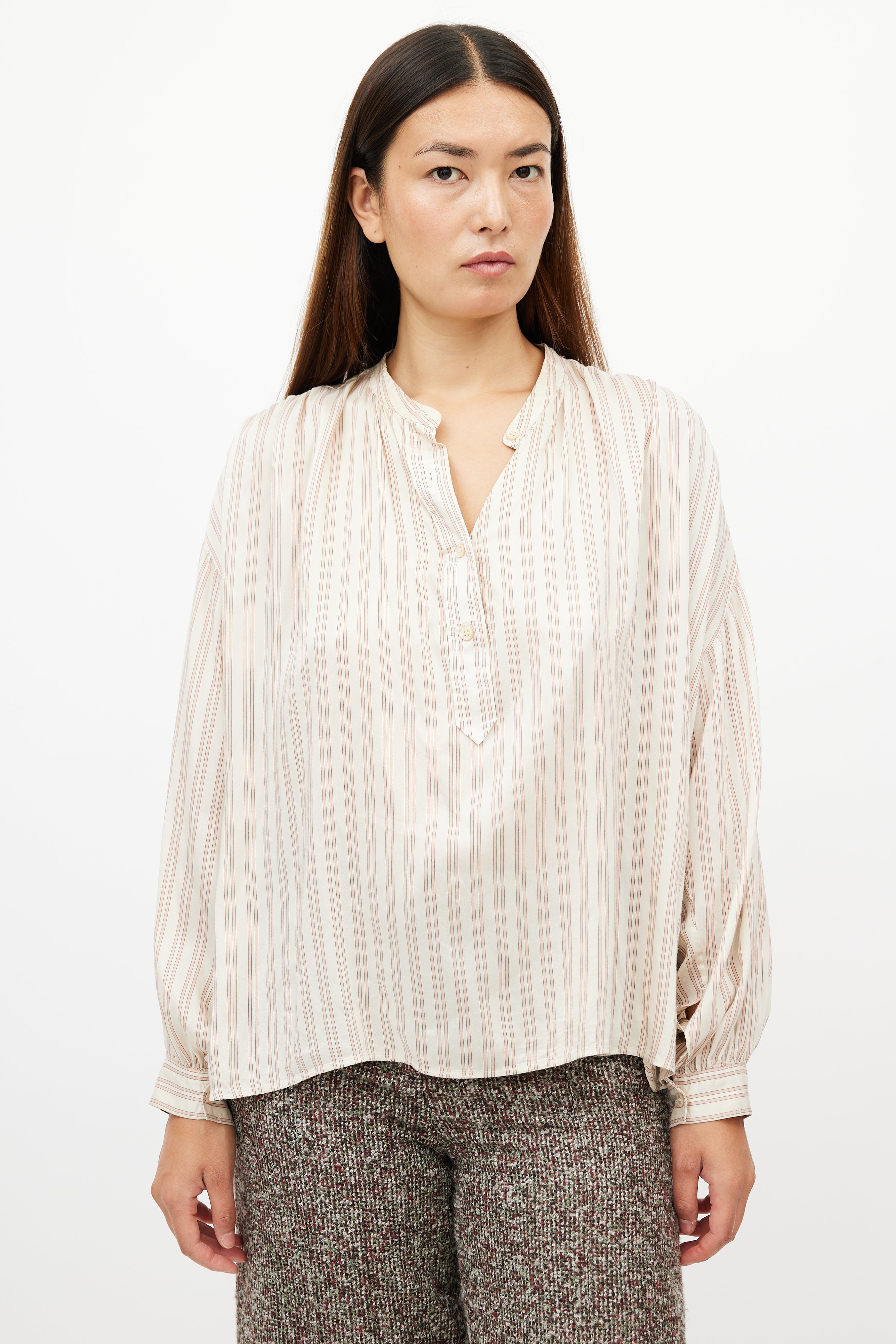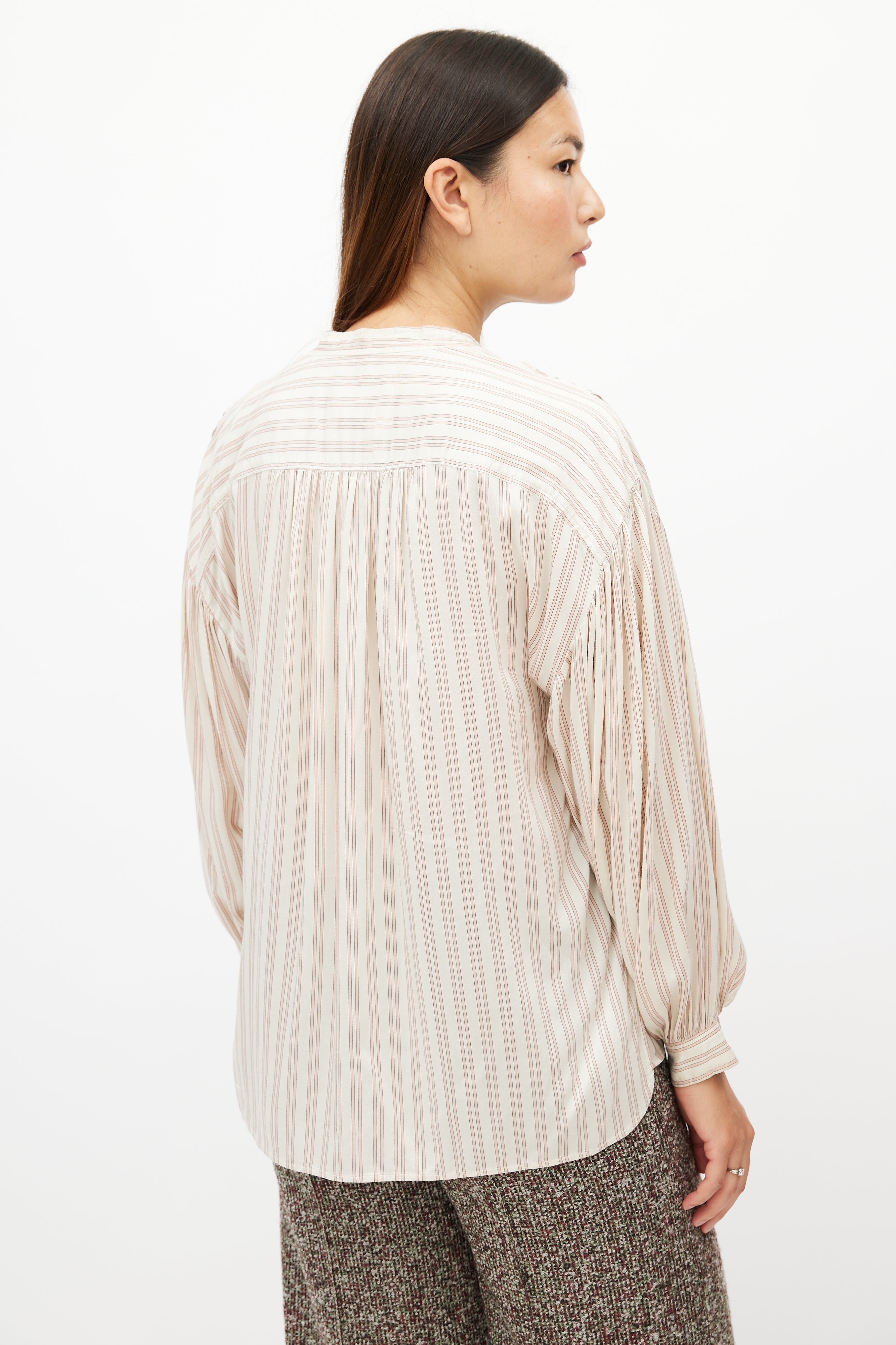 Pre-owned Isabel Marant cream shirt featuring a pink striped print throughout, band collar, long sleeves with buttoned cuffs, drop shoulders, and button up front.