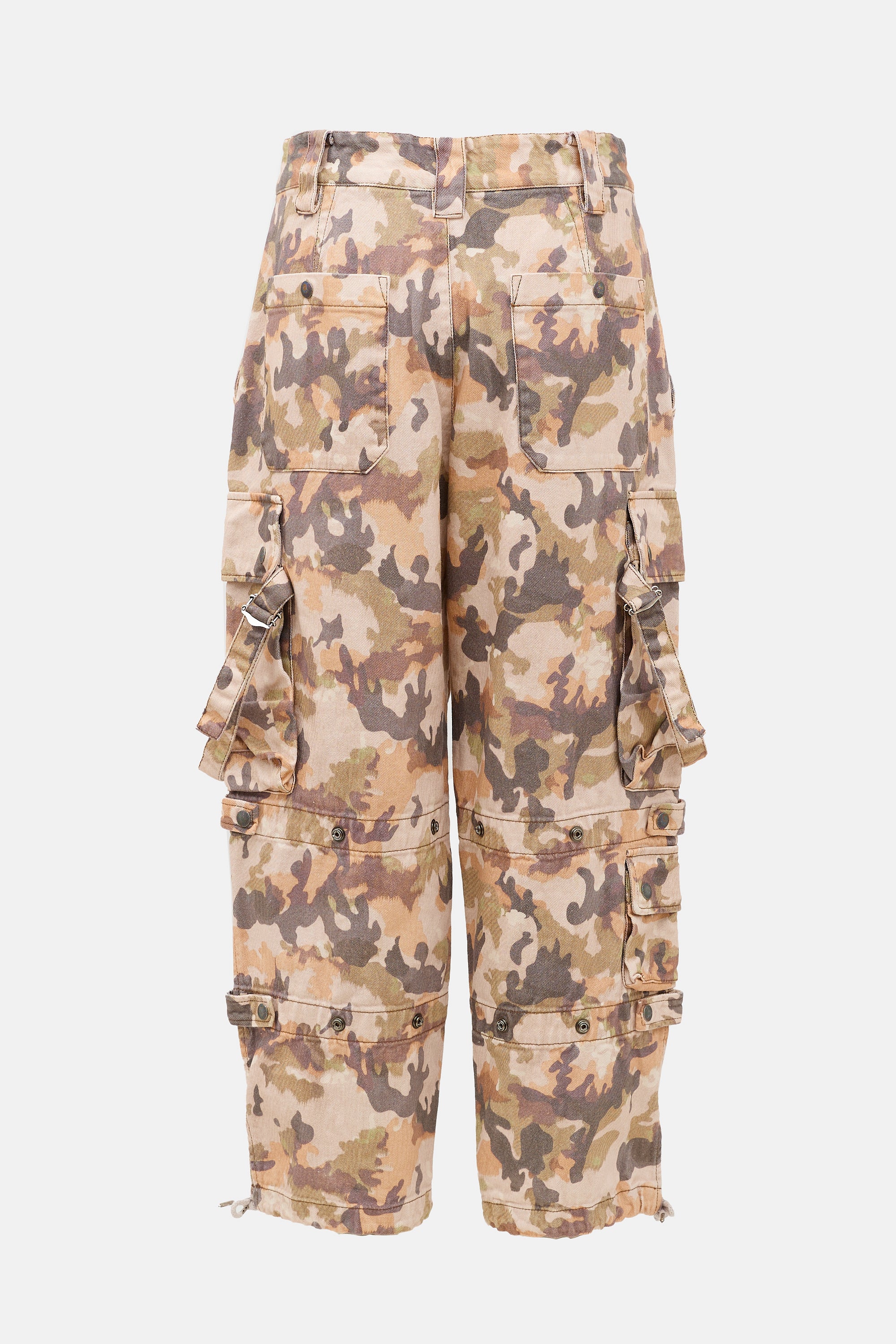 Pre-owned Isabel Marant multicolour Elore cargo pants featuring a camo print, mid rise, four pocket styling, cargo pockets with adjustable strap details, adjustable wide leg, and drawstring hems.