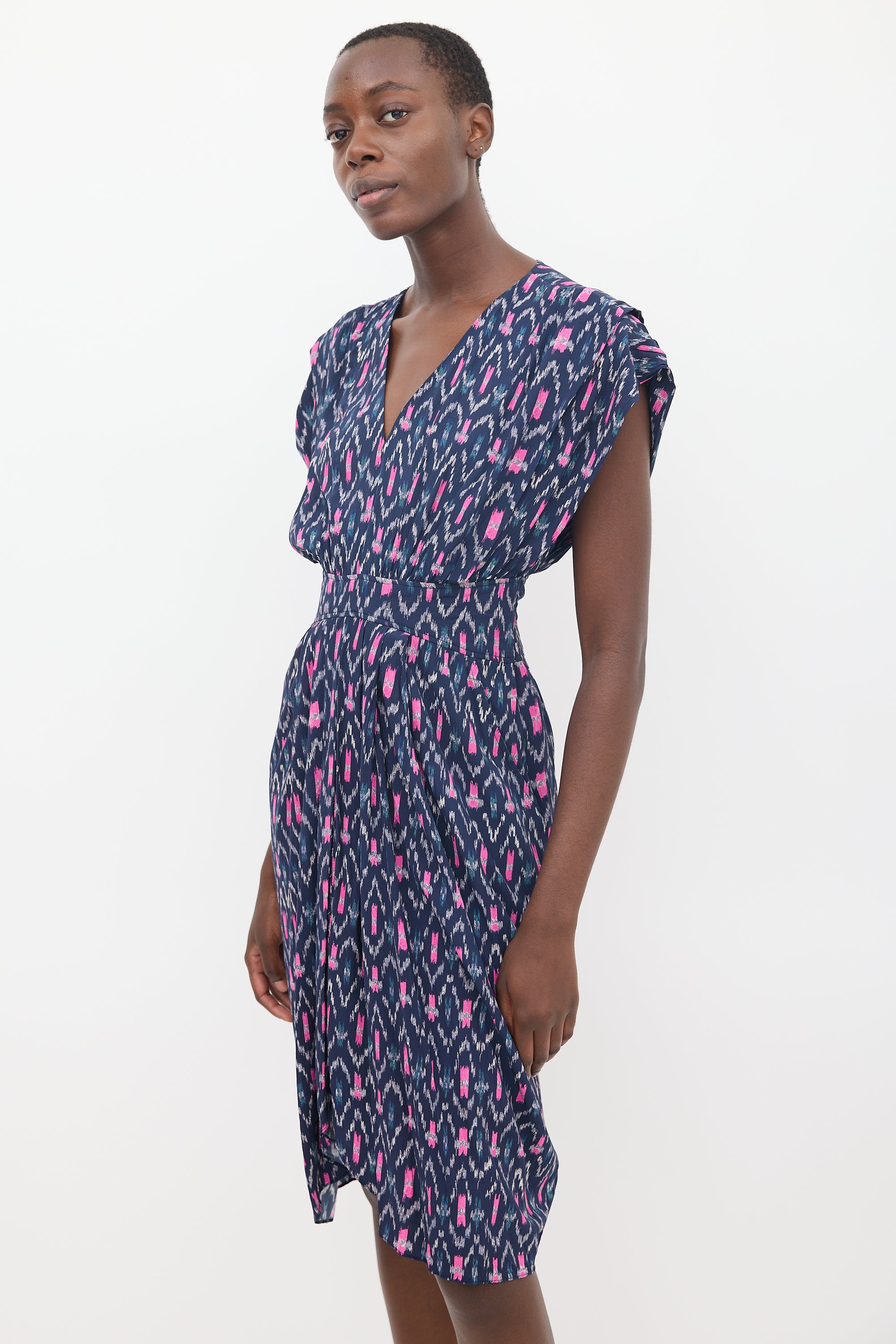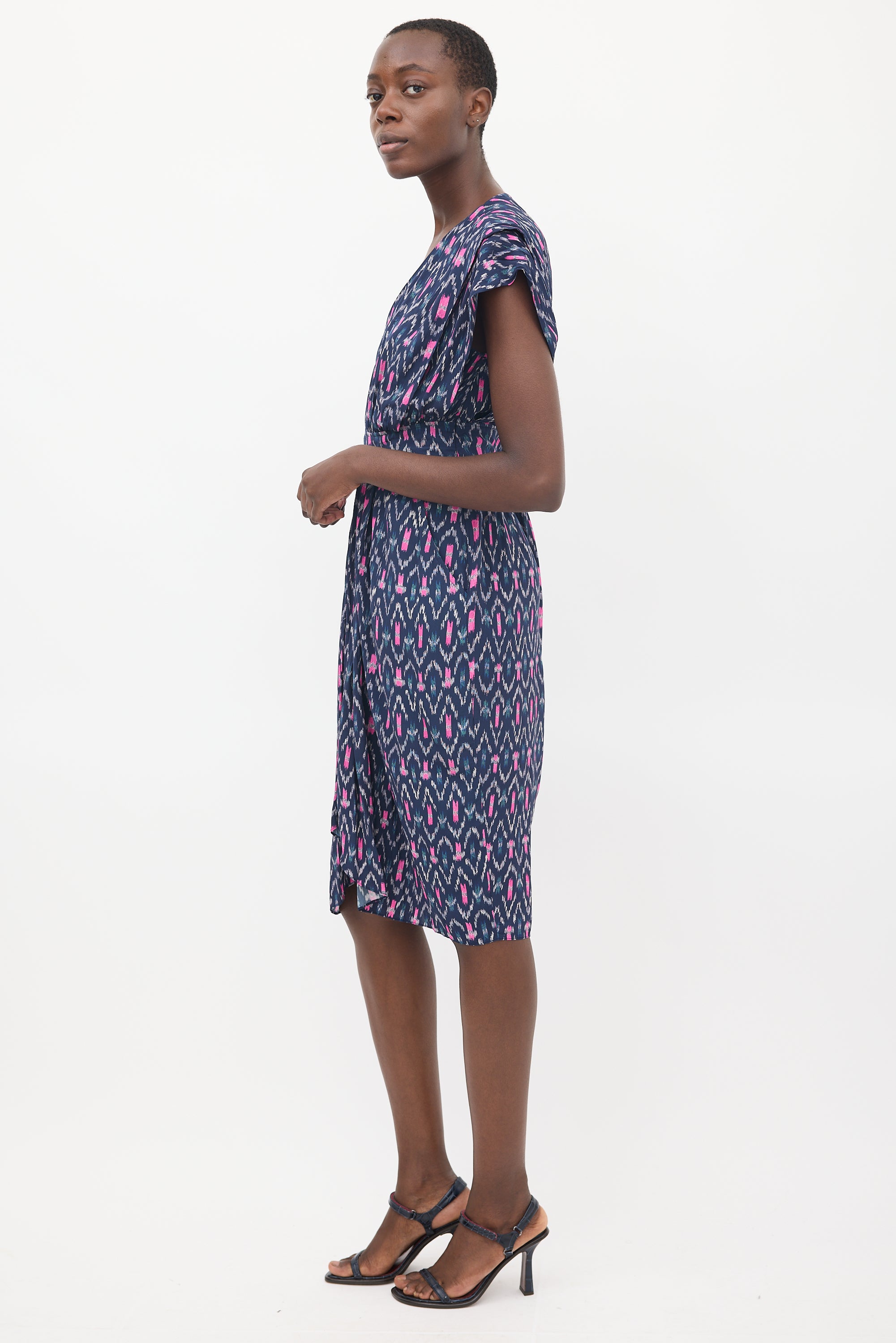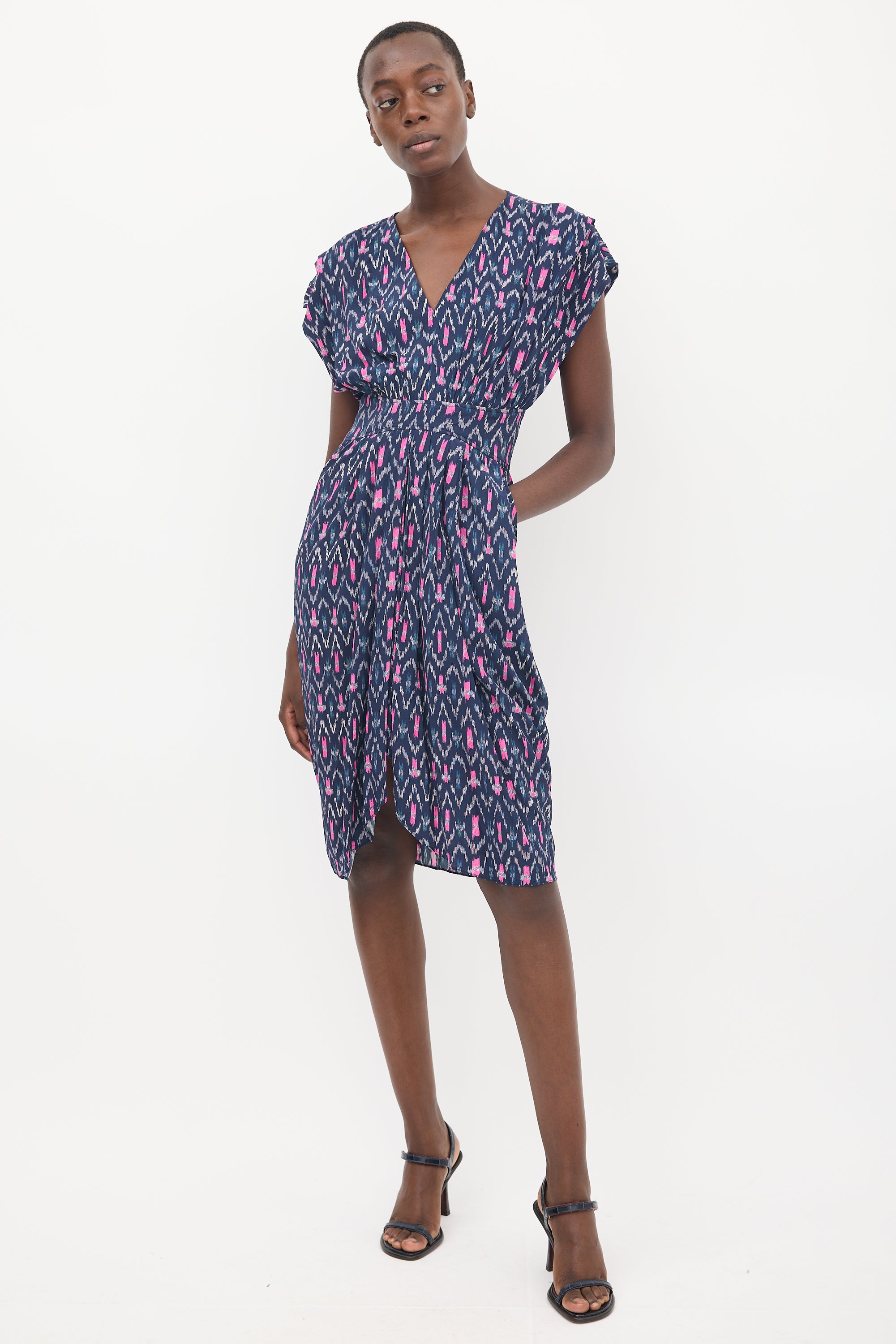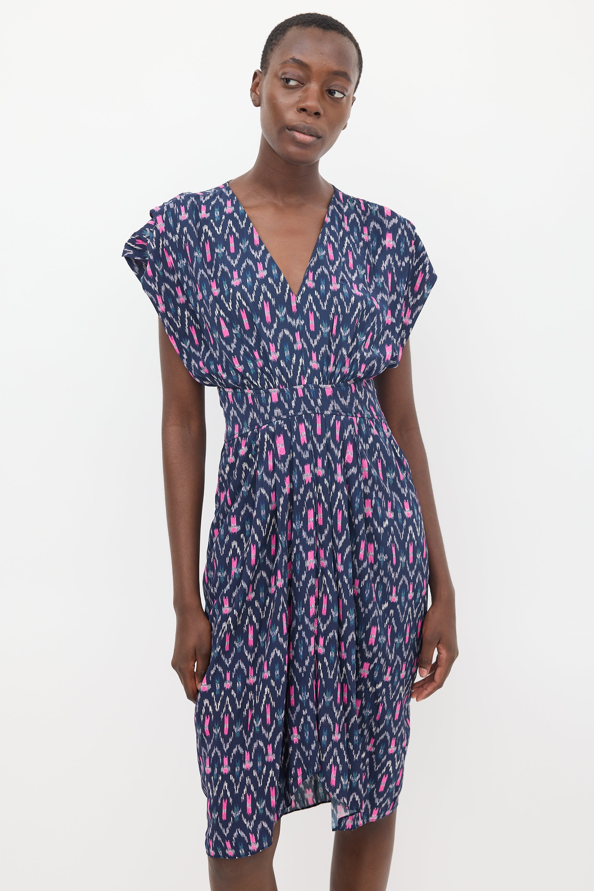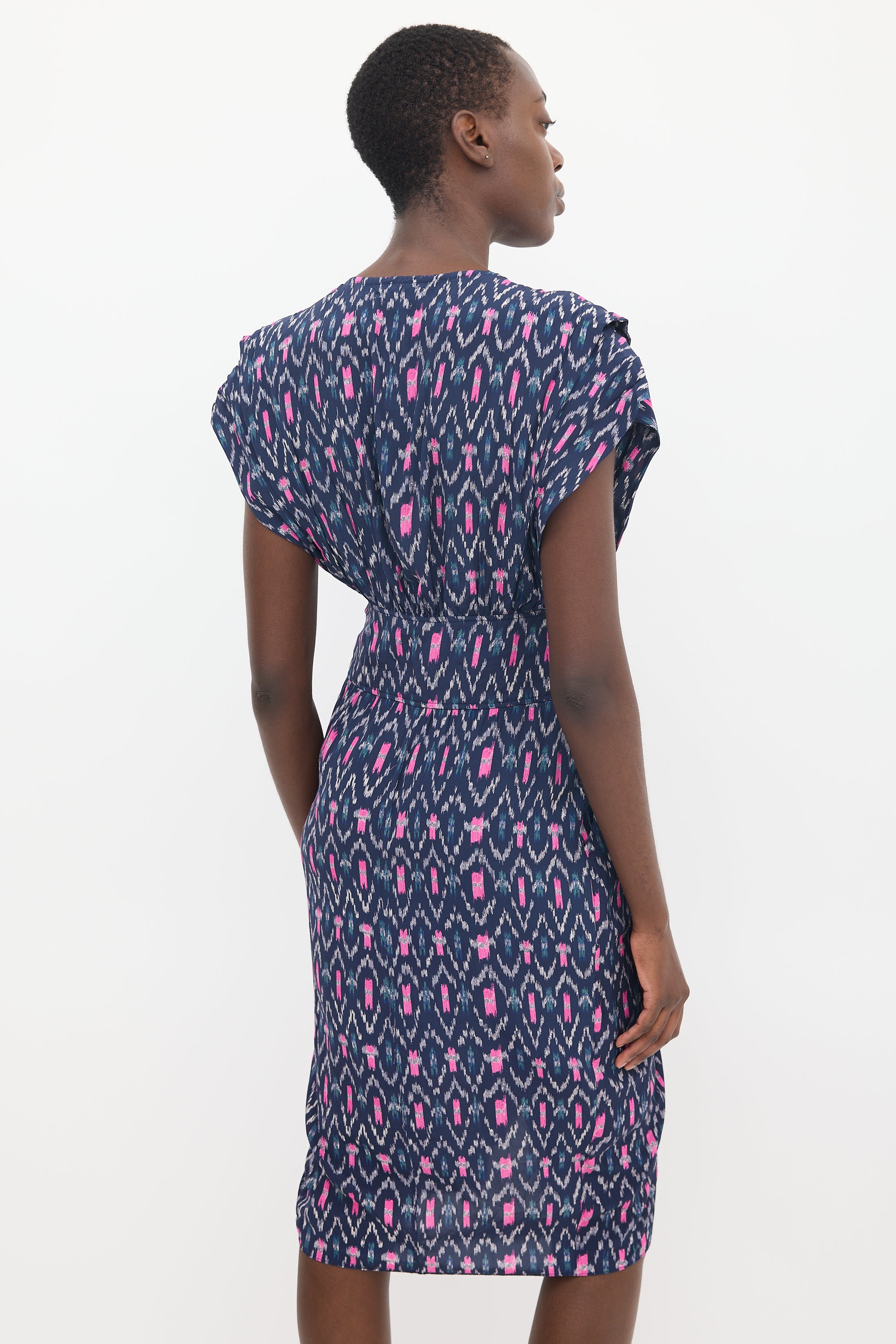 Pre-owned Isabel Marant Étoile navy and pink Almeya dress featuring geometric print throughout, V-neckline, pleated shoulder and waist, concealed zip closure at side, and two inseam pockets at hips. Unlined. Clipped to fit model.