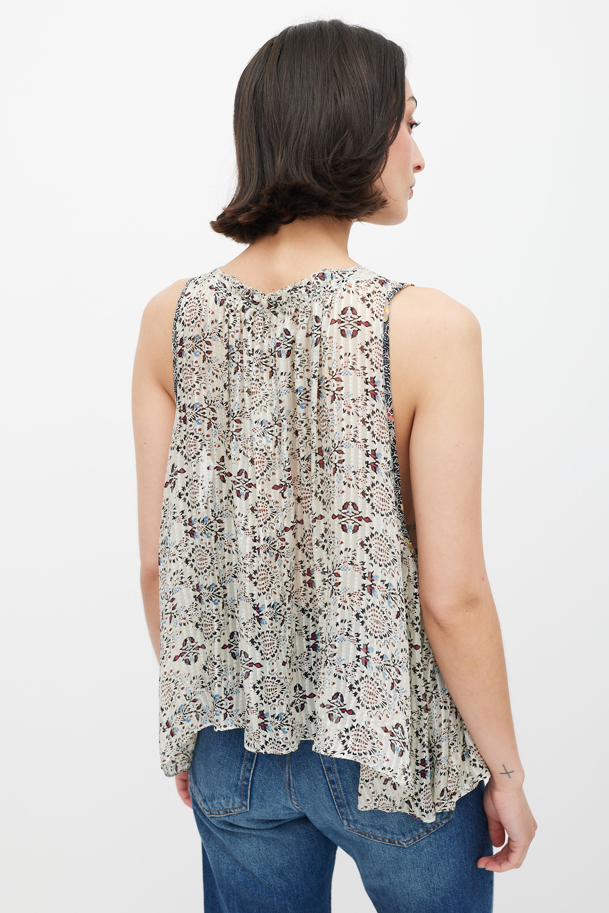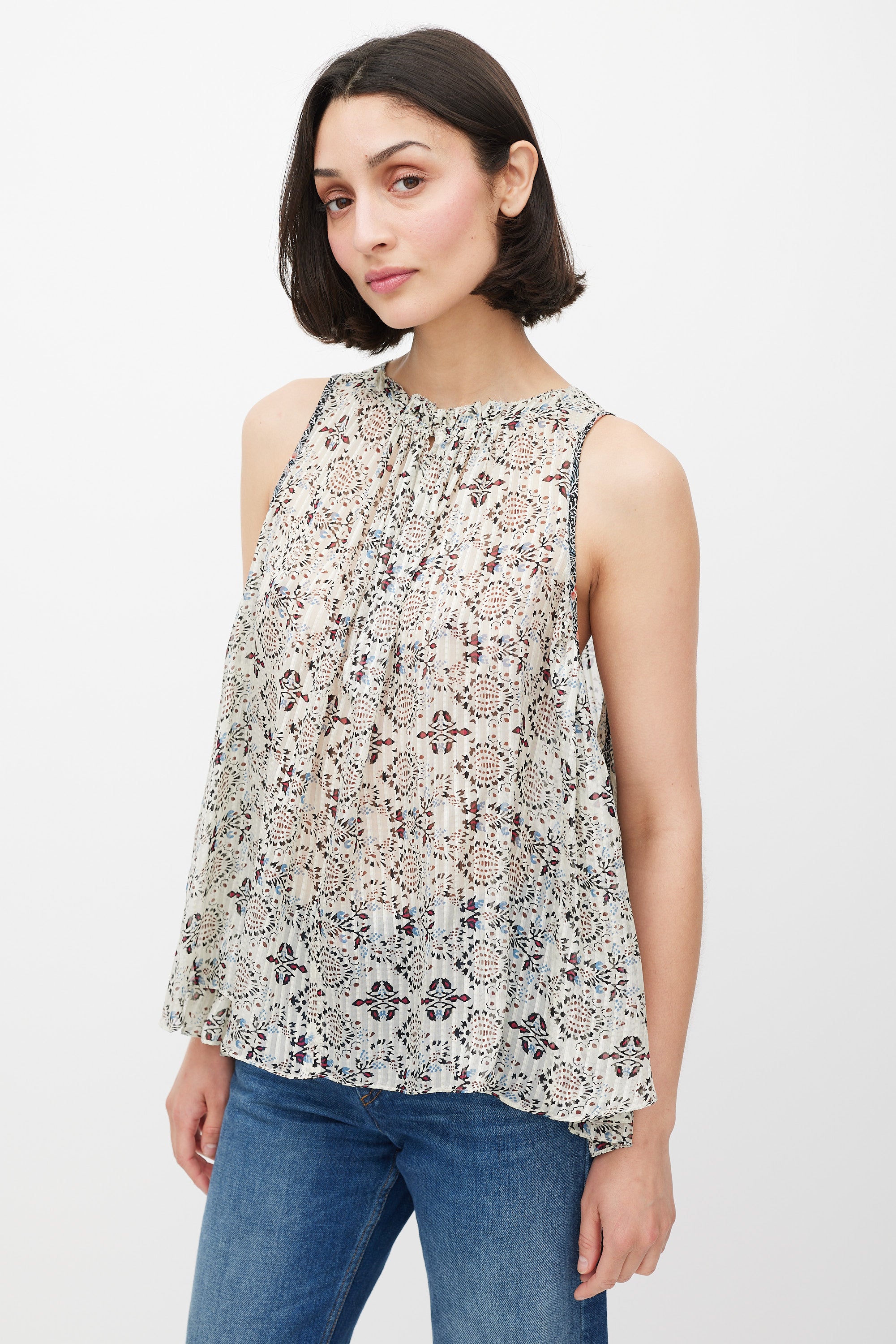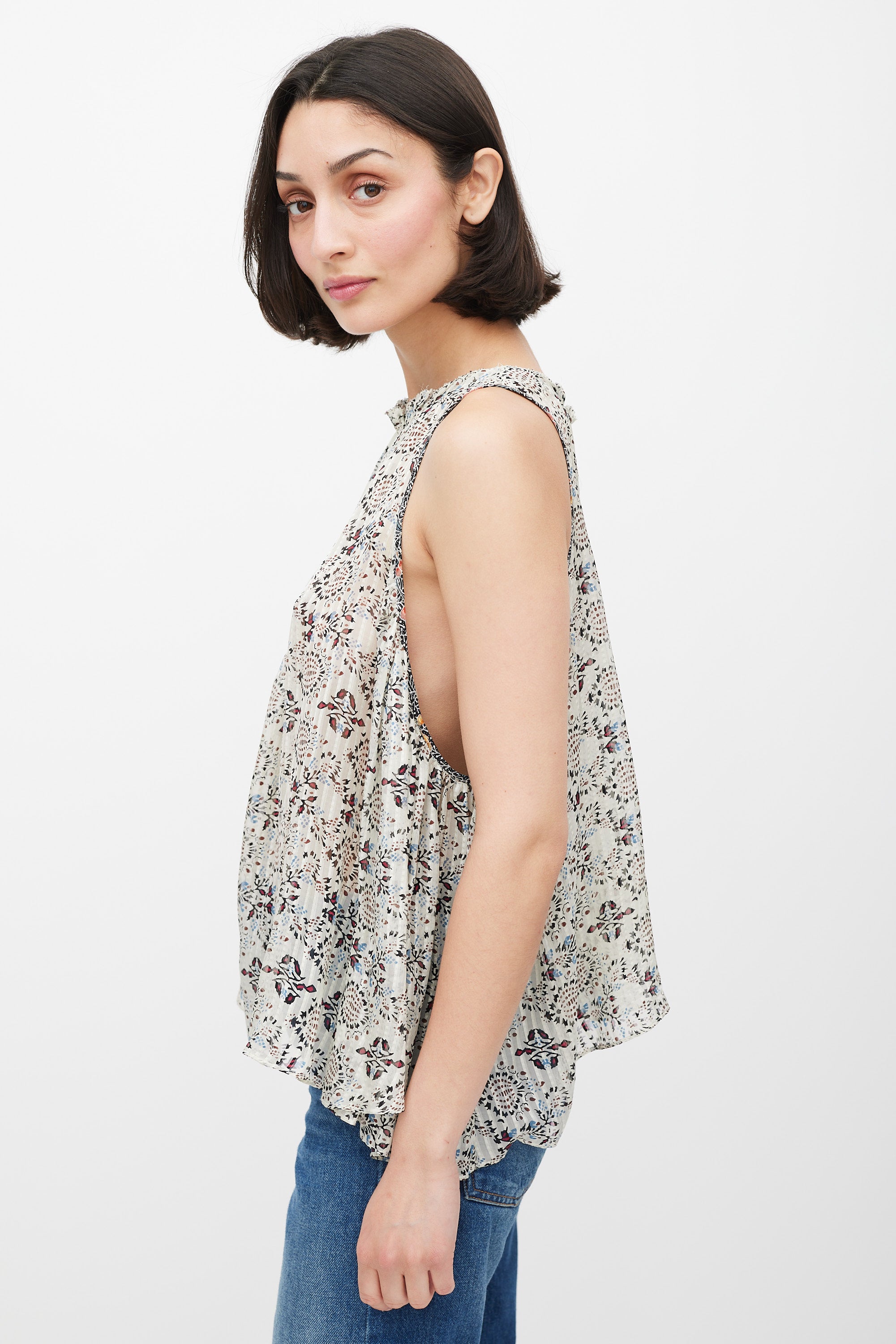Pre-owned Isabel Marant white silk top featuring a multicolour floral pattern throughout, keyhole neckline, sleeveless styling, and gathered detailing at front.