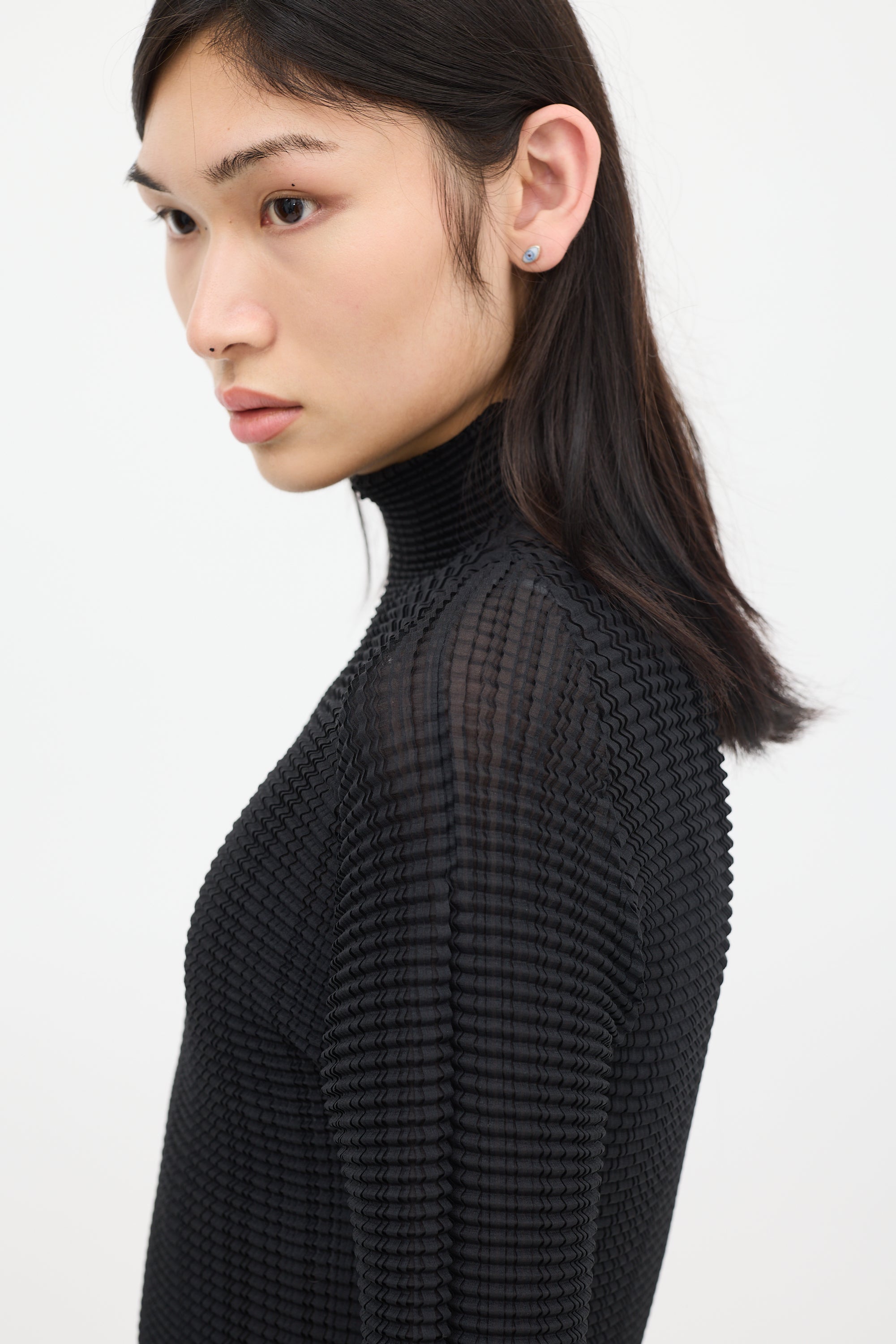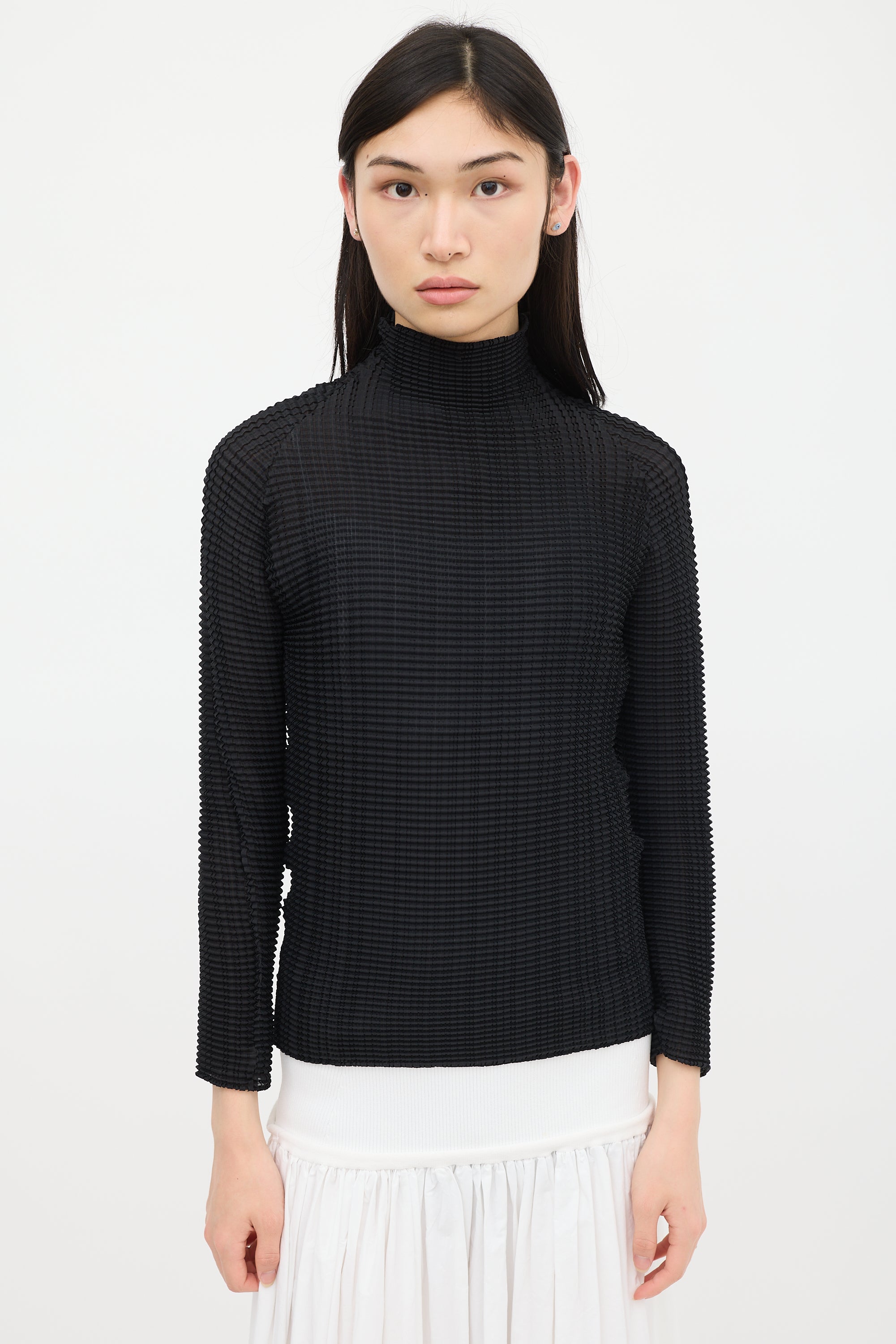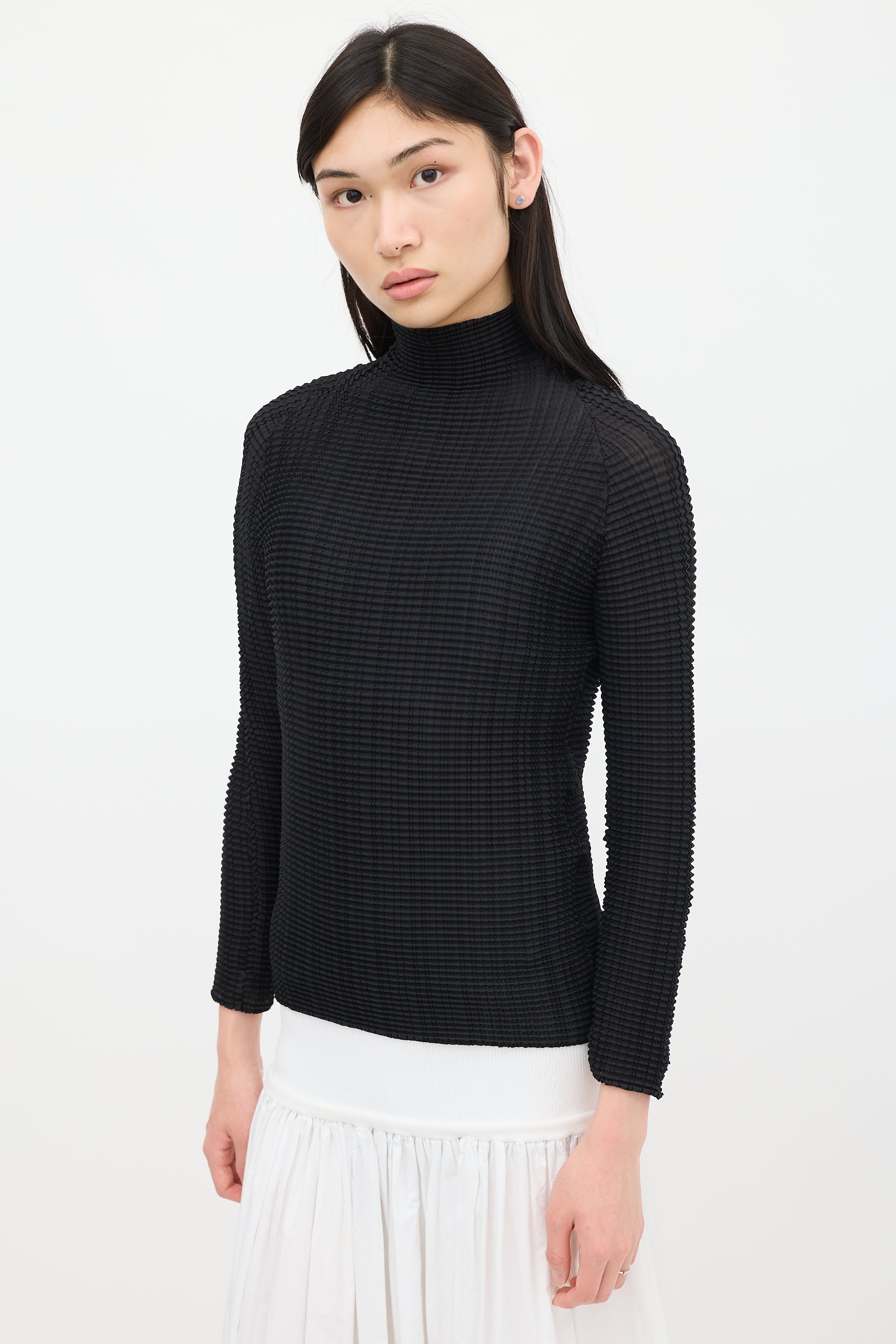 Pre-owned Issey Miyake black top featuring a mock neck collar, pleated detailing, and long sleeves.
