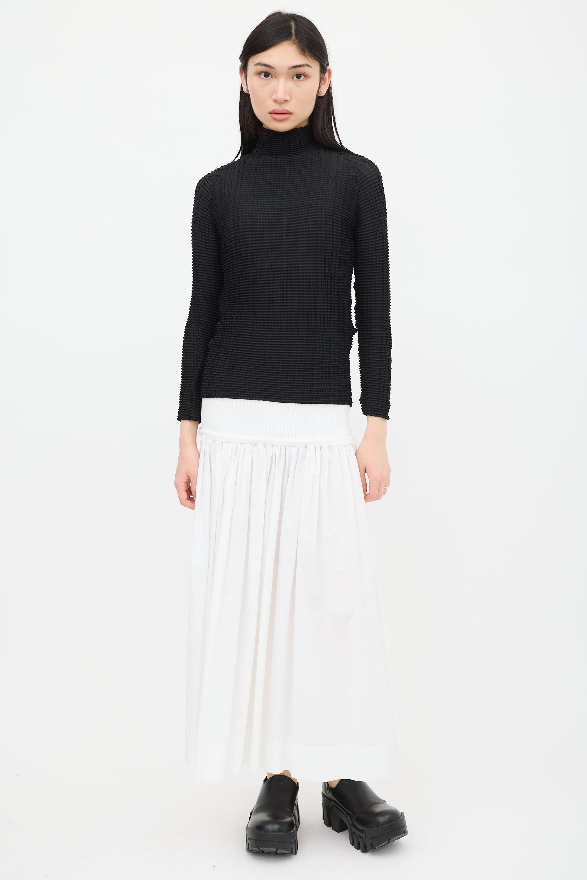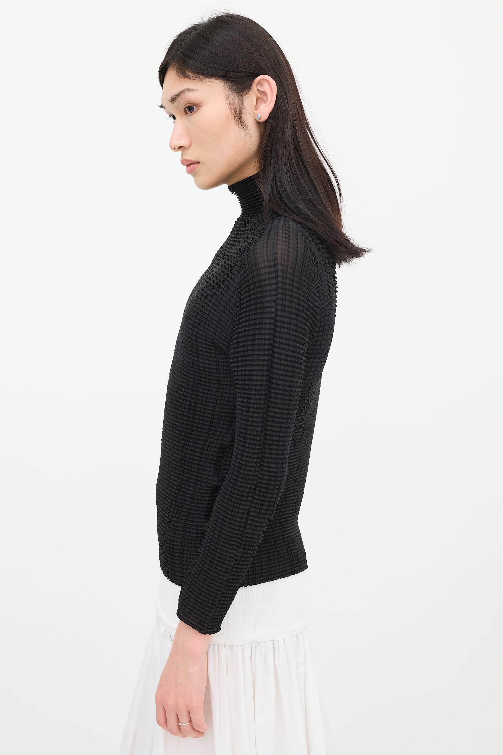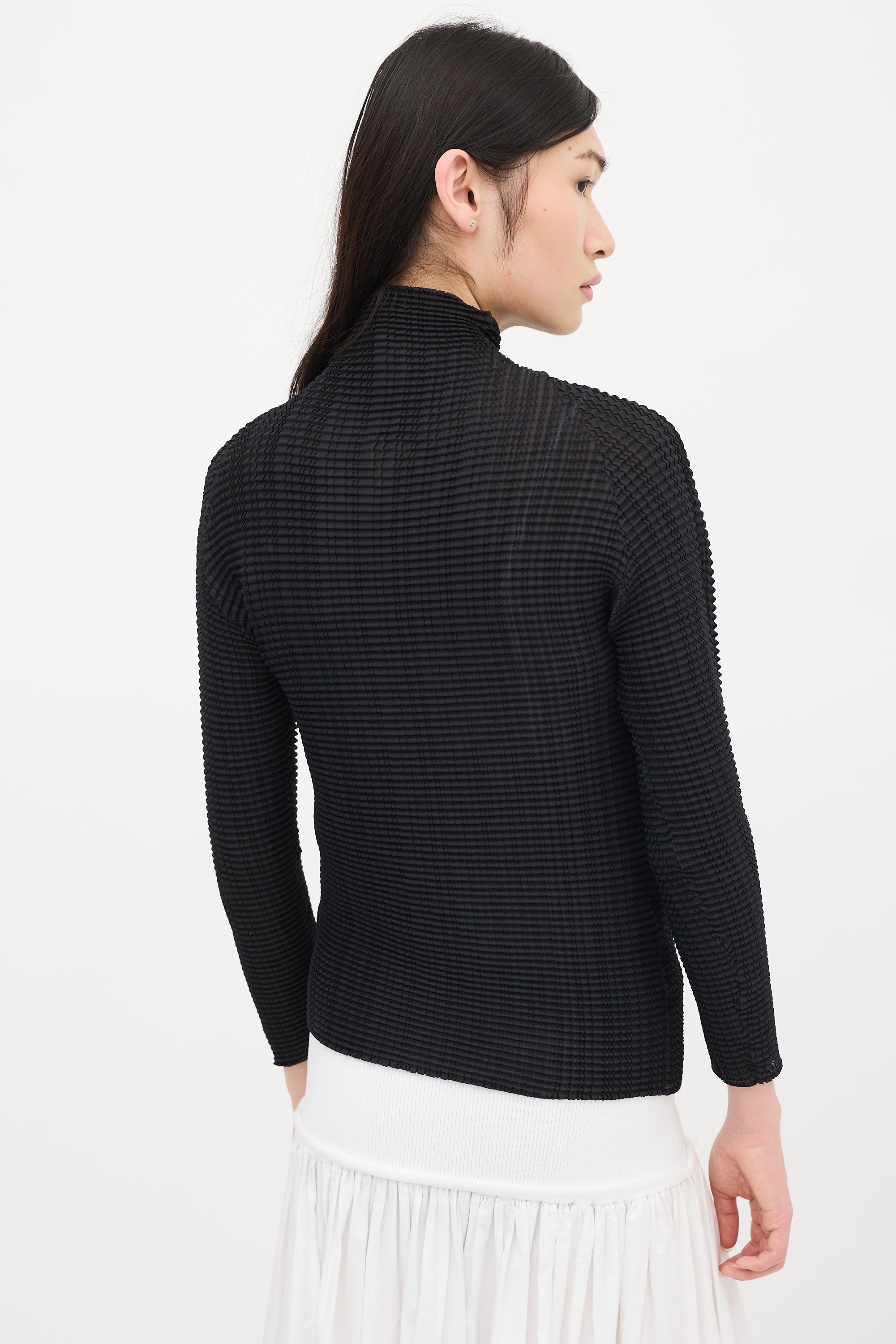Pre-owned Issey Miyake black top featuring a mock neck collar, pleated detailing, and long sleeves.