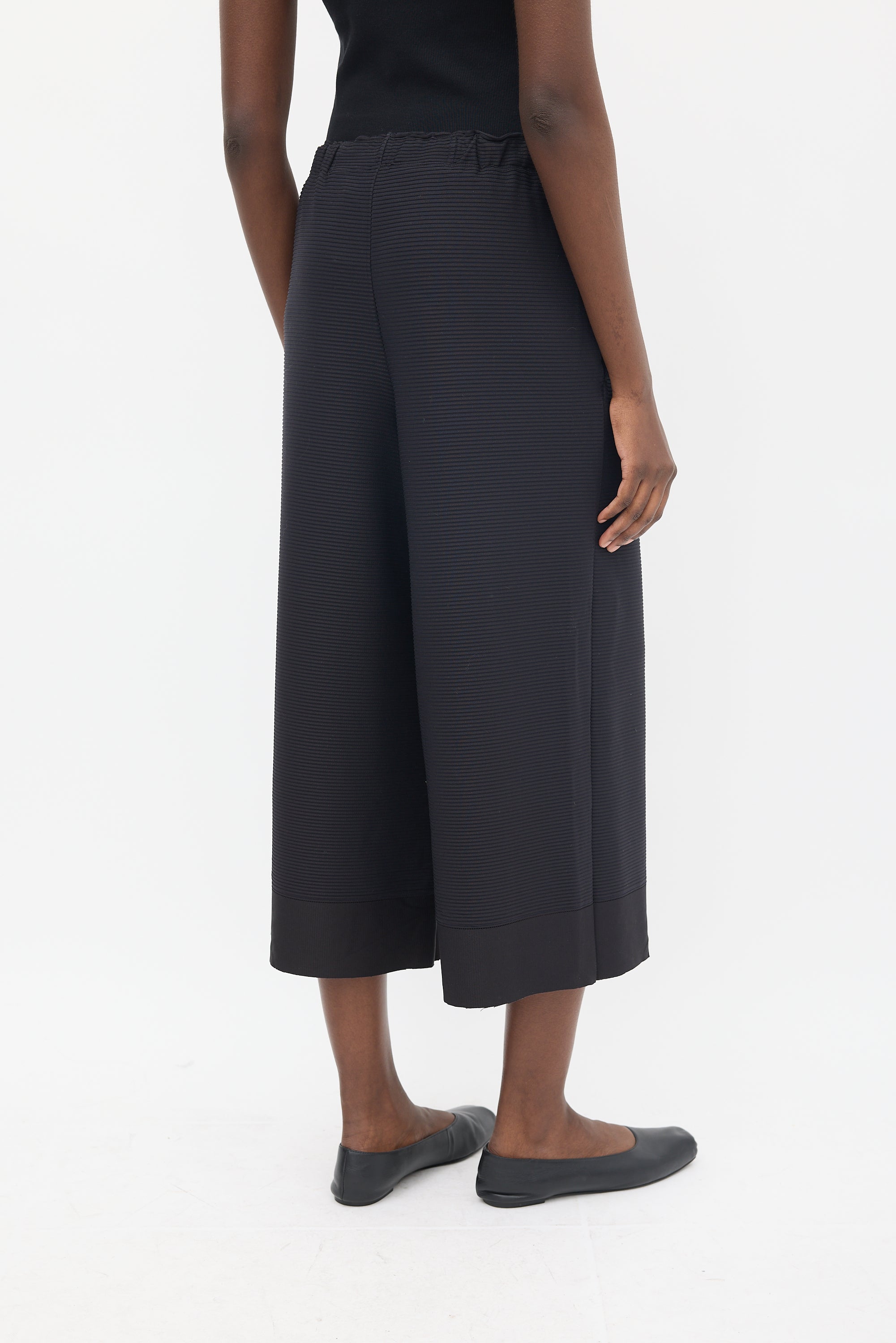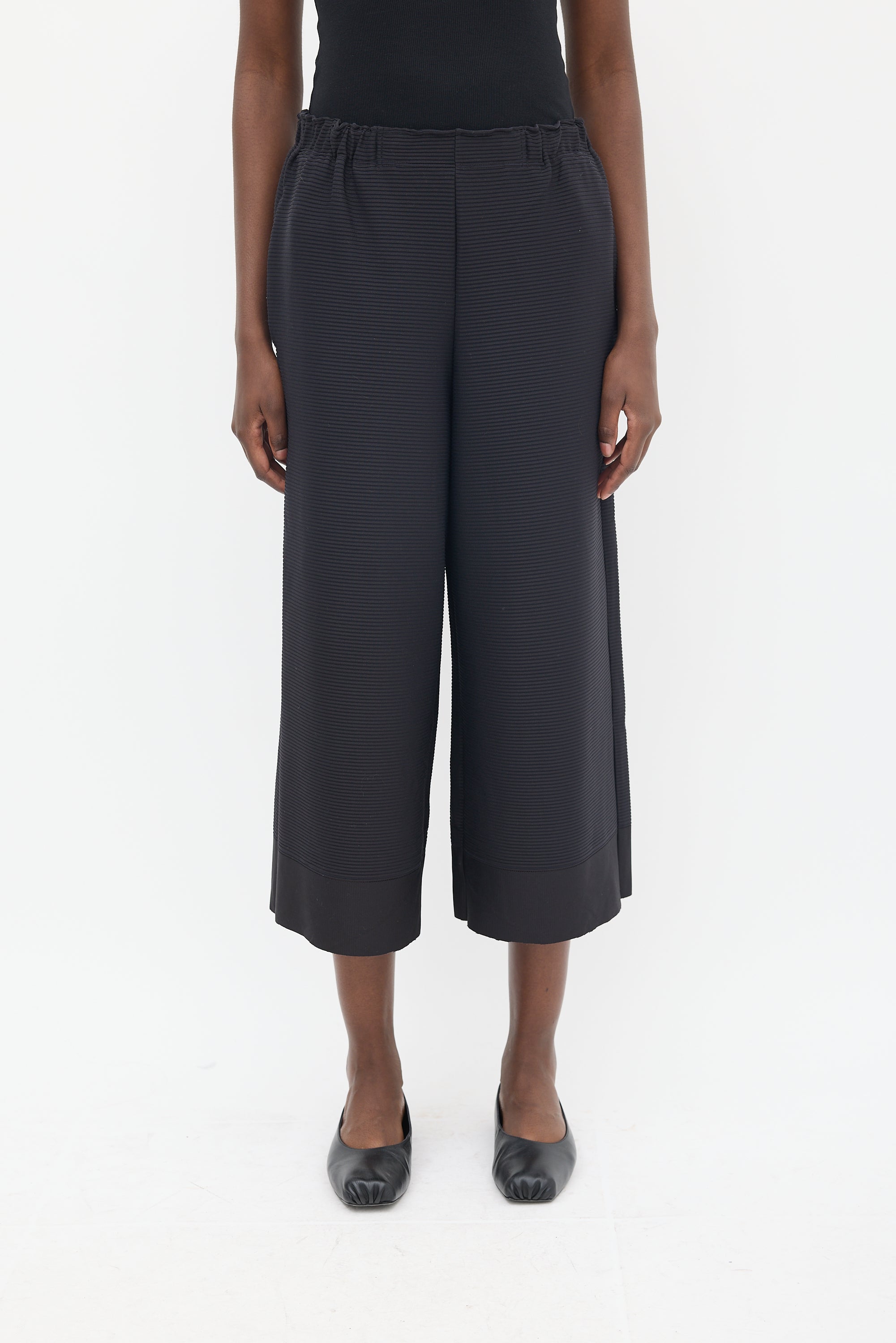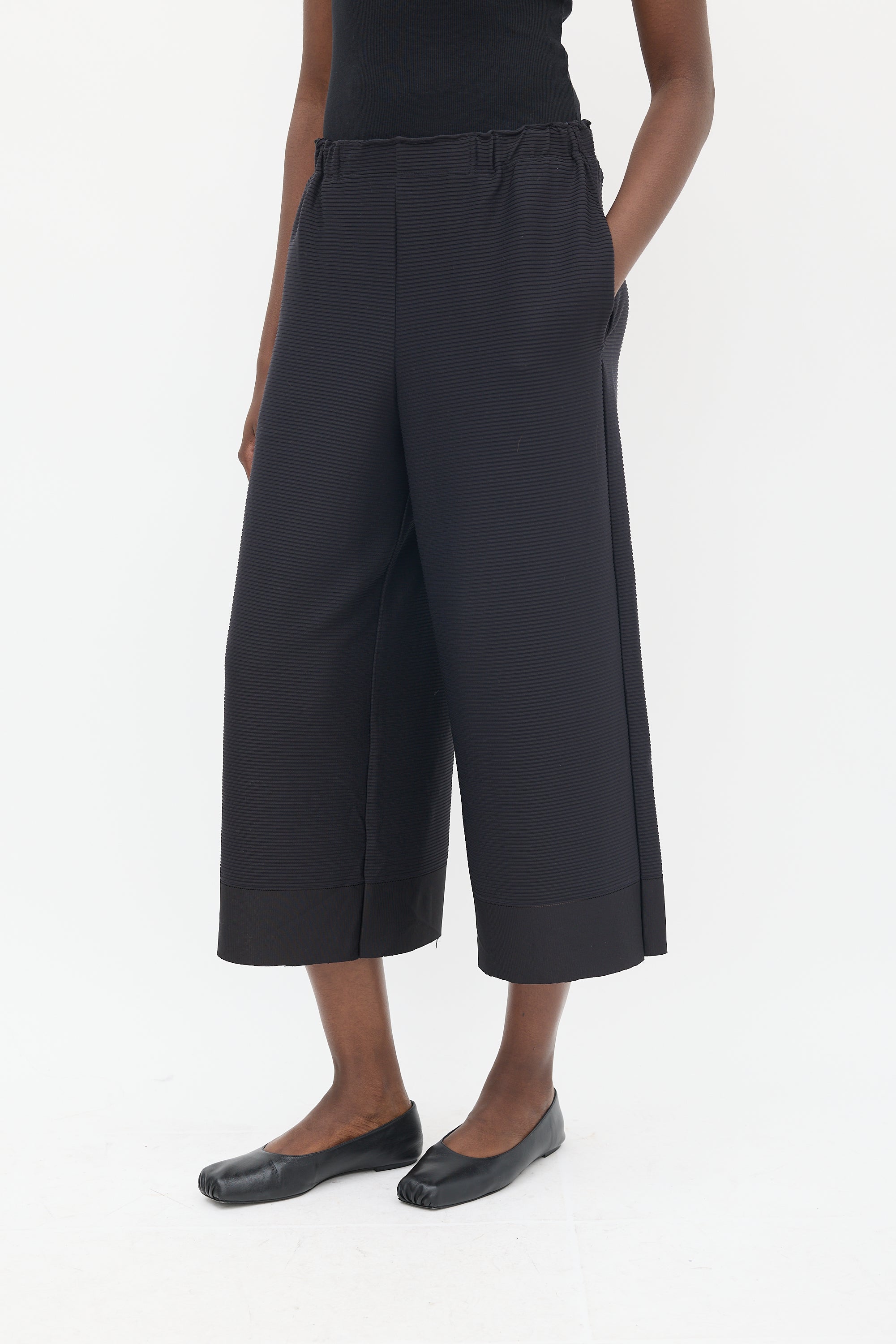 Pre-owned Issey Miyake black pants featuring elasticized waist, horizontal ribbing throughout, wide leg, and wide cuffs with raw hem.