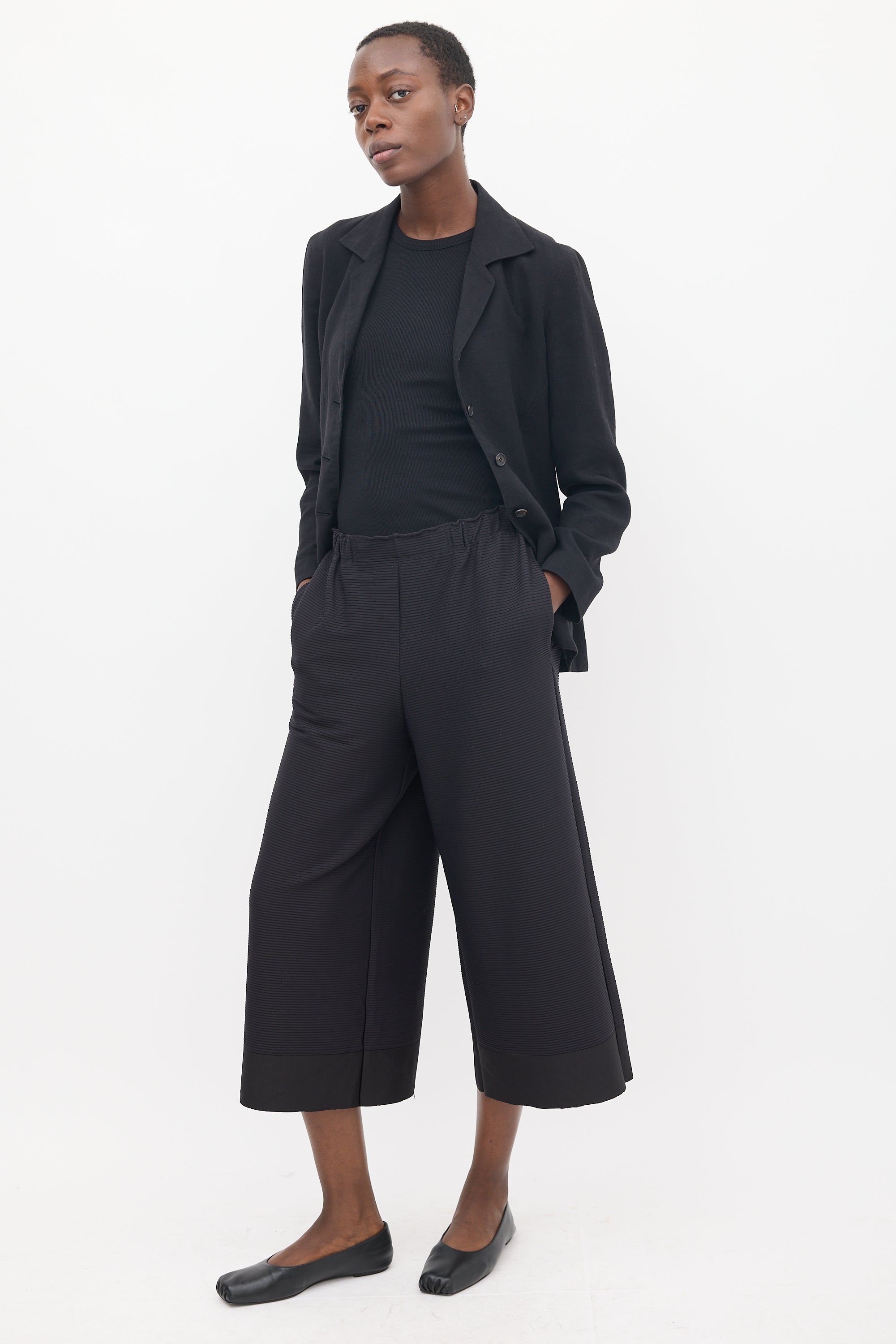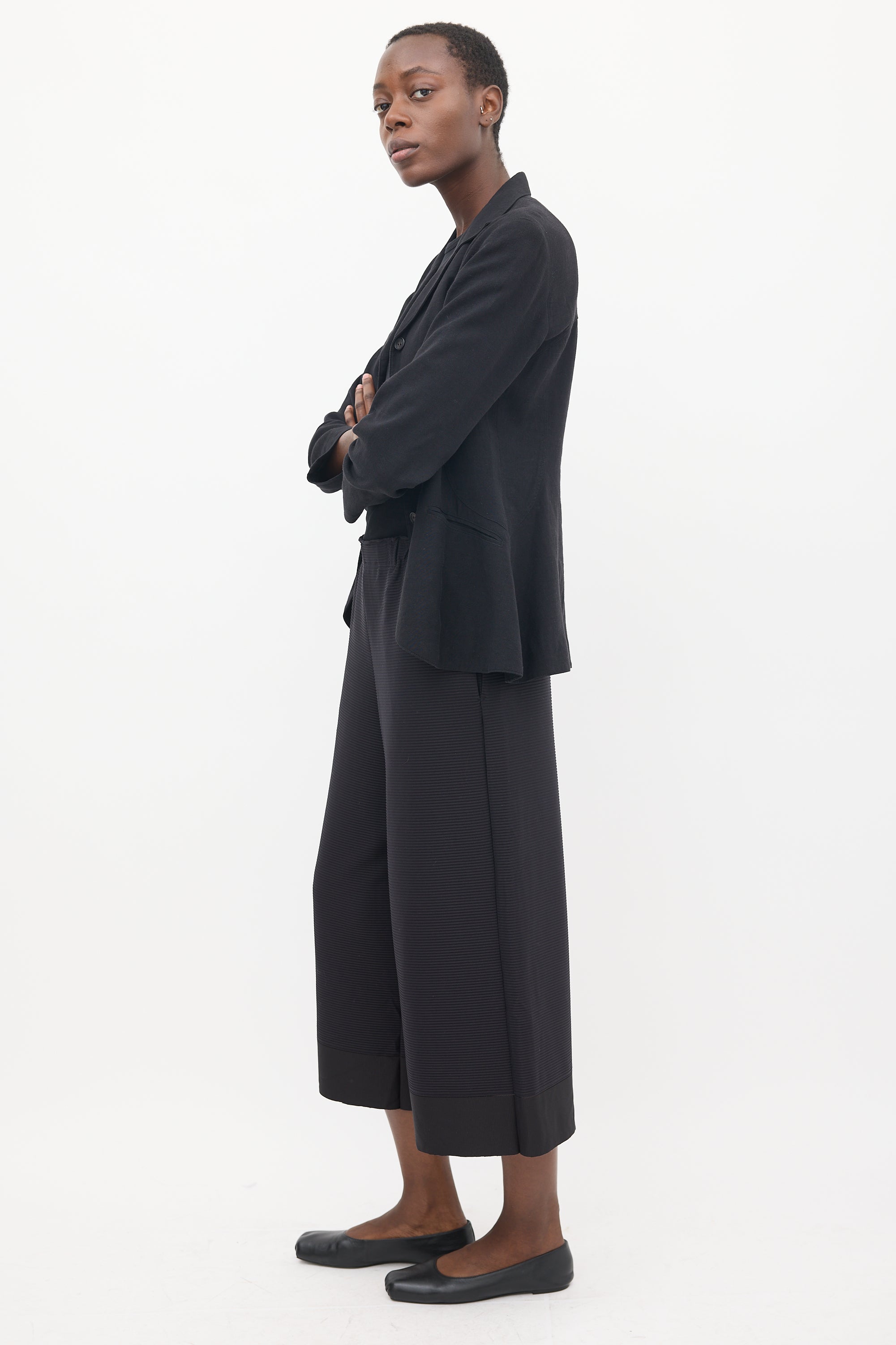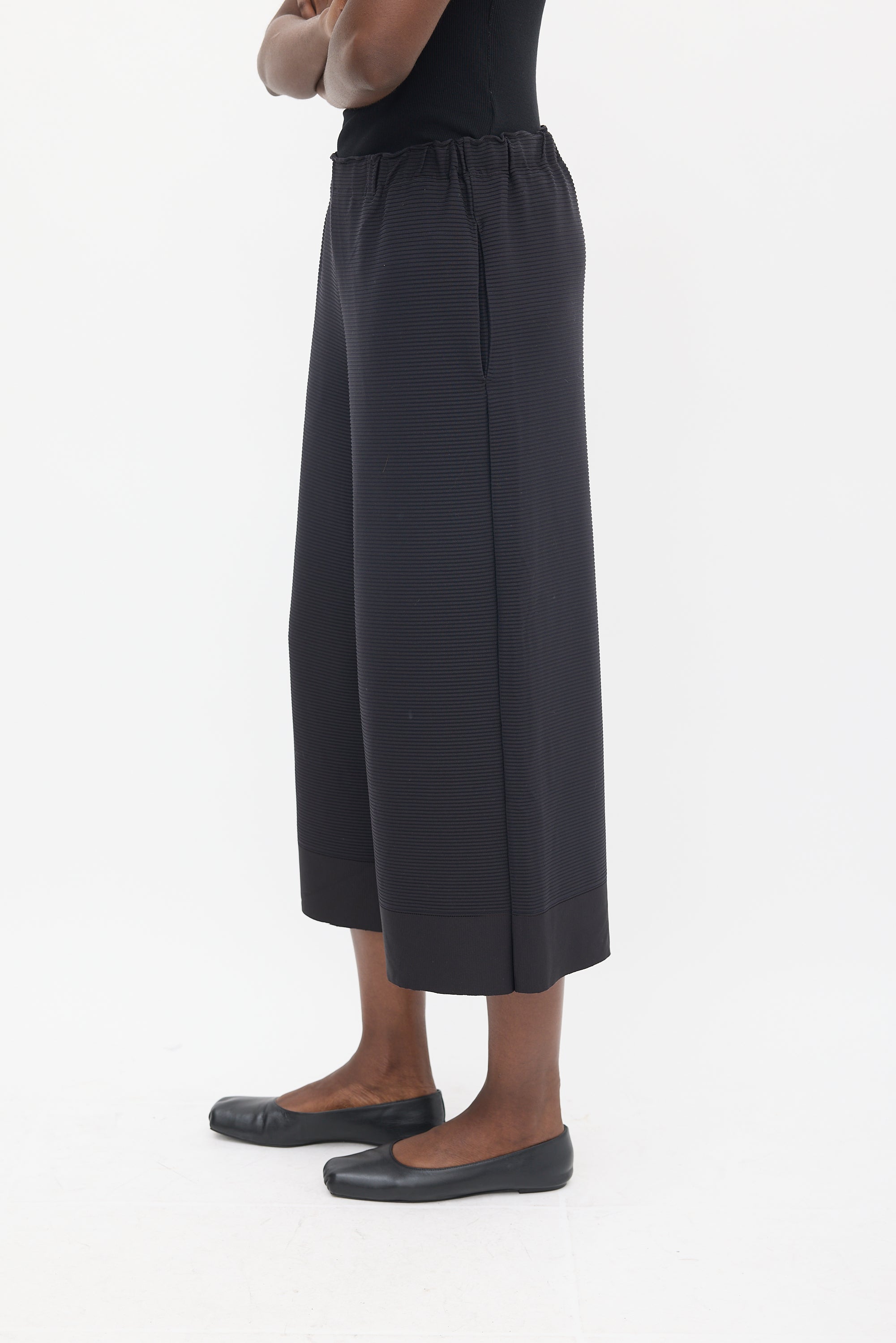 Pre-owned Issey Miyake black pants featuring elasticized waist, horizontal ribbing throughout, wide leg, and wide cuffs with raw hem.