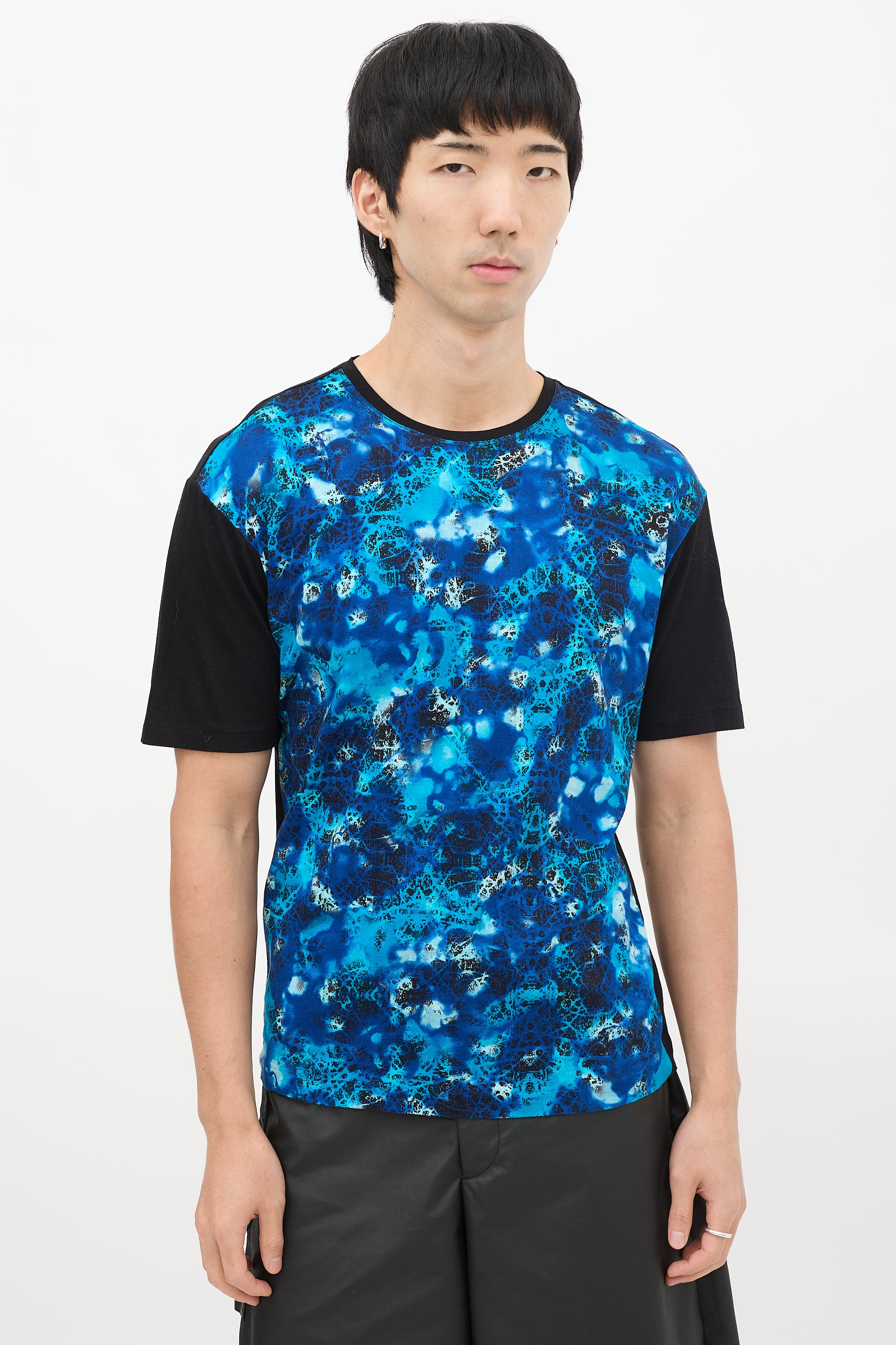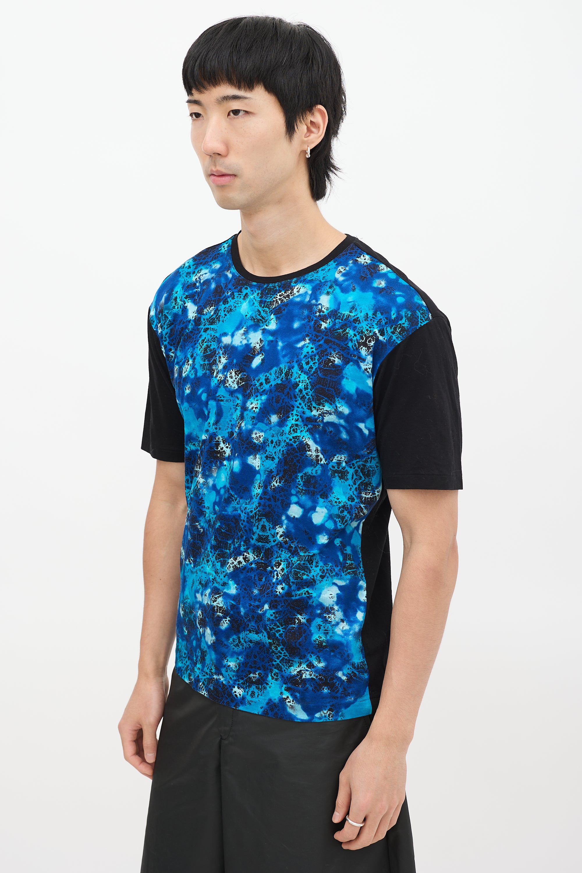 Pre-owned Issey Miyake Men blue and black T-shirt featuring a round neckline, even hem, short sleeves, and dye print throughout front.