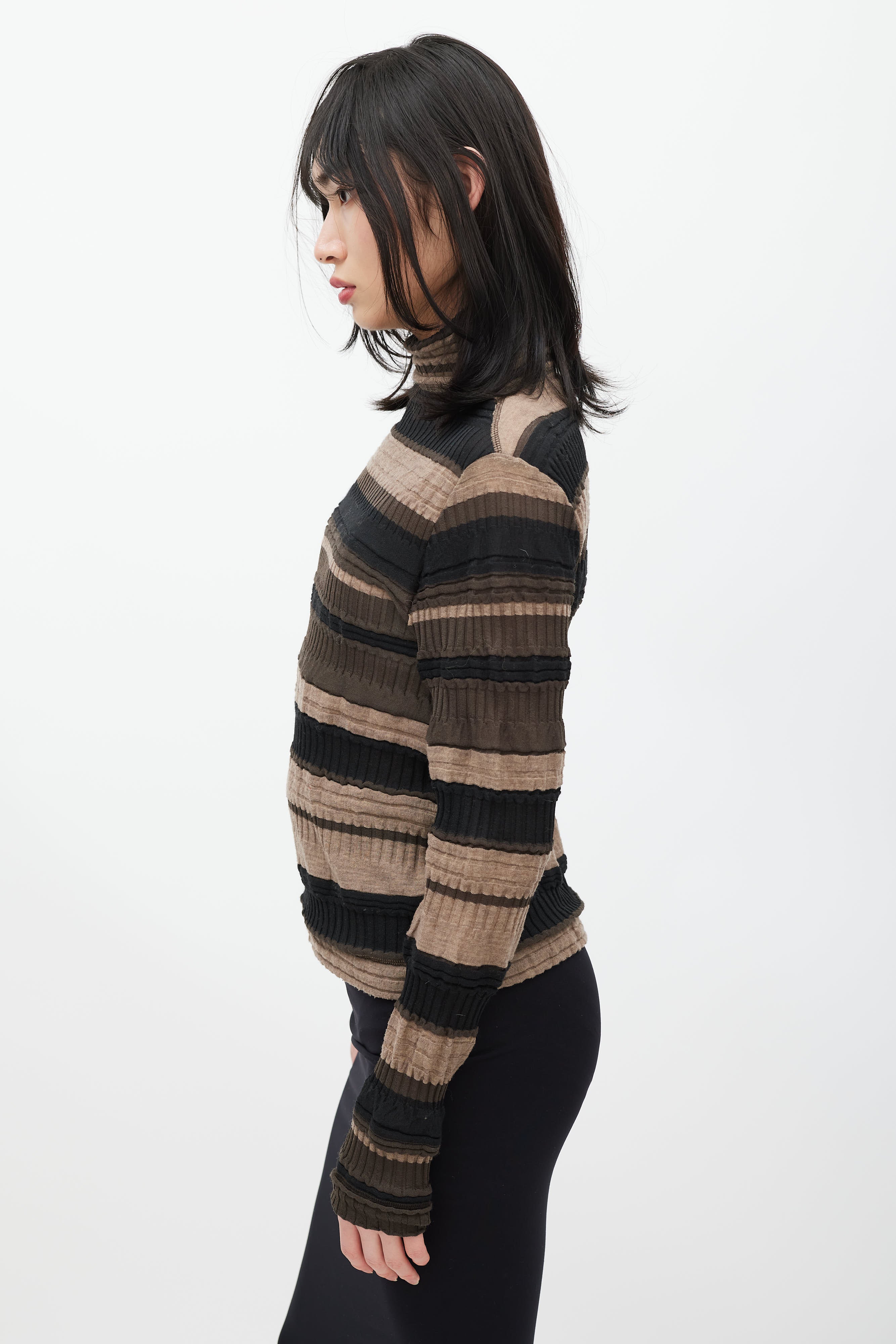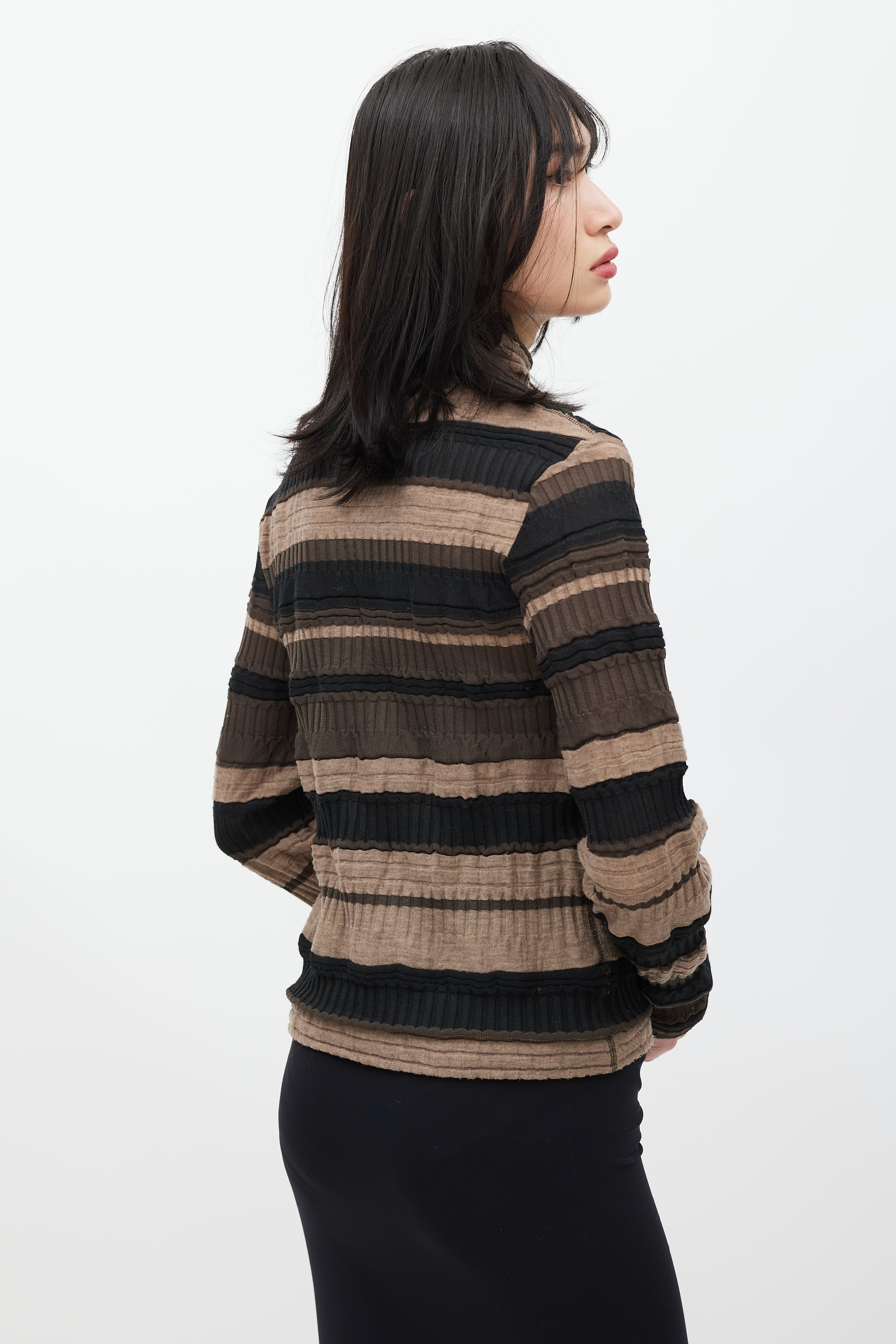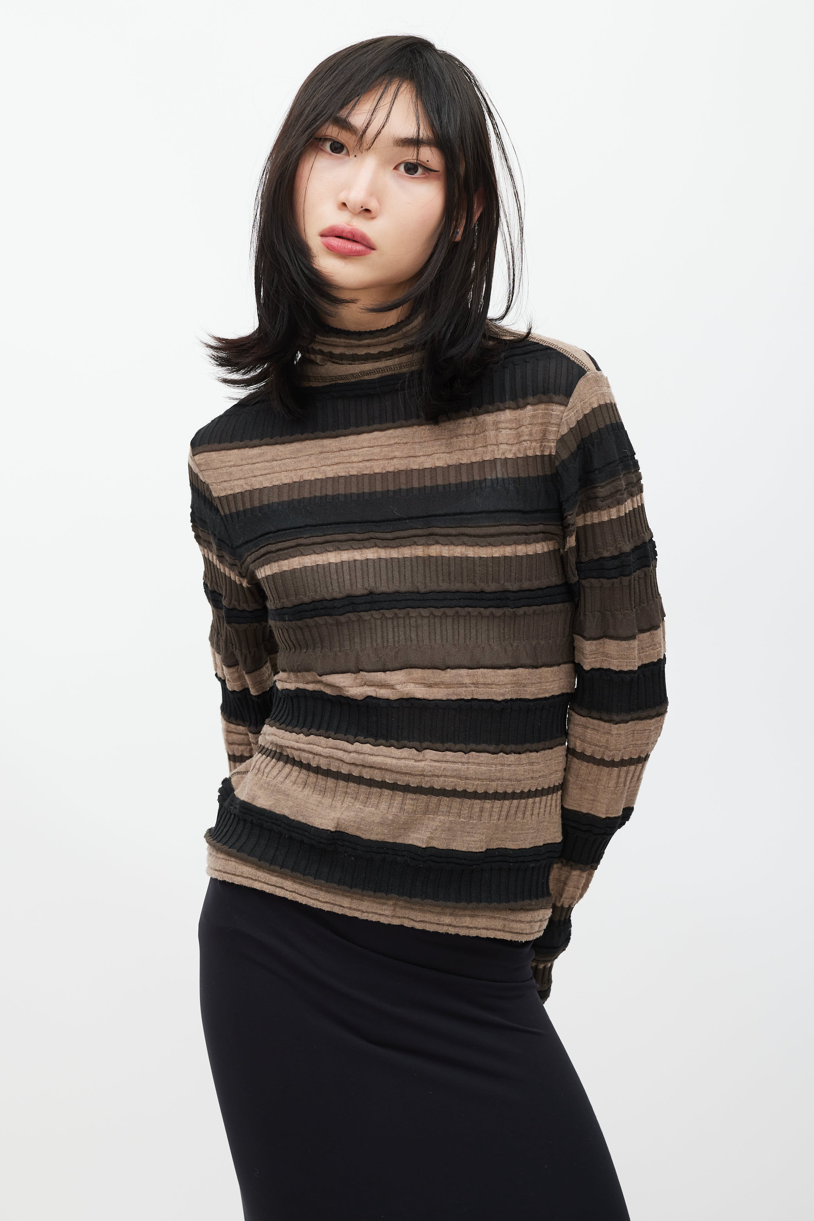 Pre-owned Issey Miyake Fete brown sweater featuring a black striped pattern throughout, turtleneck, and ribbed detailing.