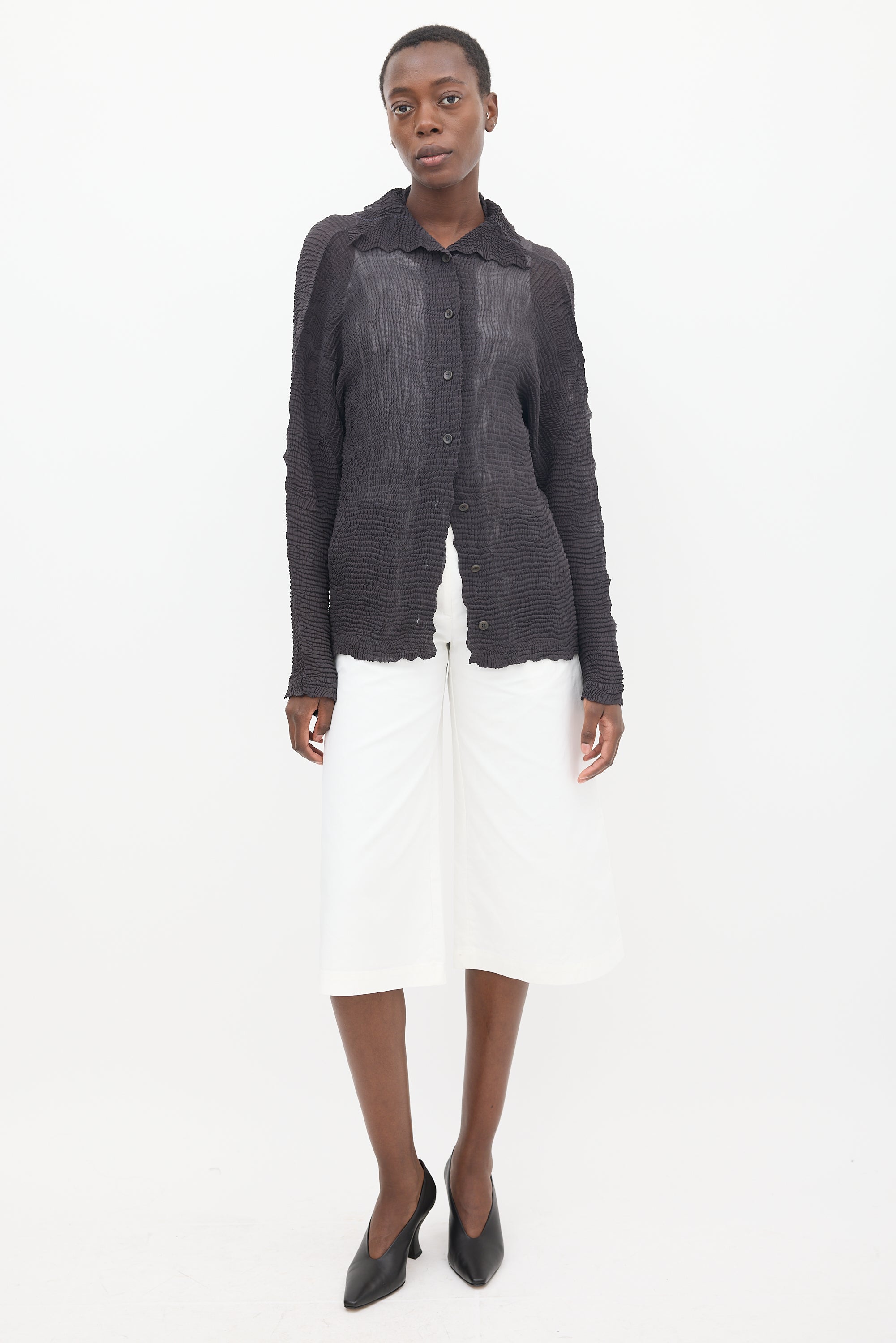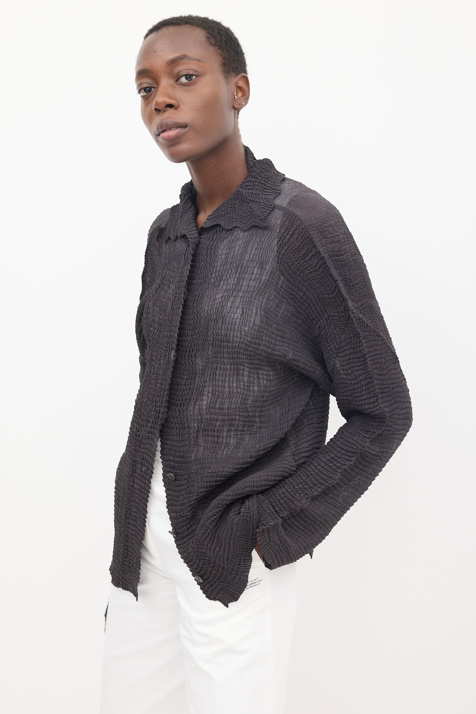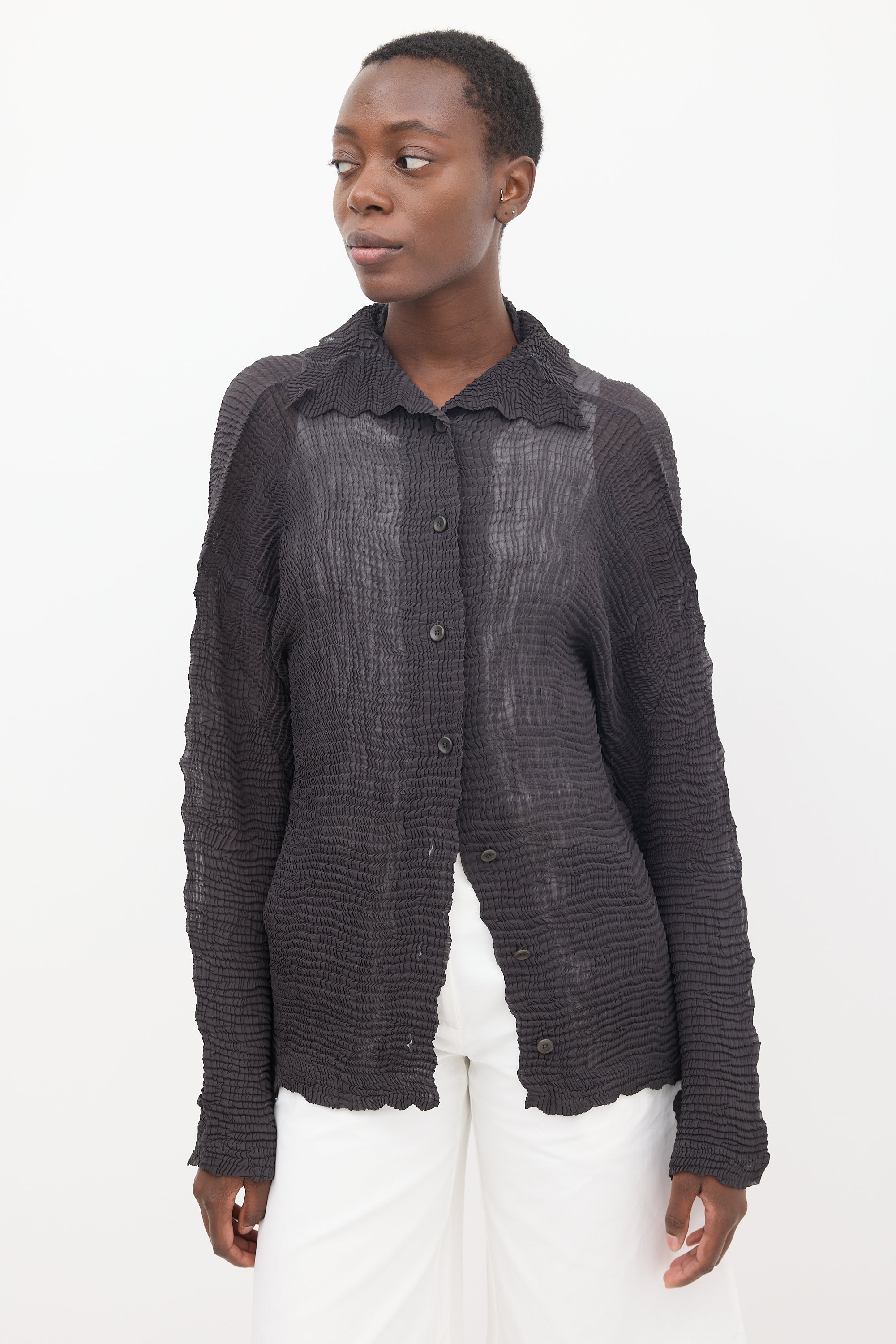 Pre-owned Issey Miyake brown shirt featuring pointed scalloped collar, Wooly pleats throughout, long sleeves, and button up front.