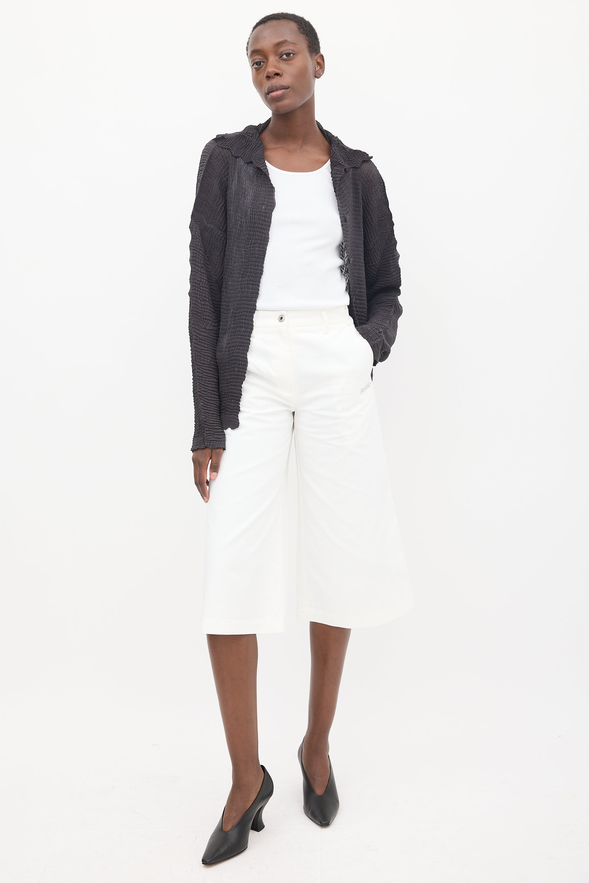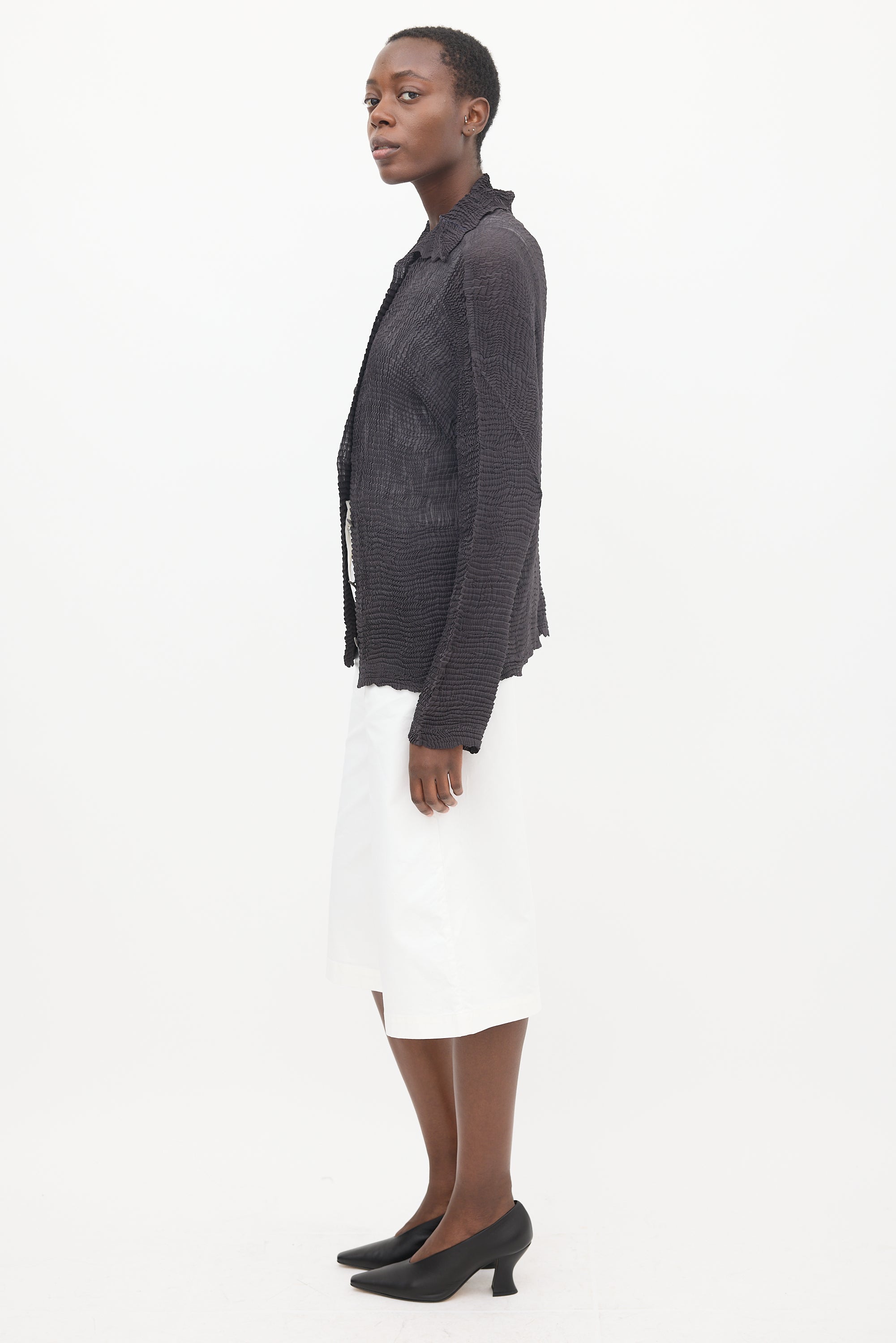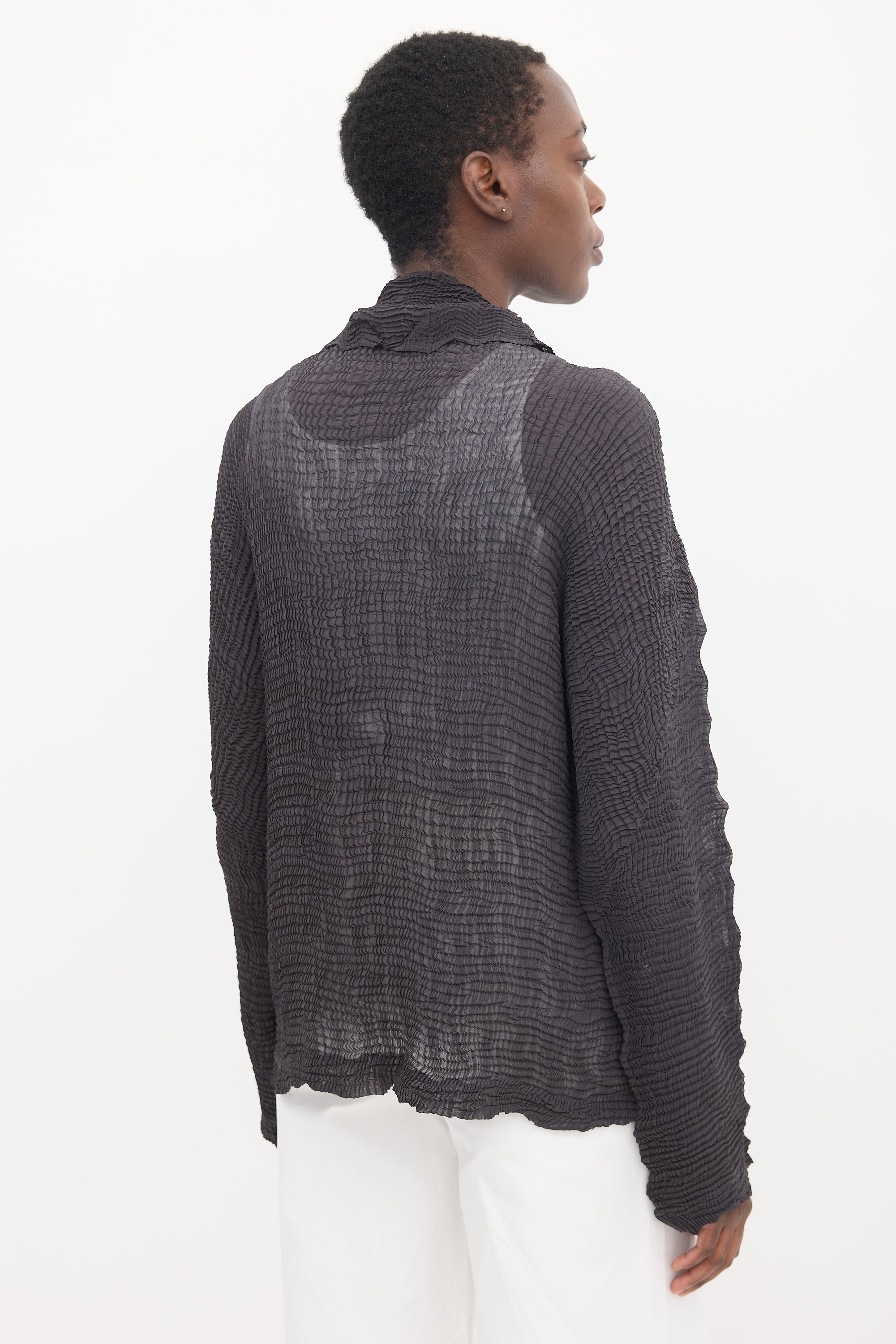 Pre-owned Issey Miyake brown shirt featuring pointed scalloped collar, Wooly pleats throughout, long sleeves, and button up front.