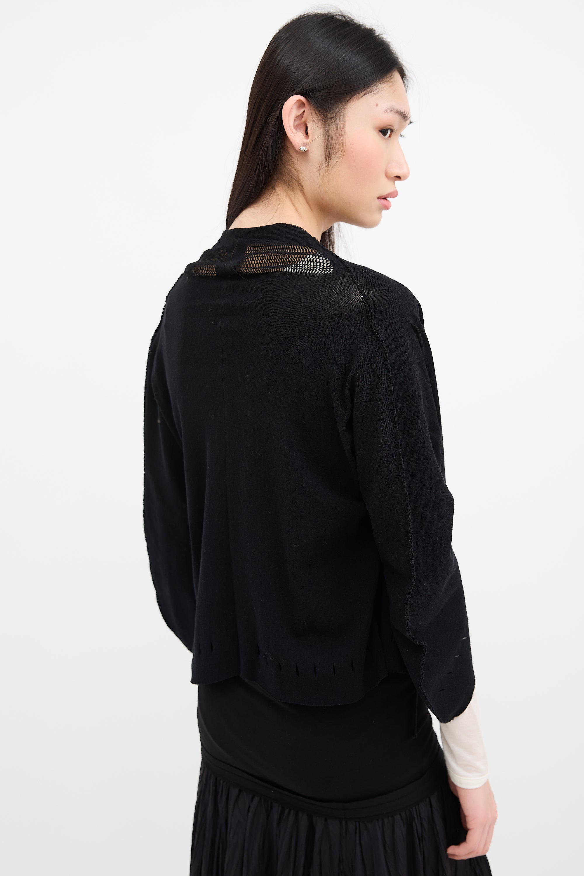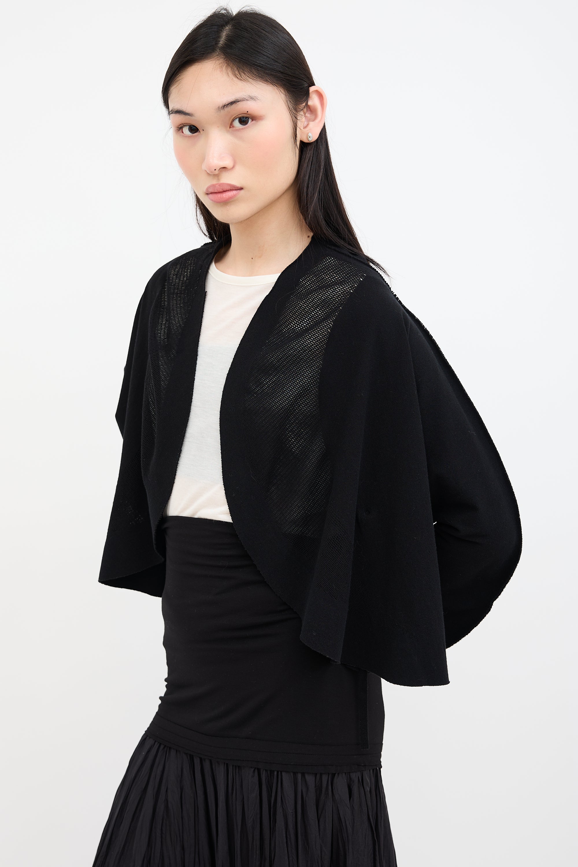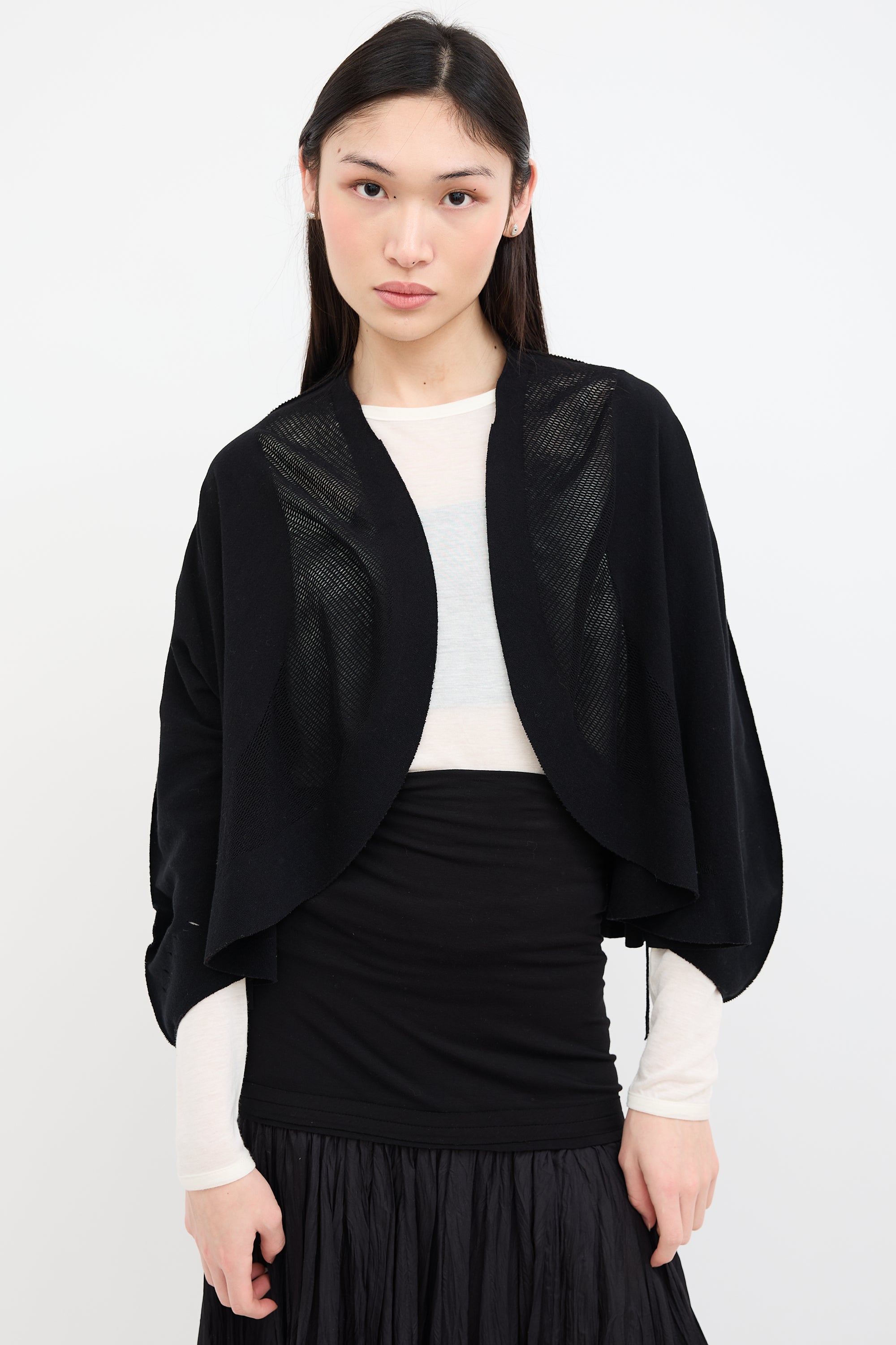 Pre-owned Issey Miyake Fete black cropped cardigan featuring shawl lapel with mesh cutout, front tie closure, quarter length sleeves, cutout trim, and raw hem.