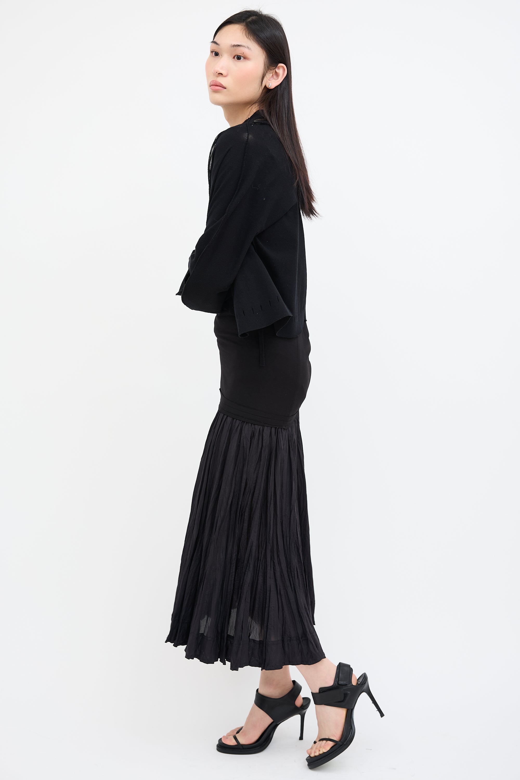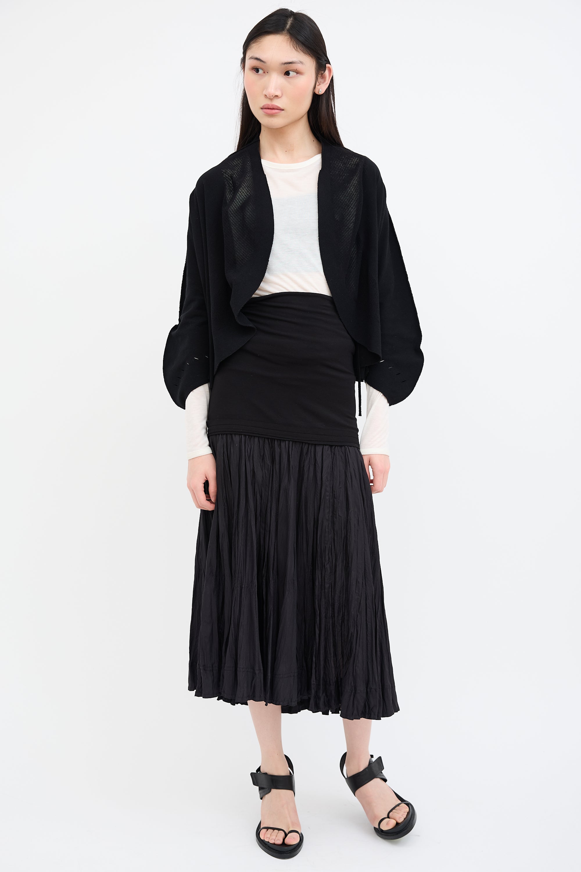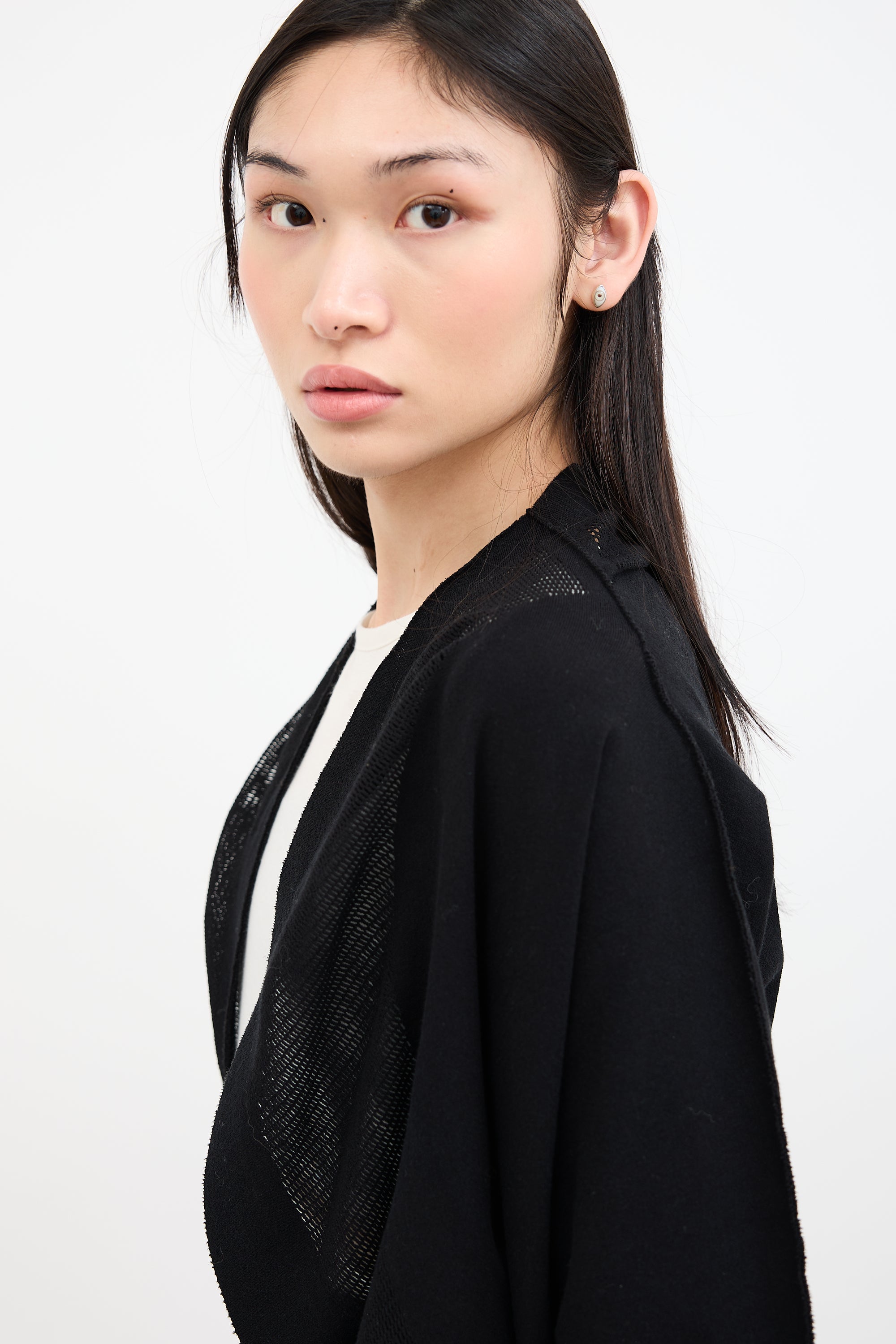 Pre-owned Issey Miyake Fete black cropped cardigan featuring shawl lapel with mesh cutout, front tie closure, quarter length sleeves, cutout trim, and raw hem.