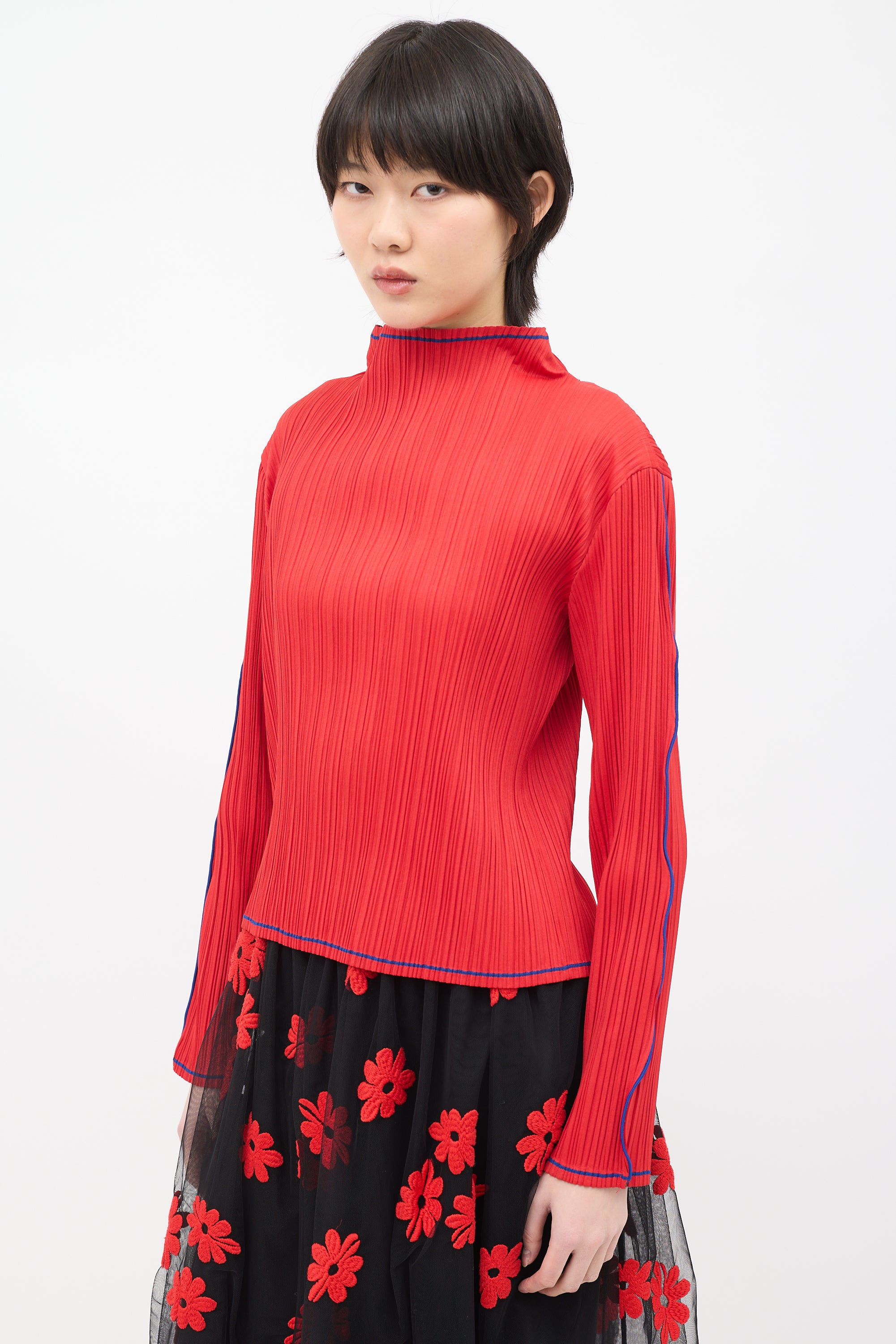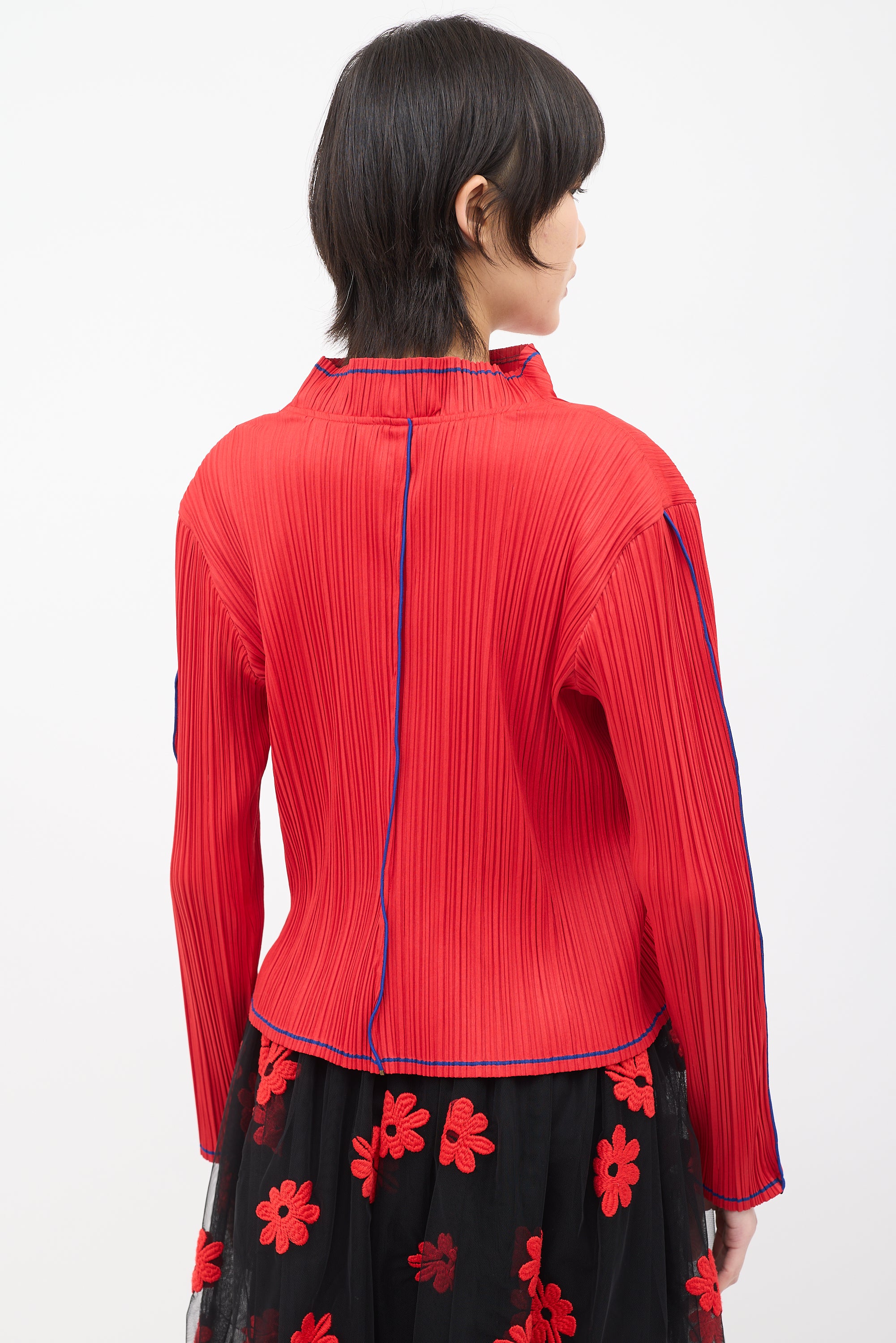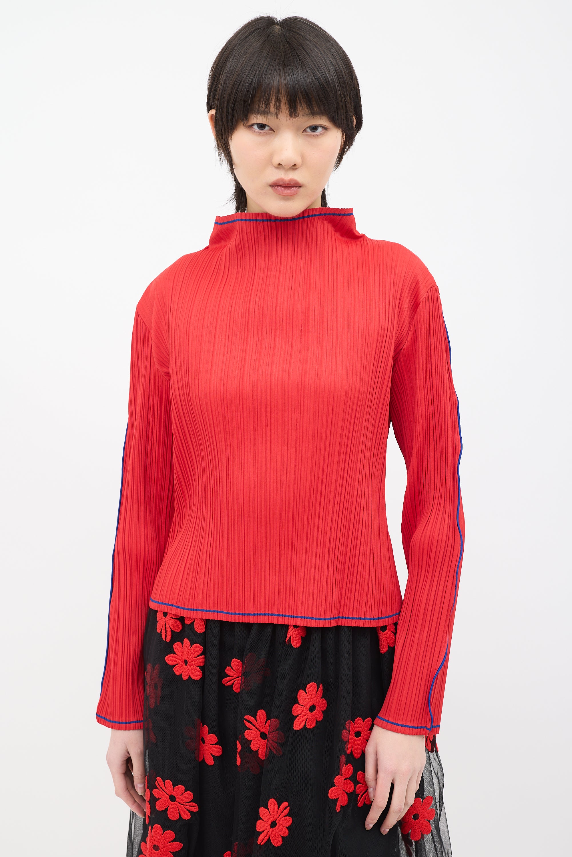 Pre-owned Issey Miyake Fete red pleated top featuring a mock neck, long sleeves, and blue contrast stripes along collar, centre back, hem, sleeves, and cuffs.