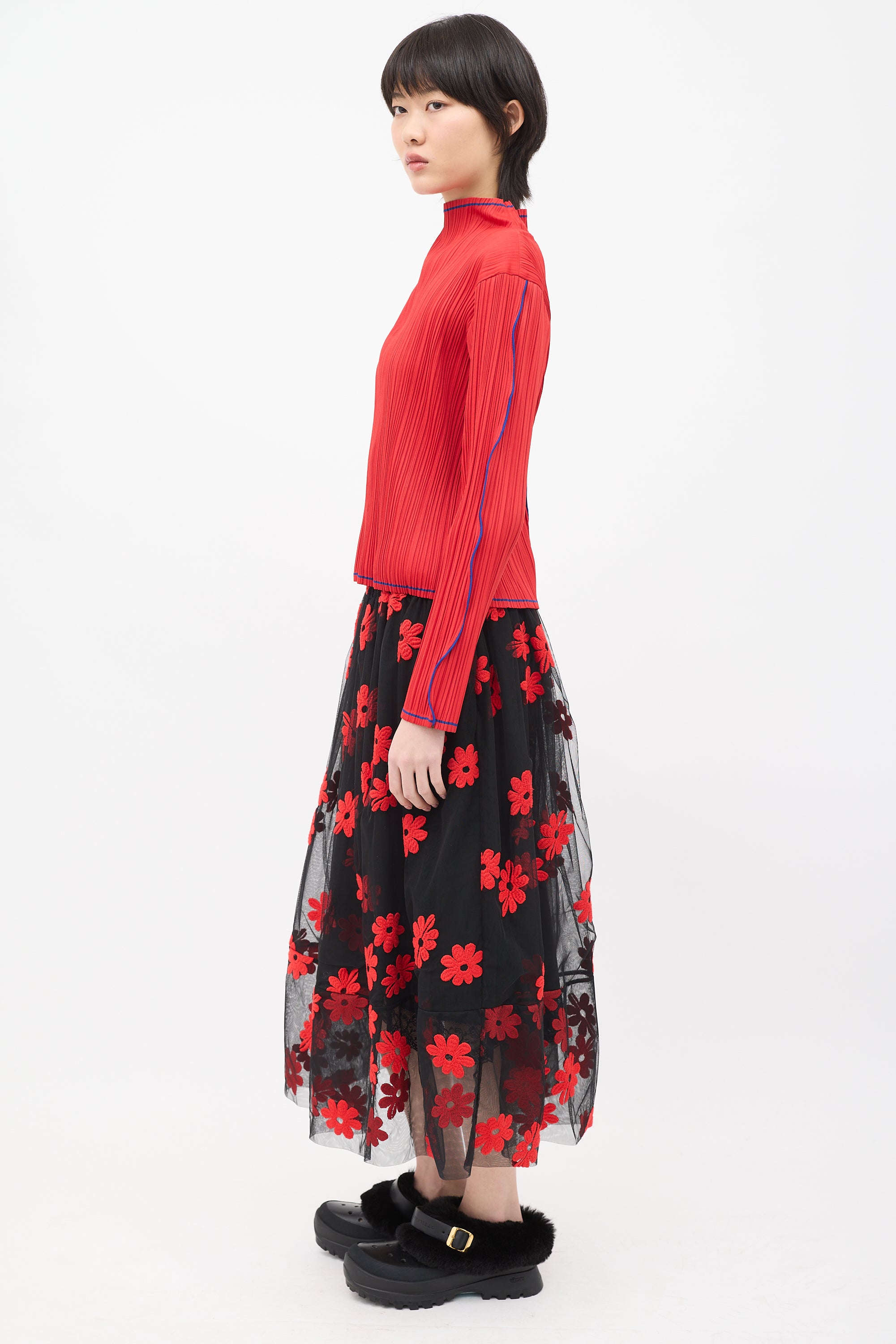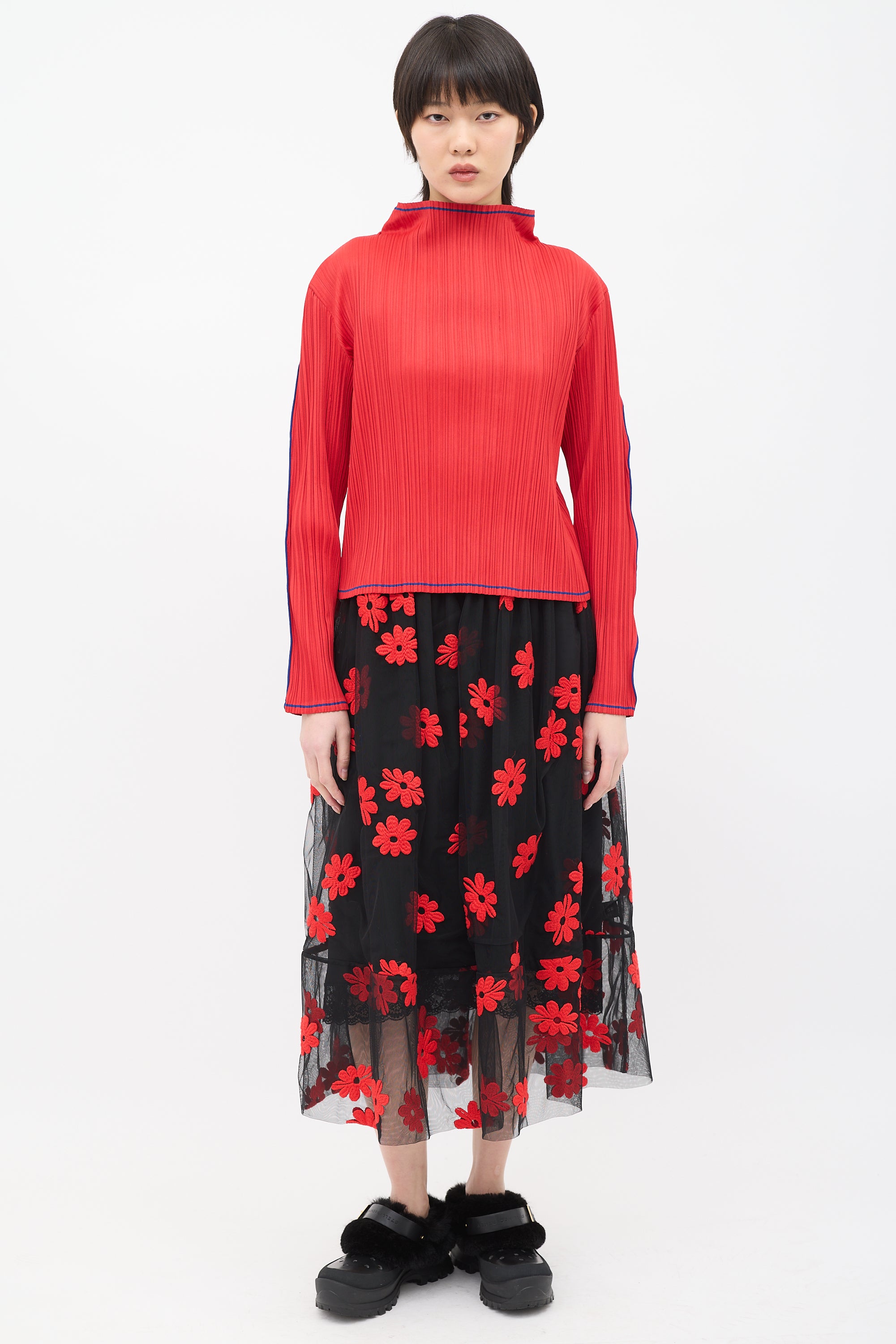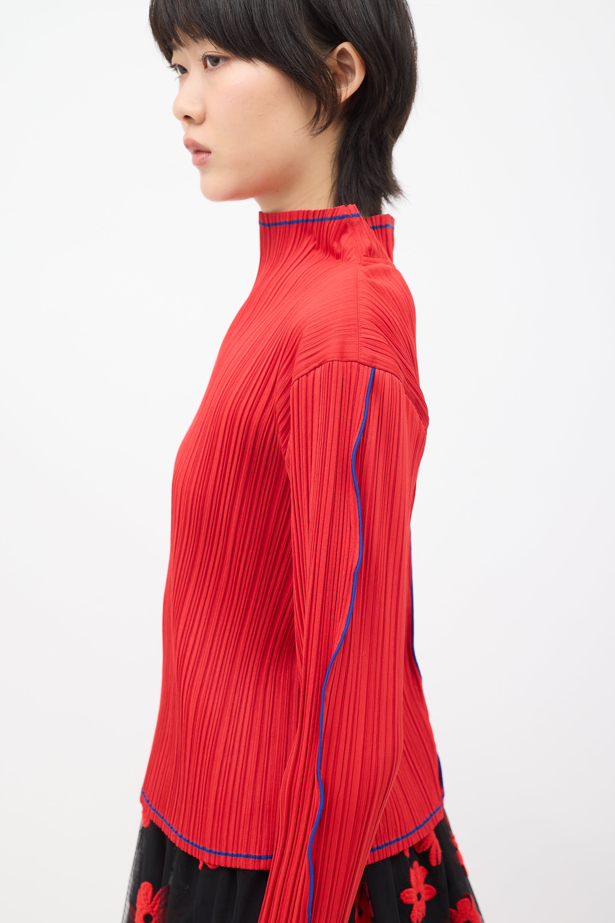 Pre-owned Issey Miyake Fete red pleated top featuring a mock neck, long sleeves, and blue contrast stripes along collar, centre back, hem, sleeves, and cuffs.