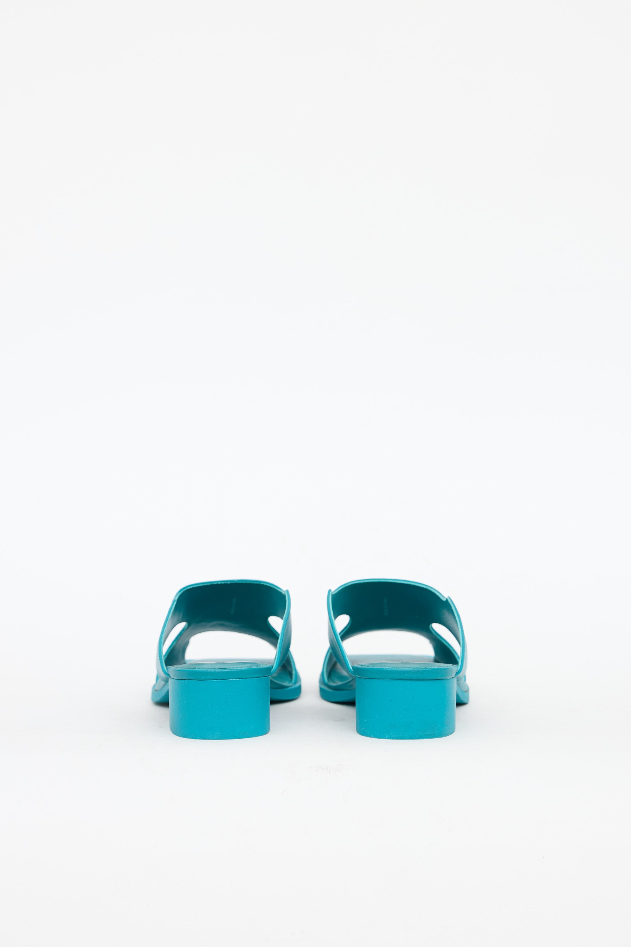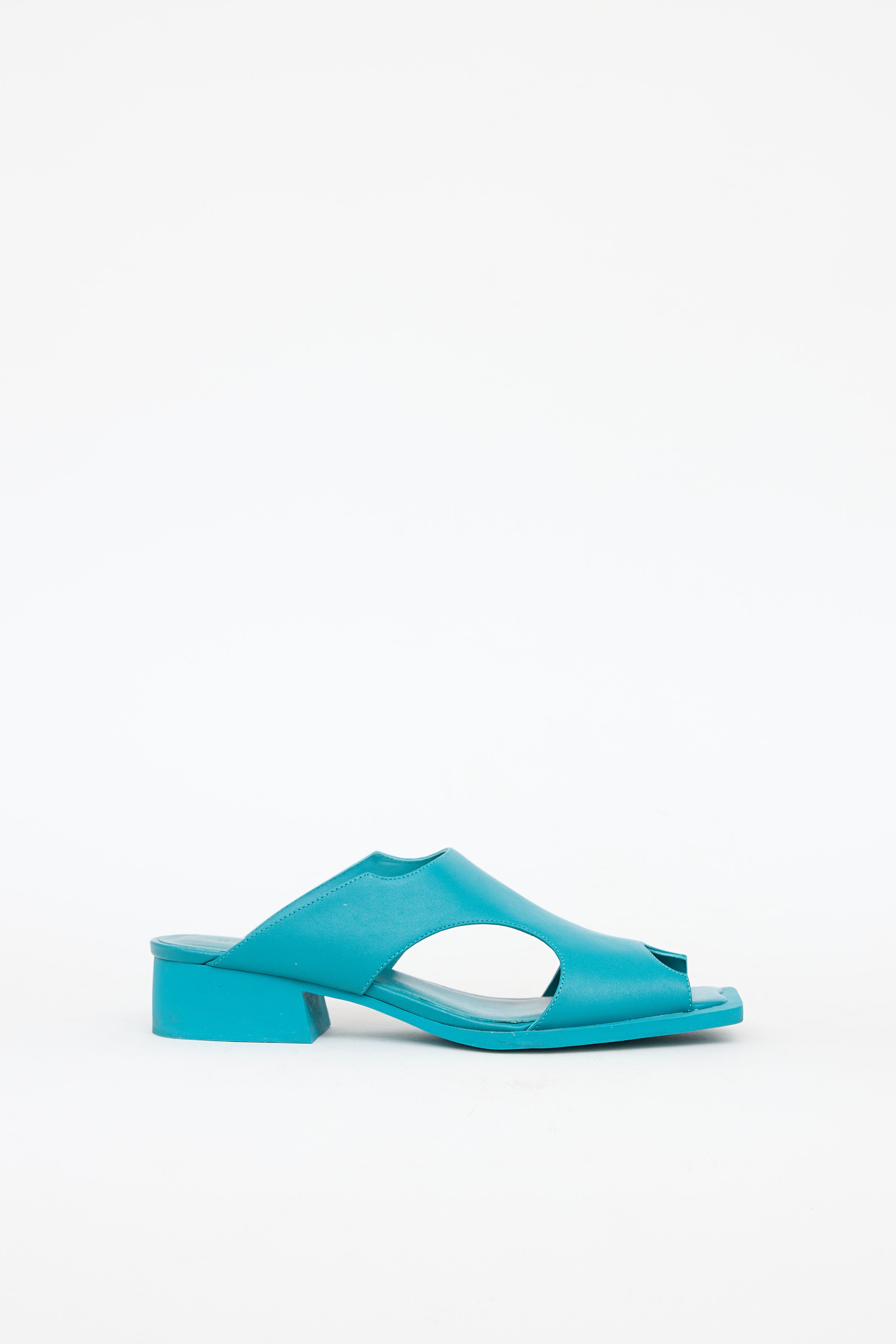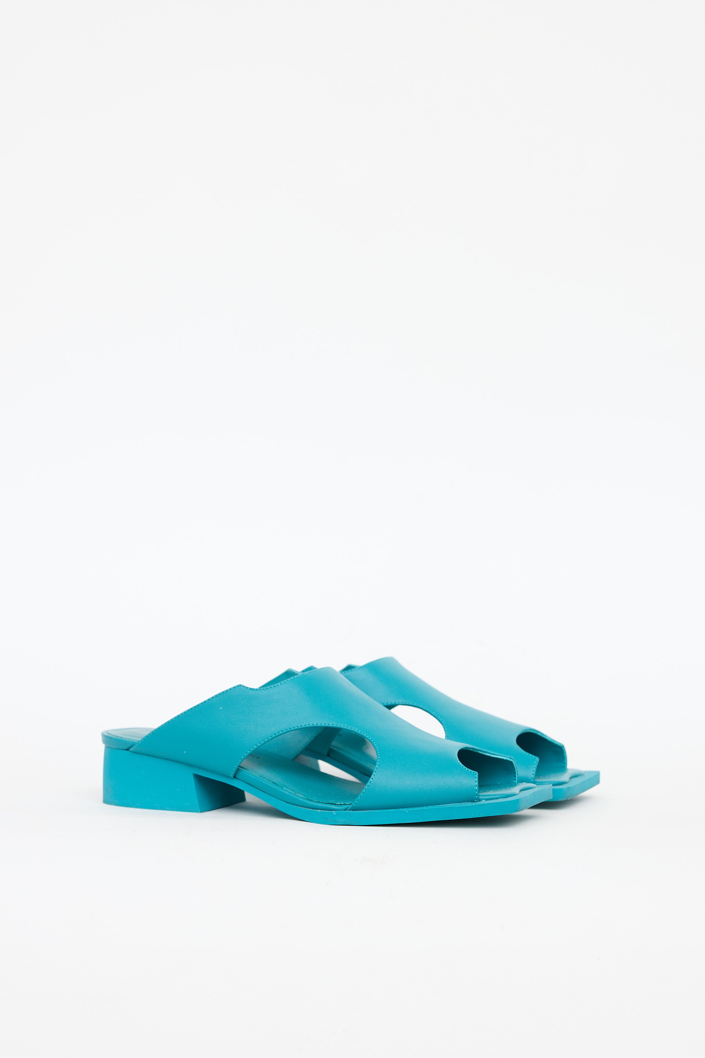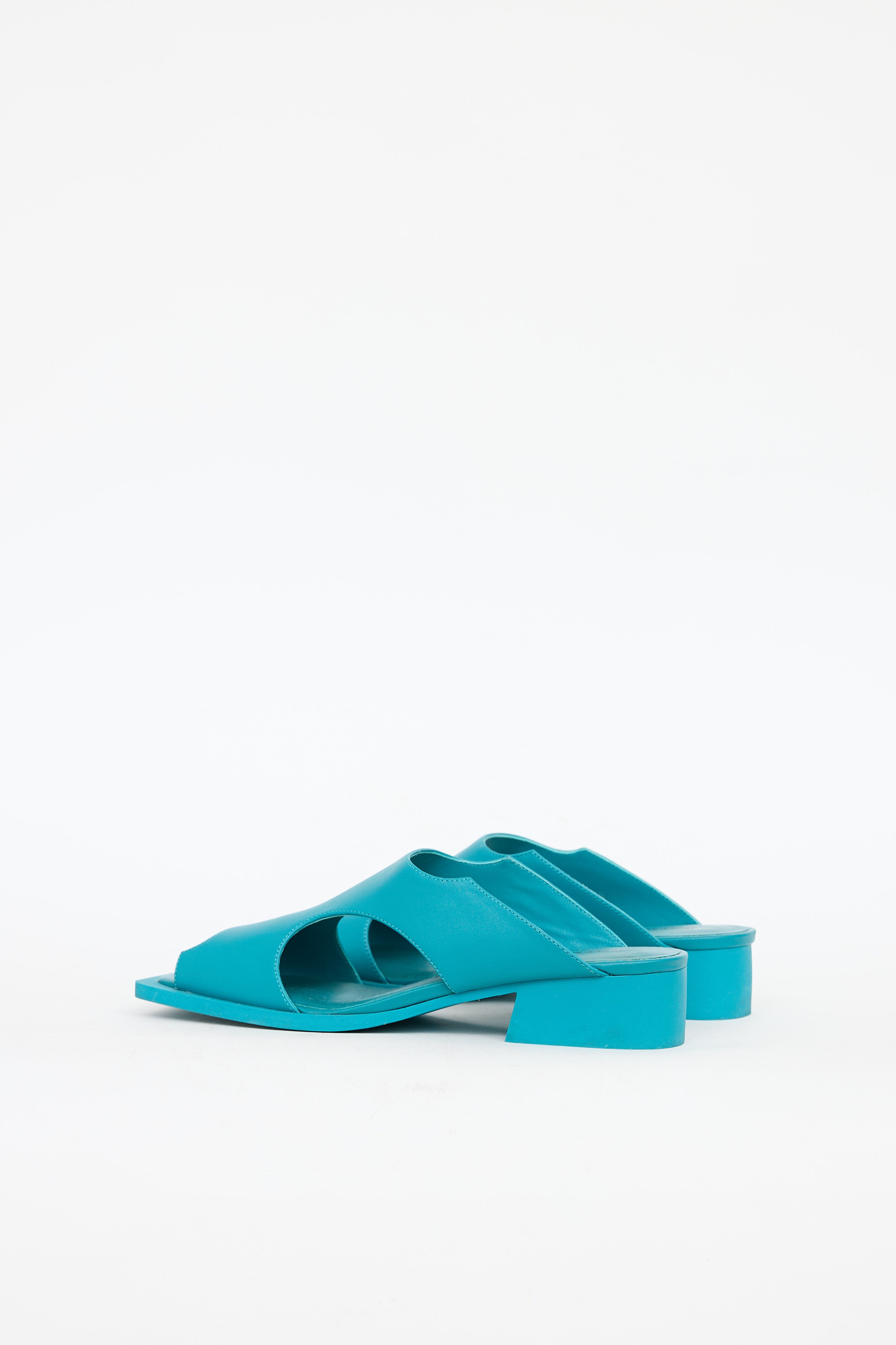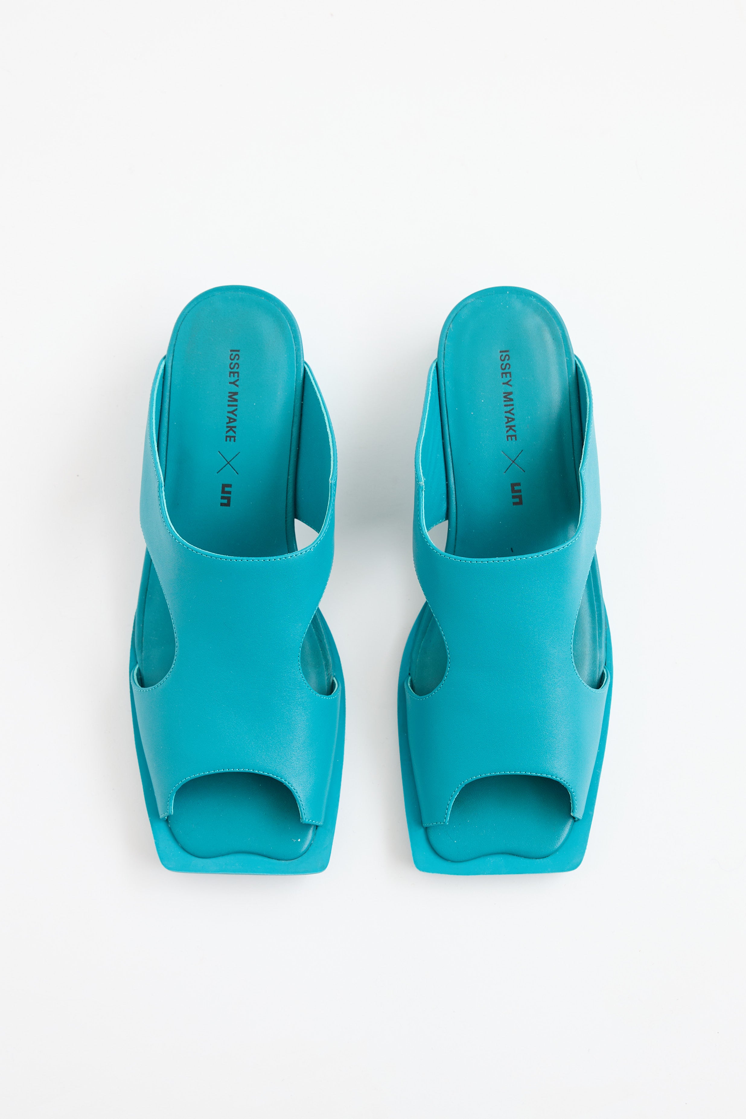 Pre-owned Issey Miyake x UN turquoise blue Fin sandals featuring an open square toe, cut out detailing at upper, and block heel.