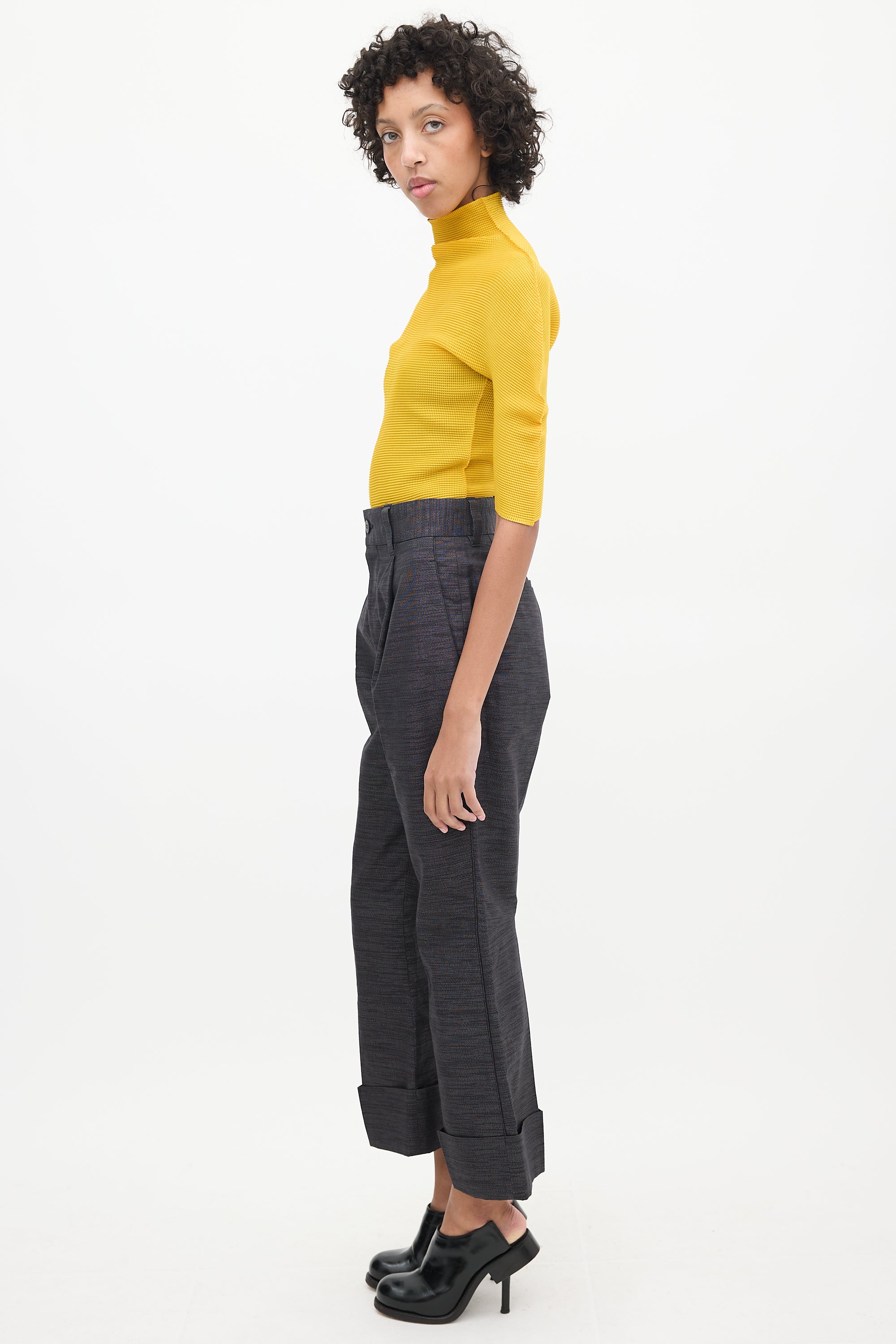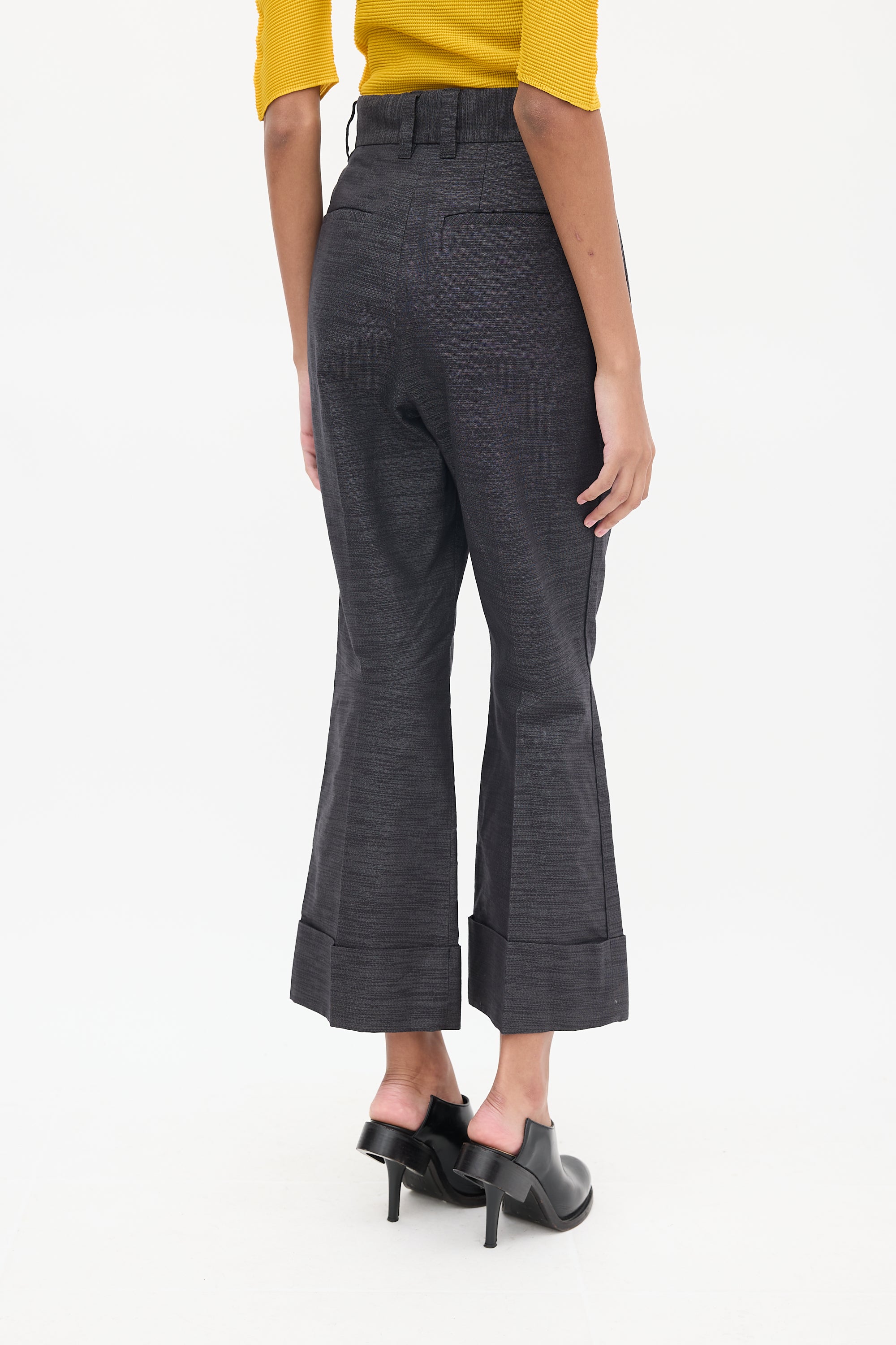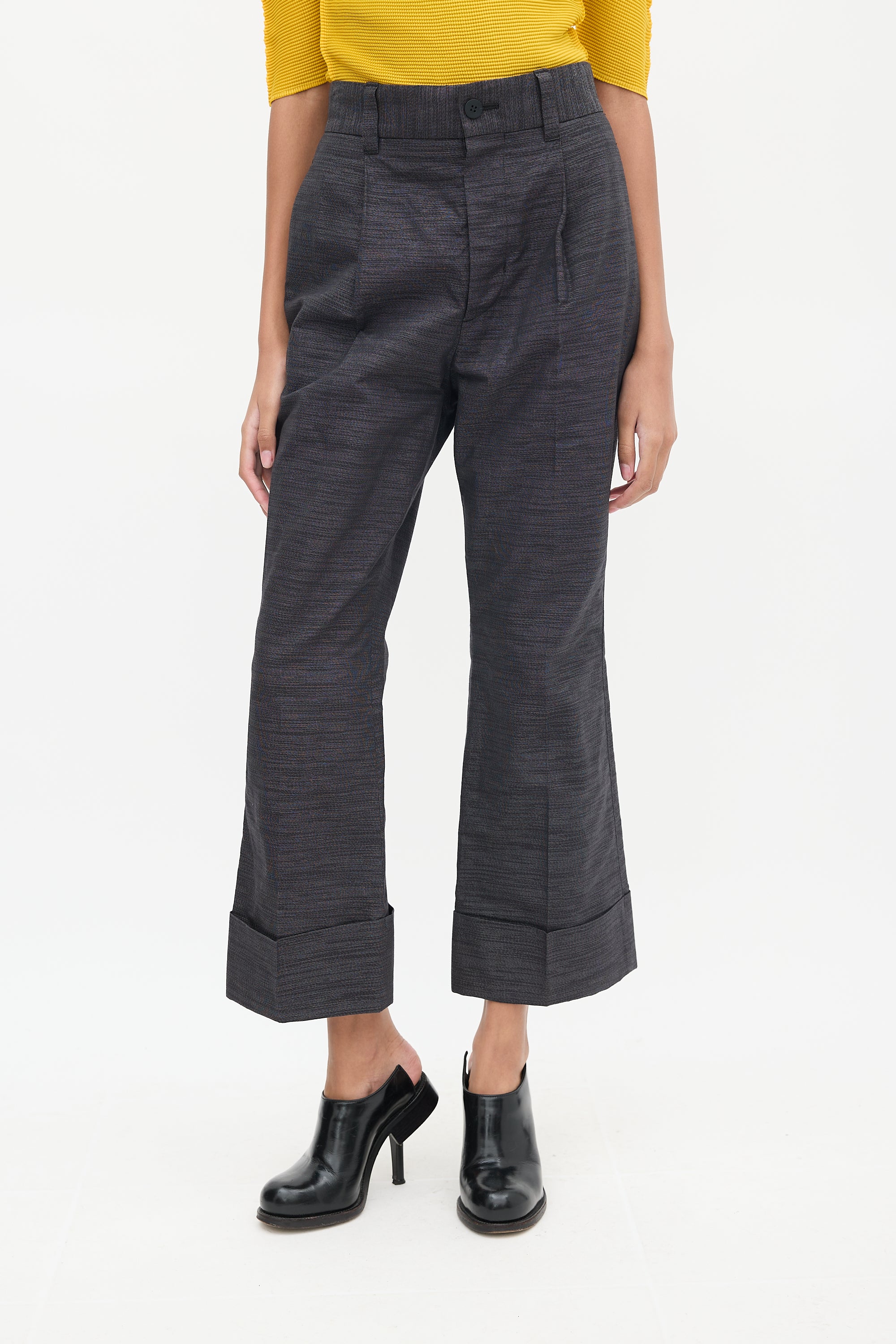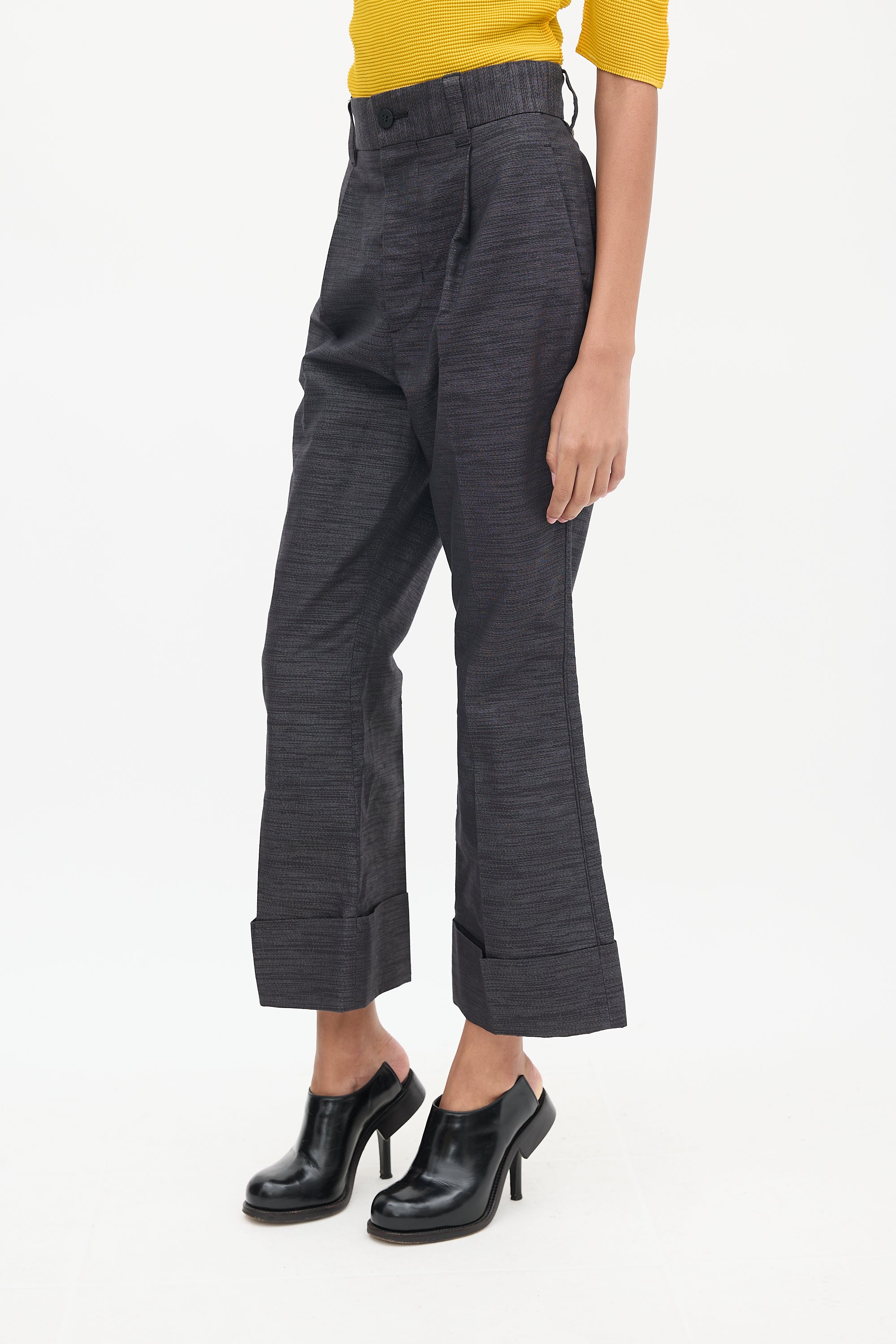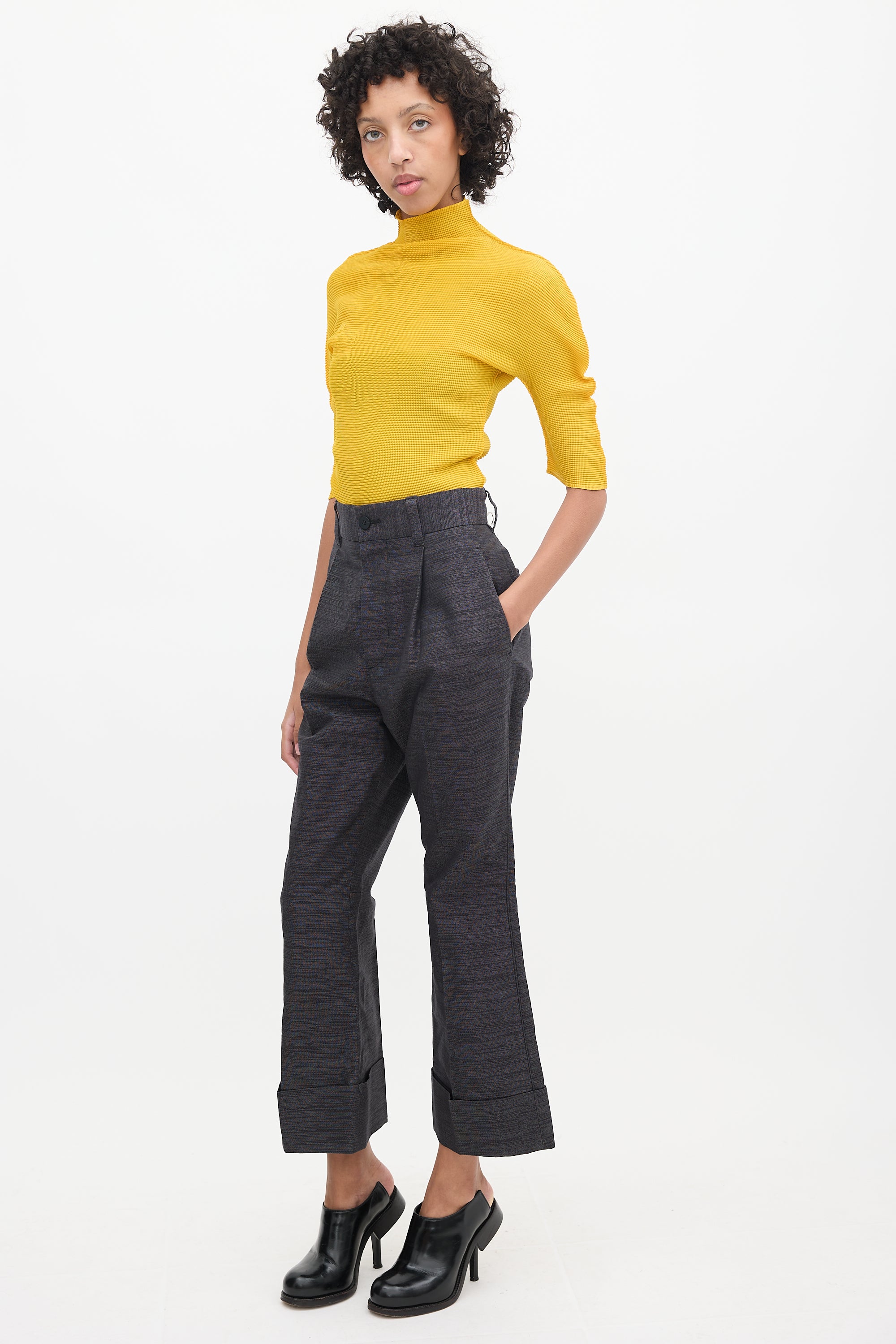 Pre-owned Issey Miyake grey metallic trousers featuring two slip pockets at hip, two welt pockets at back, centre pleat, cuffed hem, and zip fly with button closure.