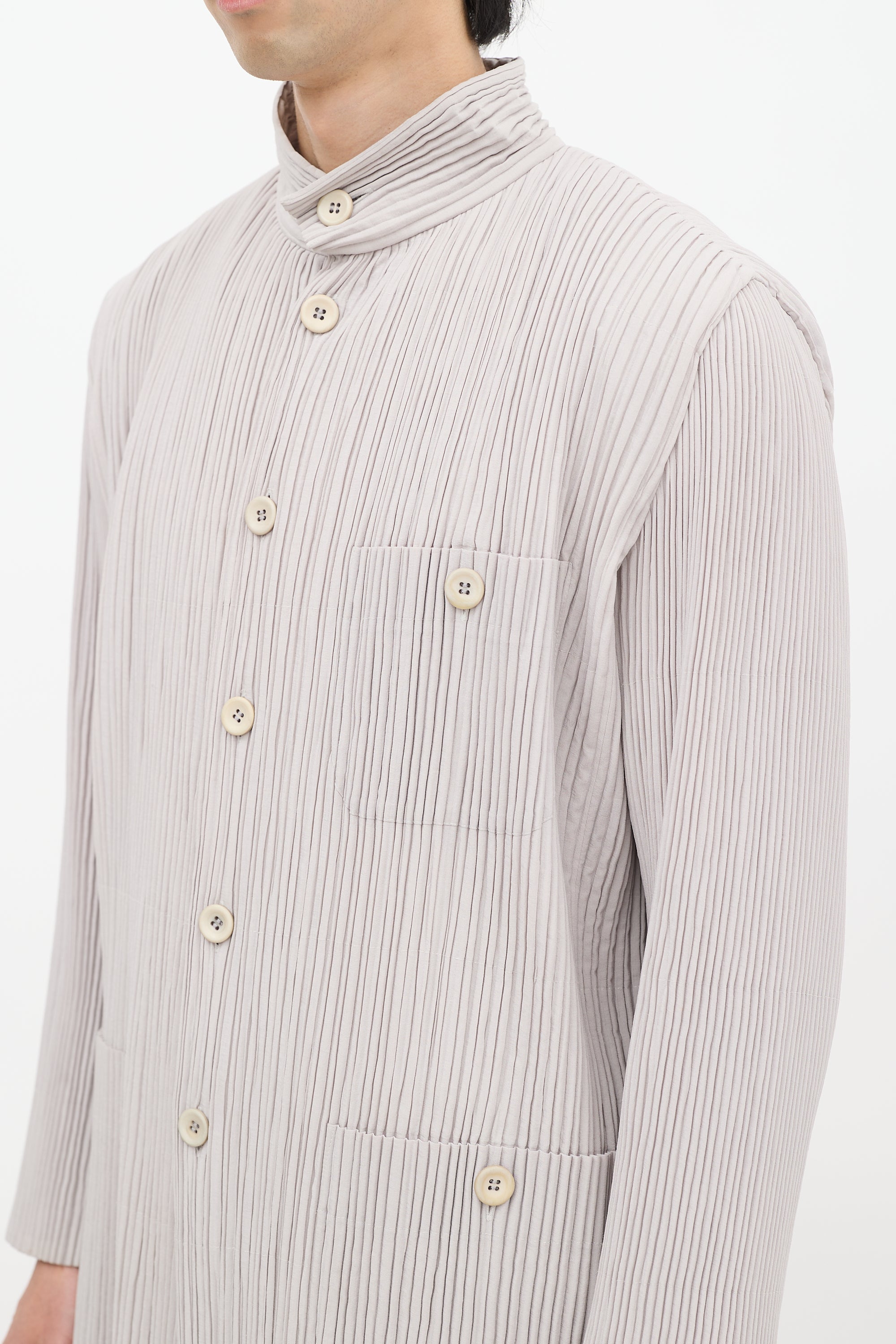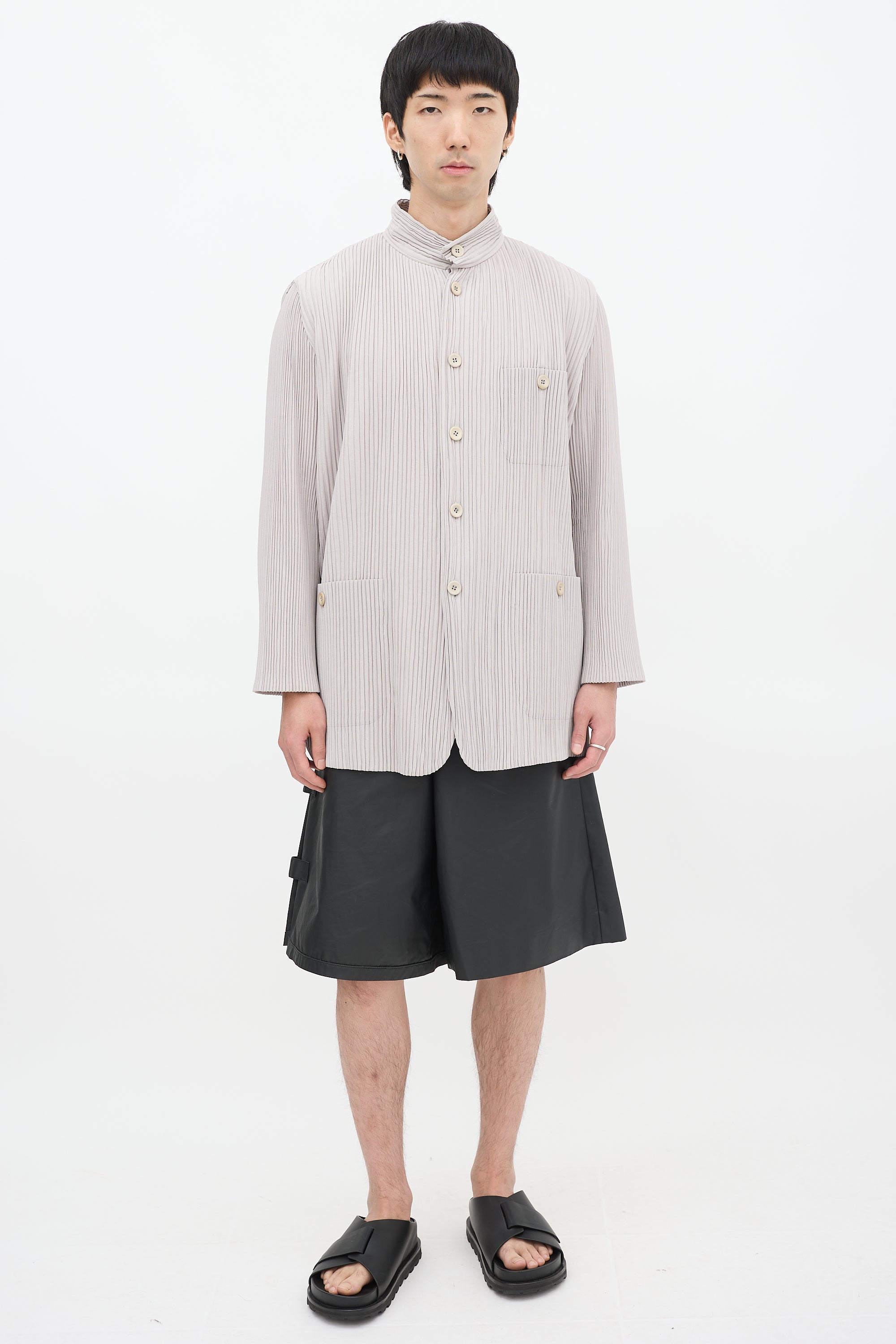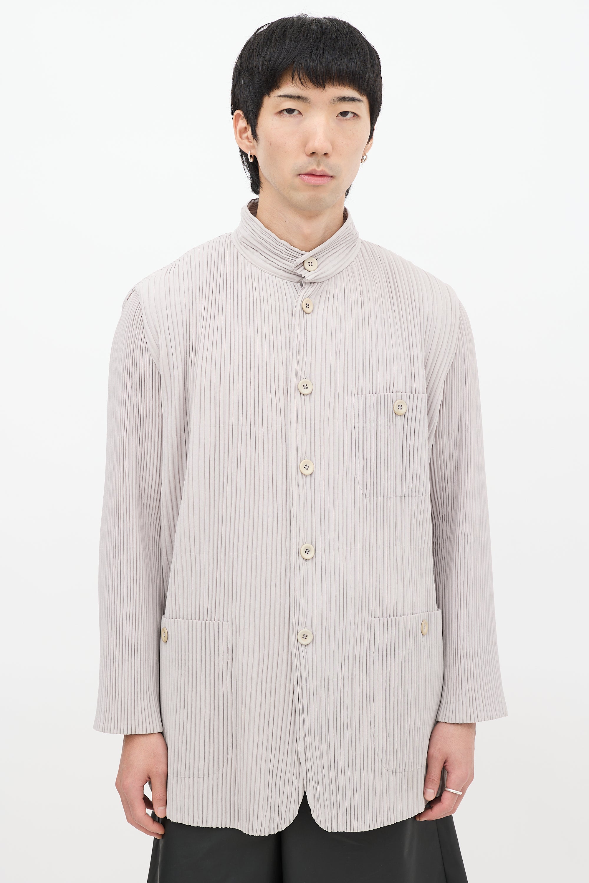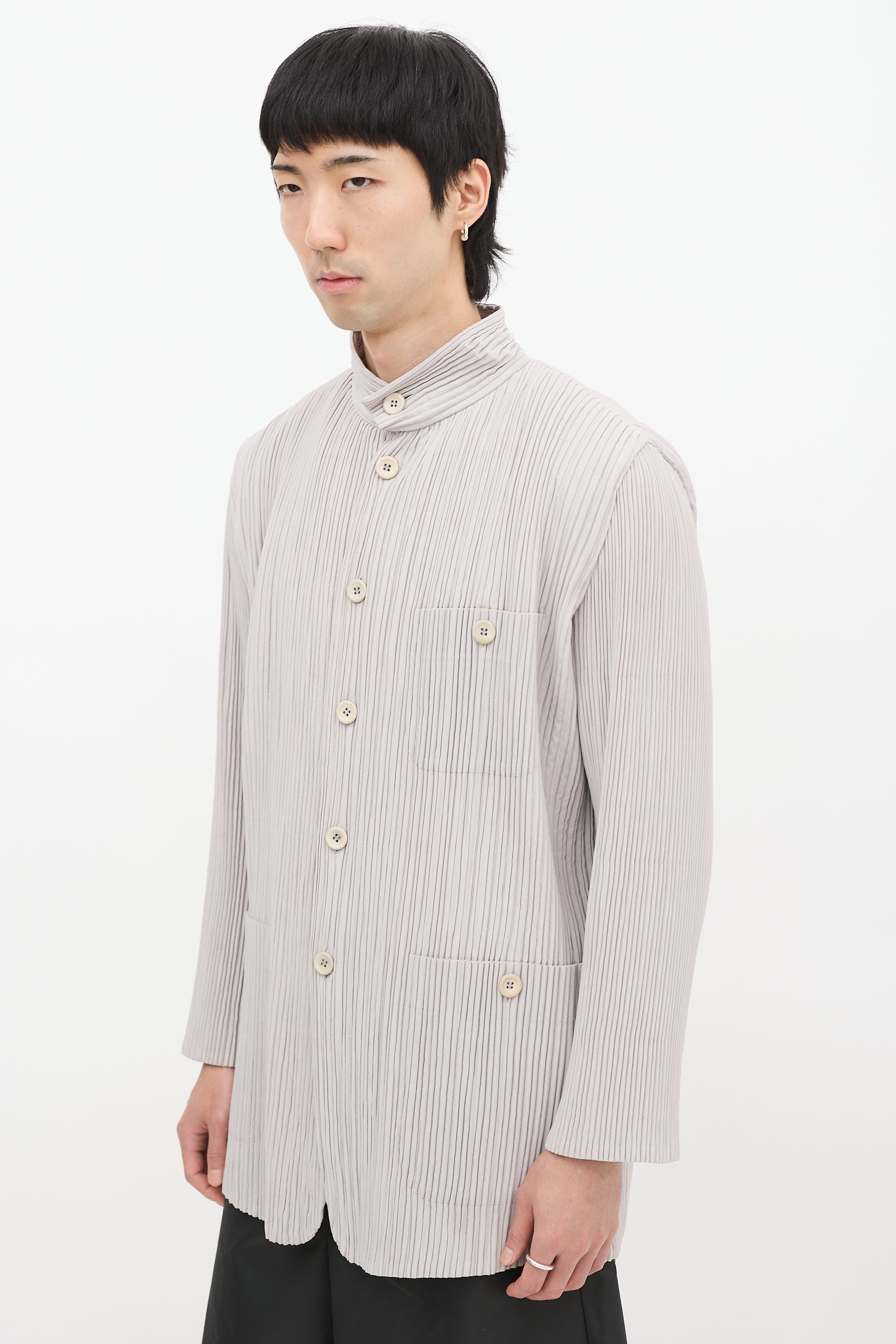 Pre-owned Issey Miyake grey pleated jacket featuring convertible stand collar, button up front, three front buttoned patch pockets, even hem, long sleeves, and padding throughout.