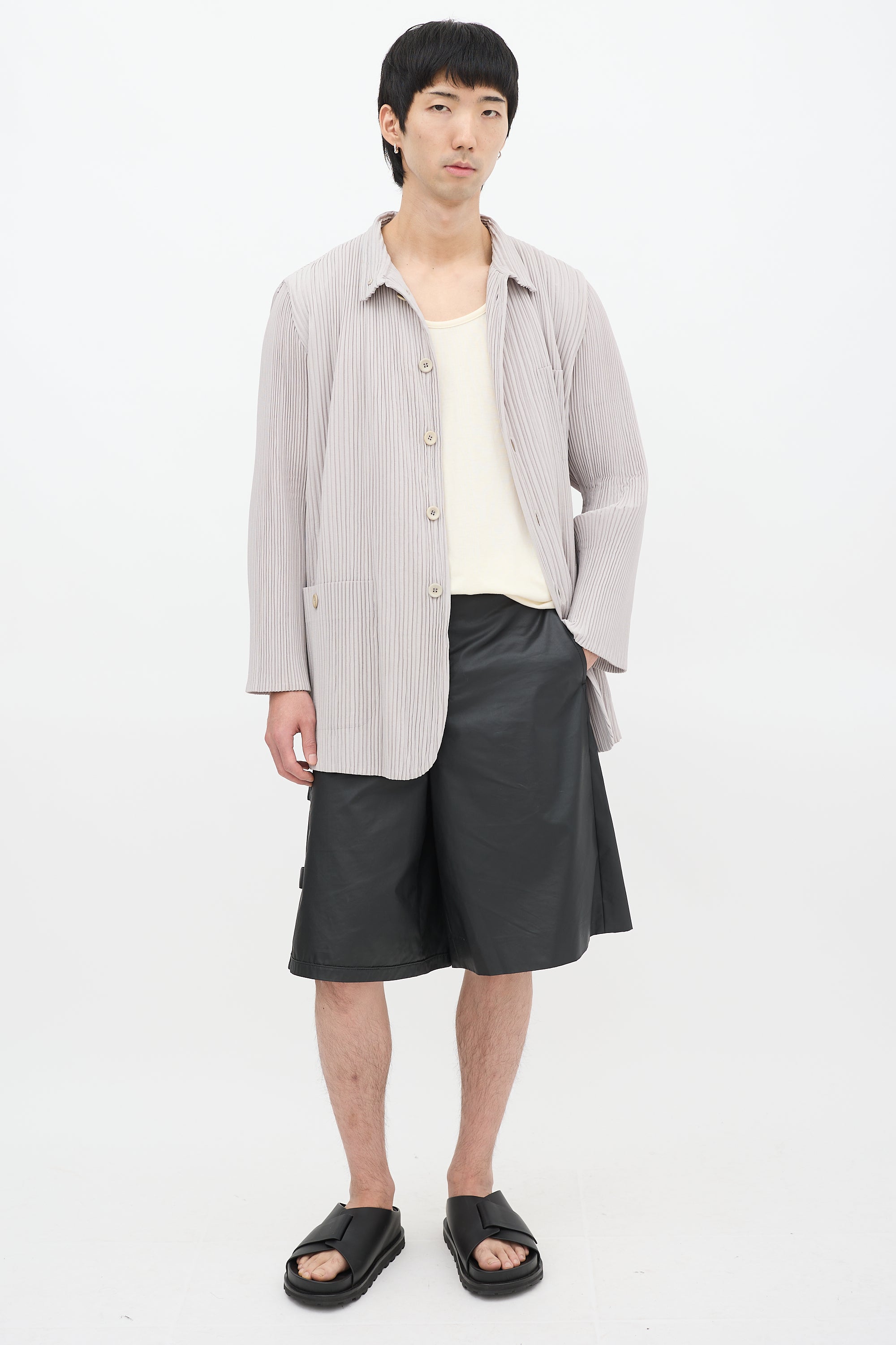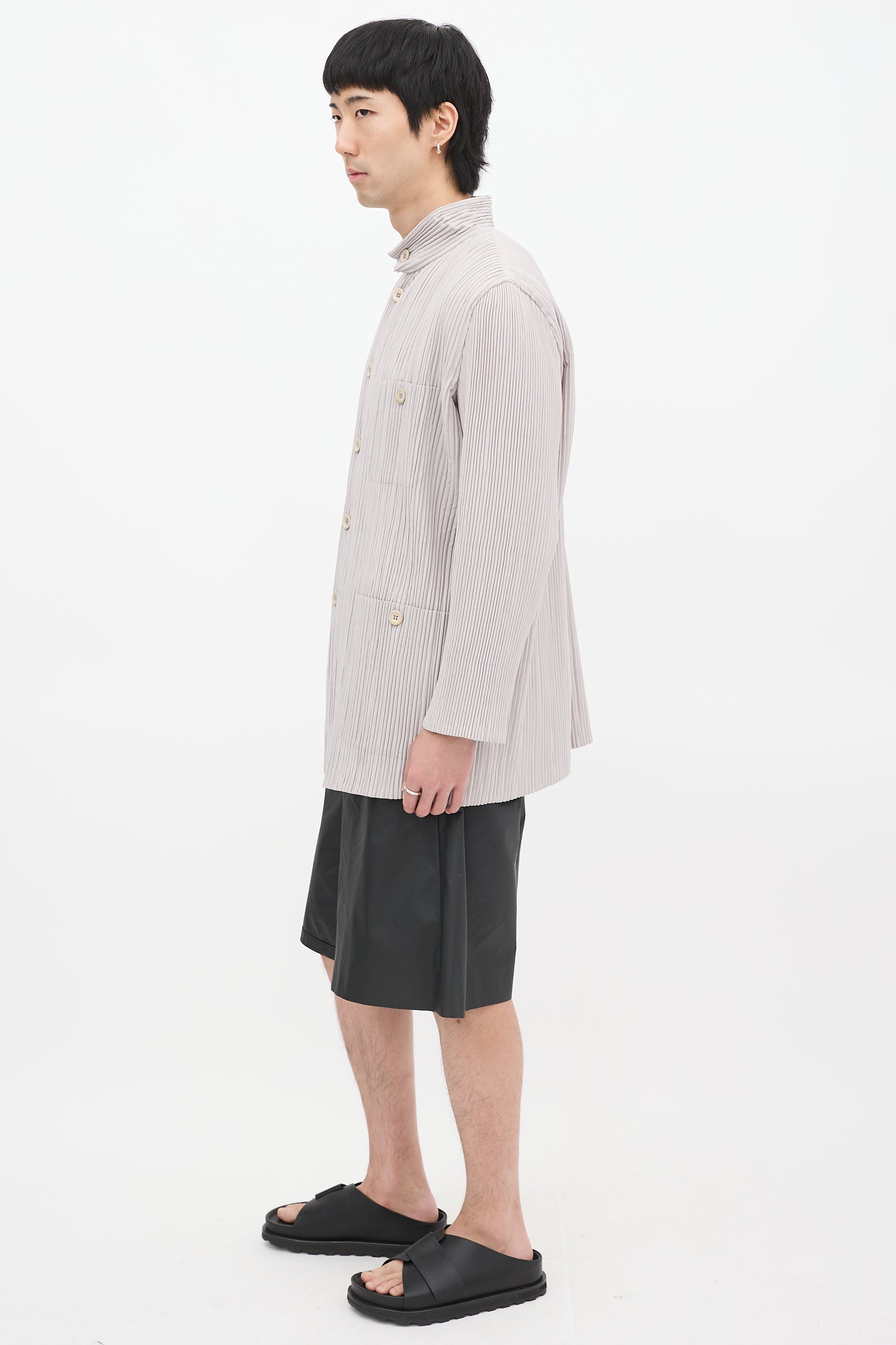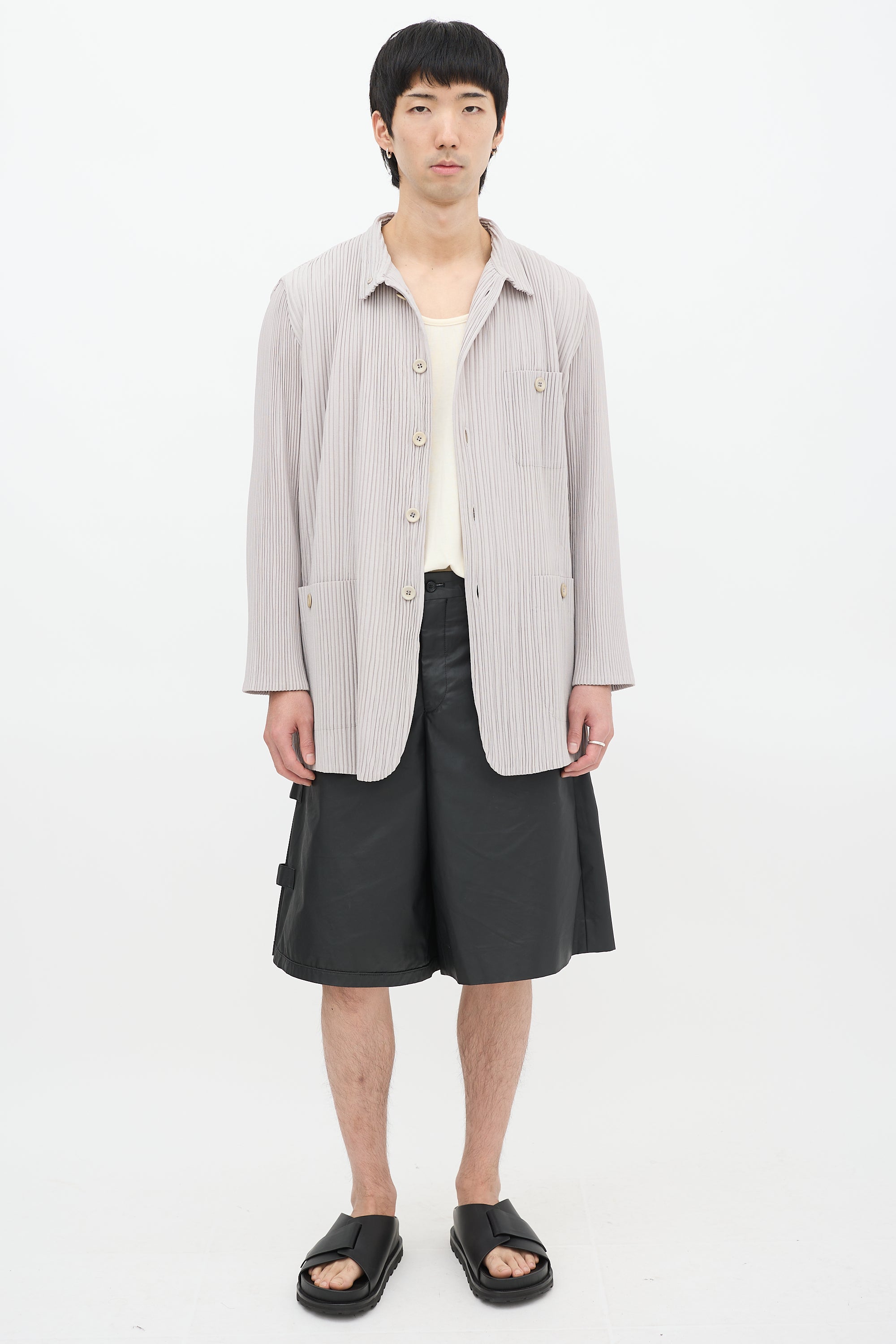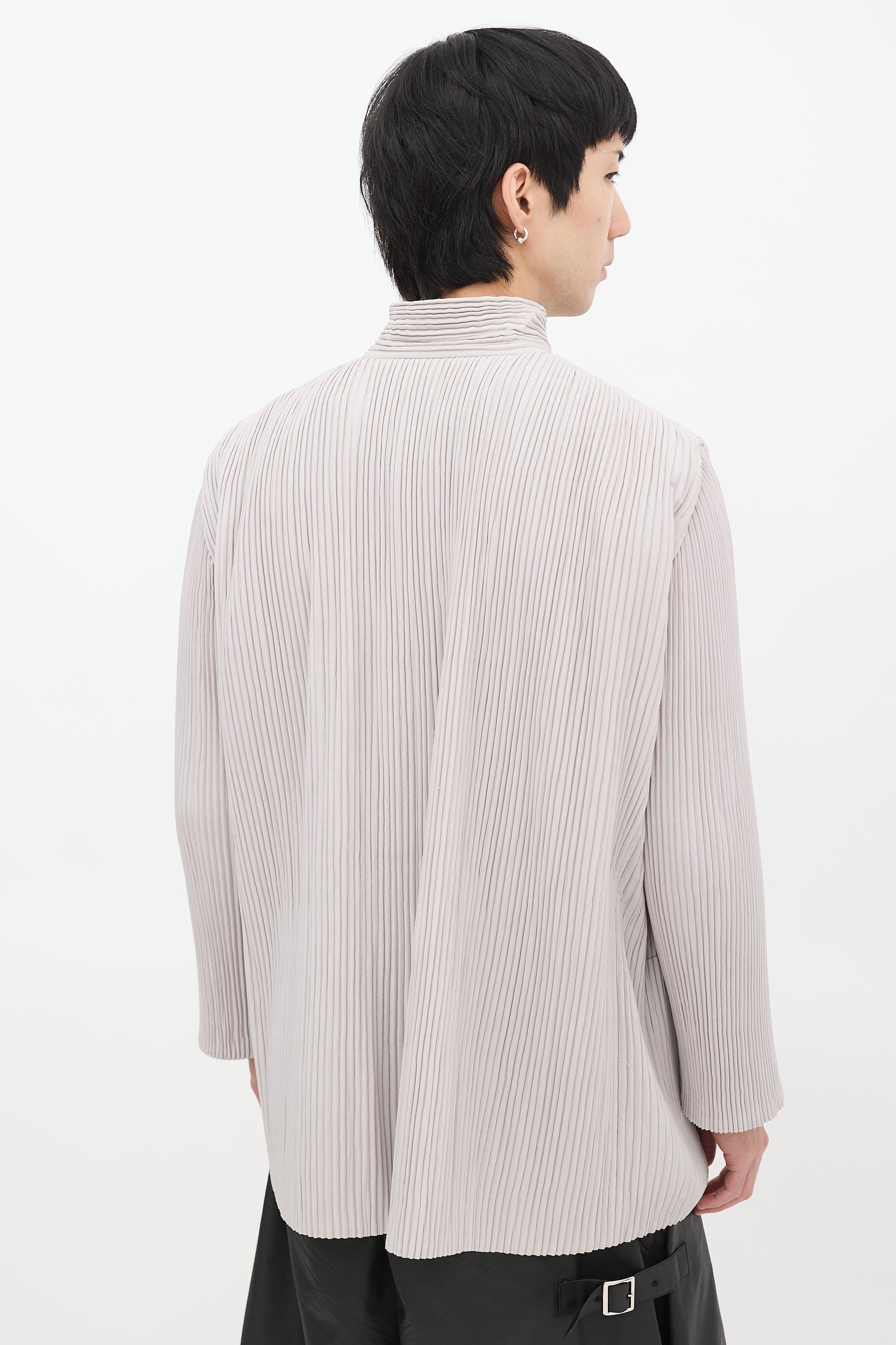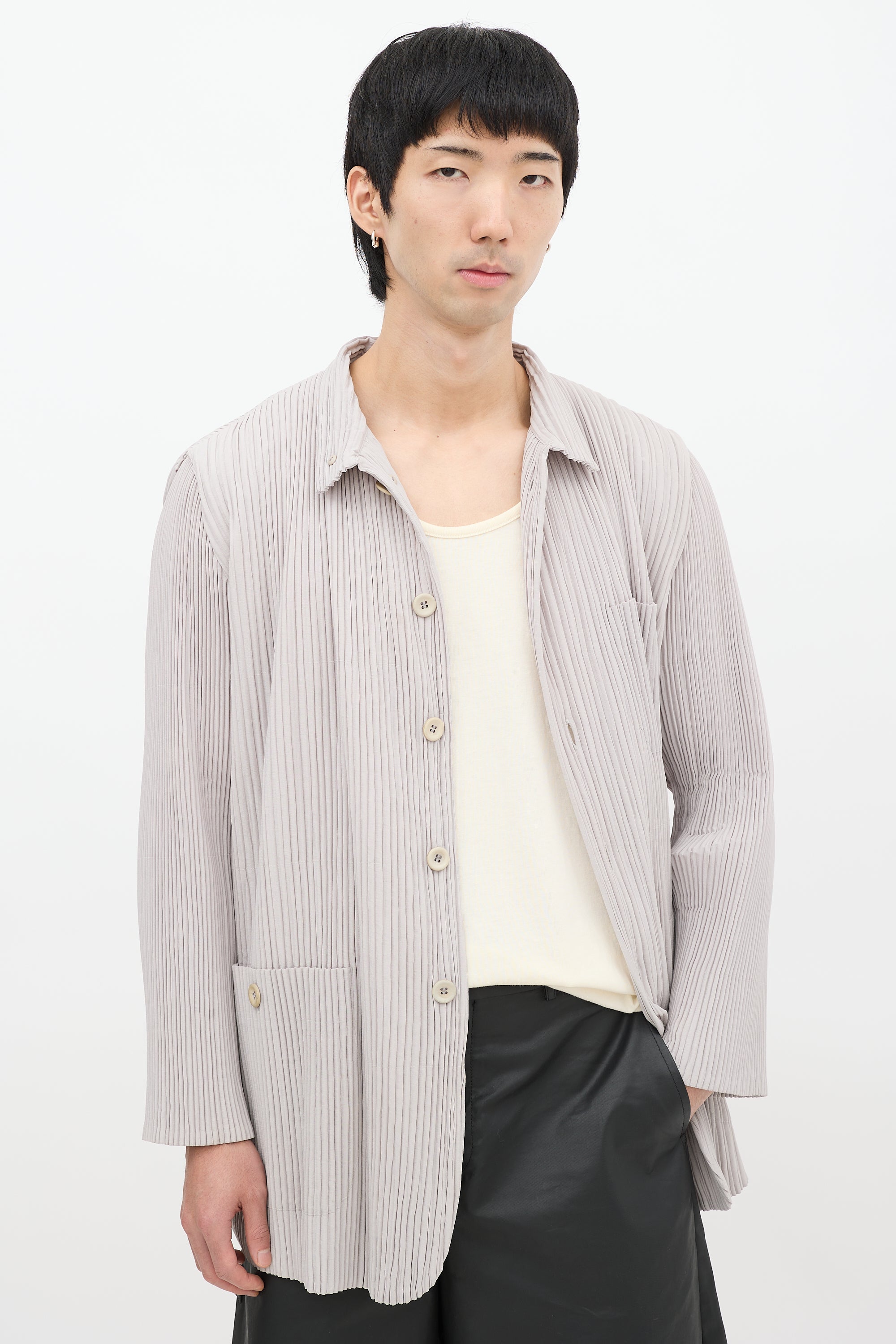 Pre-owned Issey Miyake grey pleated jacket featuring convertible stand collar, button up front, three front buttoned patch pockets, even hem, long sleeves, and padding throughout.