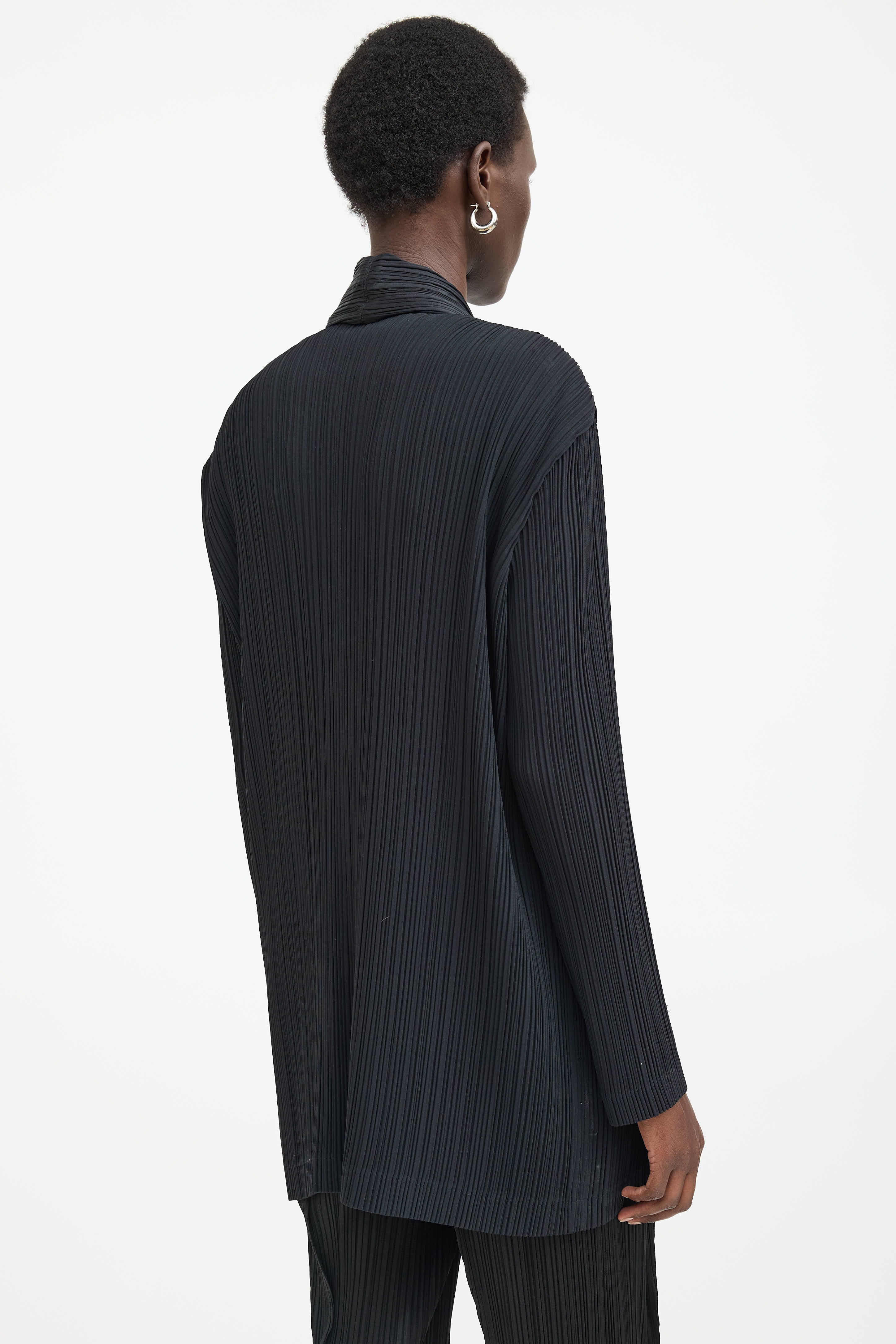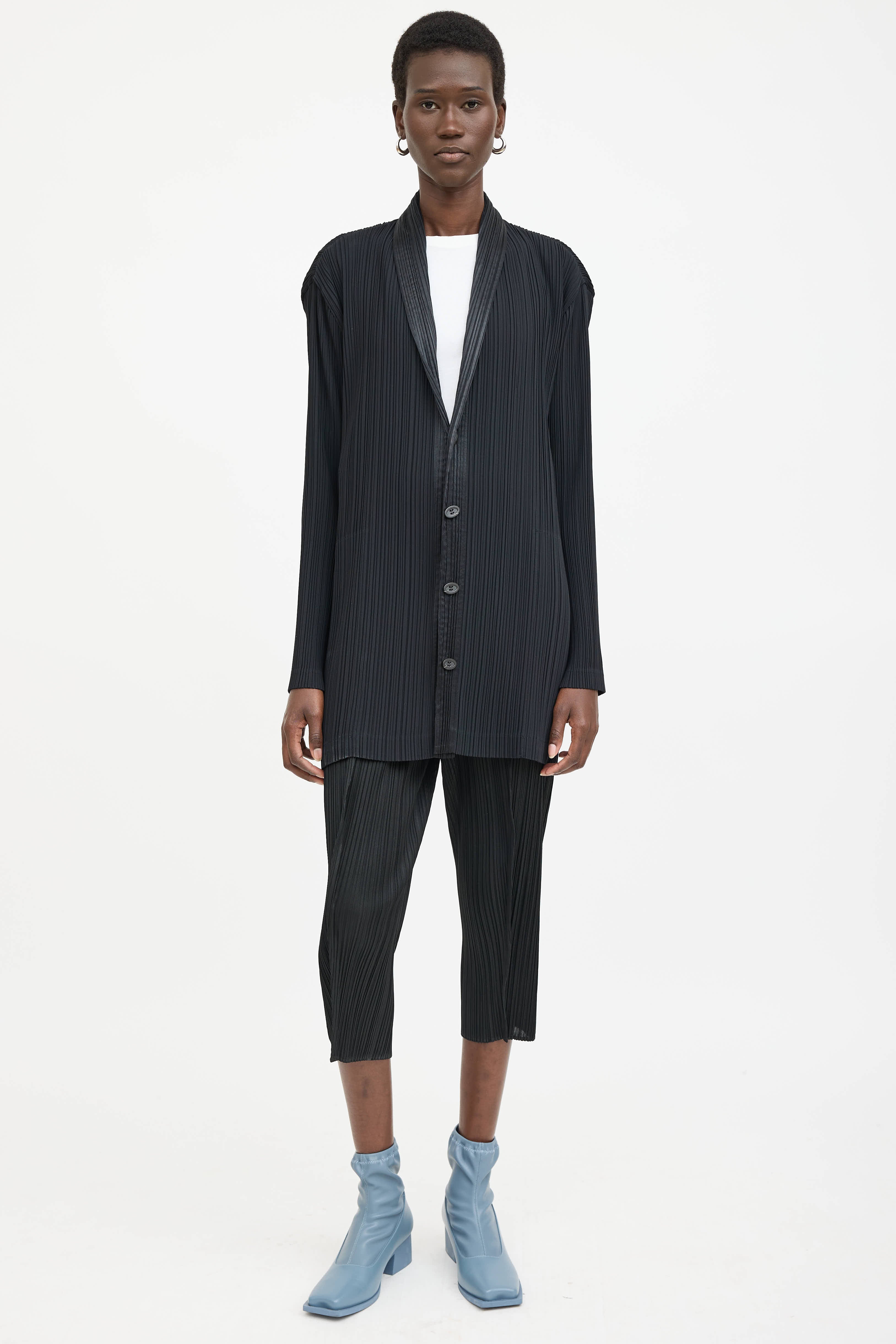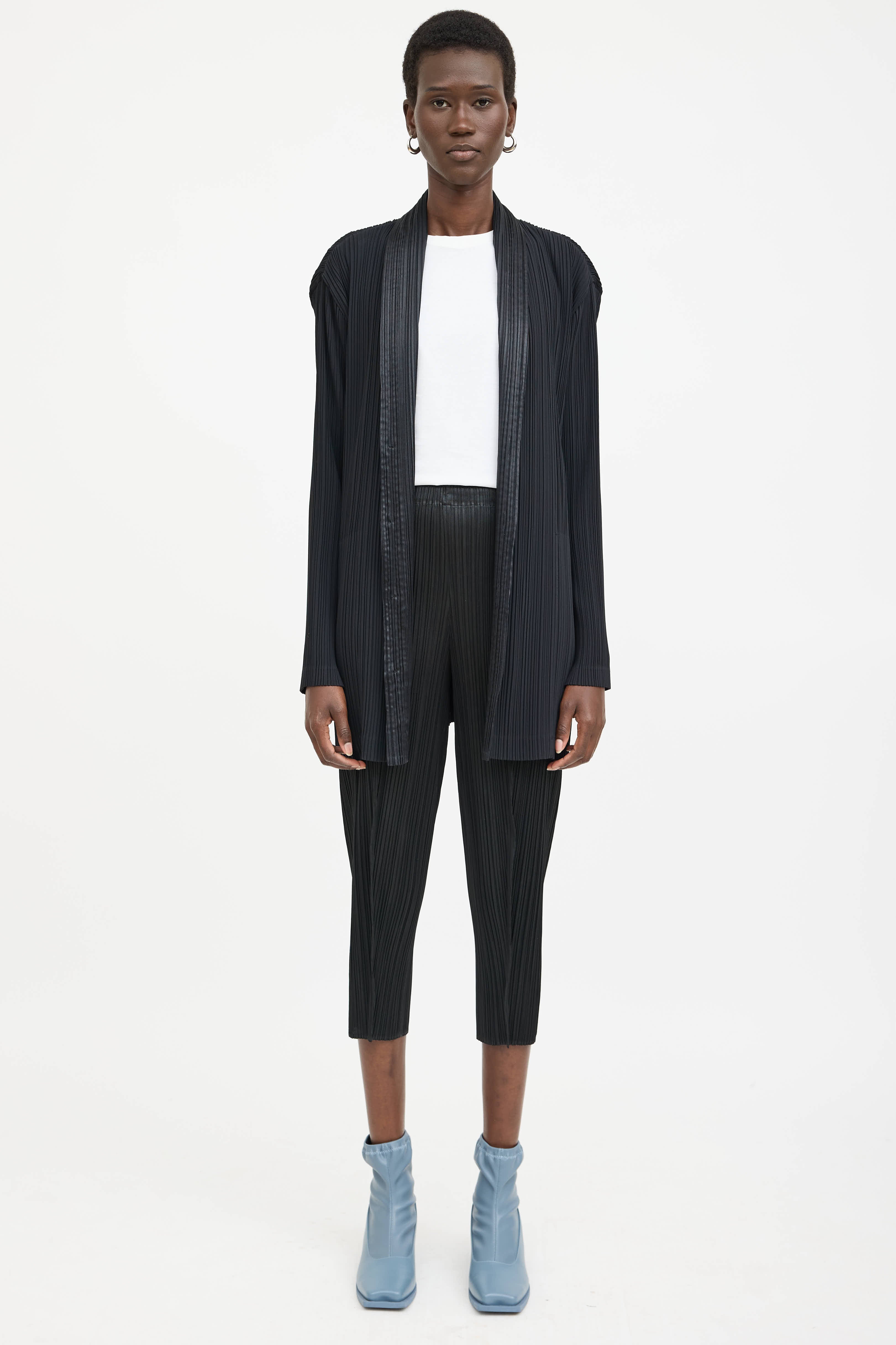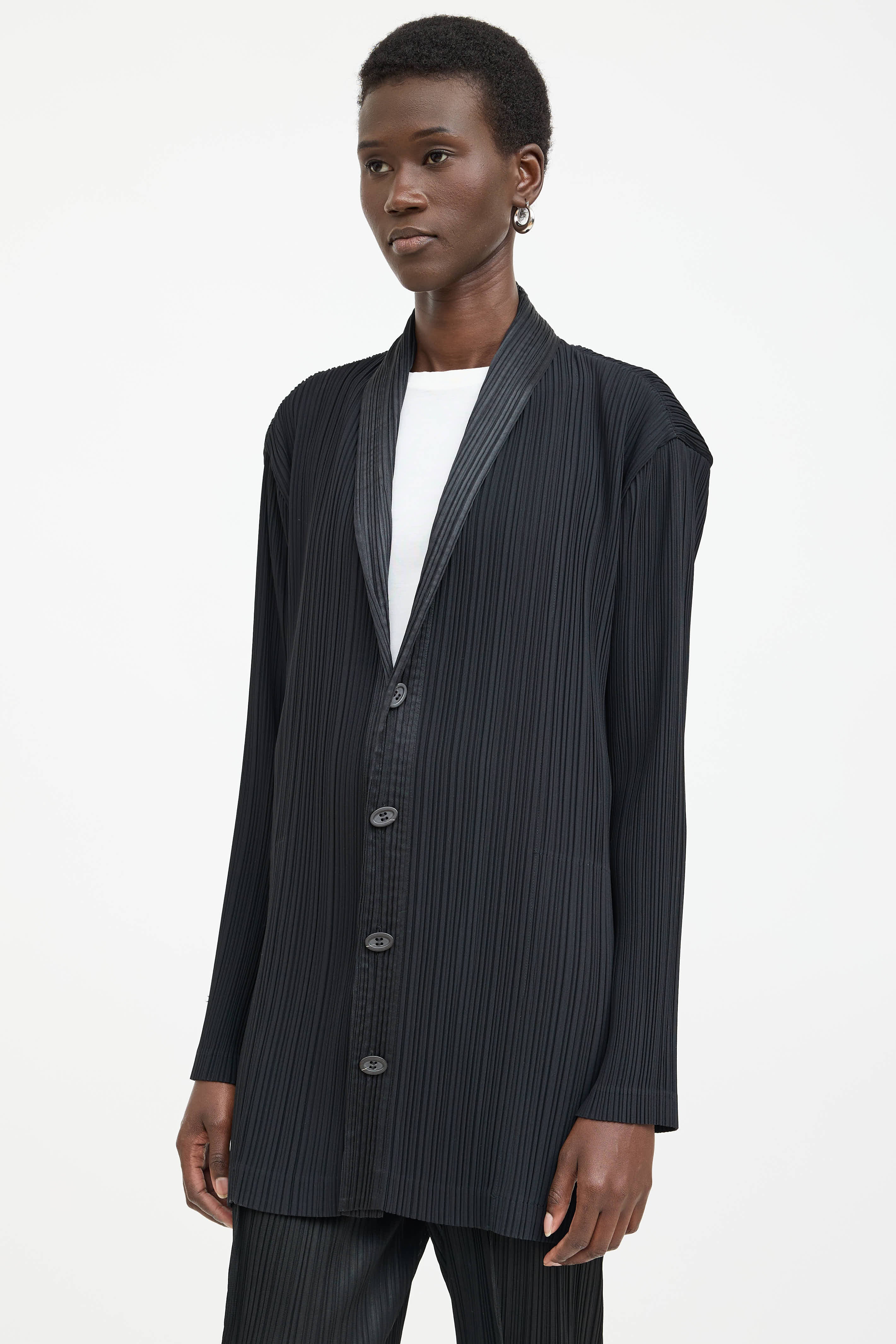 Pre-owned Issey Miyake black cardigan featuring pleated detailing, shawl collar, long sleeves, and button up closure.