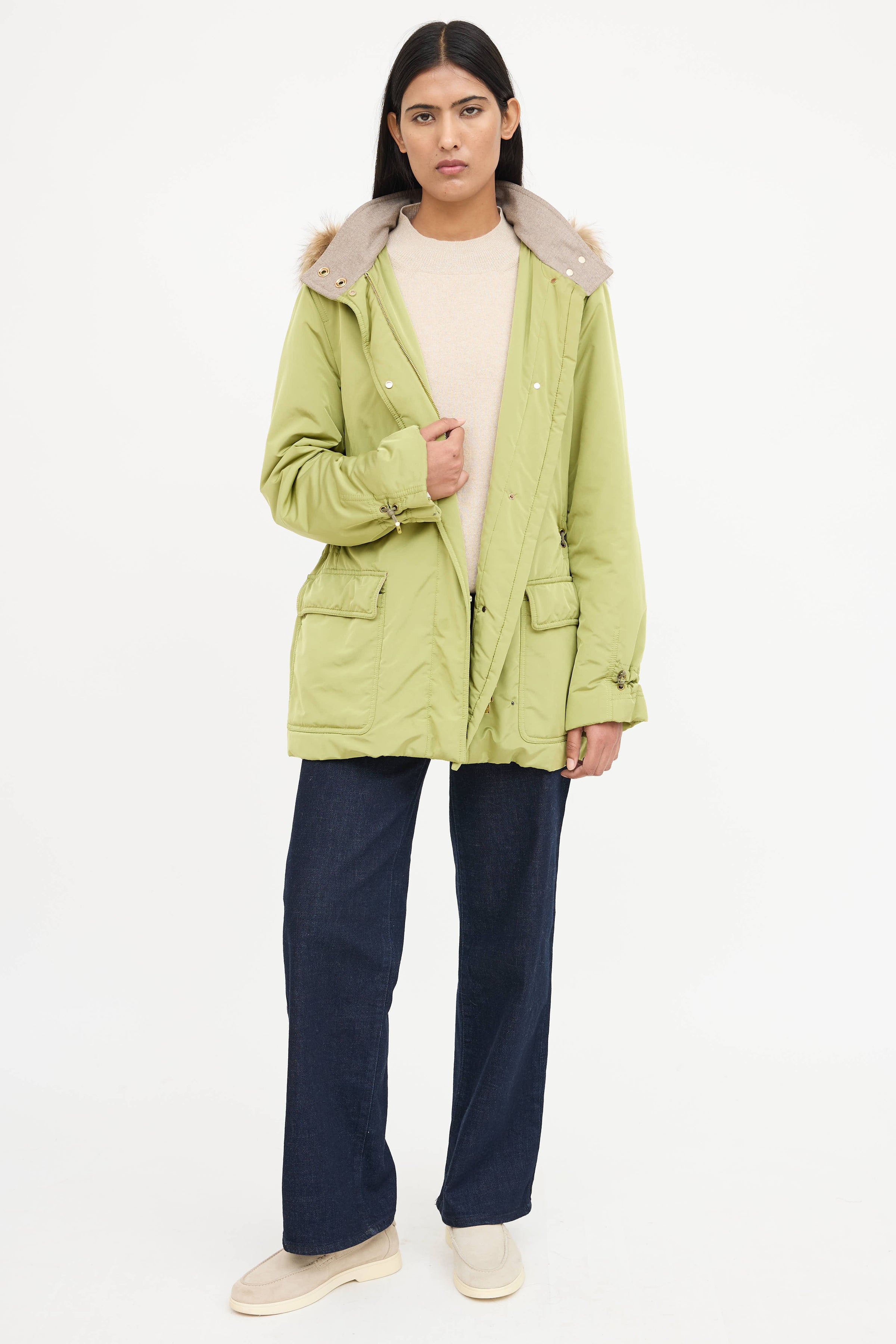 Pre-owned Loro Piana green long sleeve jacket featuring detachable hood with faux fur trim, stand collar, double zip up front, and cinched drawstring waist and cuffs with toggle. Lined.