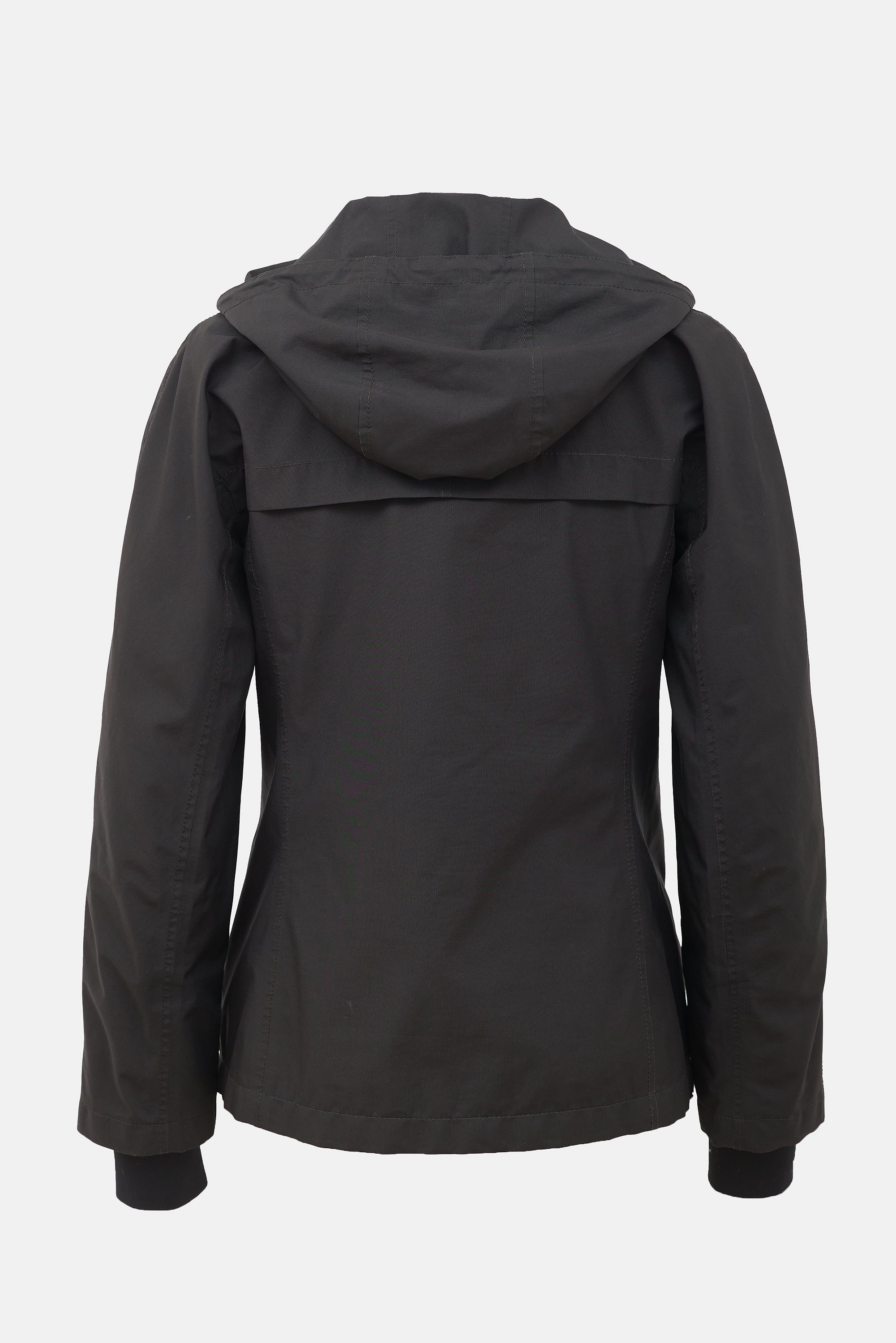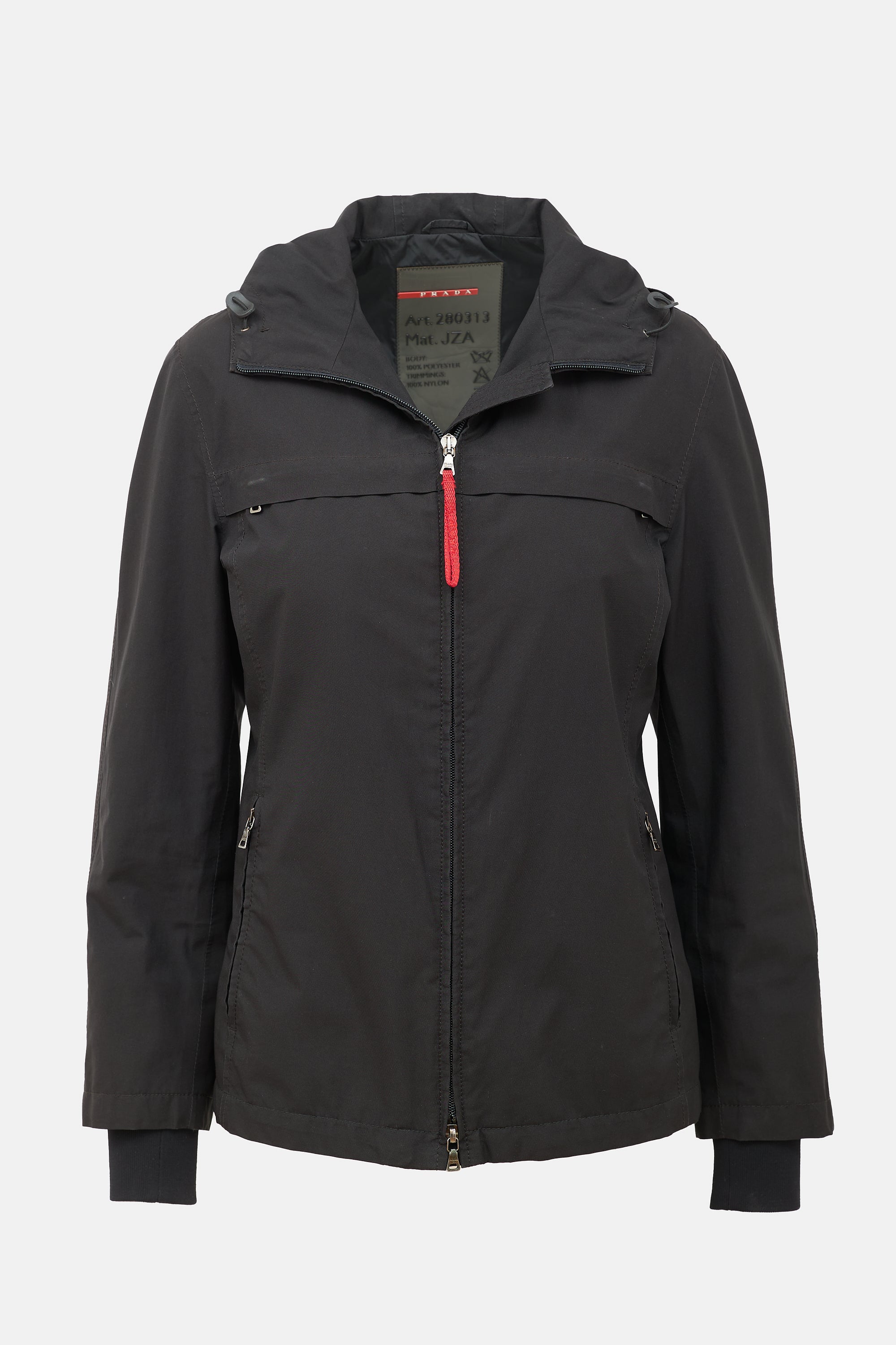 Pre-owned Prada vintage black nylon jacket featuring hooded collar, front zip, two zip pockets, and inset ribbed cuffs. Lined.